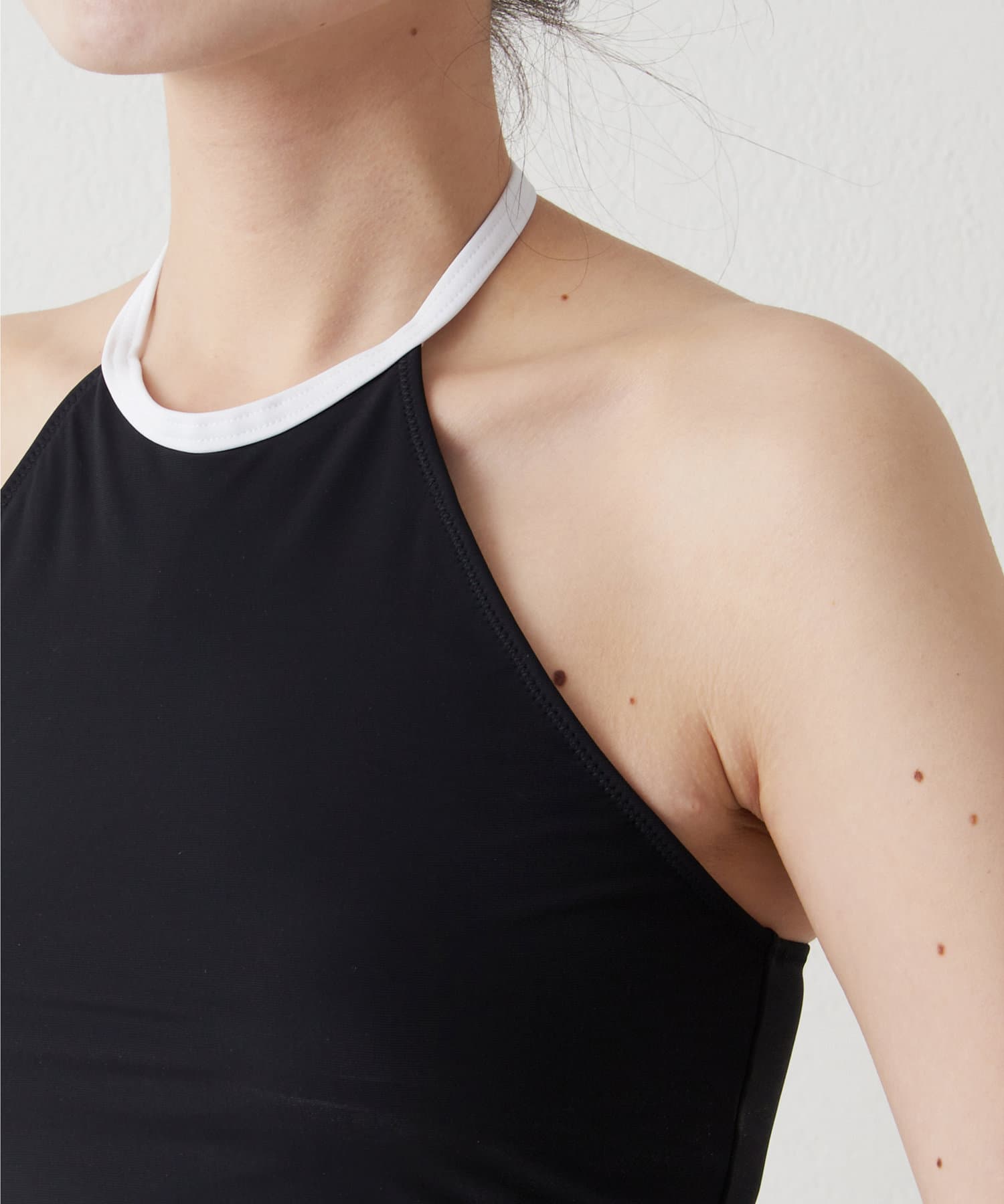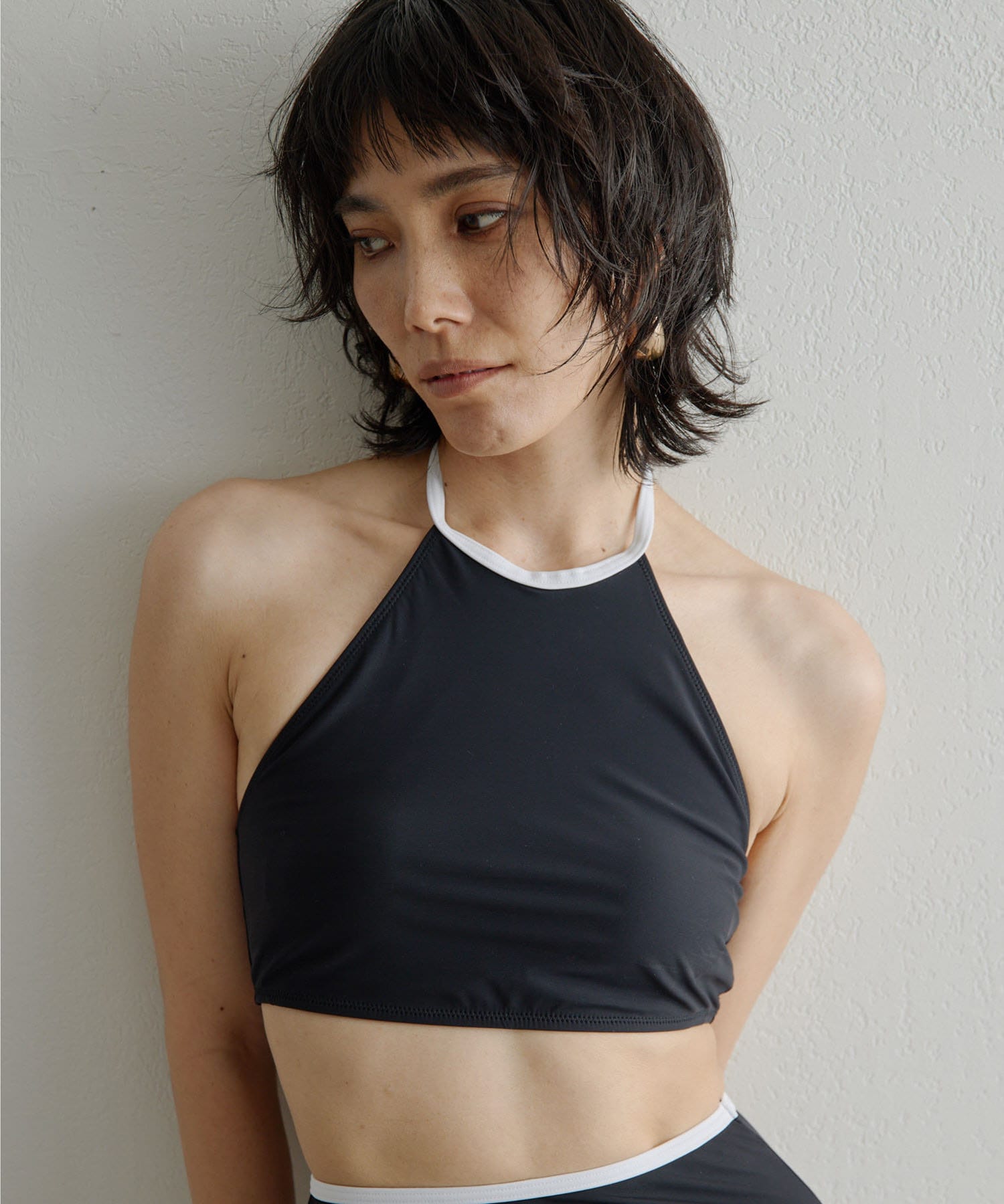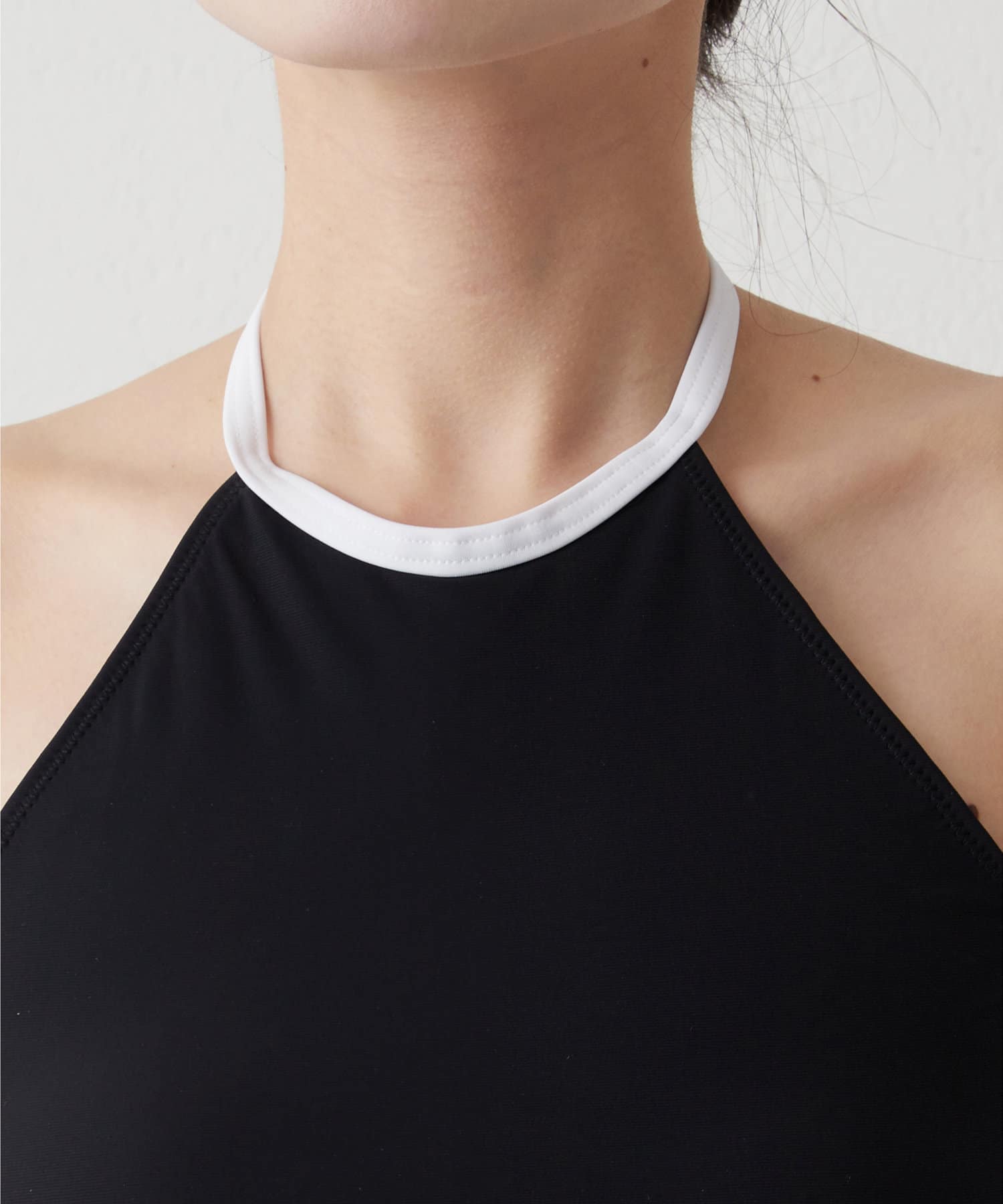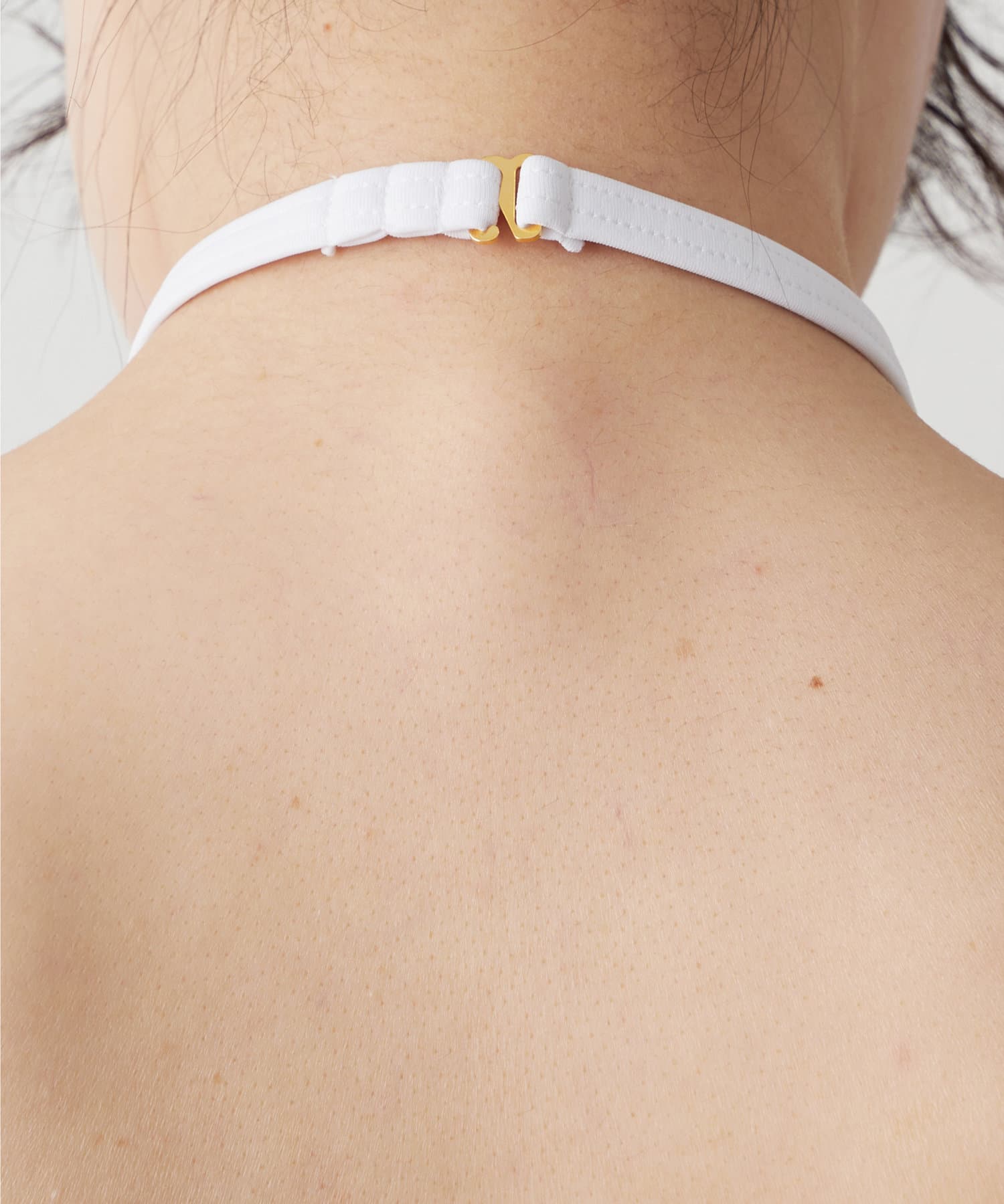 ■ホルター部分はホックディティールで仕上げ、すっきりとミニマルな印象に。