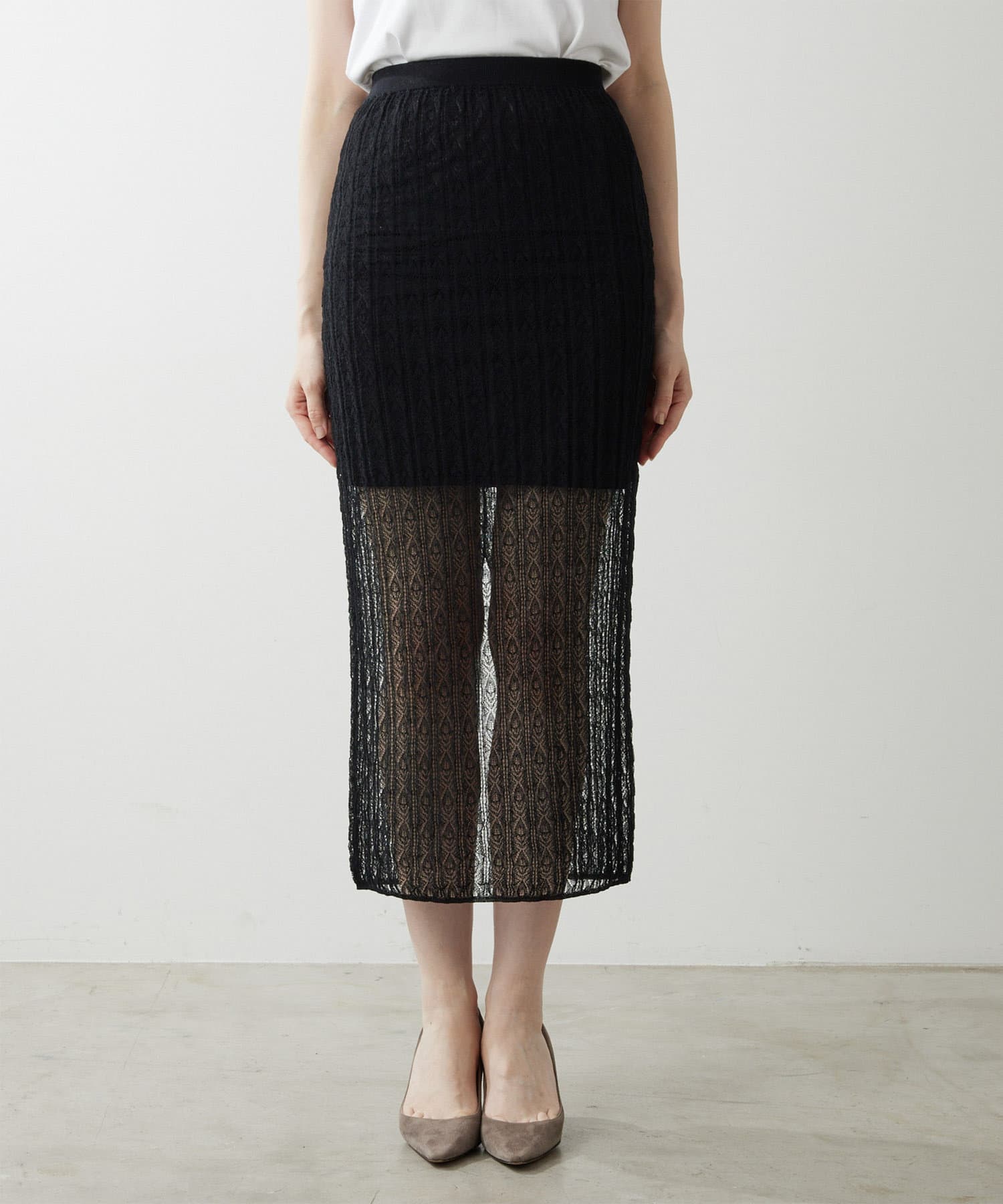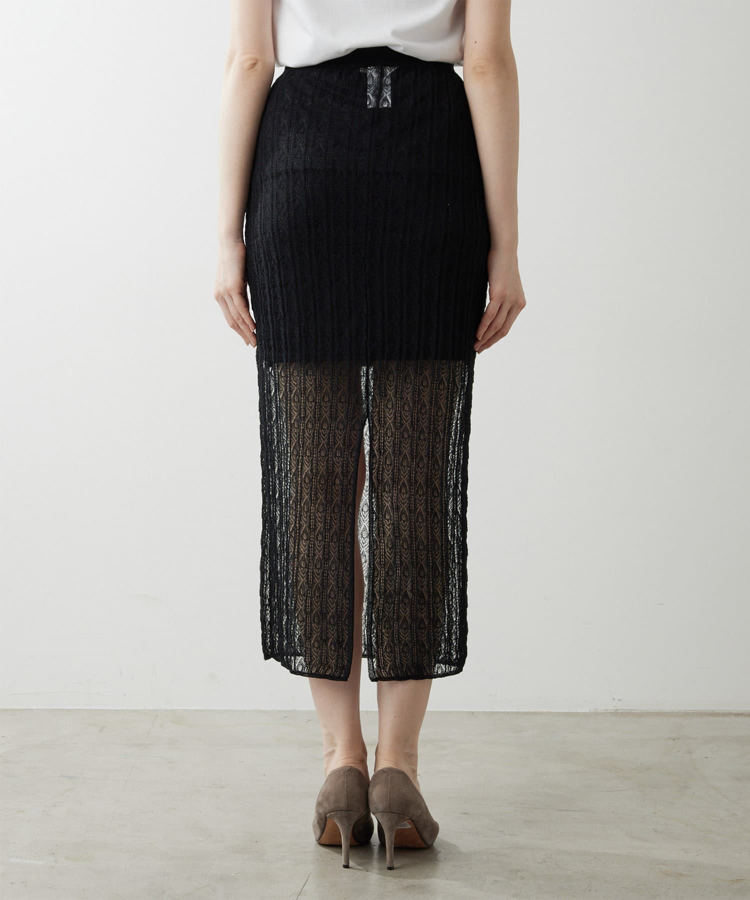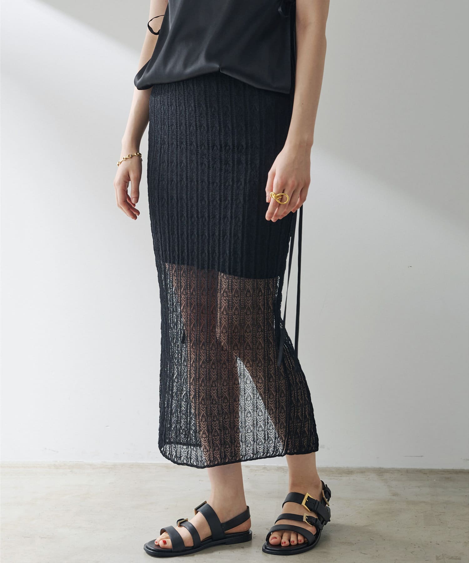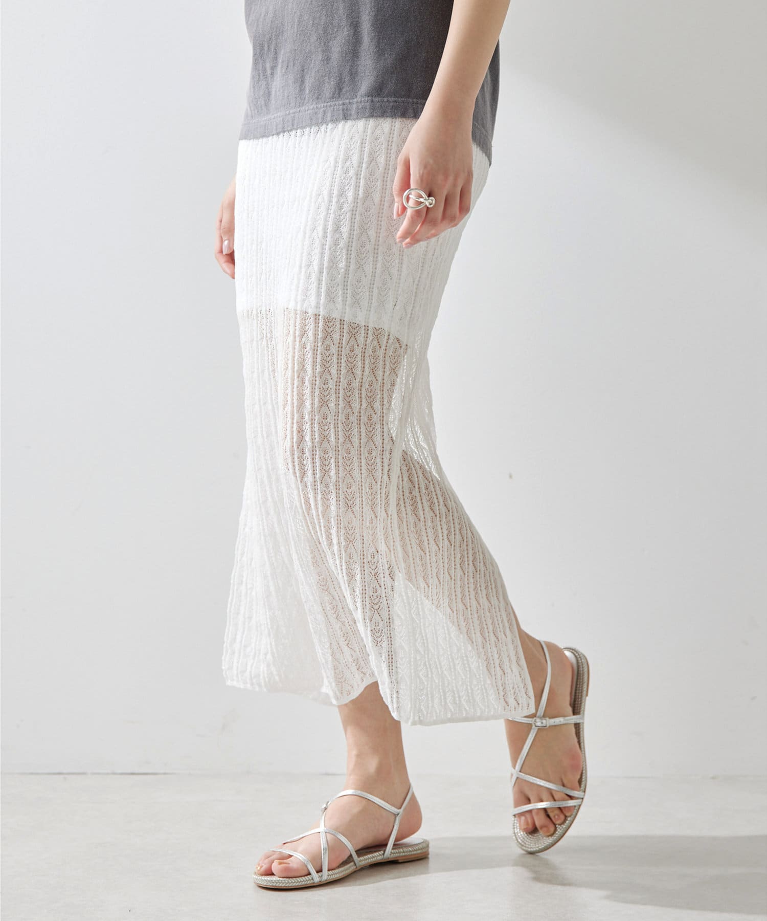 繊細な表情で品良く楽しめる、透かし編みタイトスカート