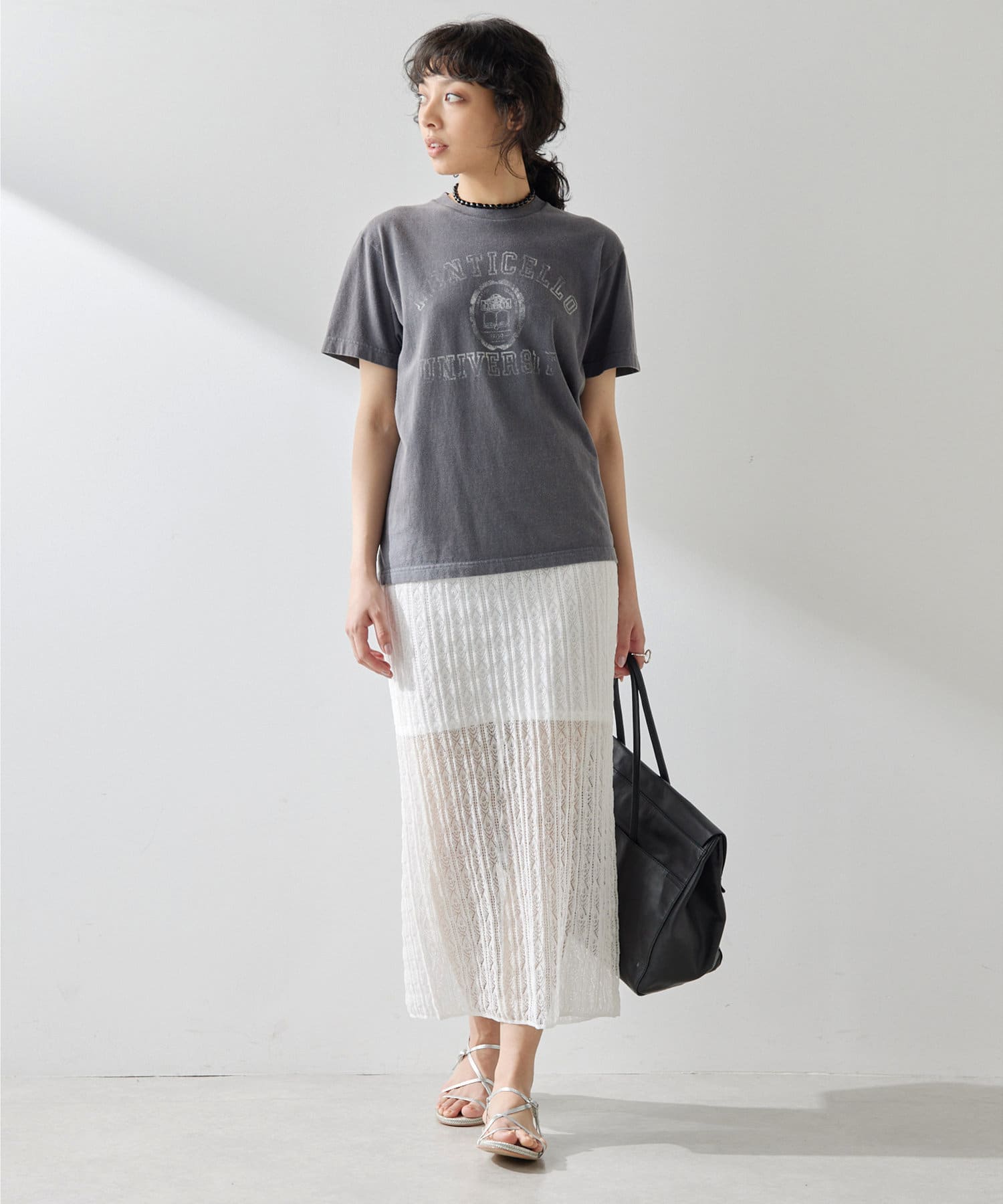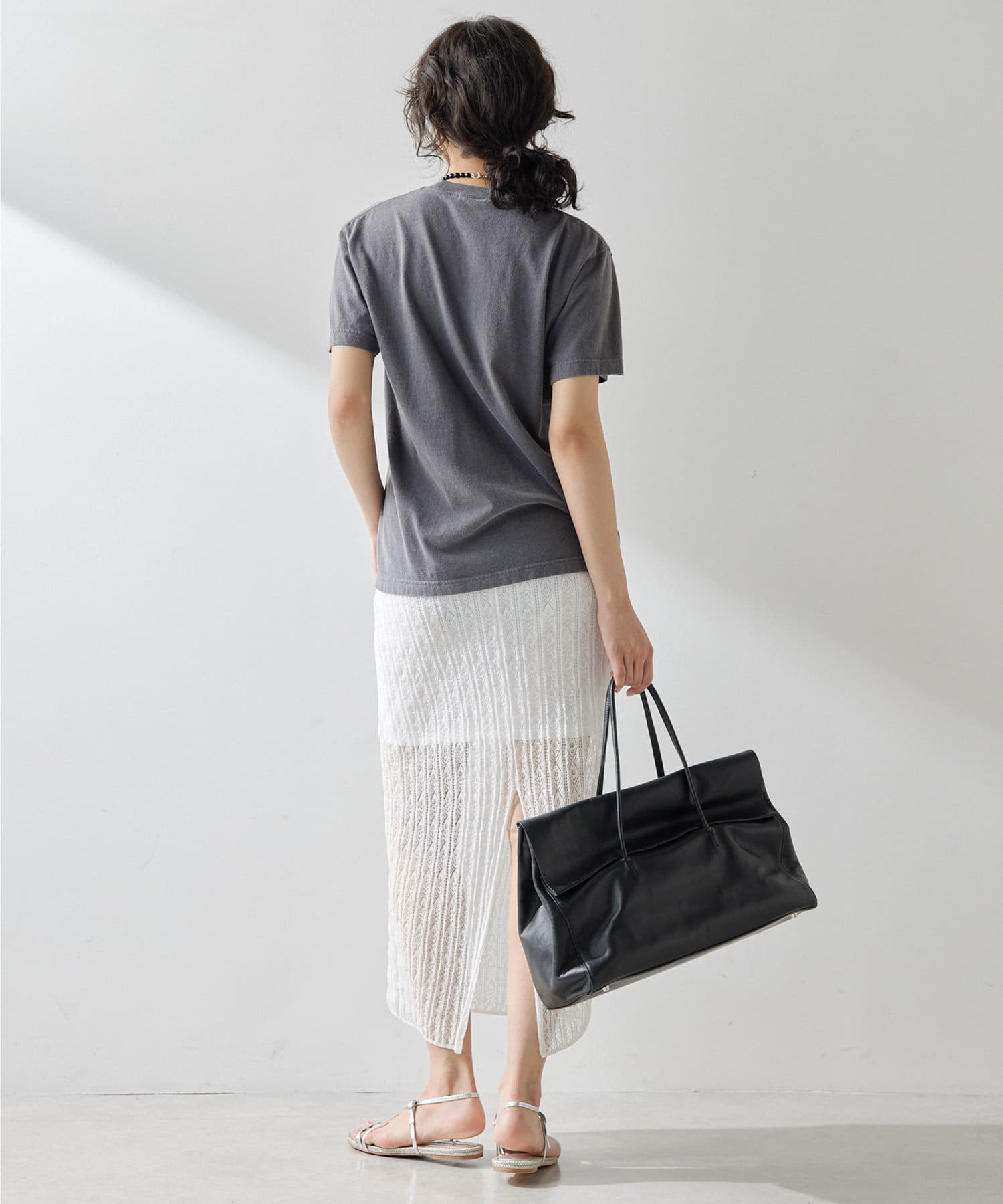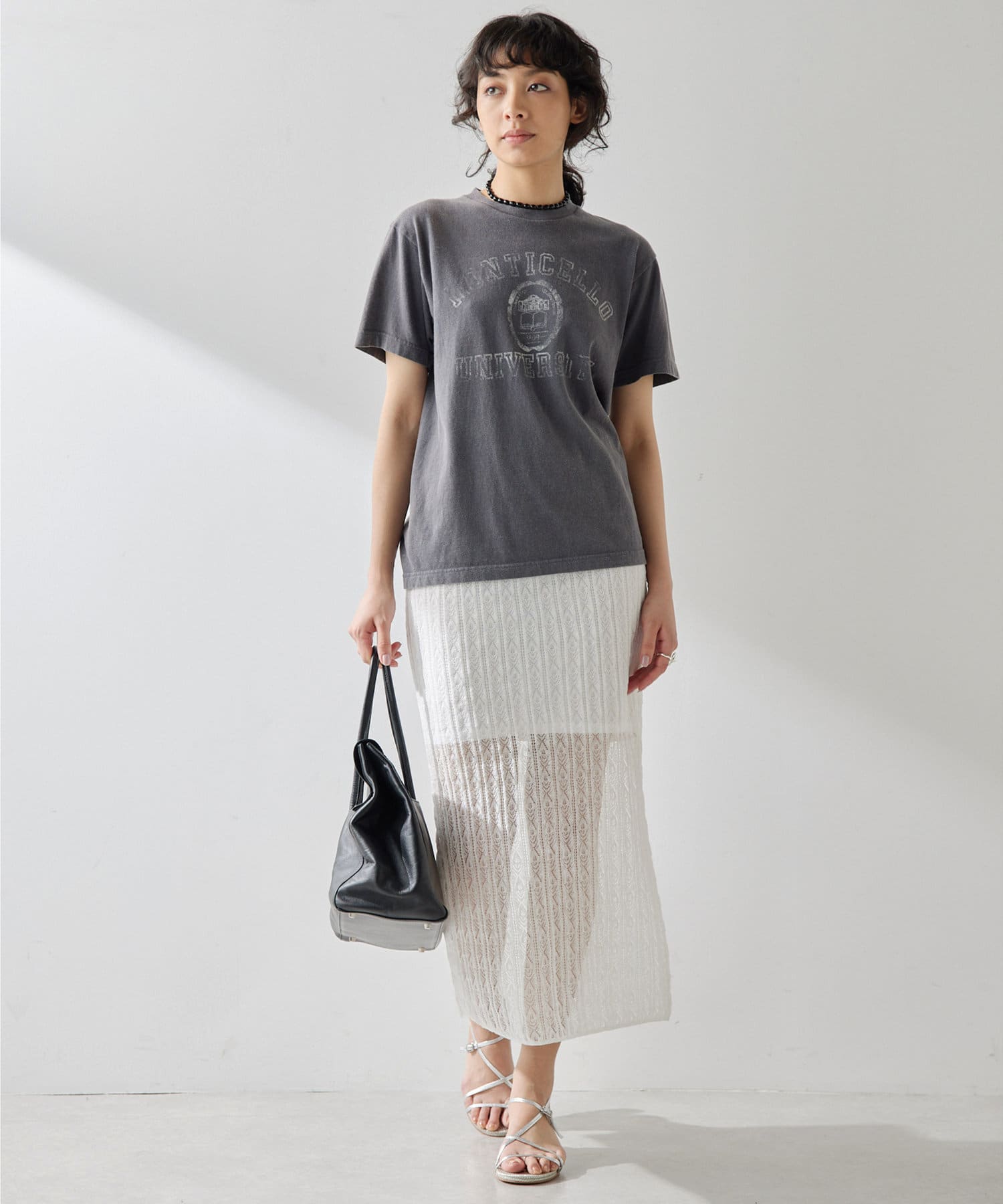シアー感が綺麗な透かし編みスカート。伸縮性があり、締め付け感がなくとても楽な着心地でした。スリットが入っているので足捌きも良かったです。着丈は長過ぎず、157cmでフラットサンダルでもちょうど良く履けました。