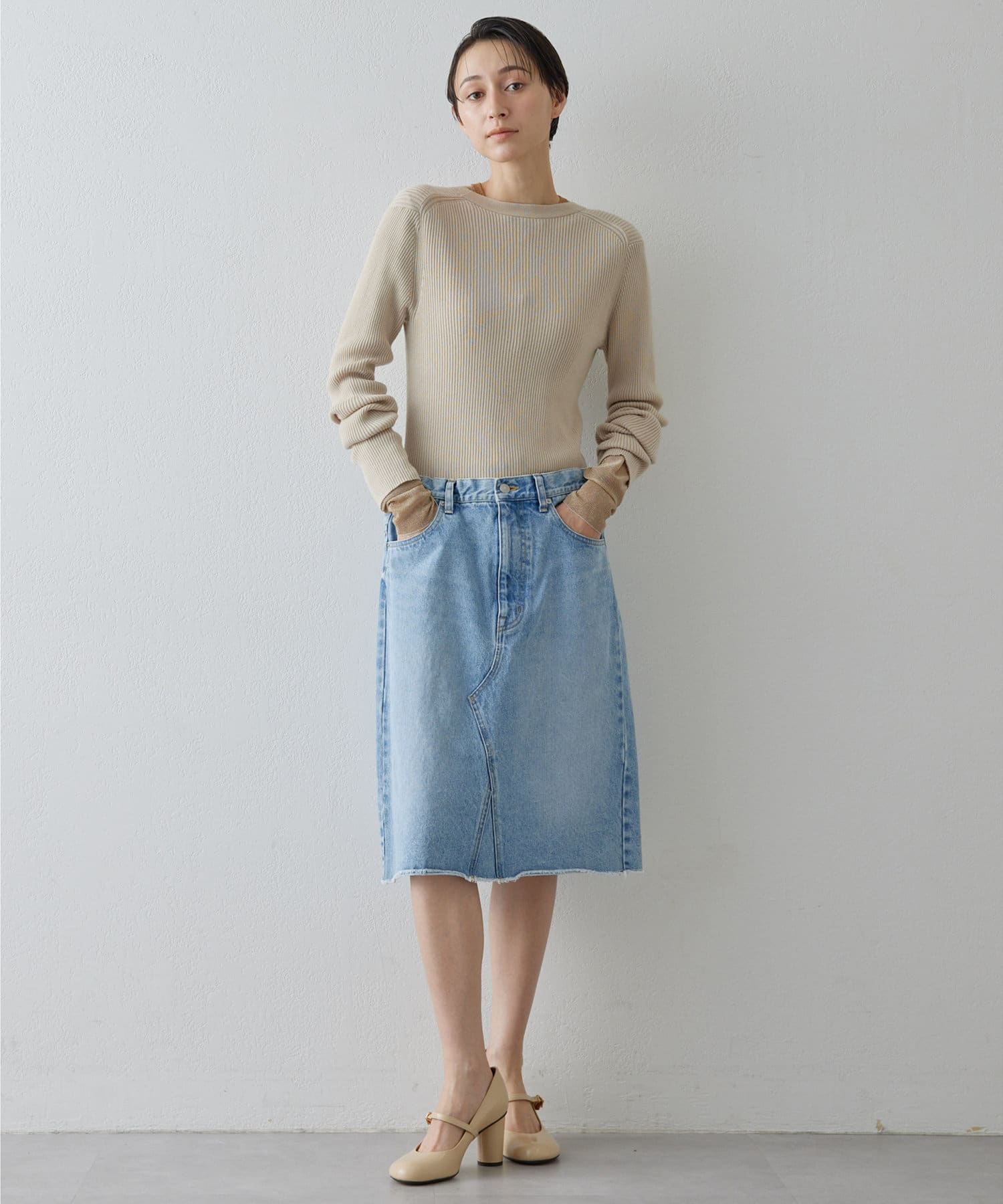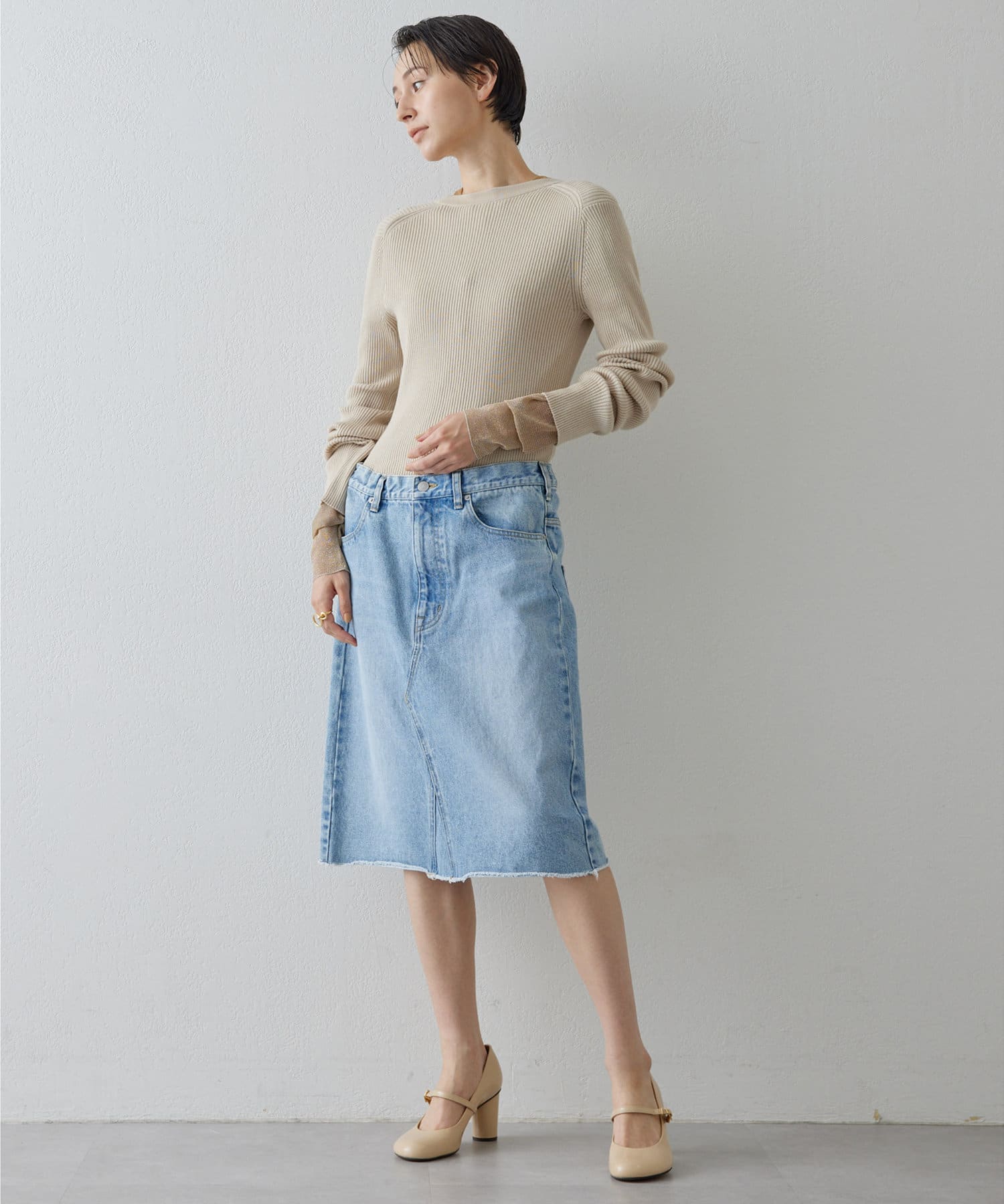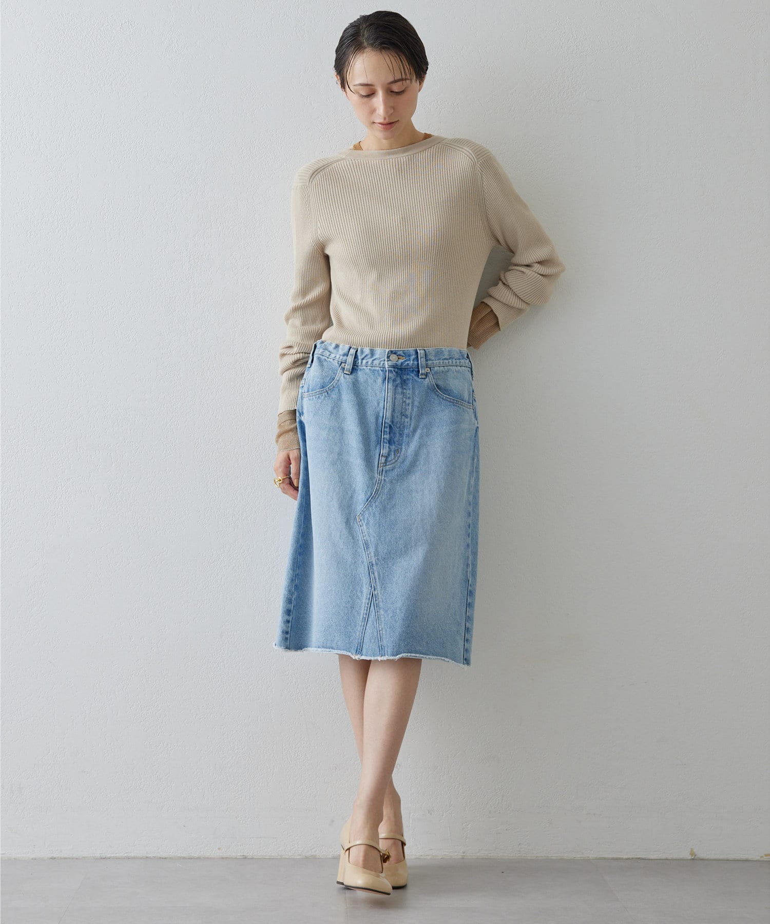 ■きれいめなハイゲージニットやエッセンシャルなアイテムとのコーディネートがおすすめ。