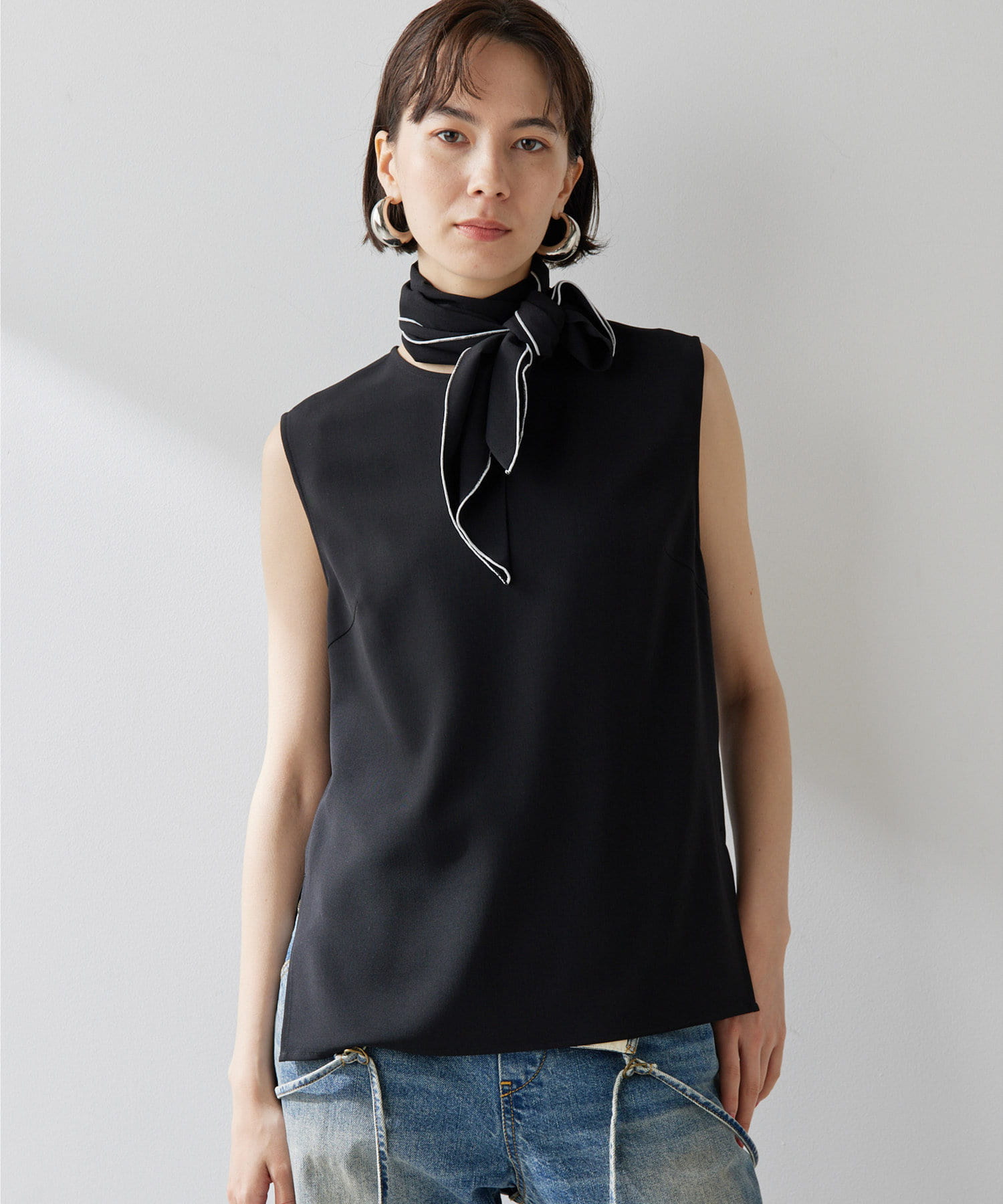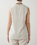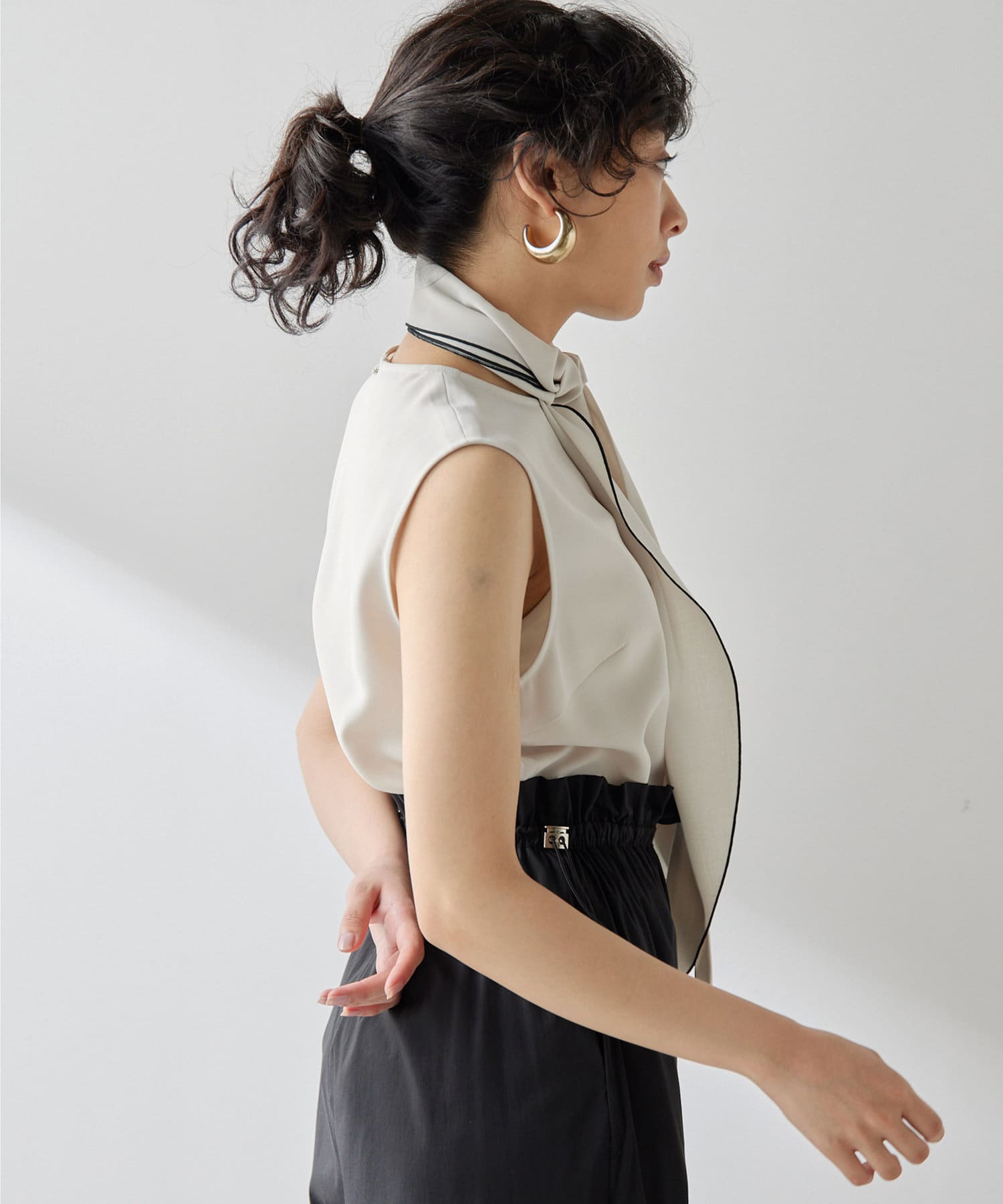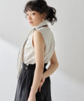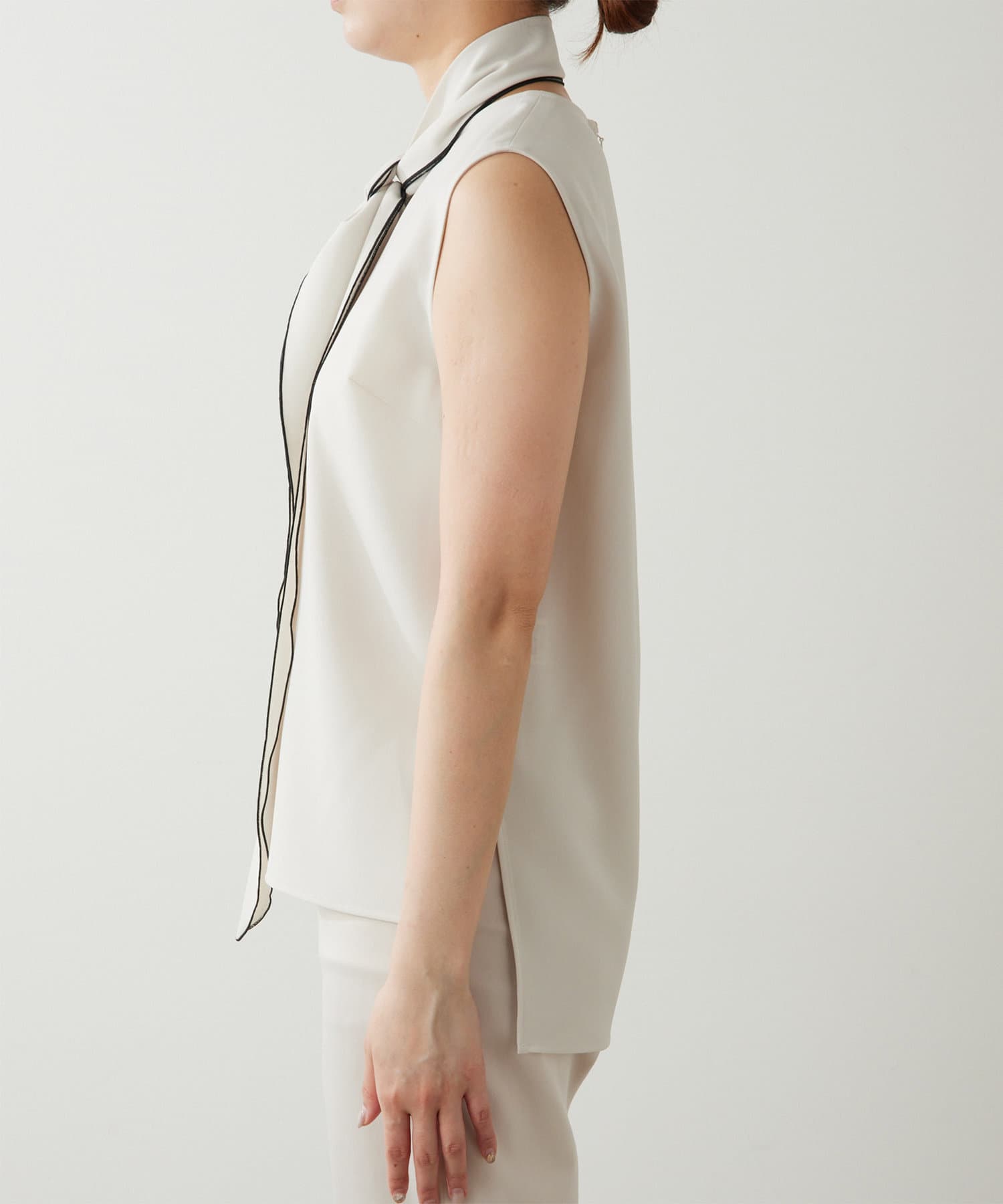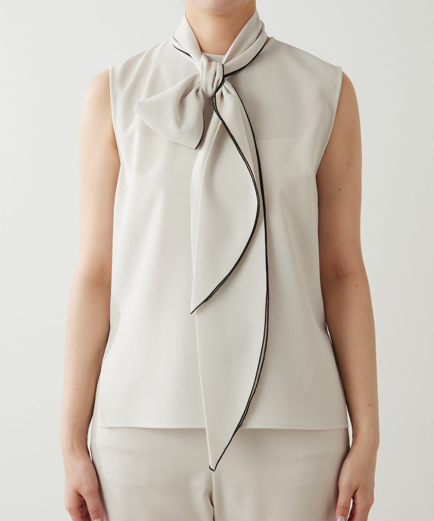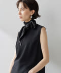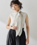 ■配色パイピングがアクセントになるノースリーブボウブラウス。