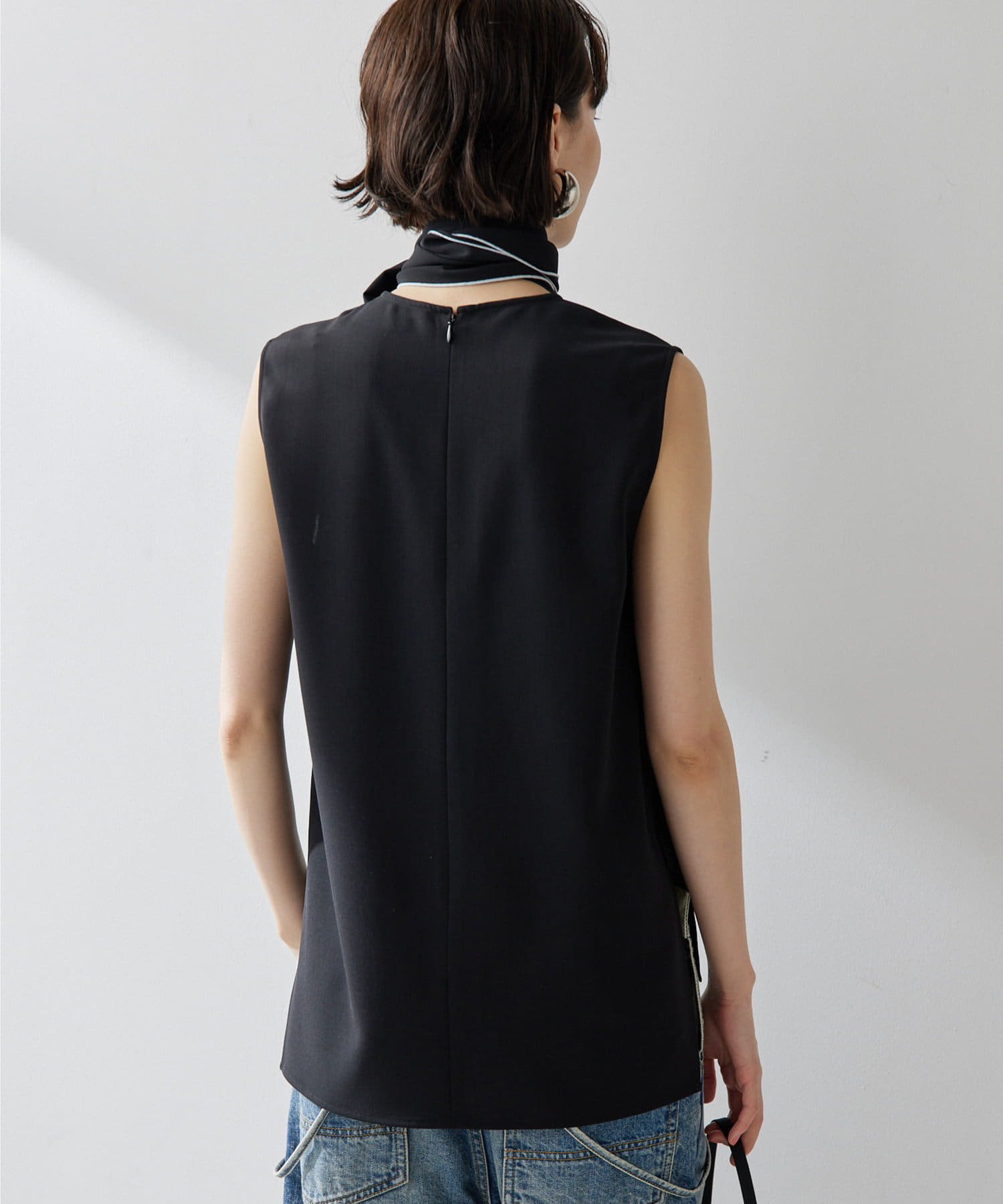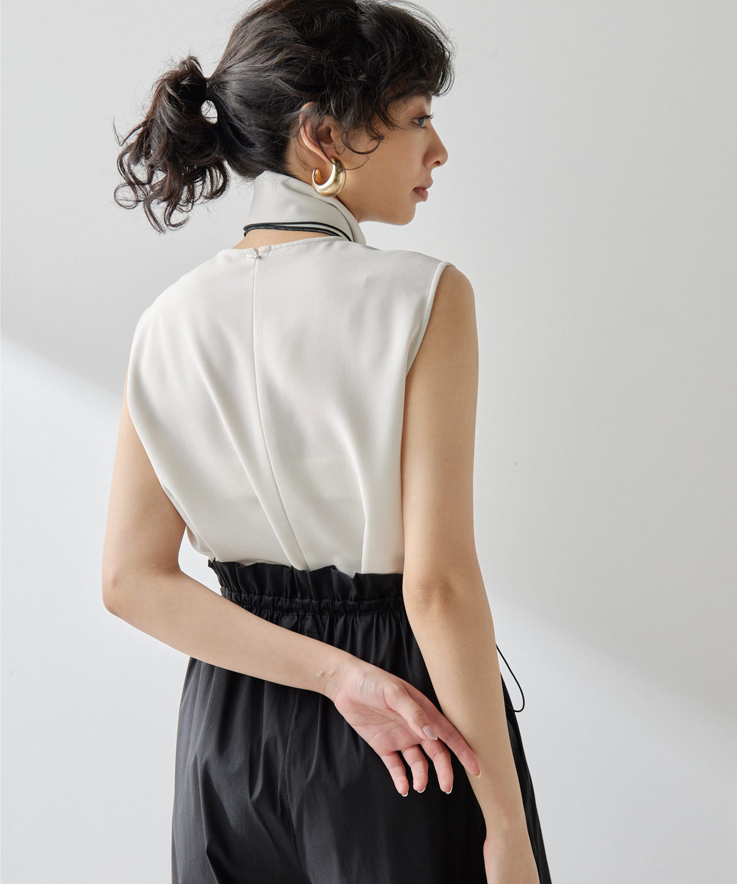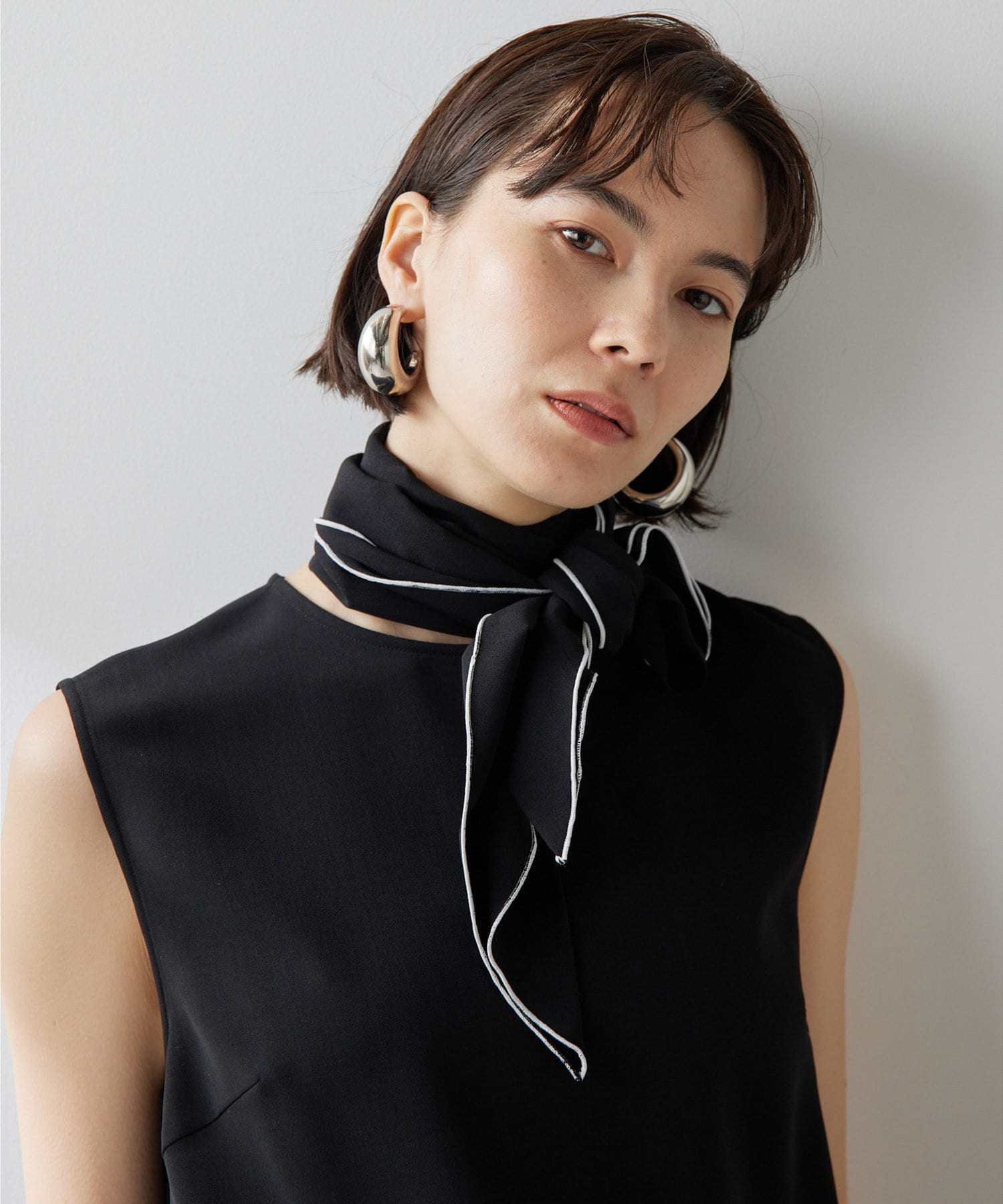 ■配色パイピングがアクセントになるノースリーブボウブラウス。
