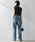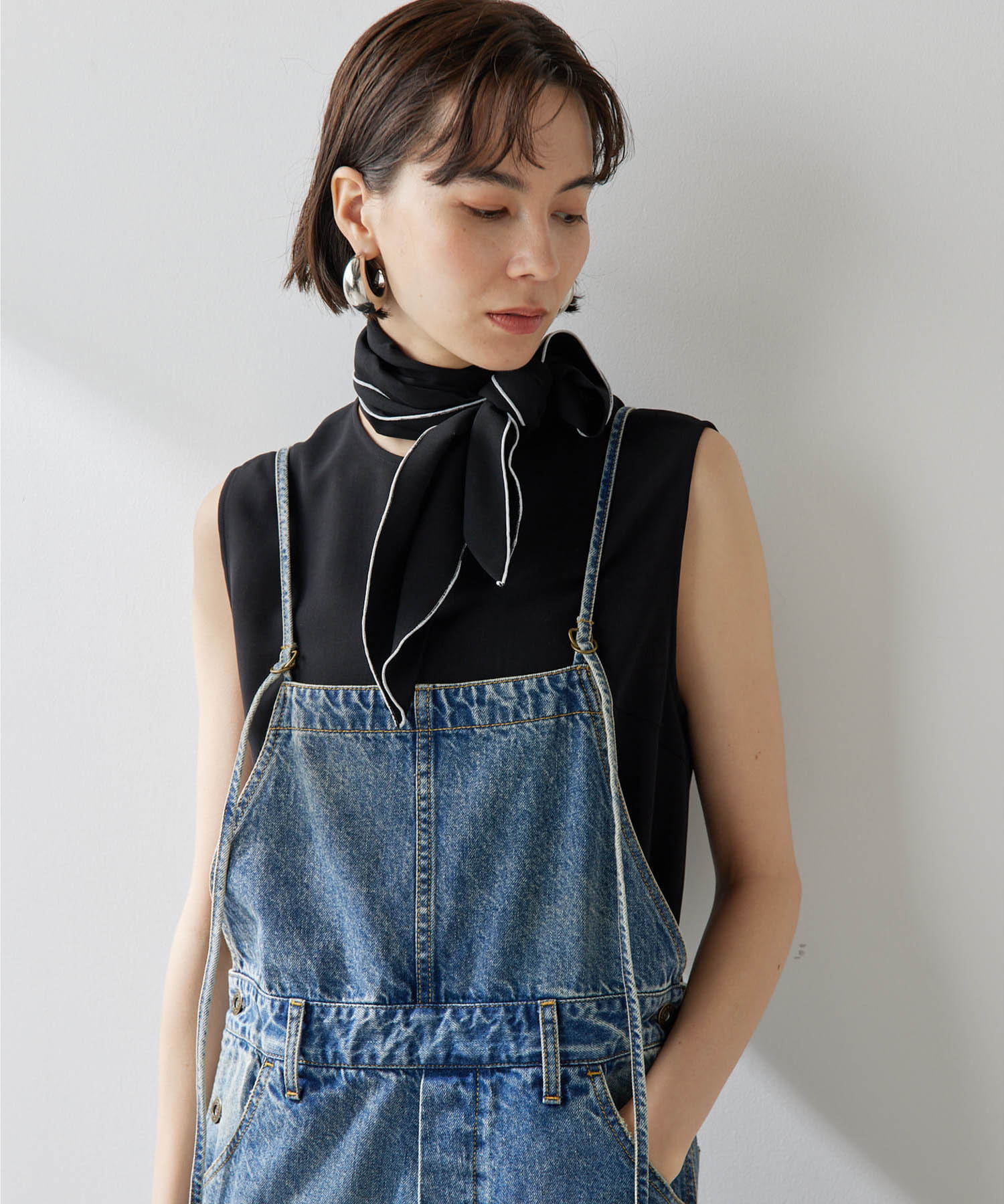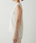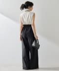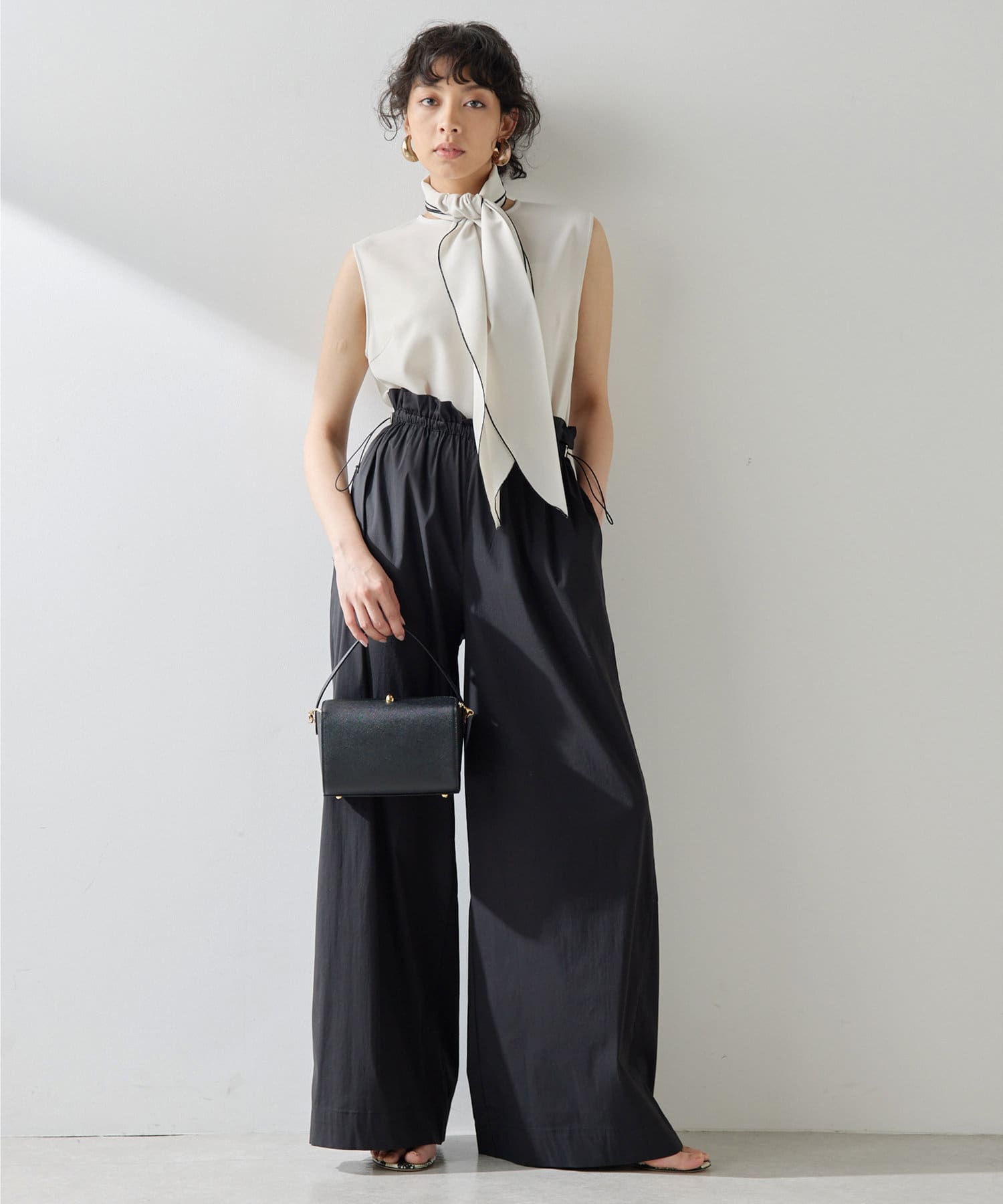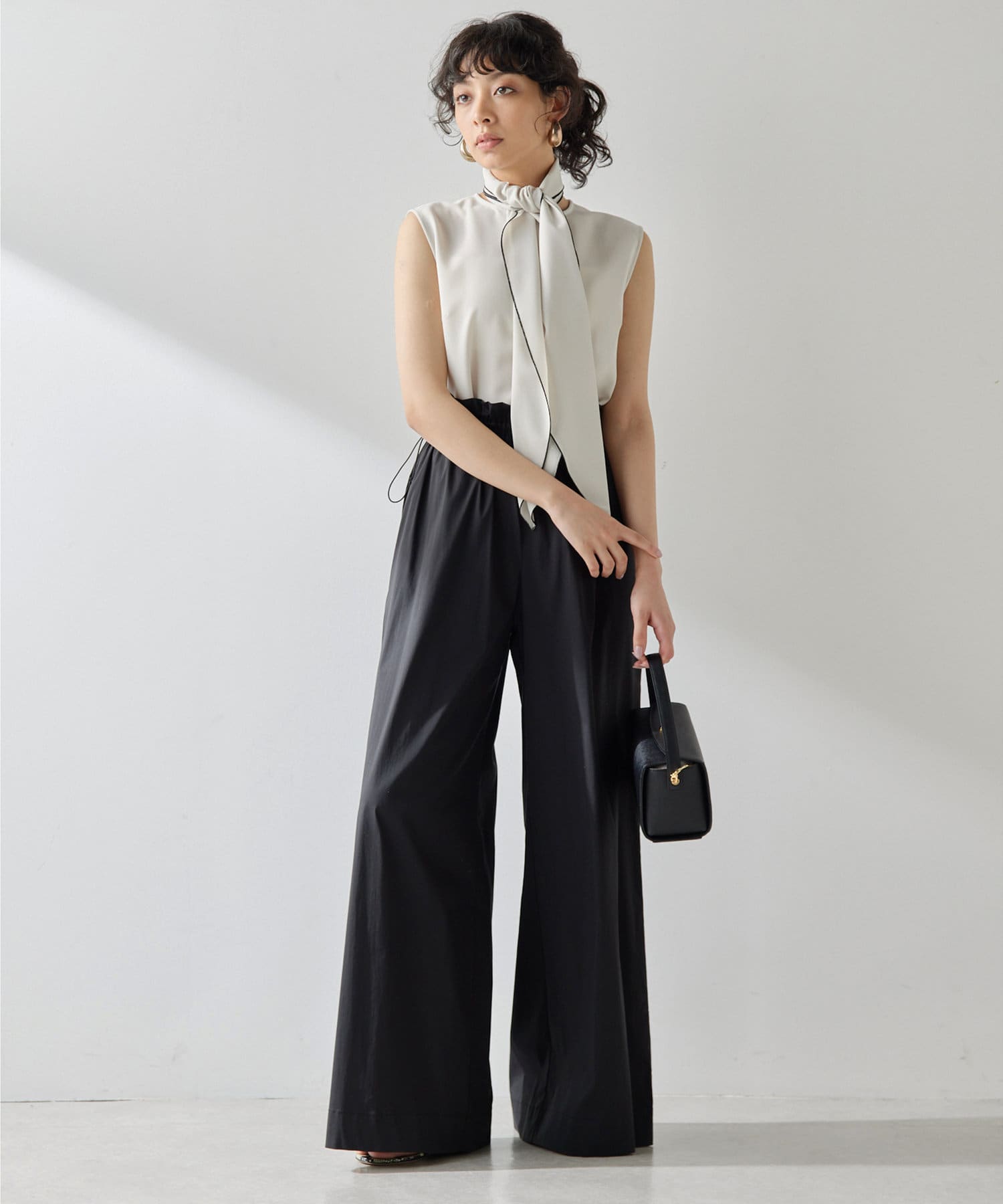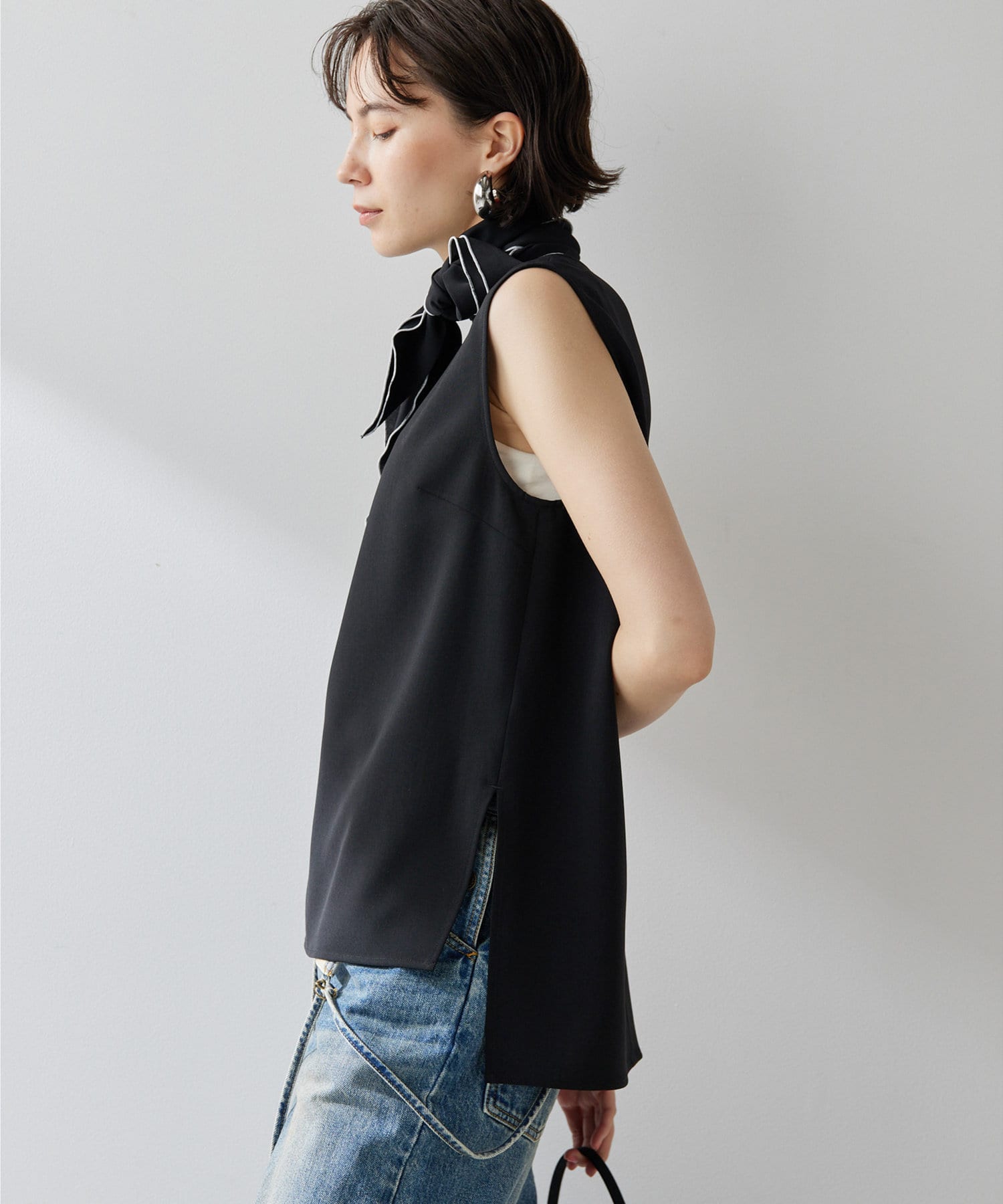 ■配色パイピングがアクセントになるノースリーブボウブラウス。