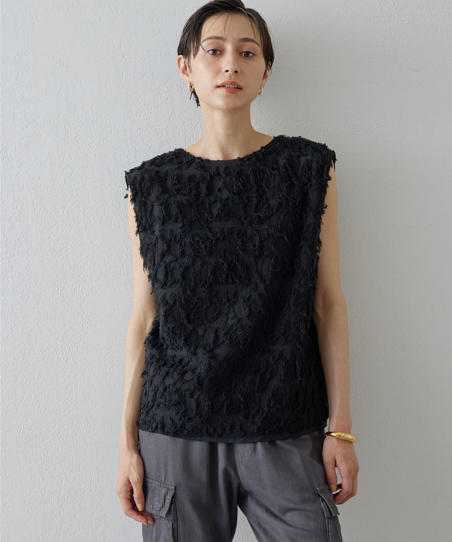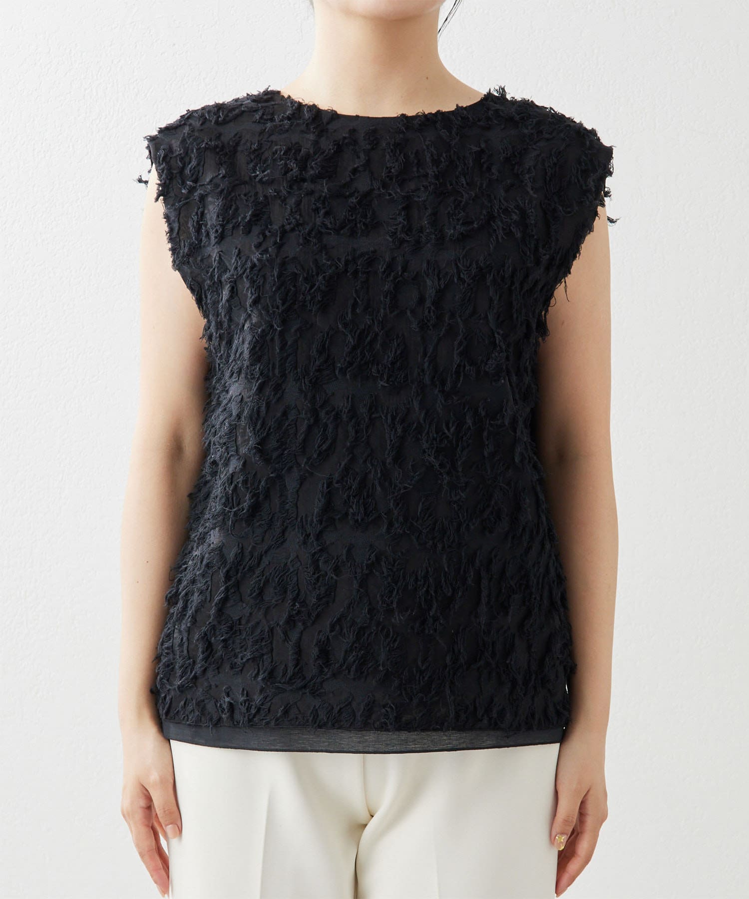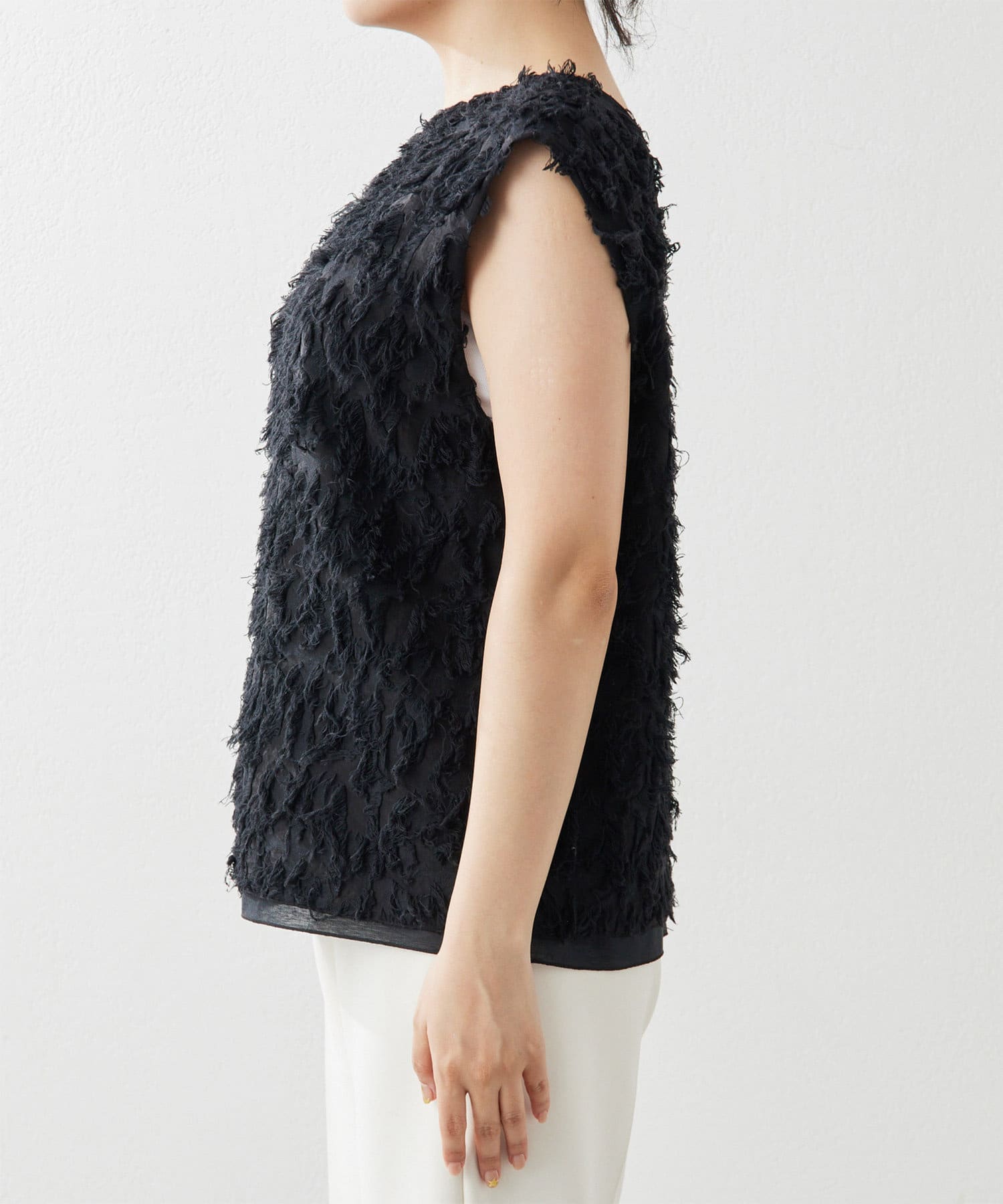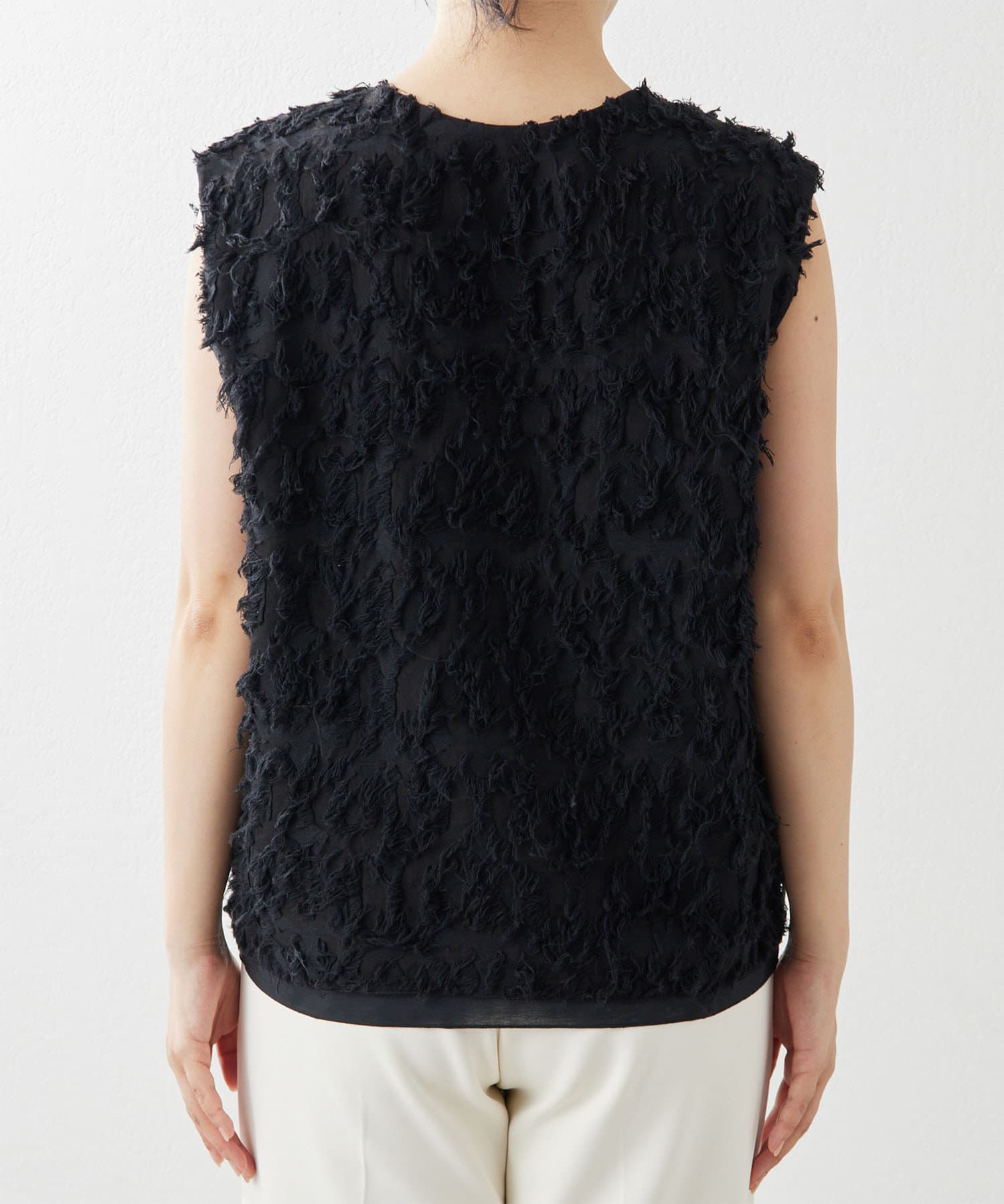■シャギーのような見栄えのジャガード生地を使用したスリーブレスブラウス。
