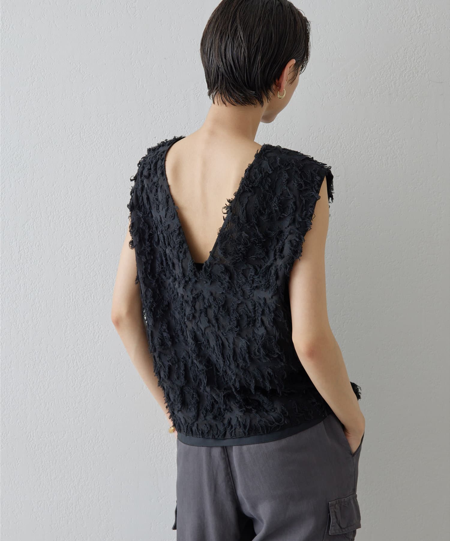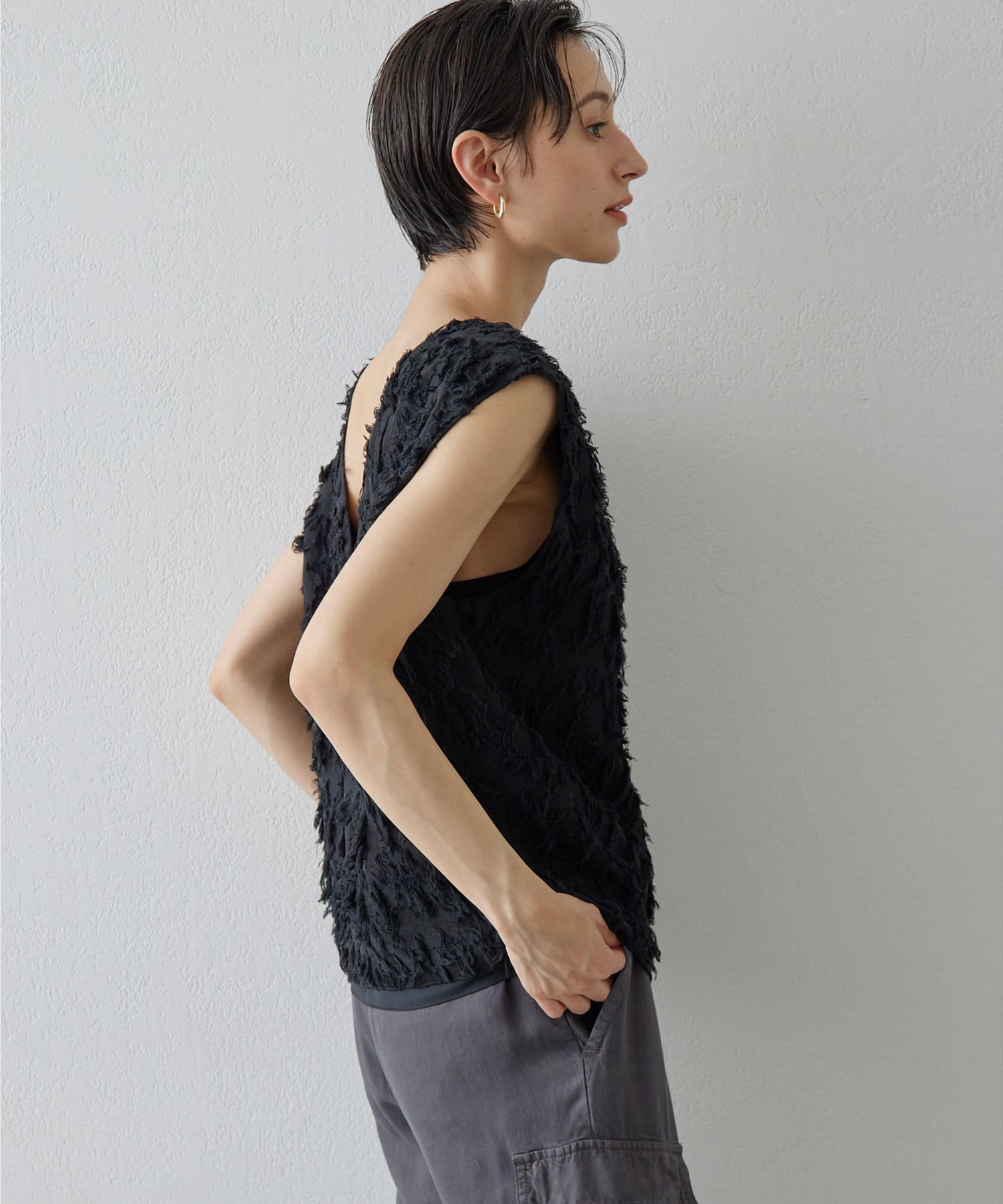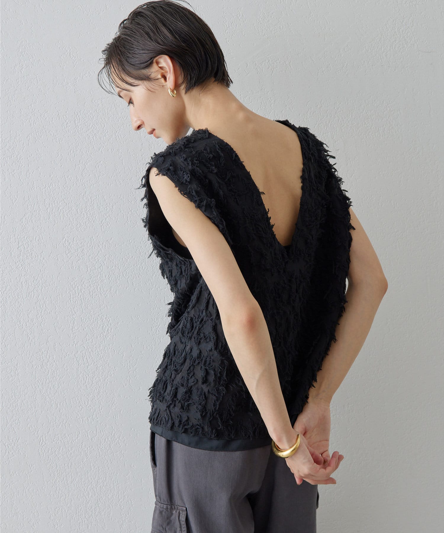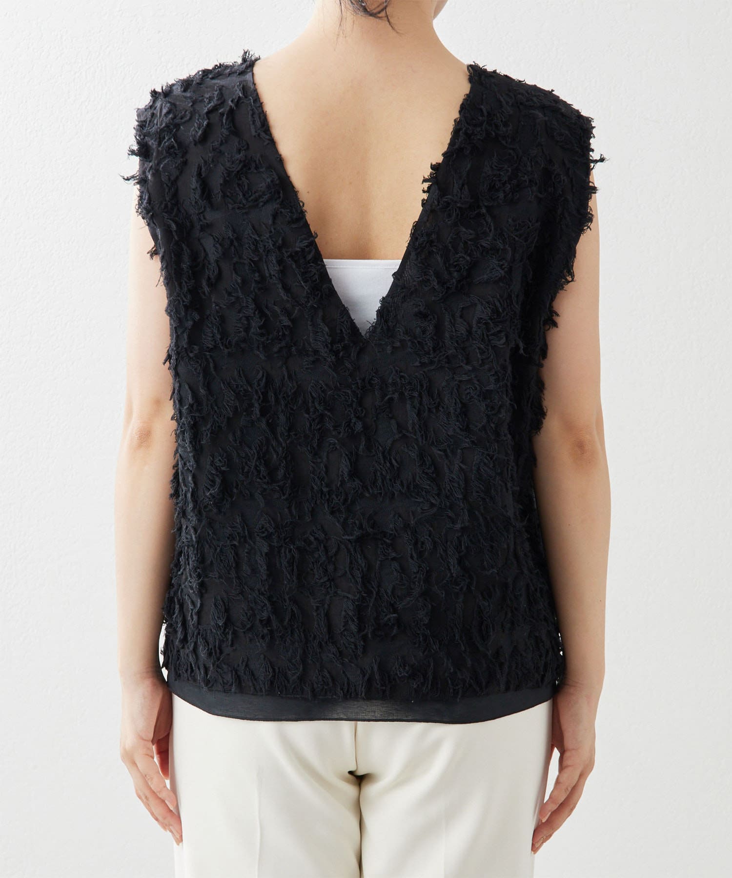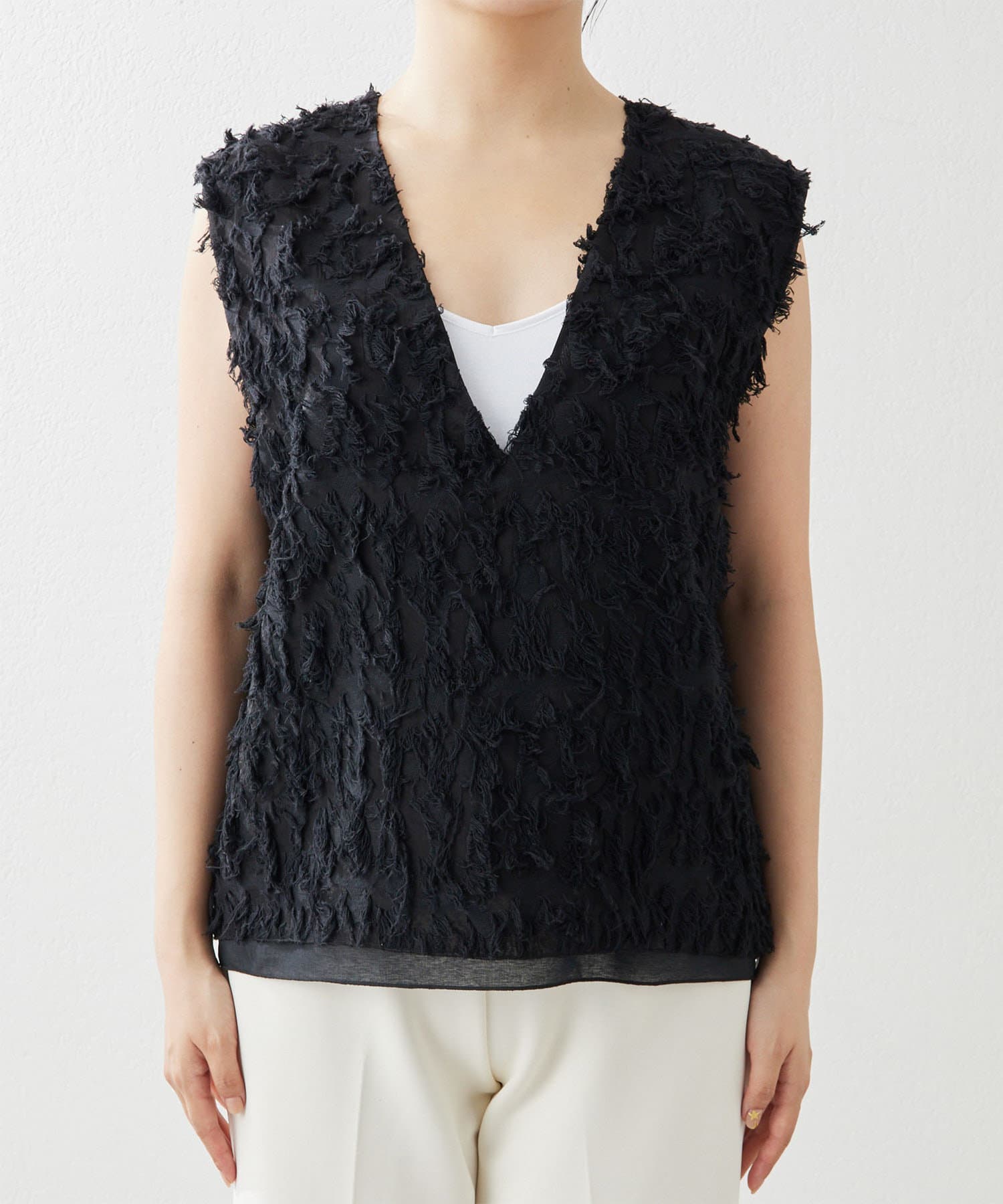 ■シャギーのような見栄えのジャガード生地を使用したスリーブレスブラウス。