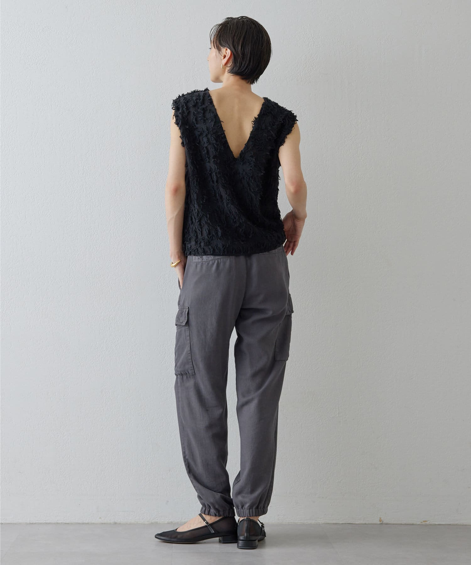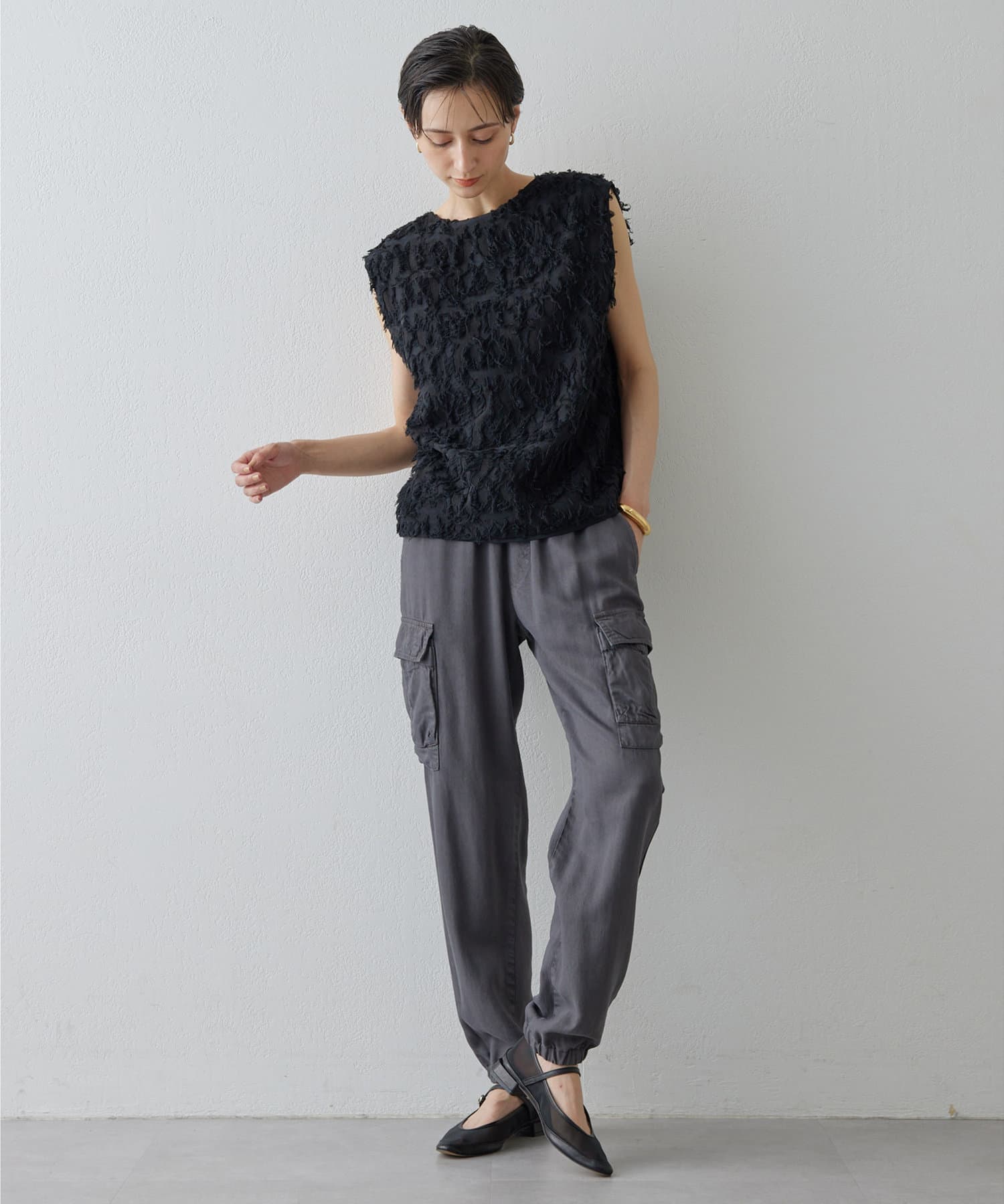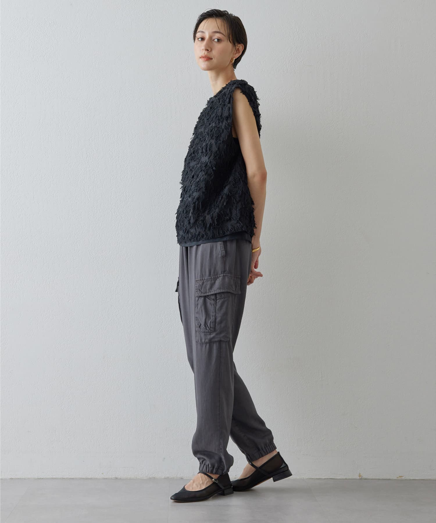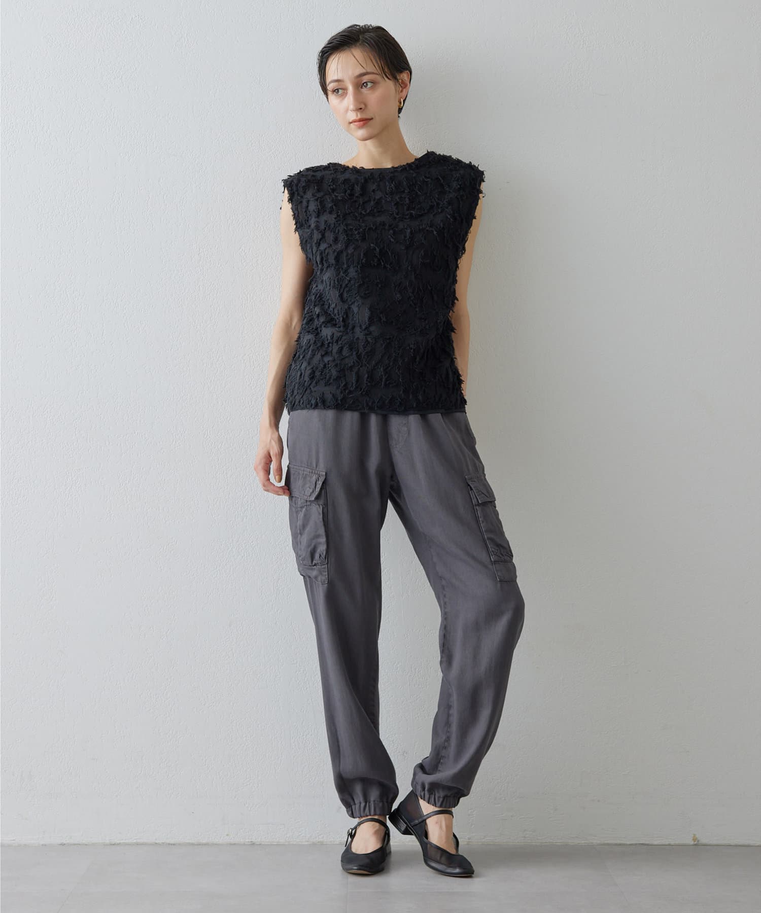 ■シャギーのような見栄えのジャガード生地を使用したスリーブレスブラウス。