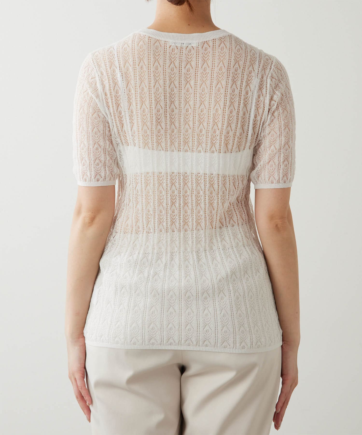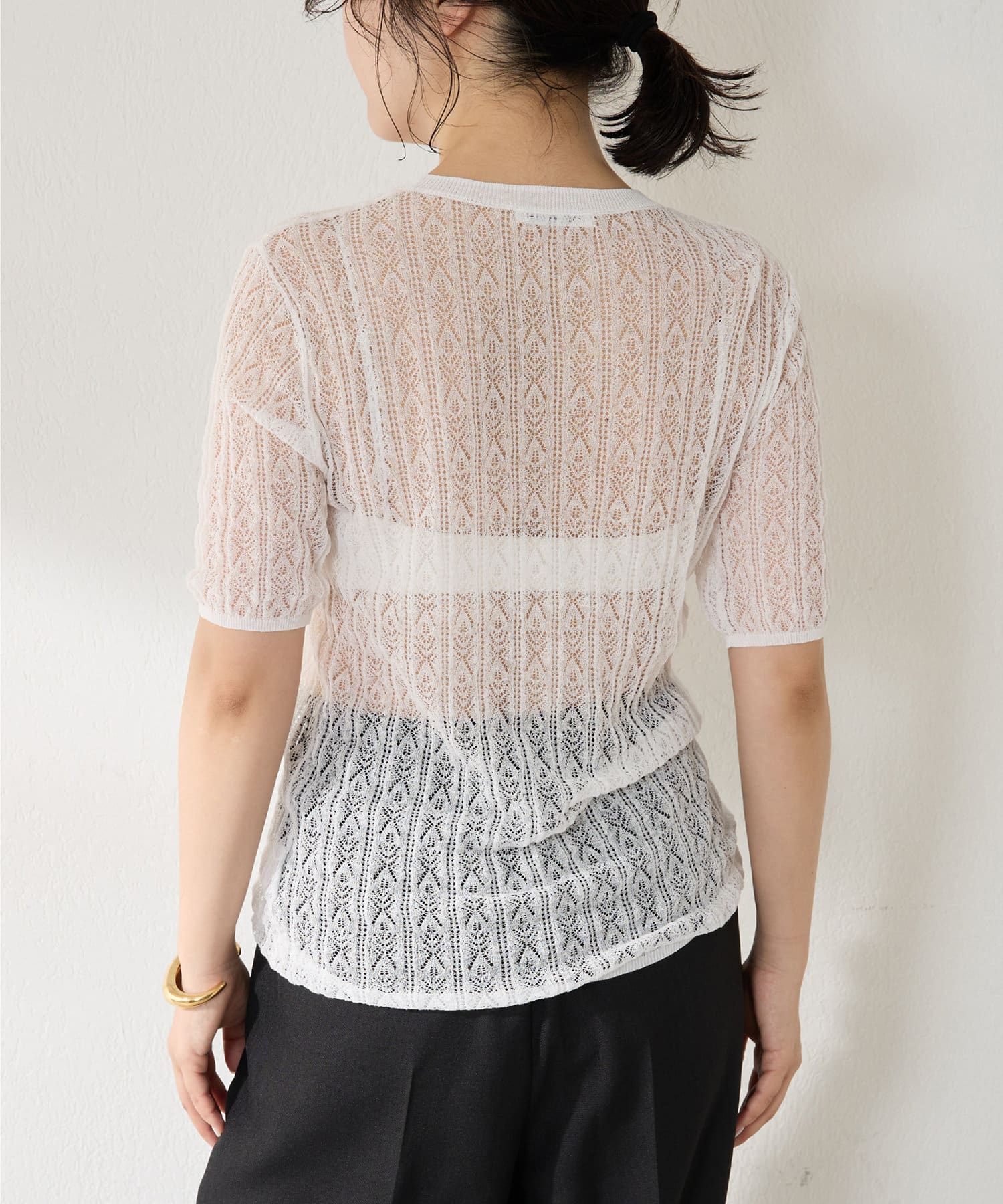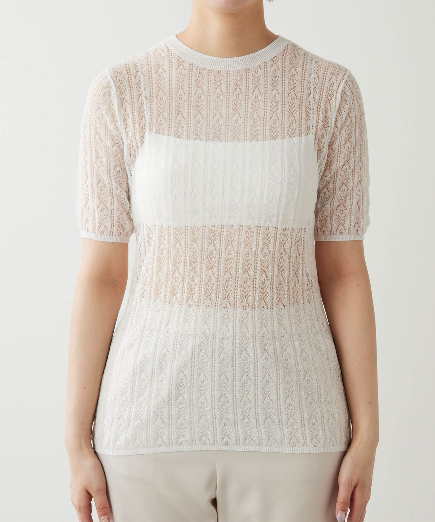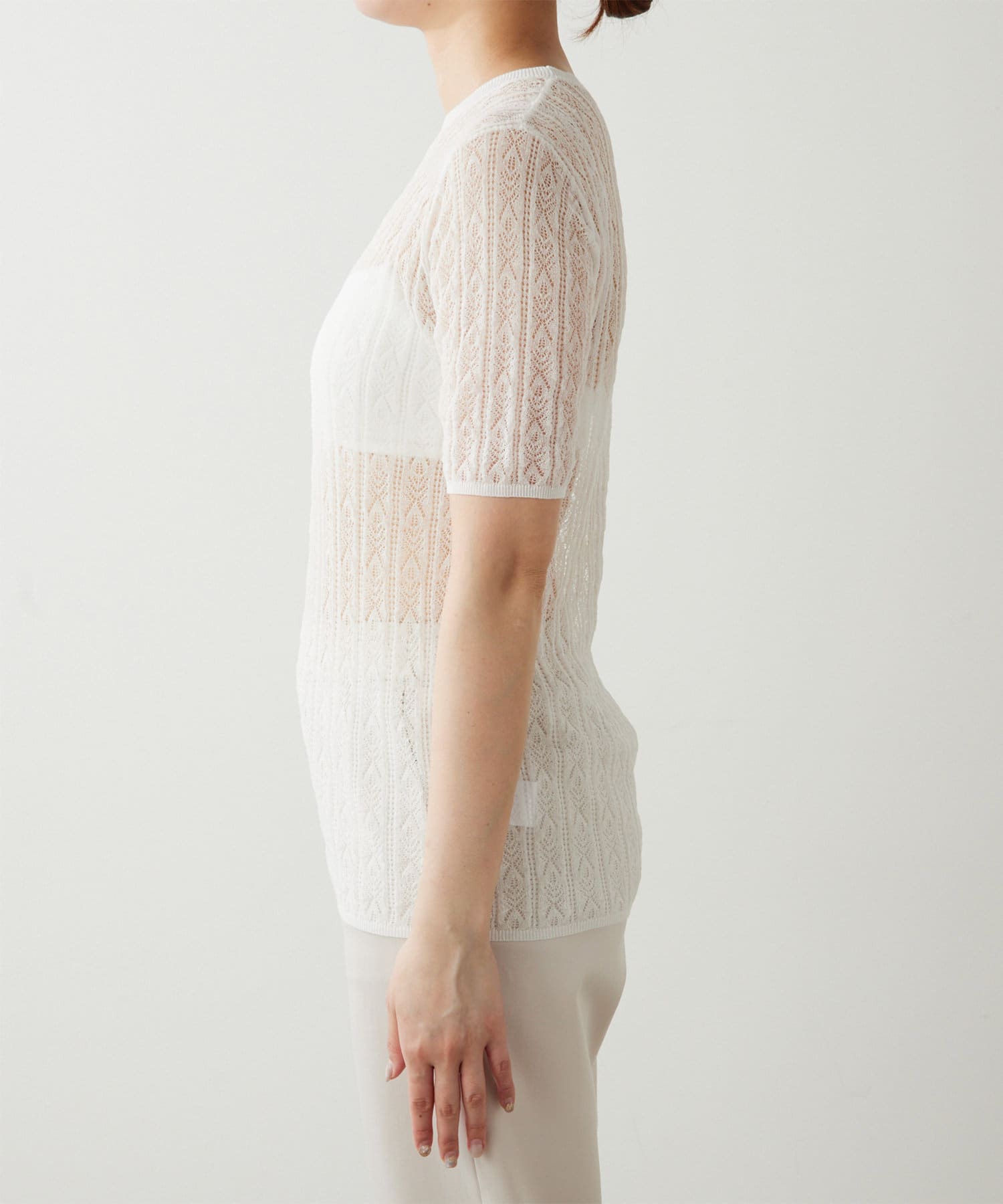 繊細な表情で品良く楽しめる、透かし編みニットTEE