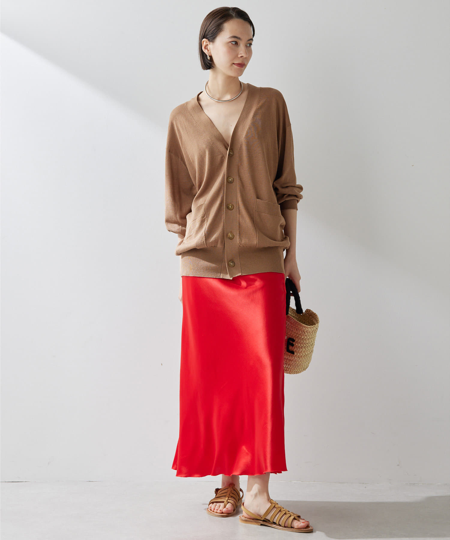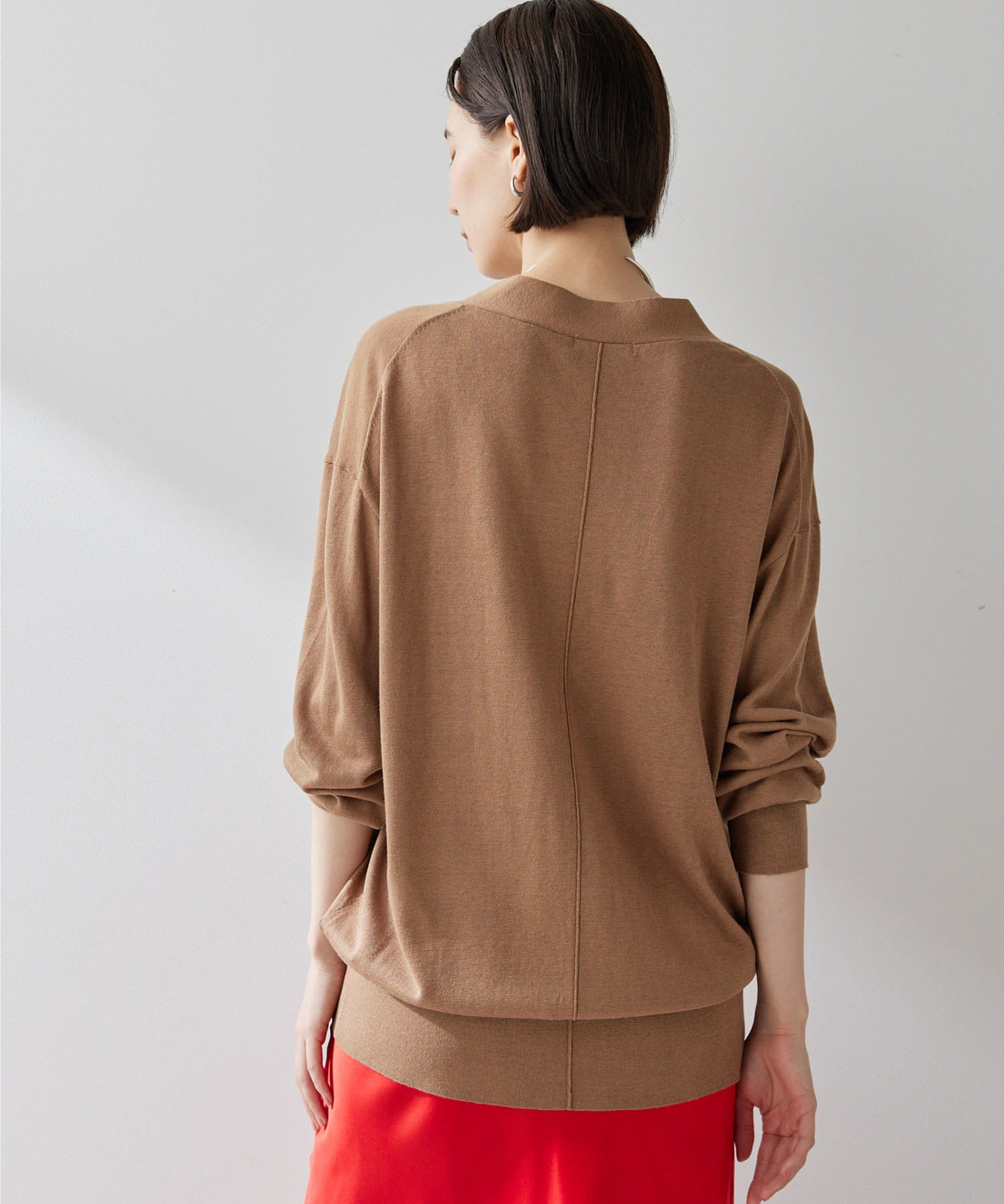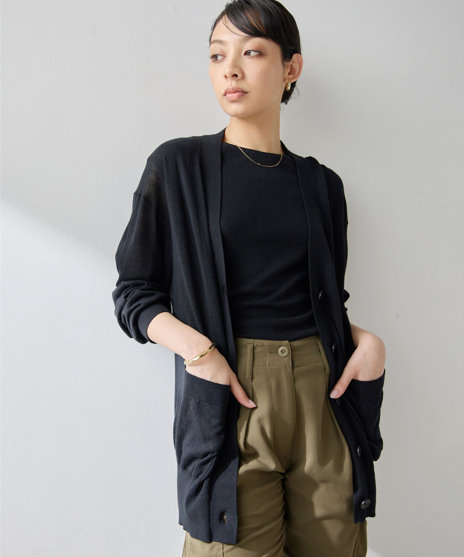 シルクリネンが差をつける上品なカーディガン。少し長めの丈感が腰回りをカバーしてくれ、こなれた印象に。春夏に着回せるアイテム。ニットとのアンサンブルも素敵ですよ。