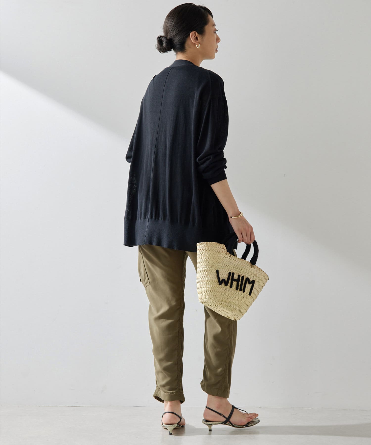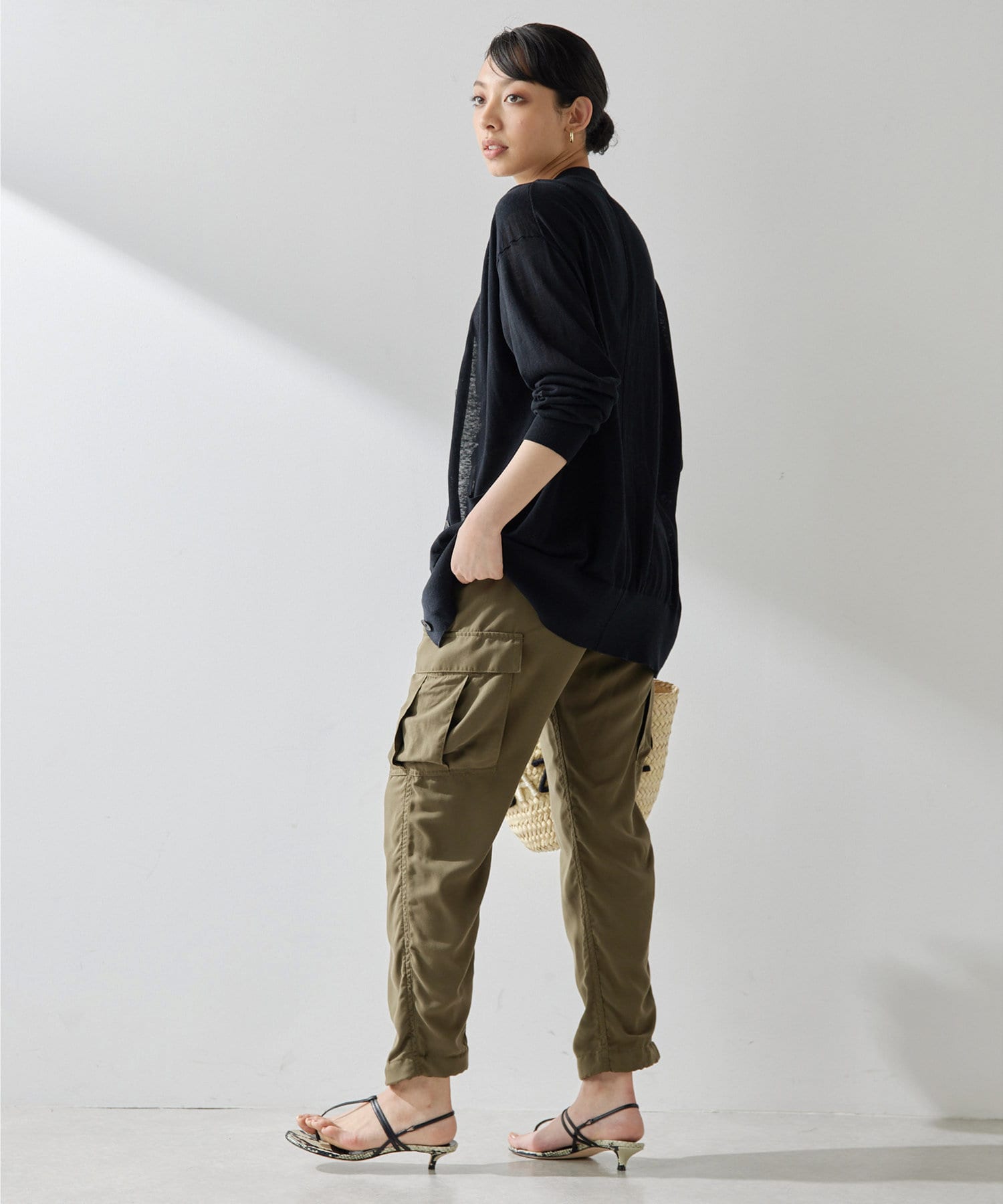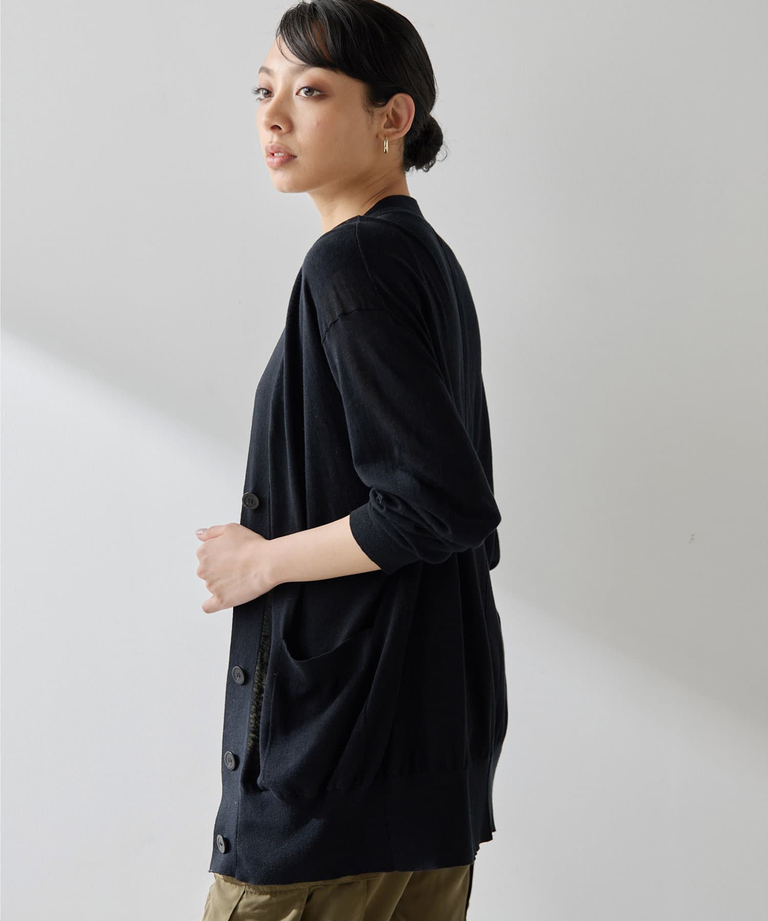 シルクリネンが差をつける上品なカーディガン。少し長めの丈感が腰回りをカバーしてくれ、こなれた印象に。春夏に着回せるアイテム。ニットとのアンサンブルも素敵ですよ。