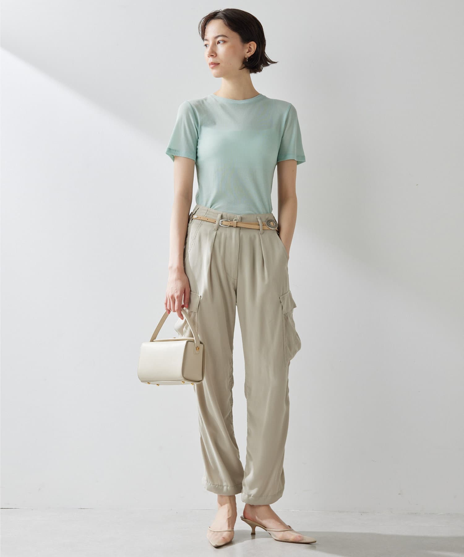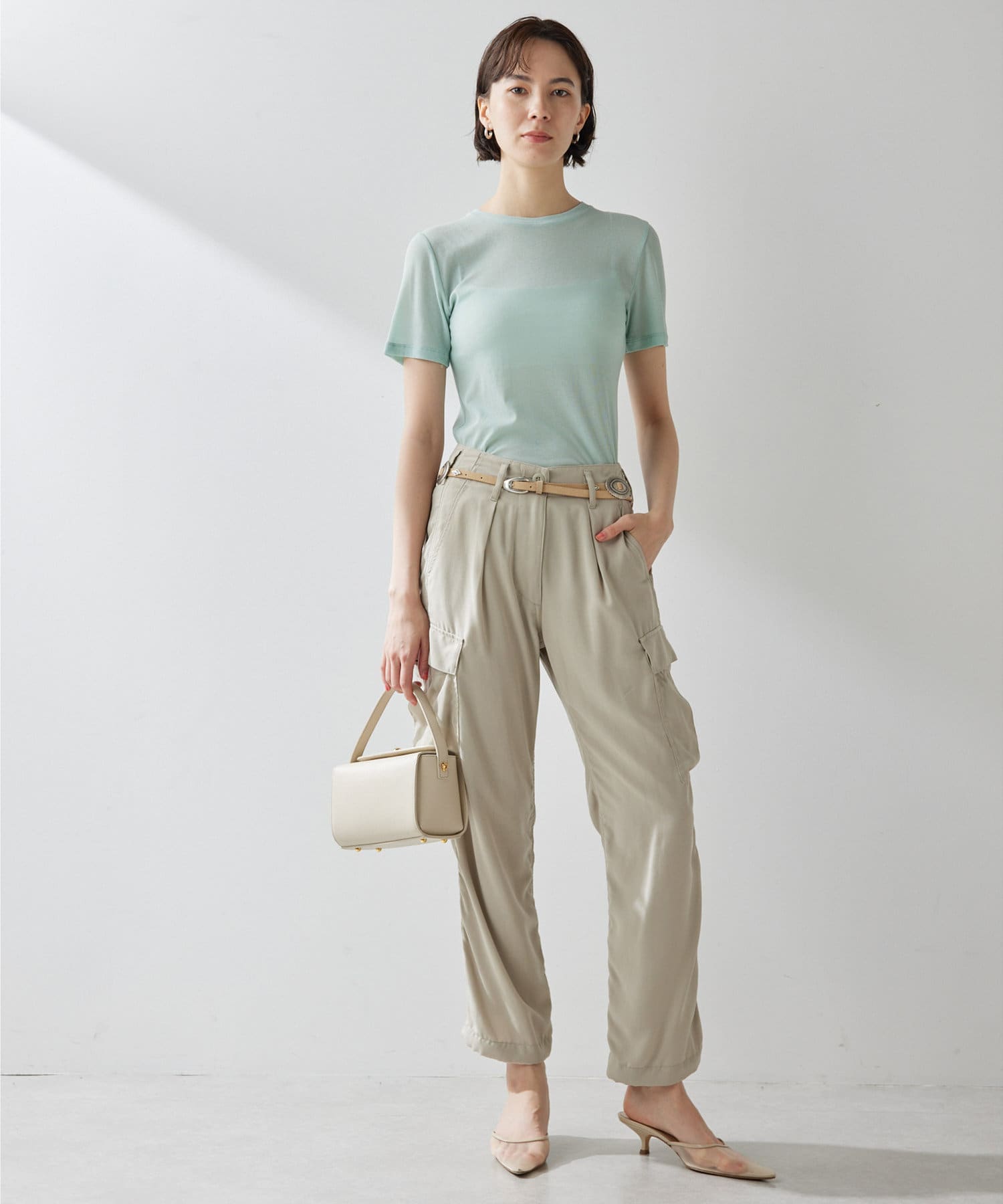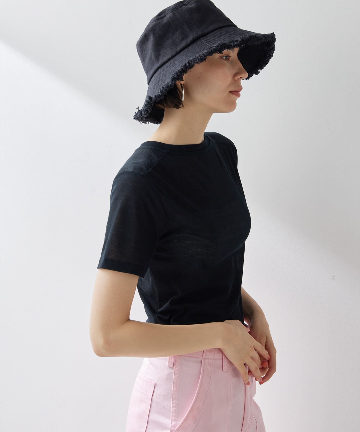 一枚は欲しいシアーTシャツ。コンパクトめですがストレッチ性があり、着心地がとても良いです。シアー感が抜け感を出してくれ、シンプルコーデもオシャレな雰囲気に。