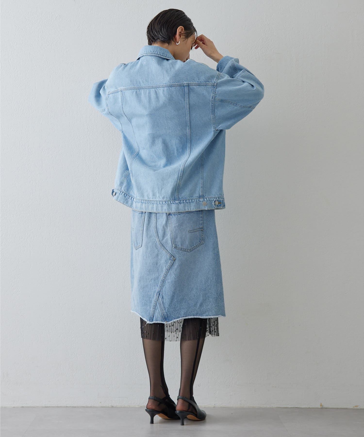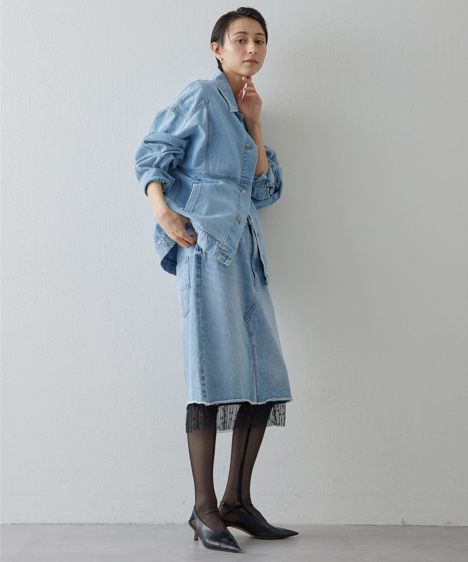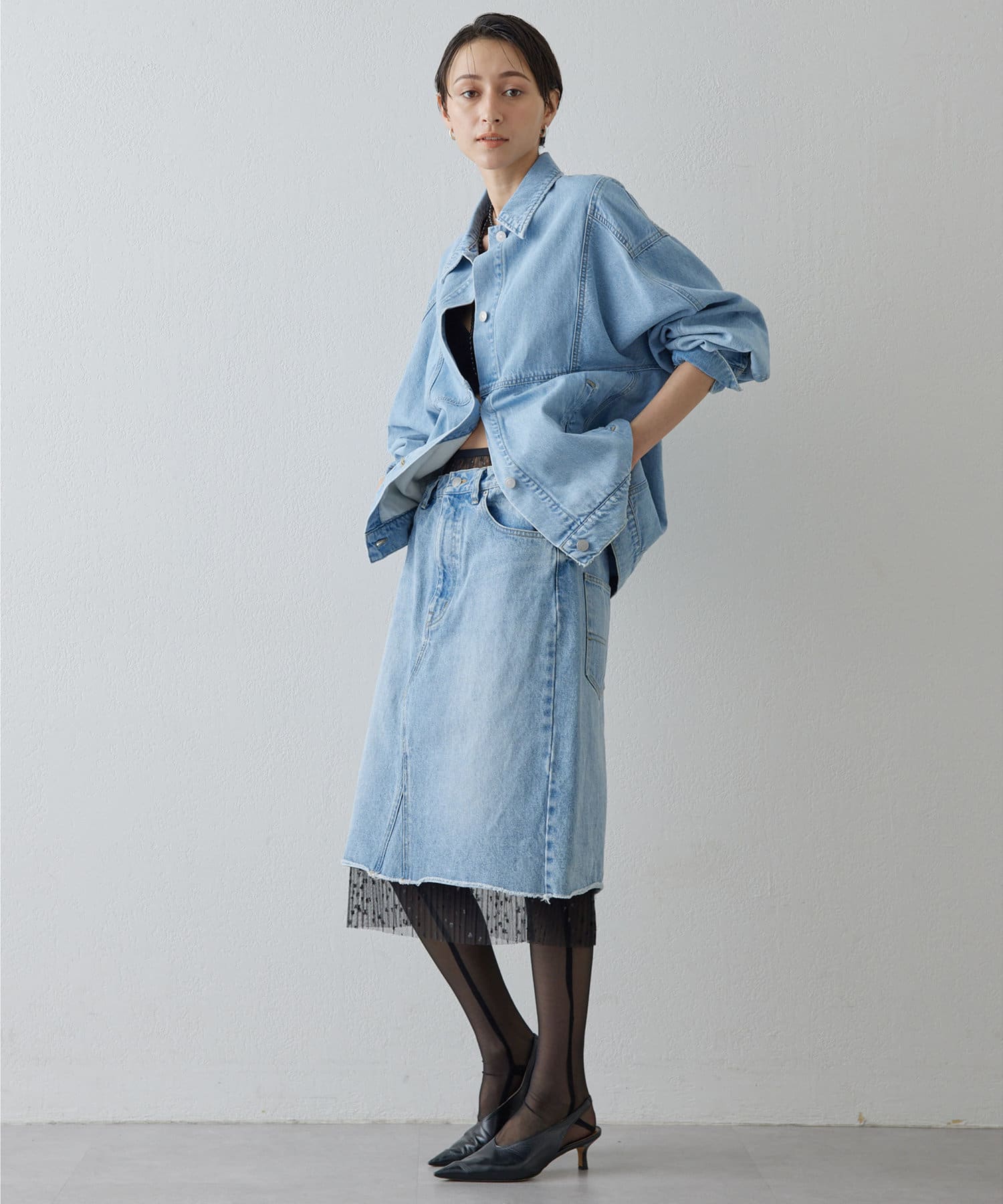 ■上下デニム合わせのスタイルや、ミニボトムやタイトスカート、シアーボトムなどの女性らしいボトムとのコーディネートがおすすめ。