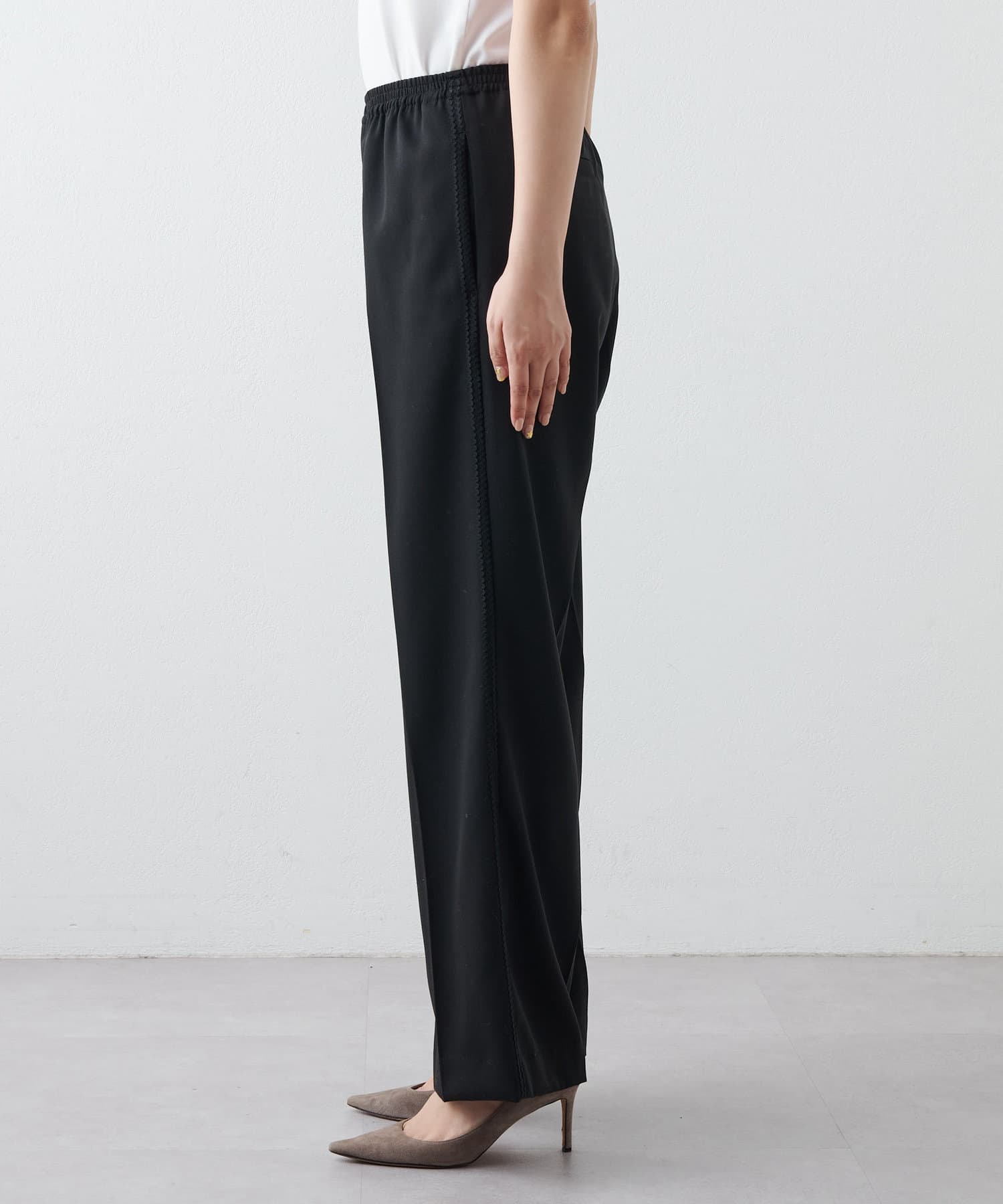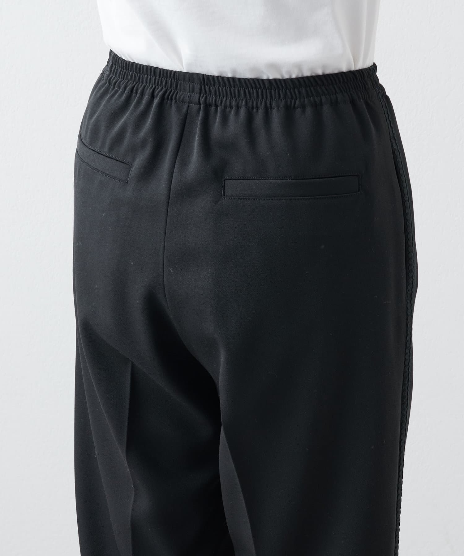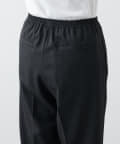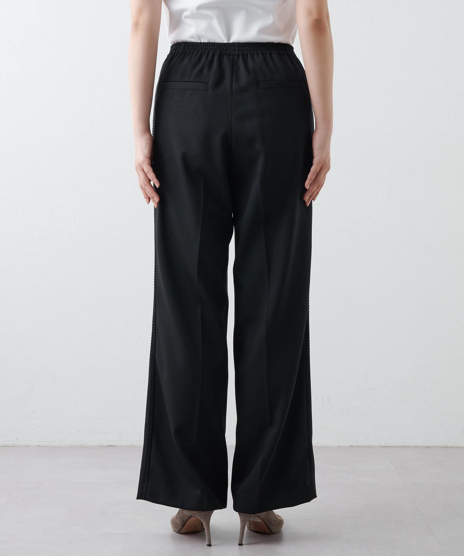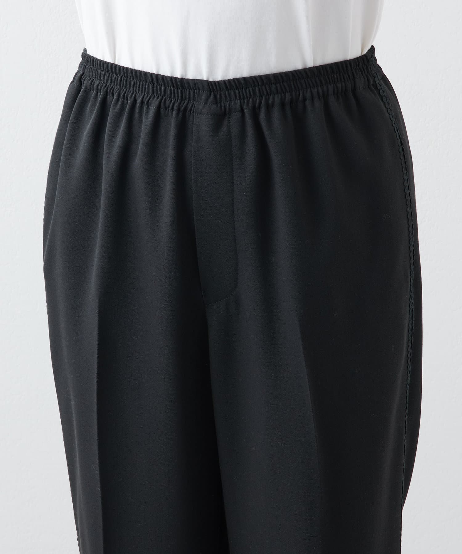 ■クリース入りのタキシードパンツのウエストをゴム仕様にしたデザイン。