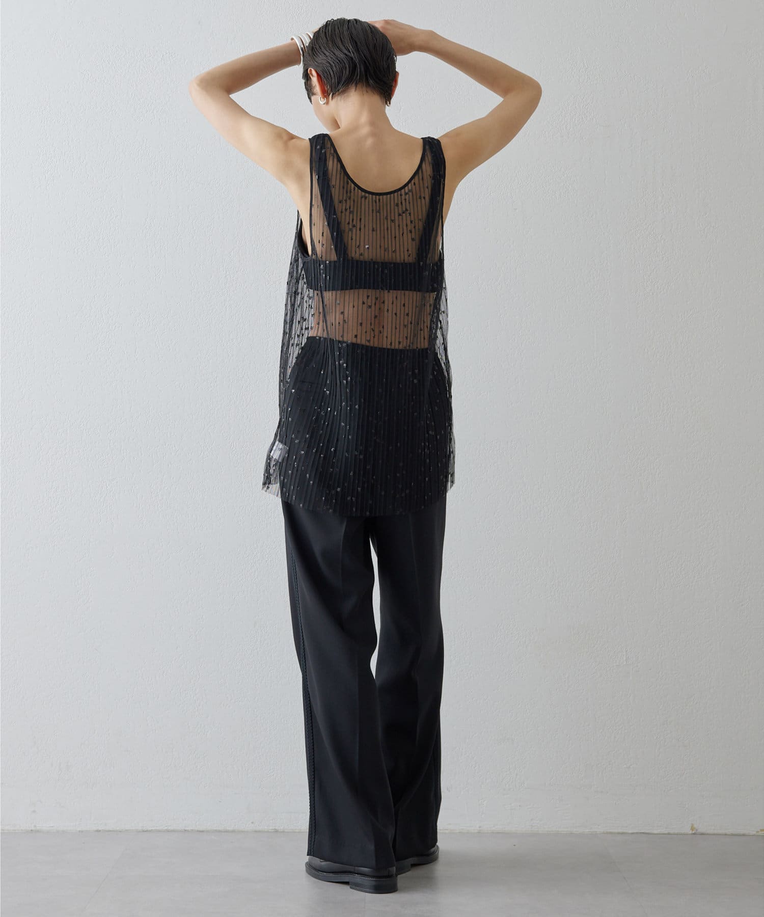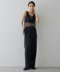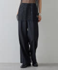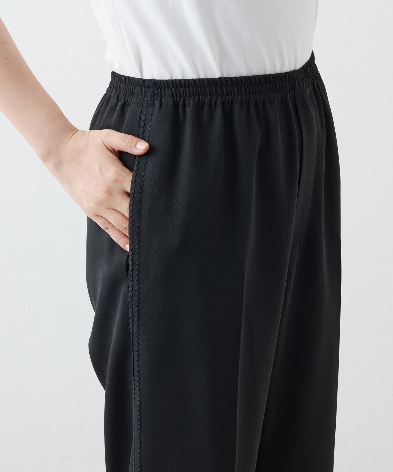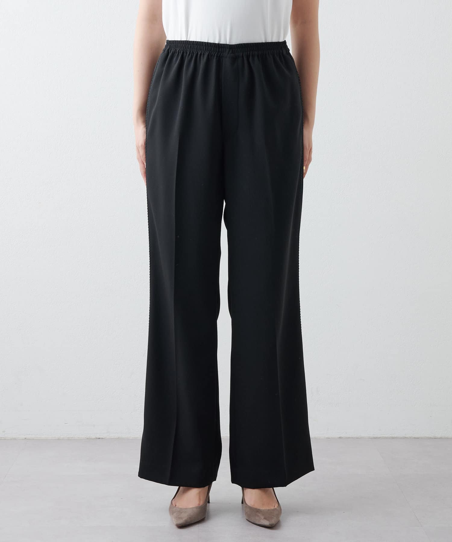 ■クリース入りのタキシードパンツのウエストをゴム仕様にしたデザイン。