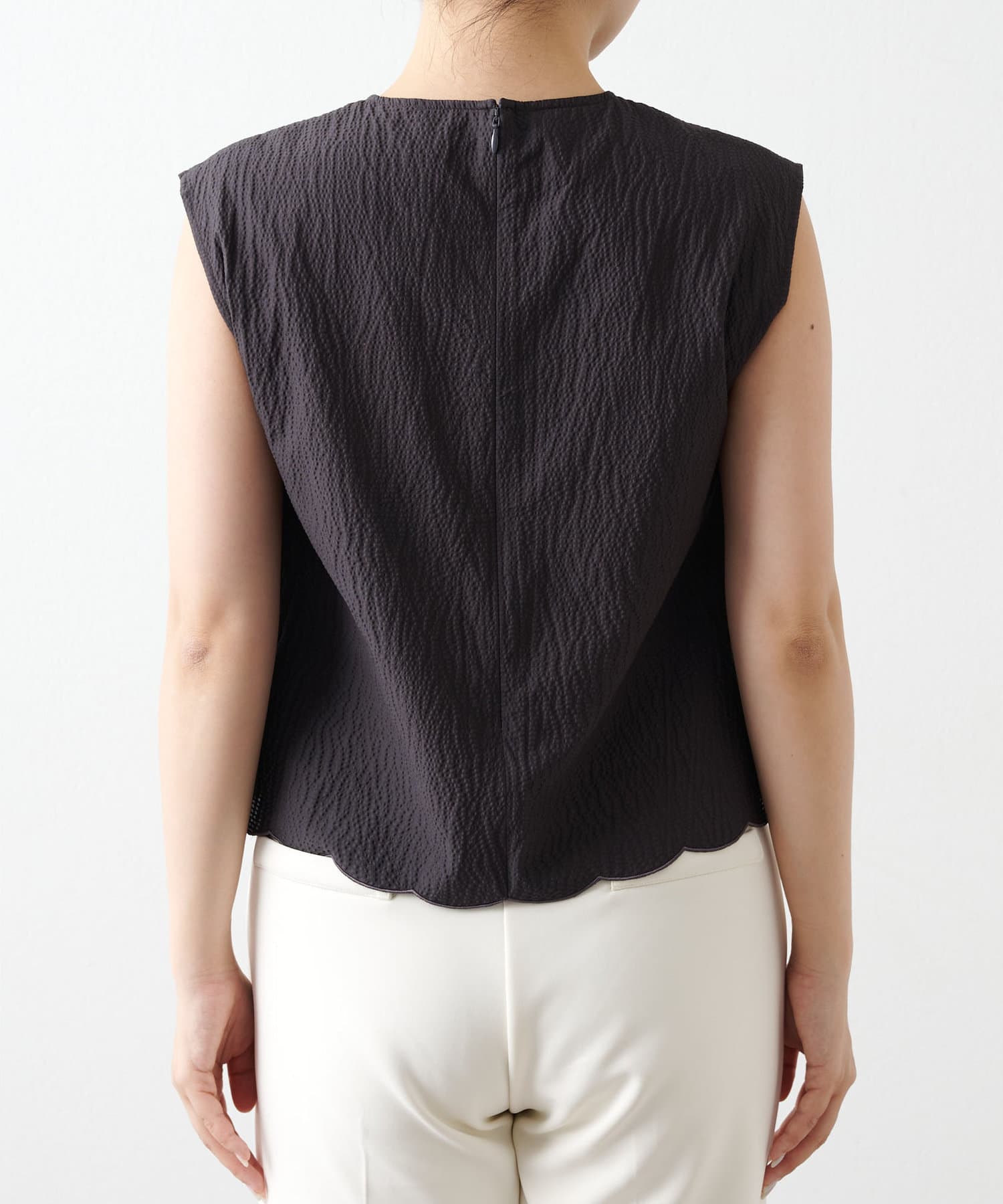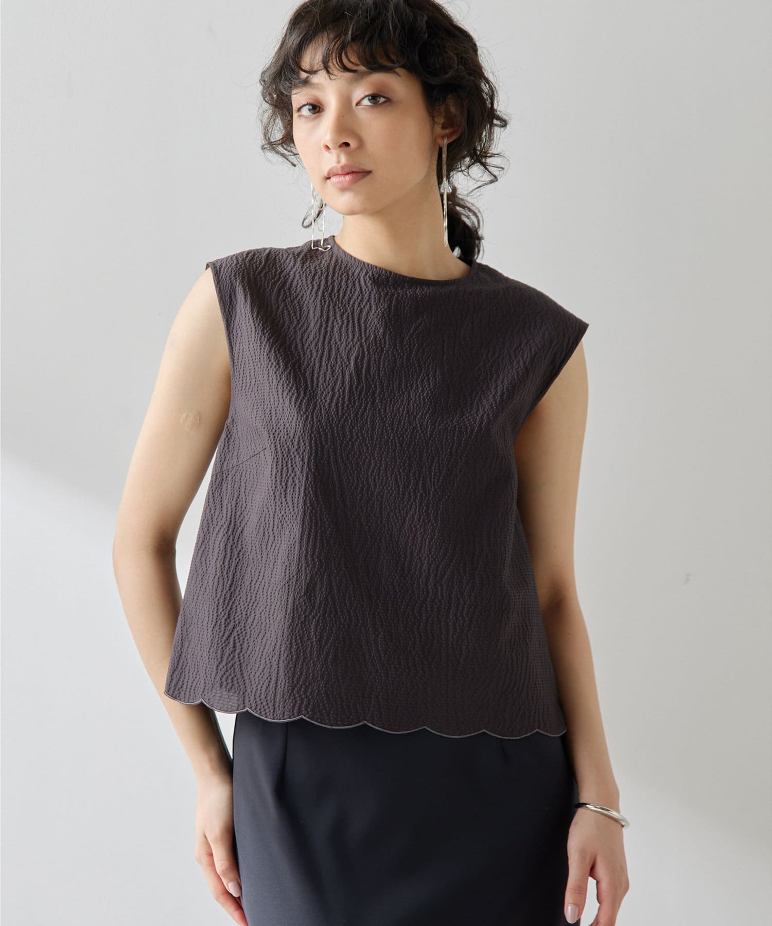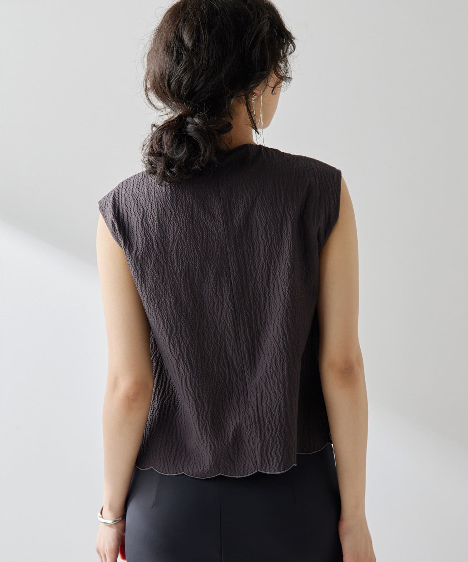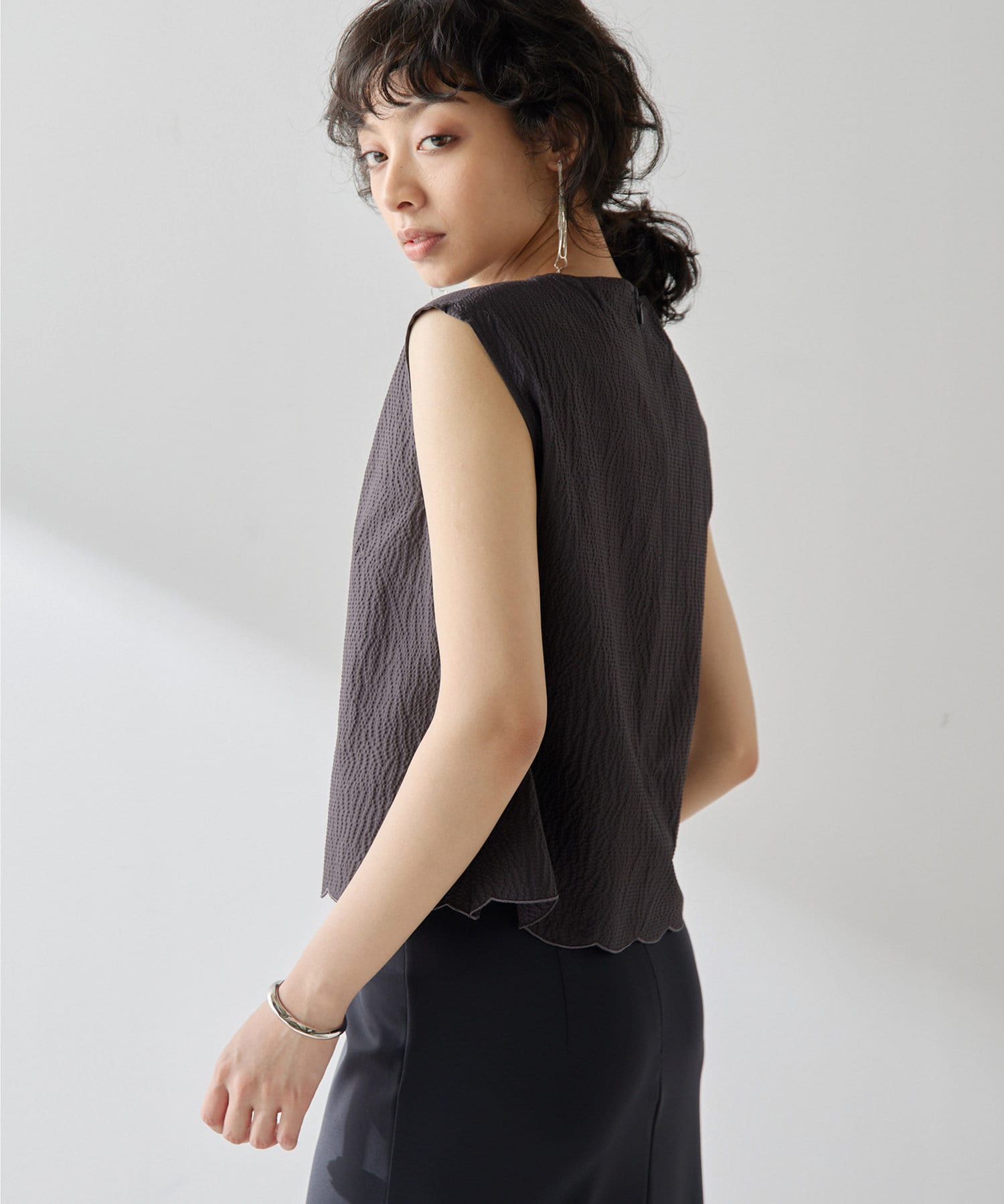 ■裾のスカラップと表情のある素材が特徴的なノースリーブブラウス。
