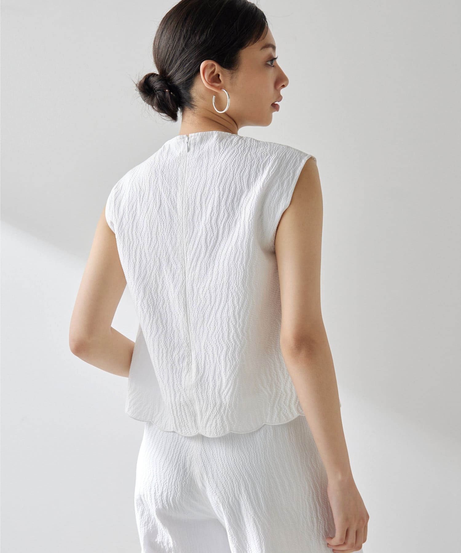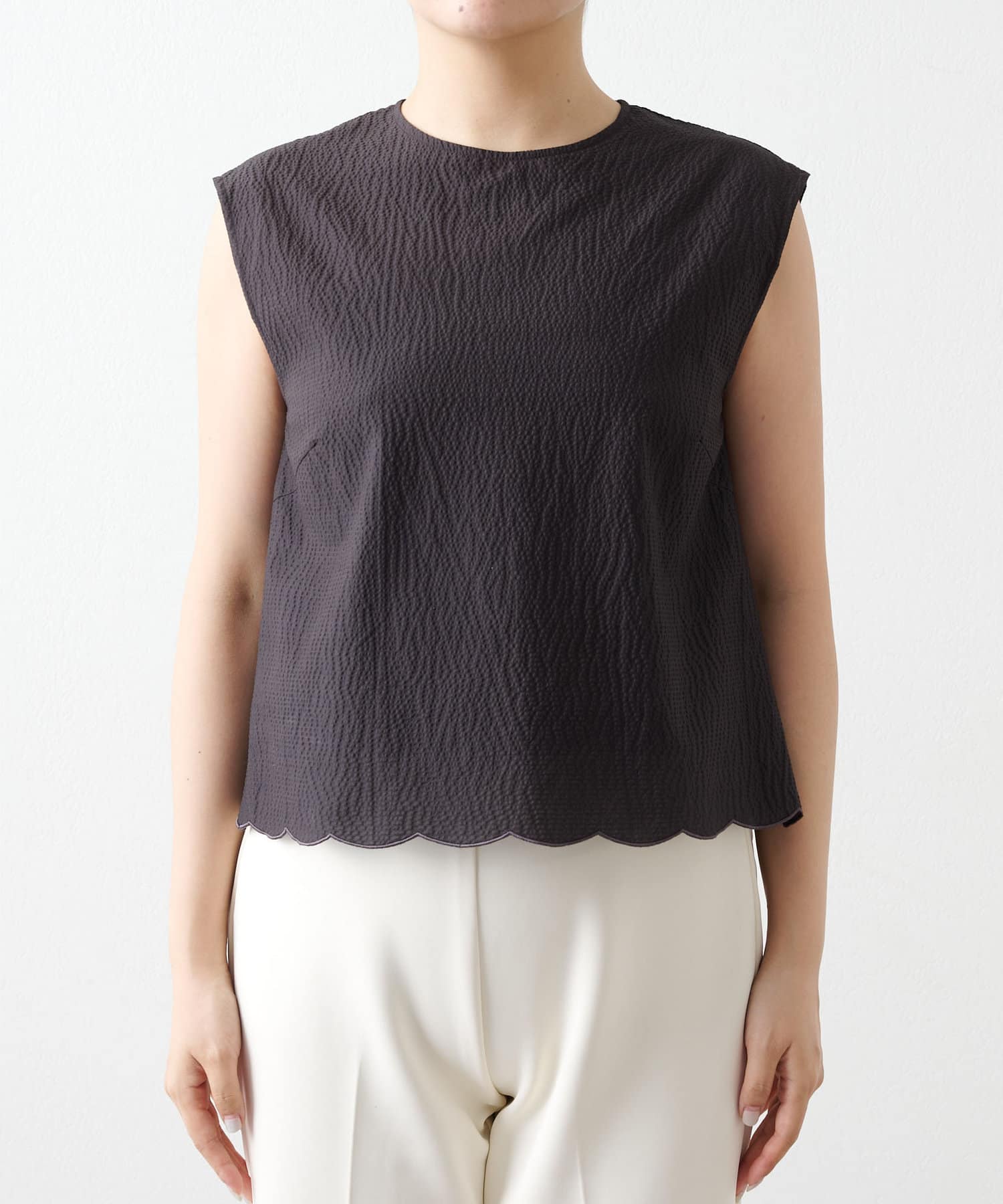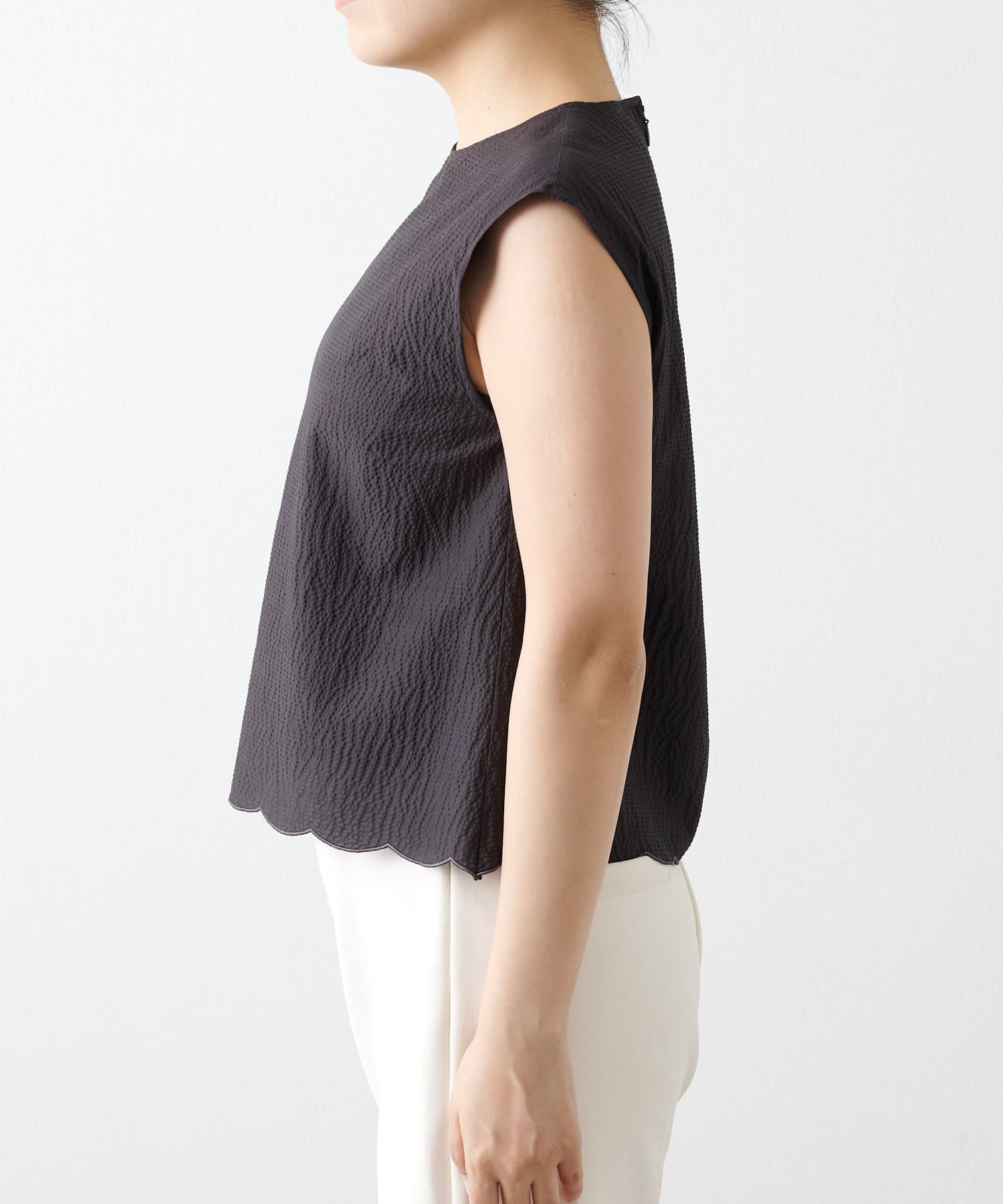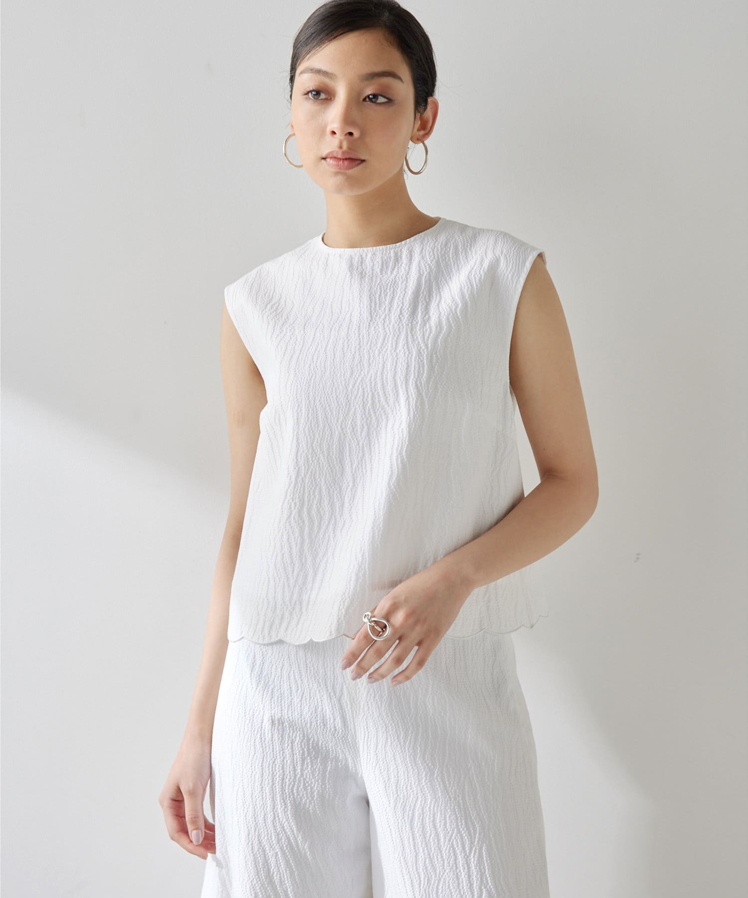 ■裾のスカラップと表情のある素材が特徴的なノースリーブブラウス。
