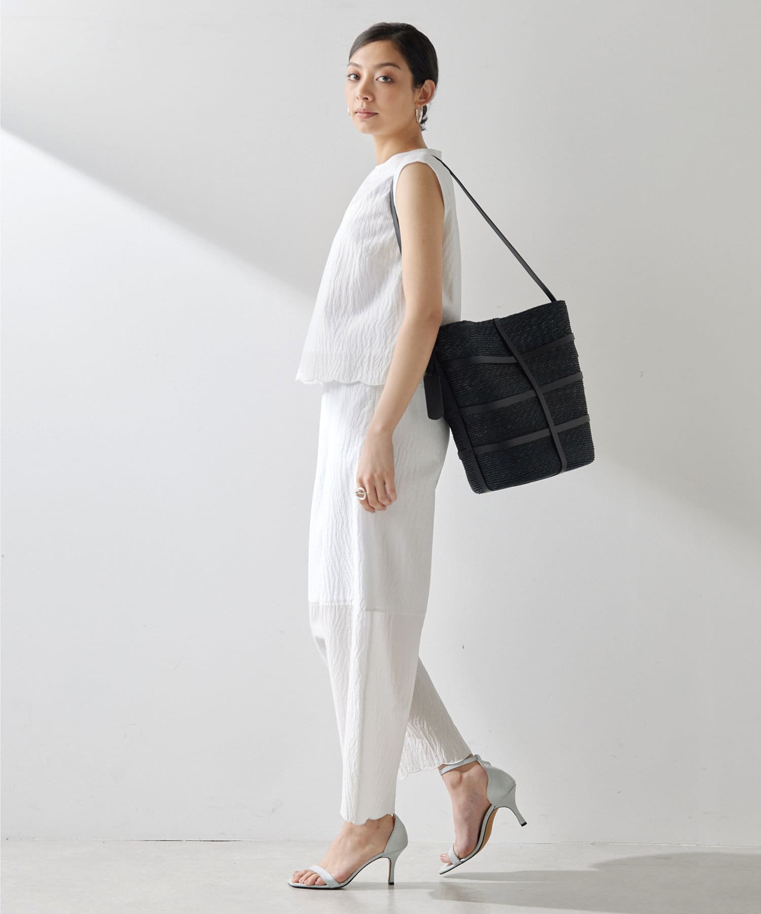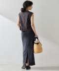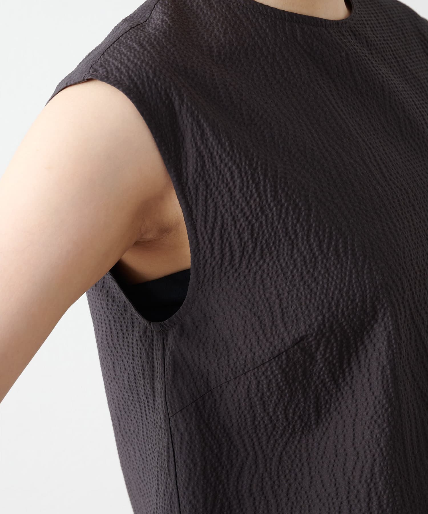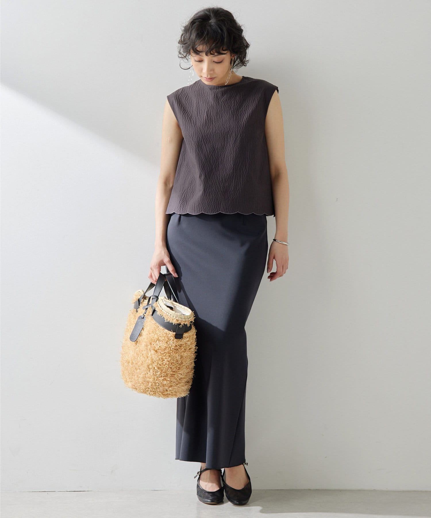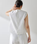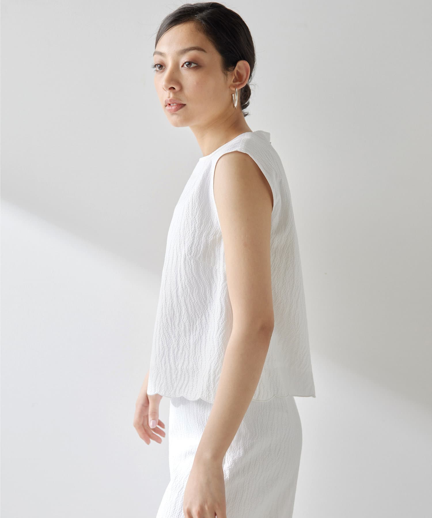 ■裾のスカラップと表情のある素材が特徴的なノースリーブブラウス。