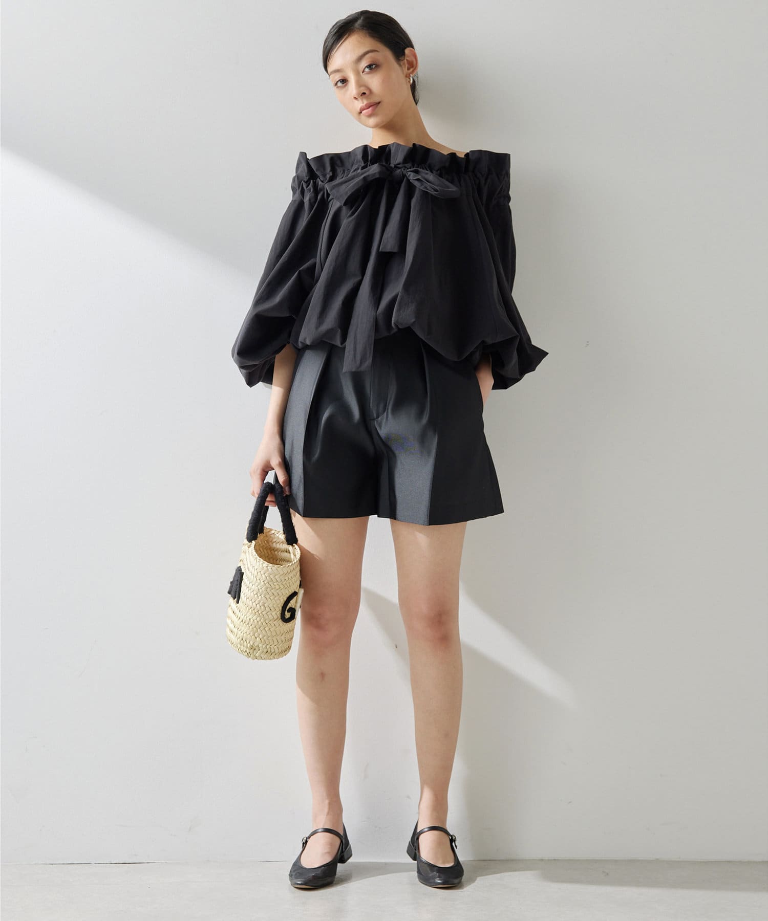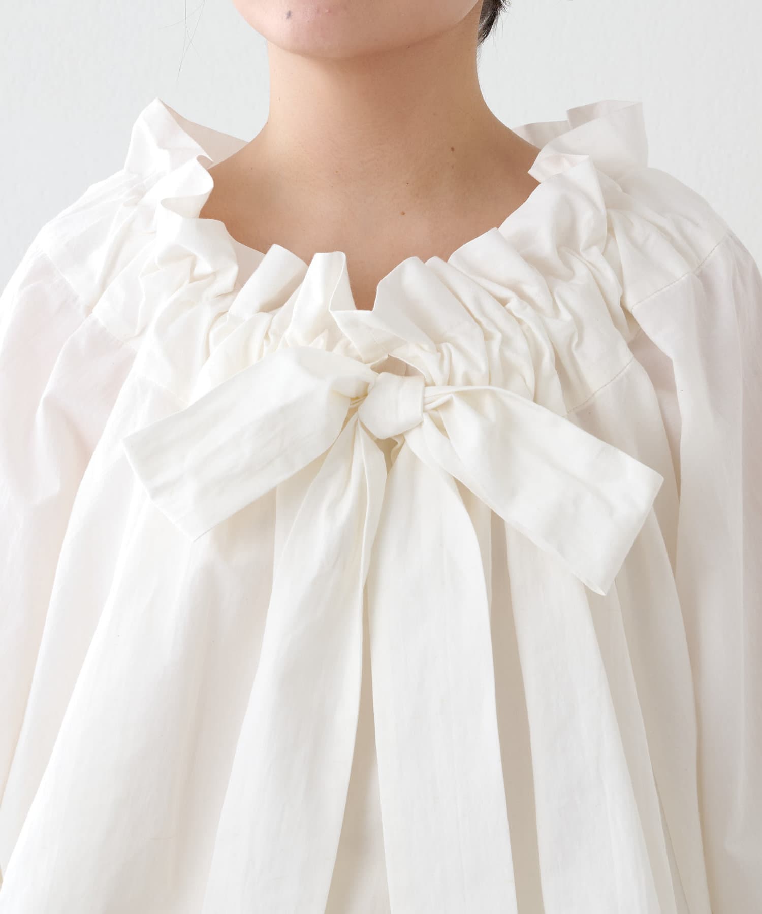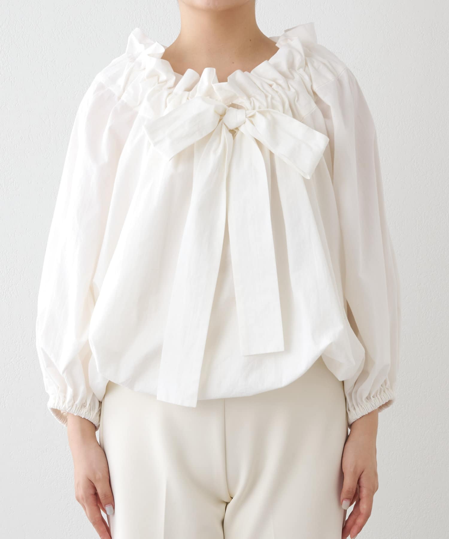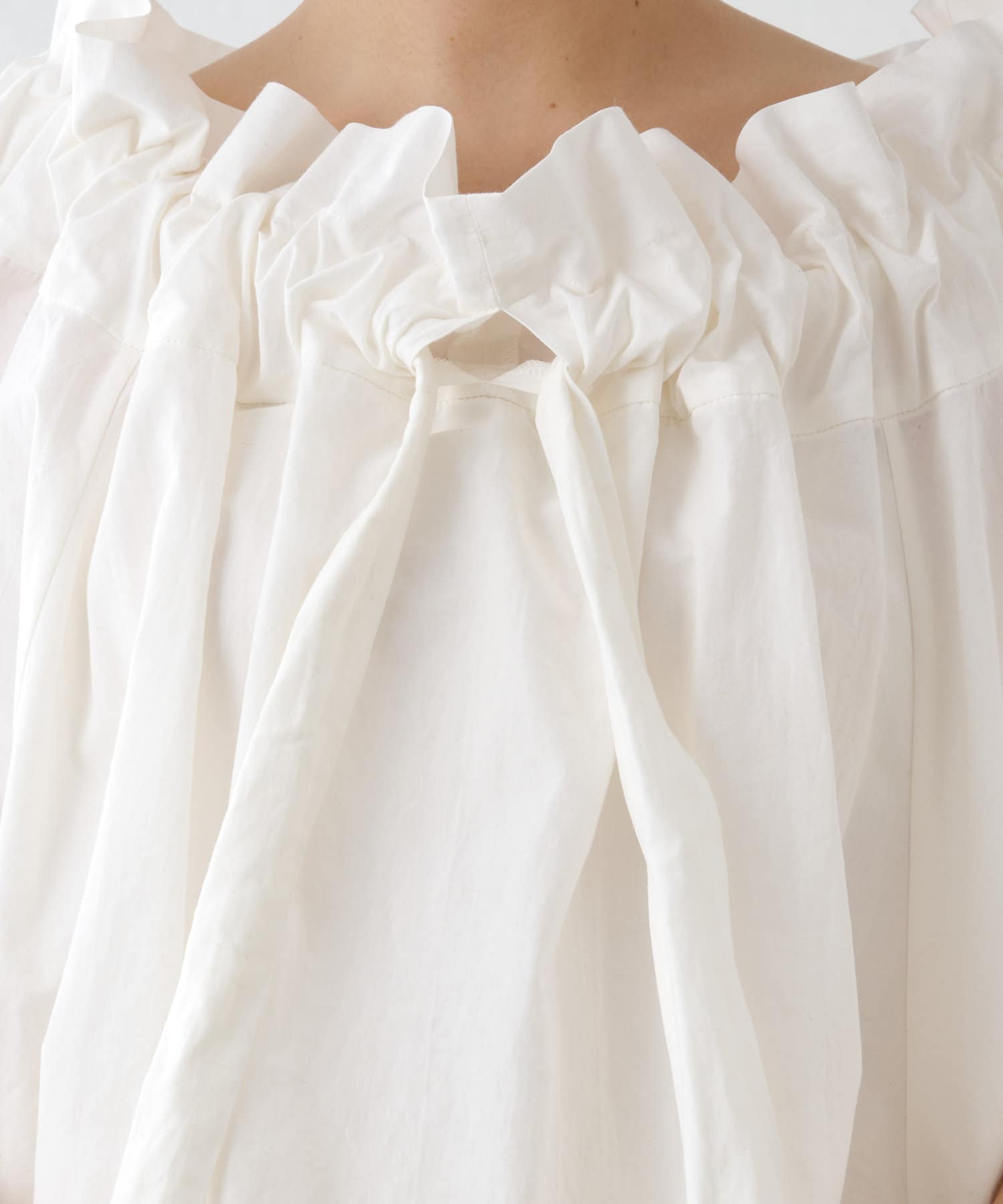 ■華やかなギャザーネックはフロントのリボンで開きを調整でき、オフショルダーでも楽しめるデザイン。