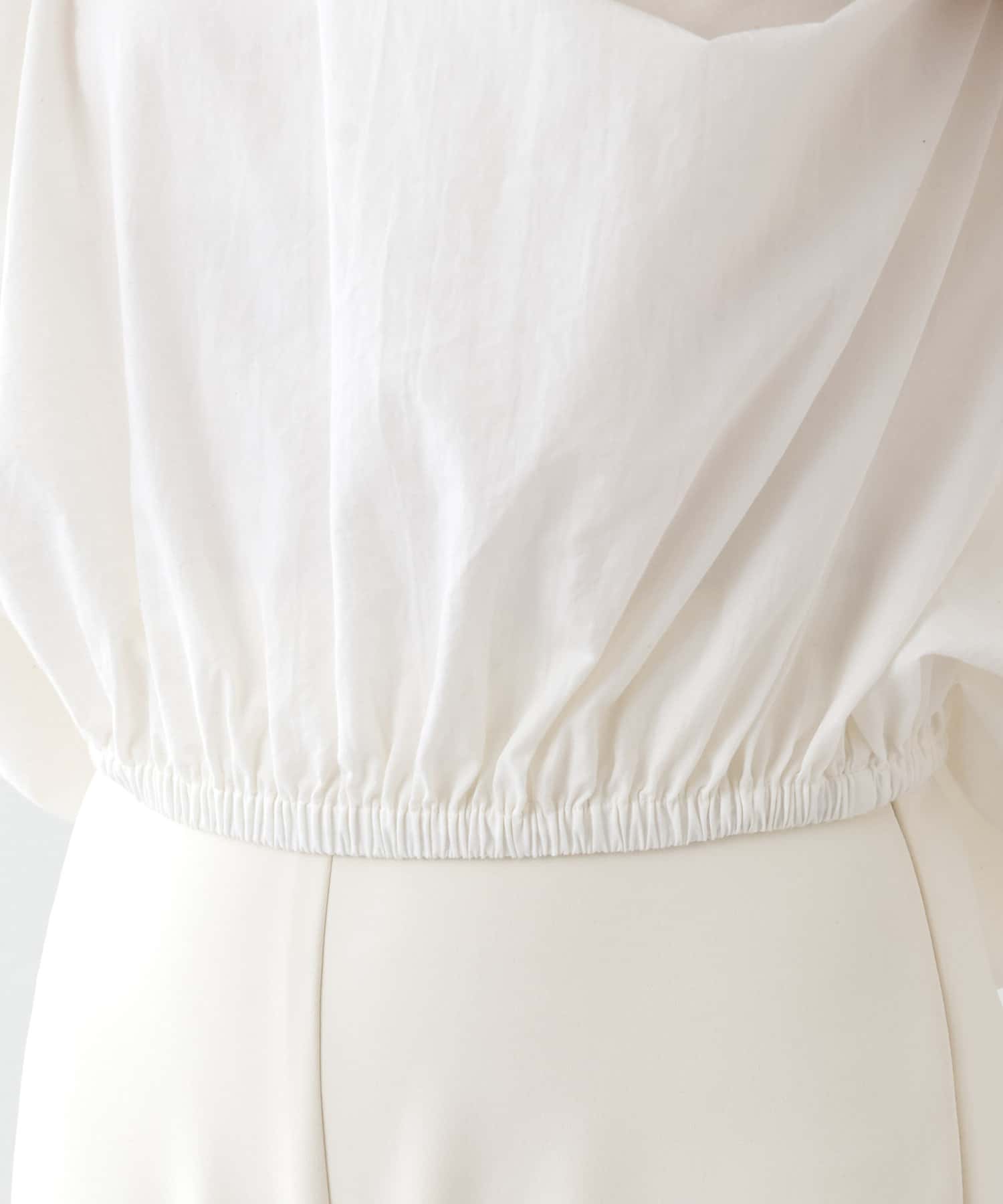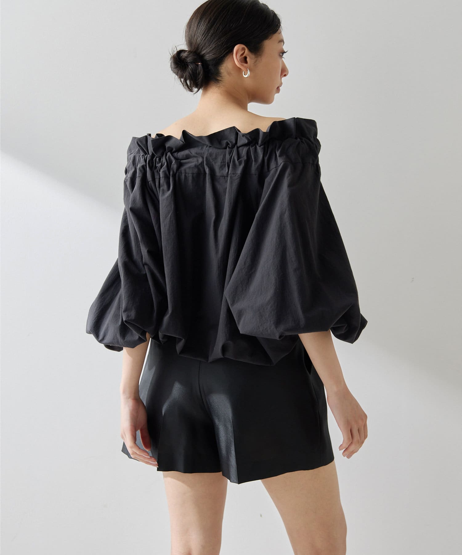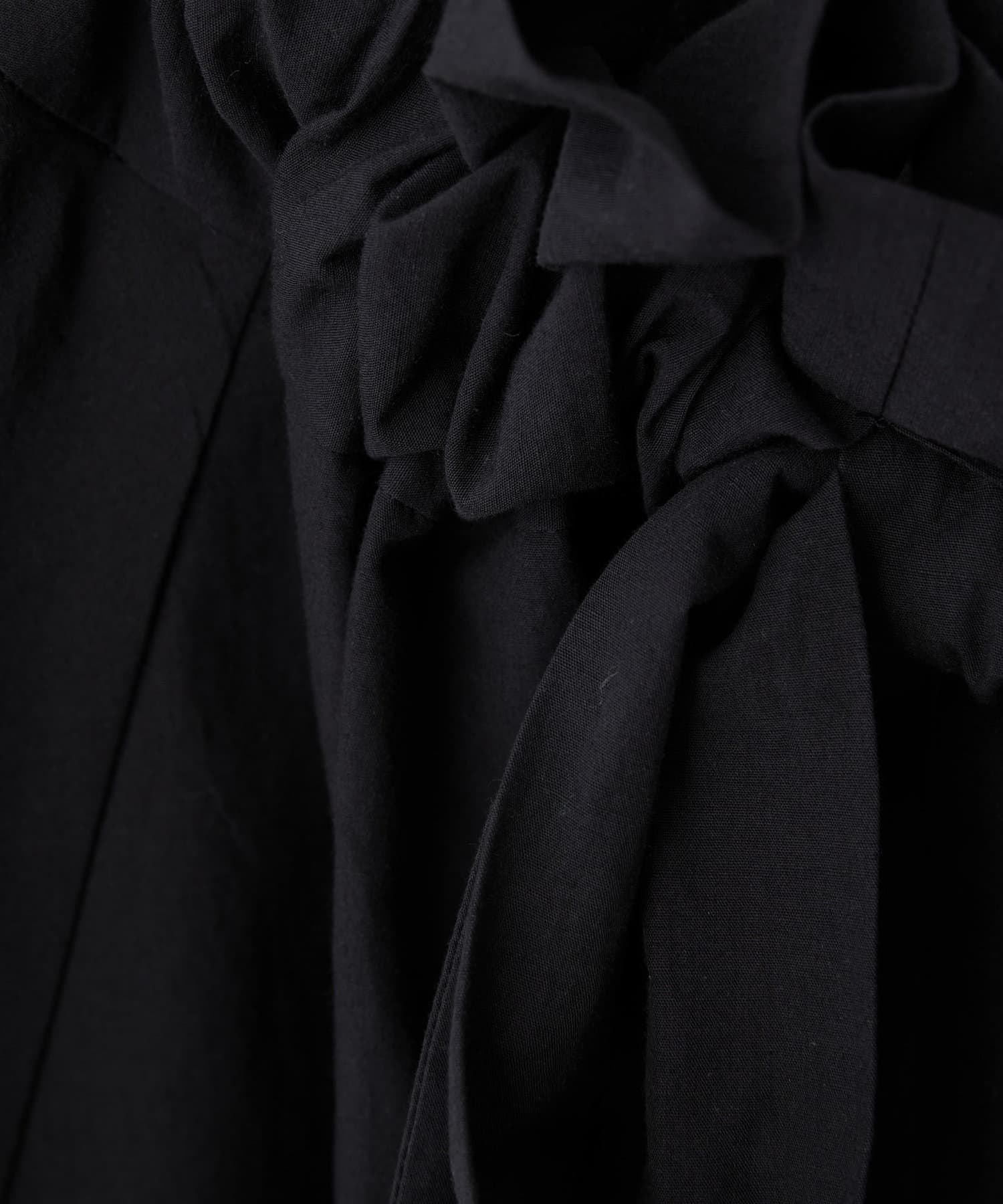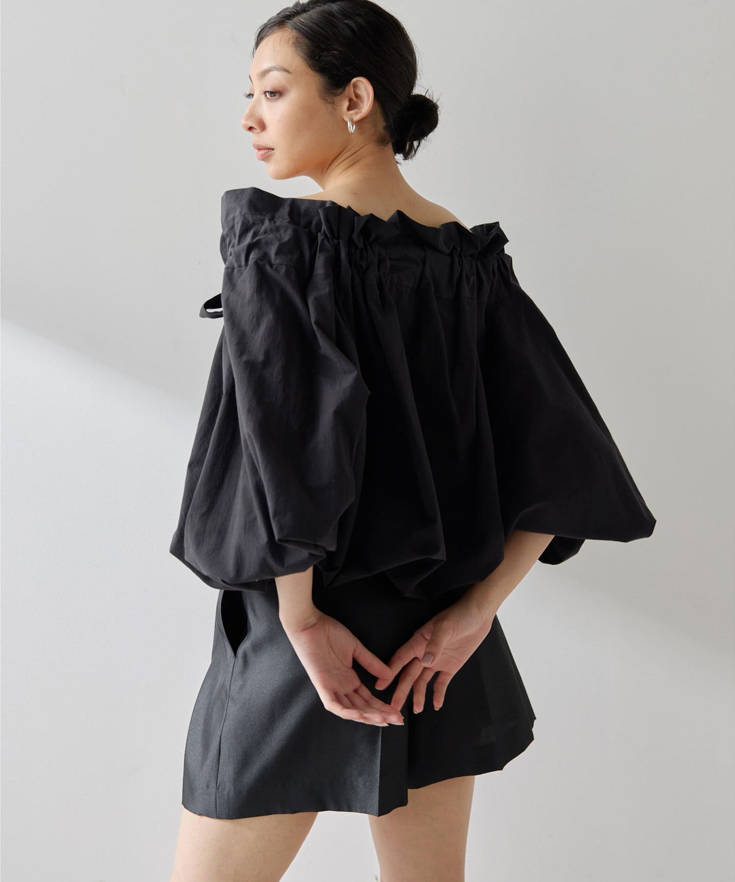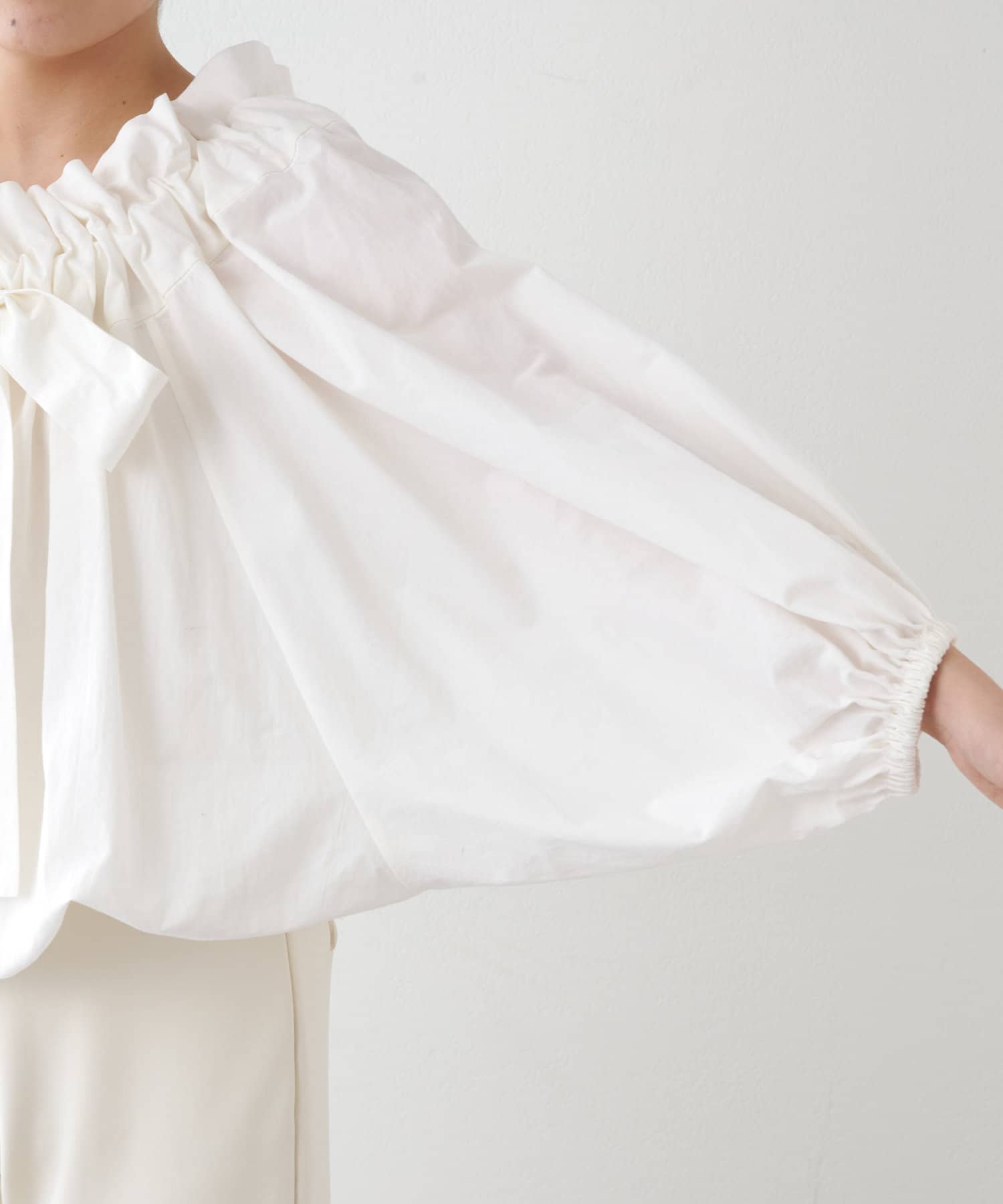 ■華やかなギャザーネックはフロントのリボンで開きを調整でき、オフショルダーでも楽しめるデザイン。