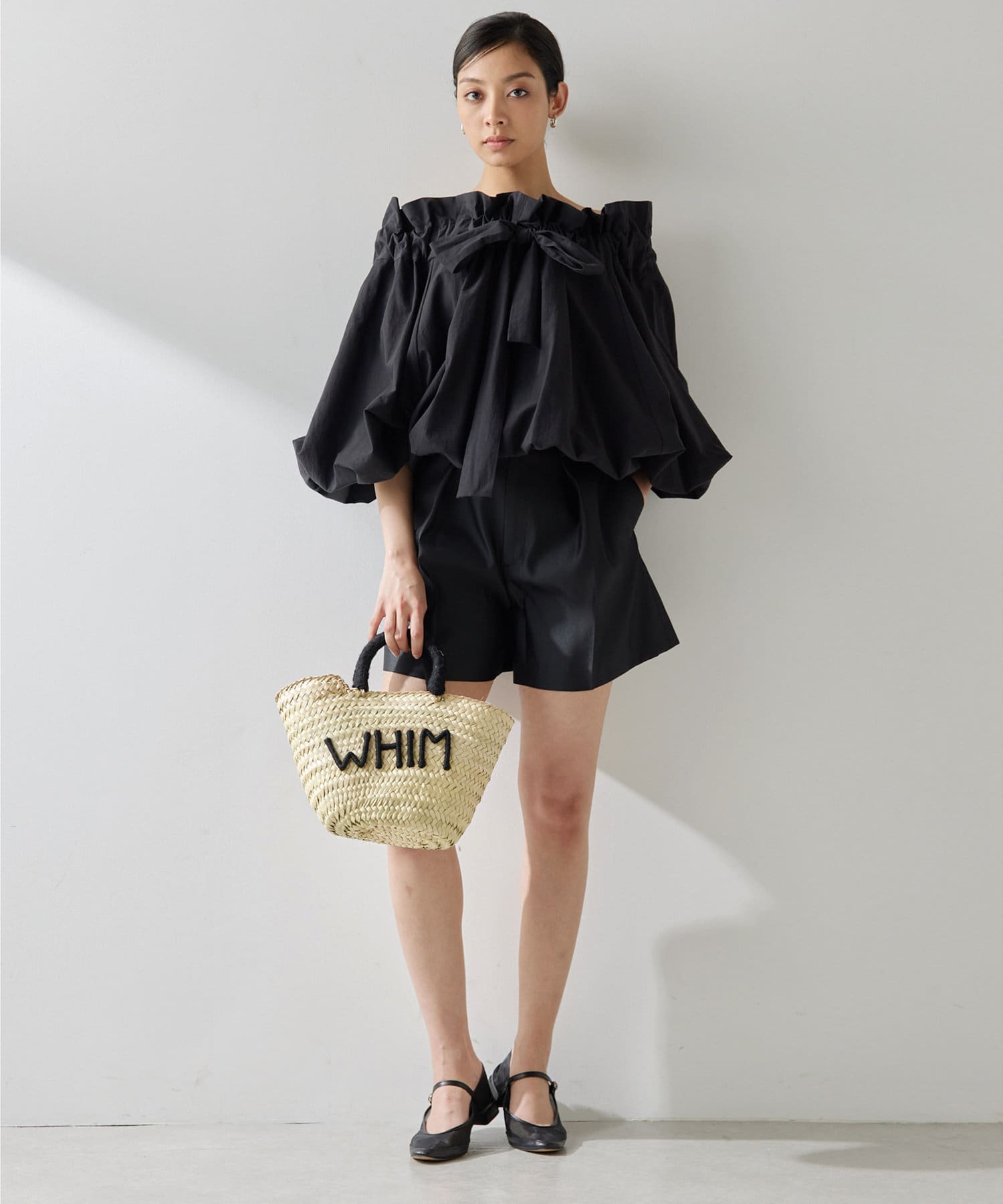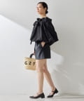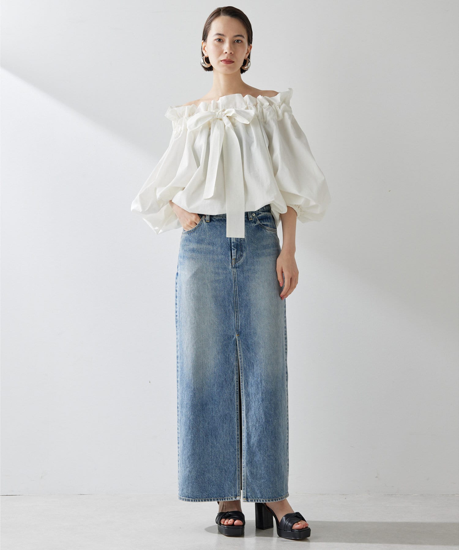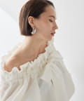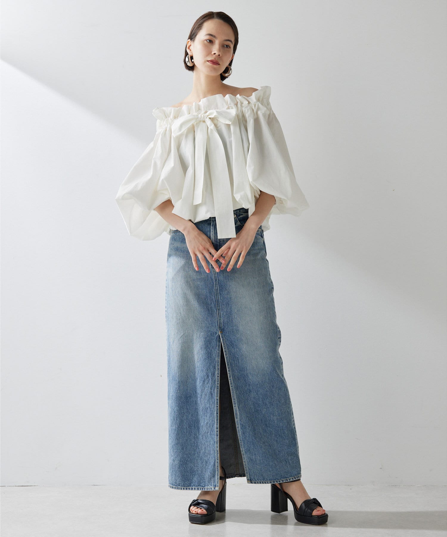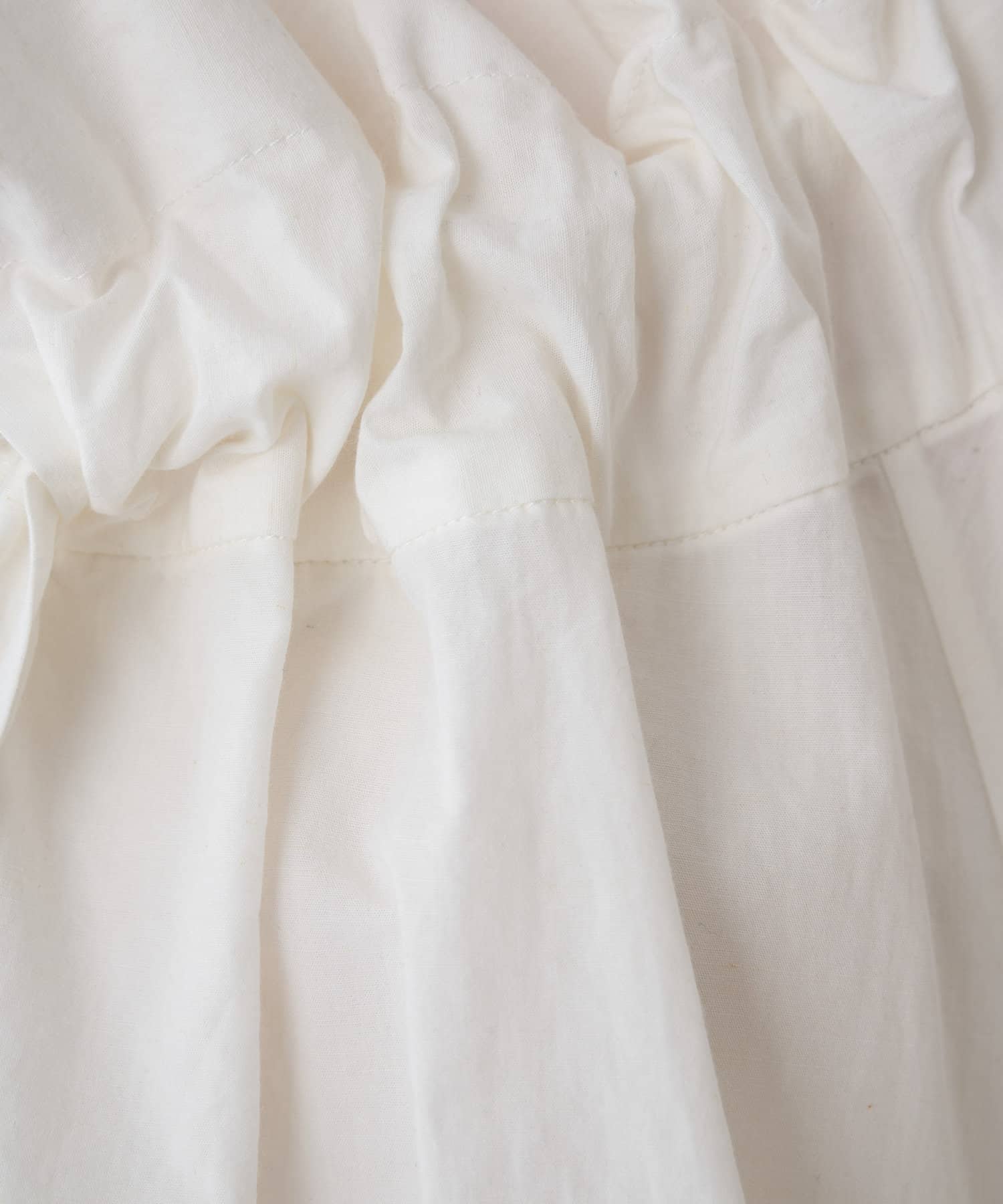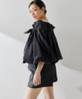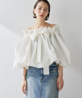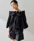 ■華やかなギャザーネックはフロントのリボンで開きを調整でき、オフショルダーでも楽しめるデザイン。
