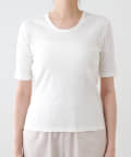 5分袖のTシャツはシンプルながらも女性らしさが出る形なので、そのまま着るだけで十分素敵ですよね。こちらのTシャツはUネックの開きと、リブの感じが絶妙でとても良いです◎