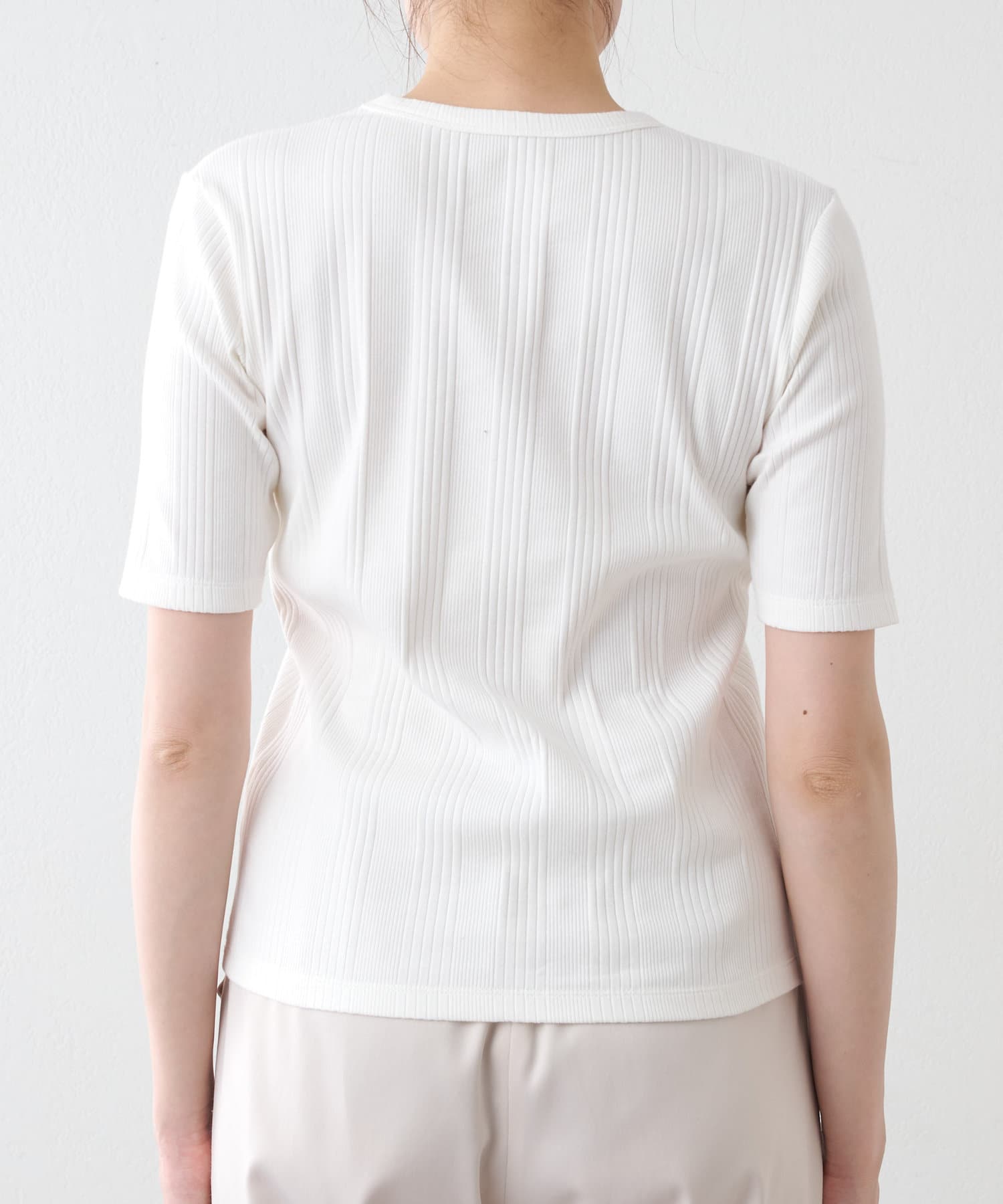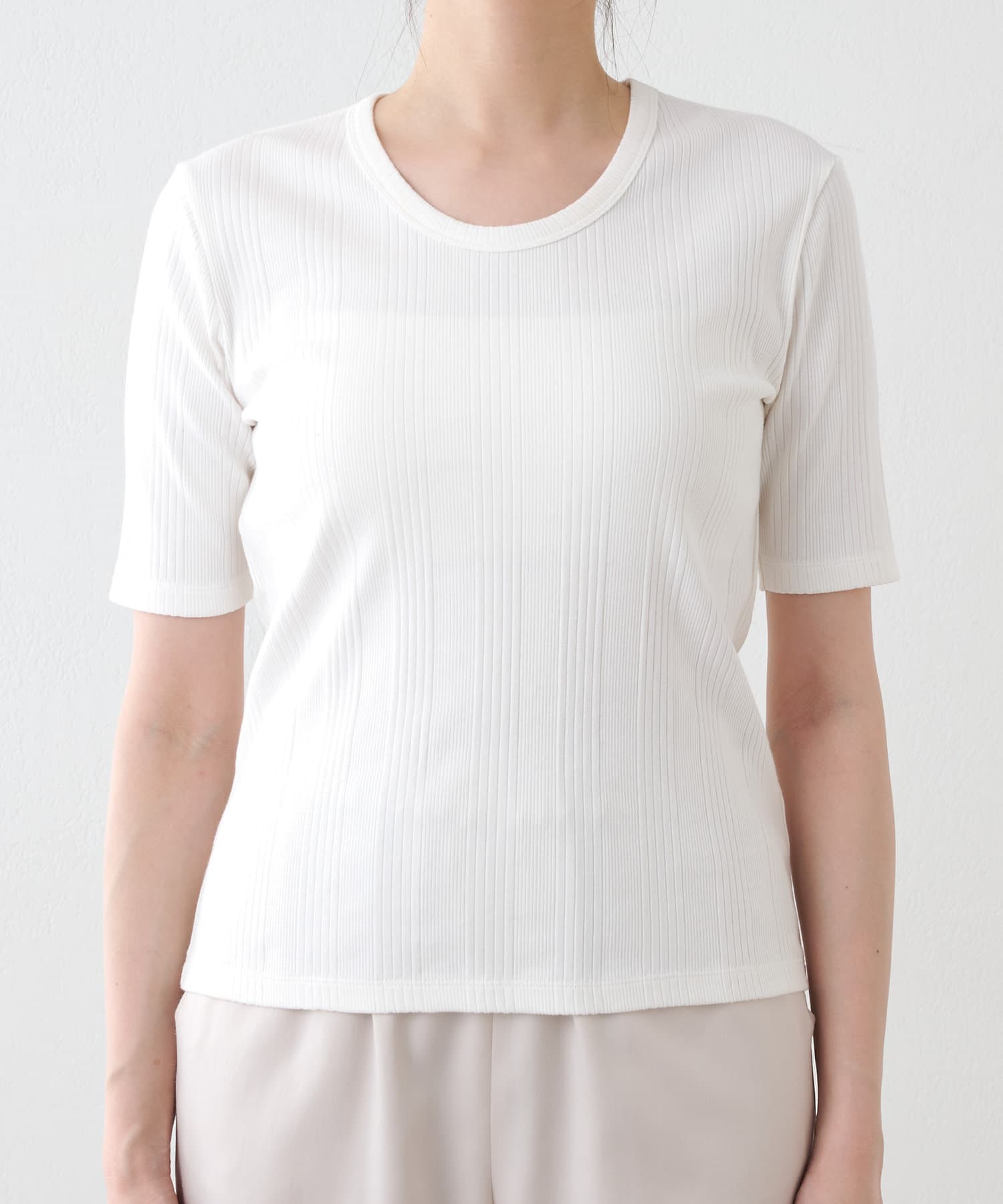 ■ランダムリブの表情がポイントの生地を使用した半袖Tシャツ。
