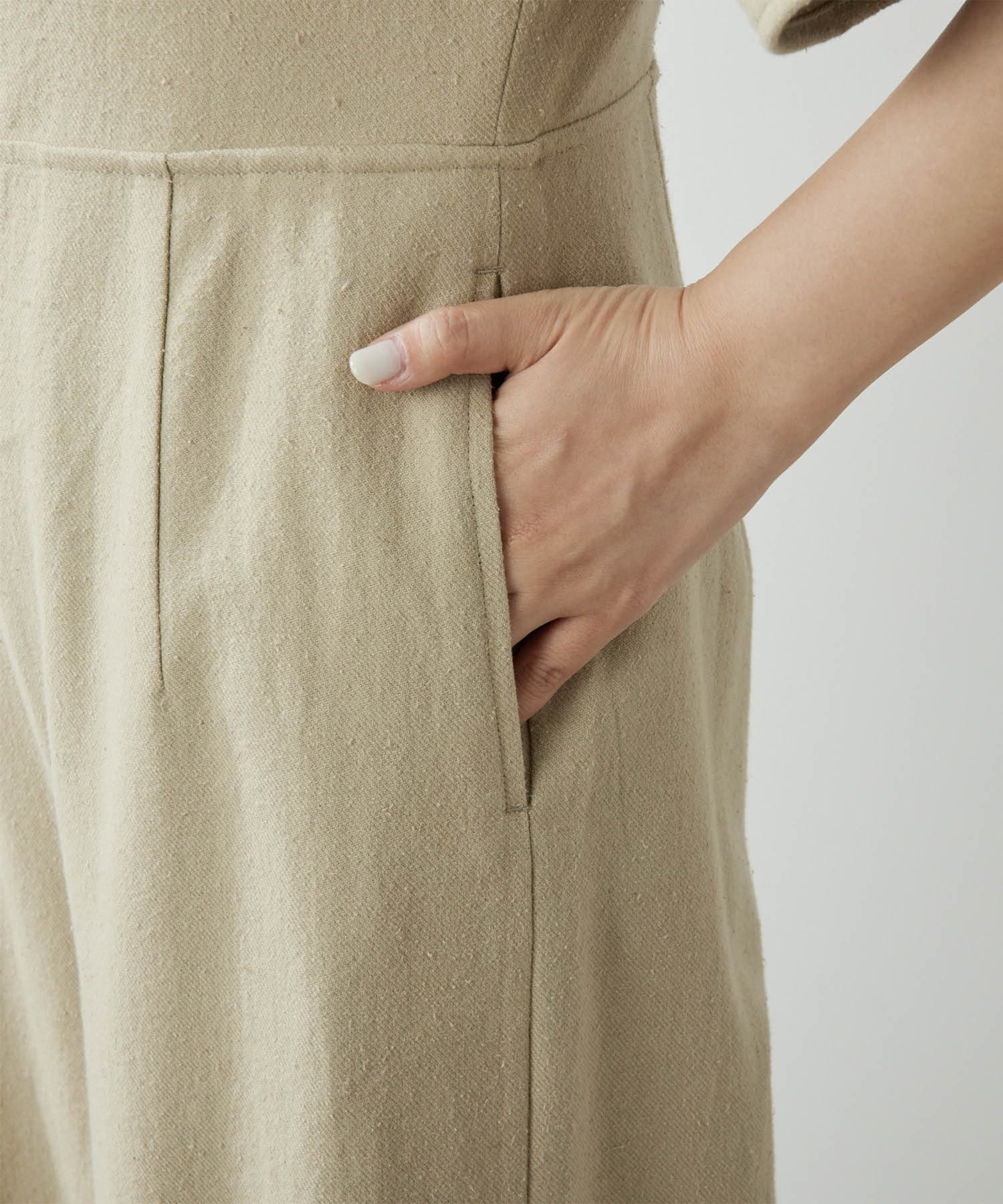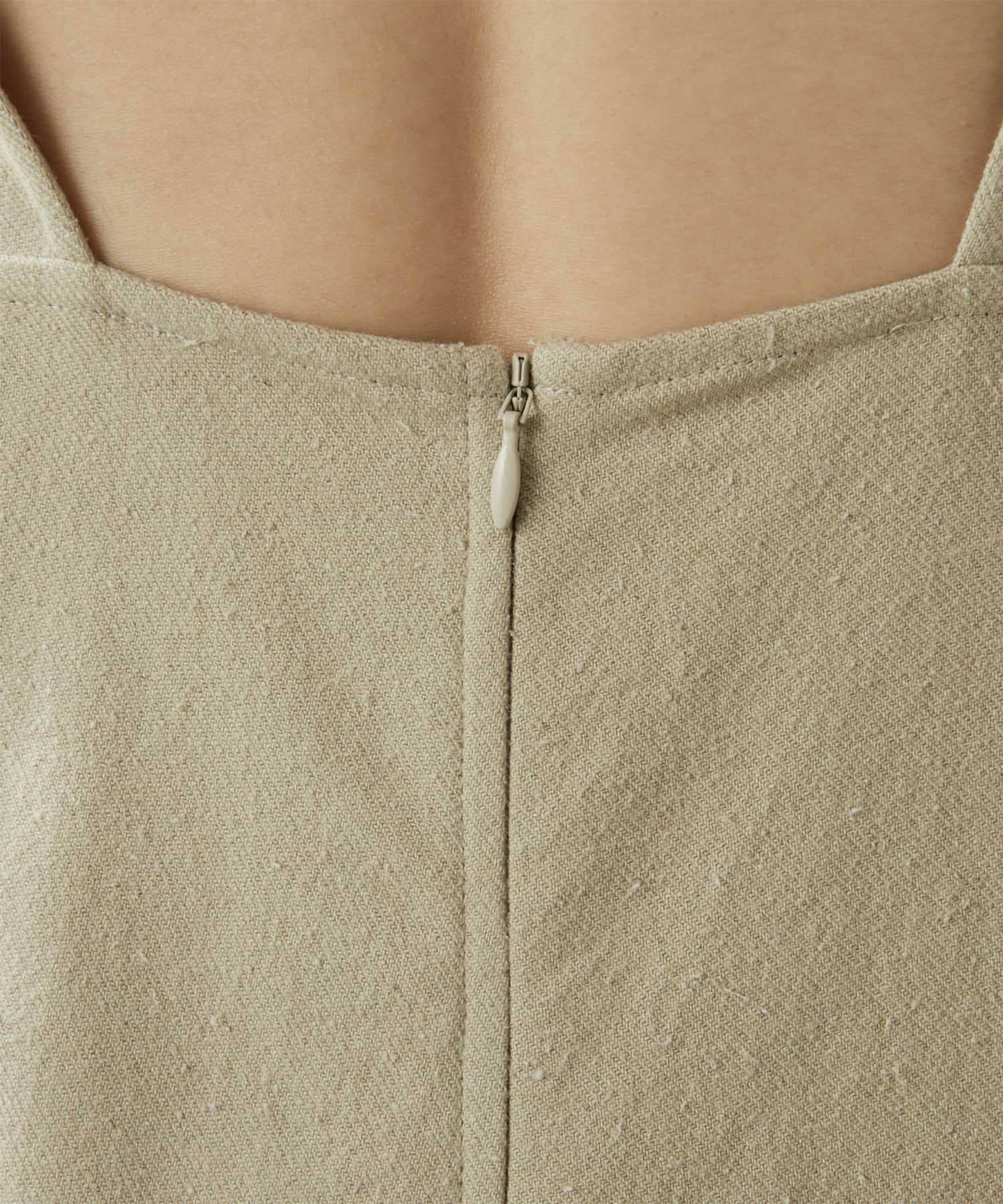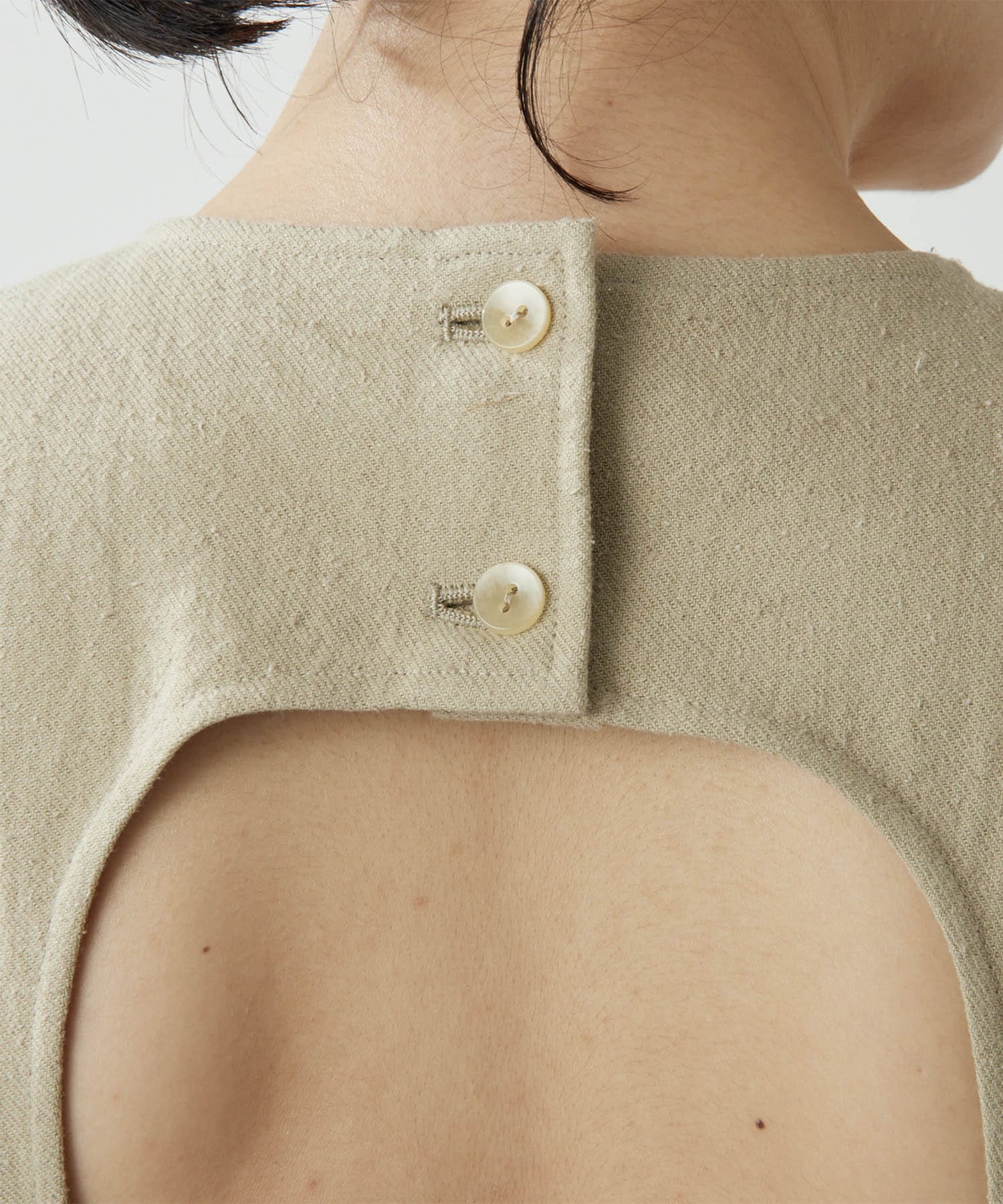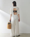 柔らかい風合いとぽこぽこっとした表面感のあるネップ生地。手洗い可能のジャンプスーツです。大胆に開いた背中は暑いこれからのシーズン、潔く見せたいデザイン。インナーには線の細い水着を合わせても良いかも。羽織はリネンストール合わせがおすすめです。