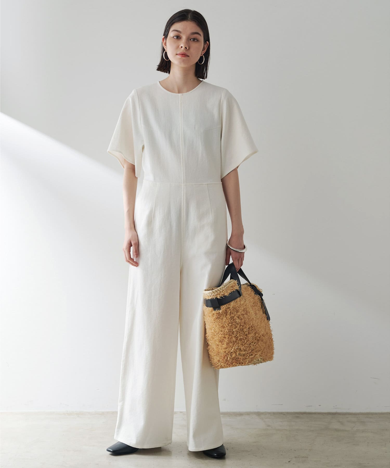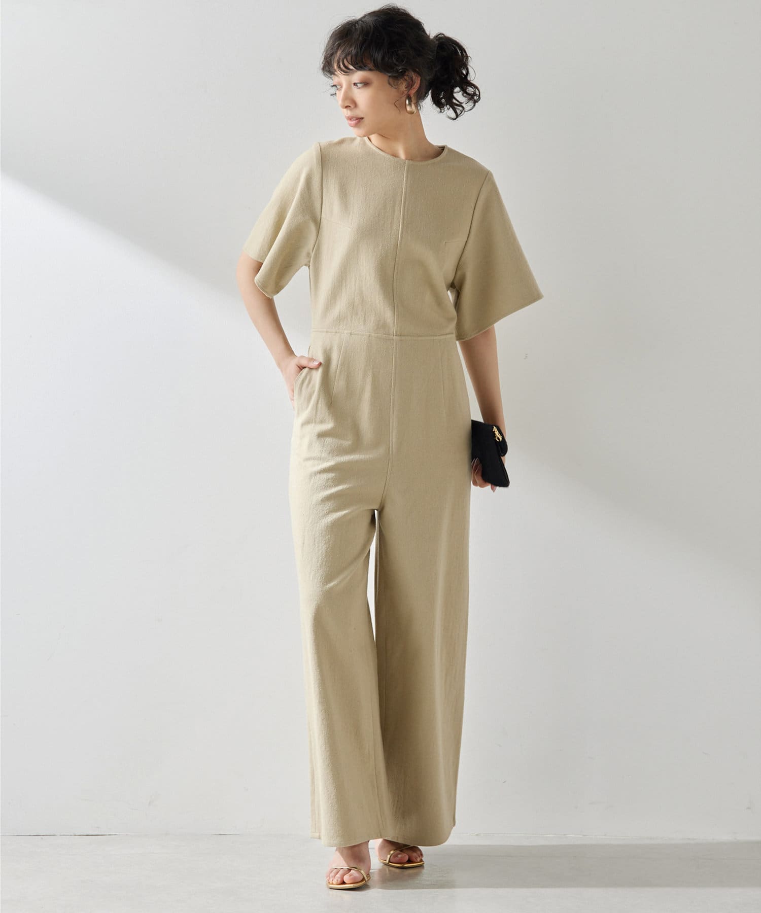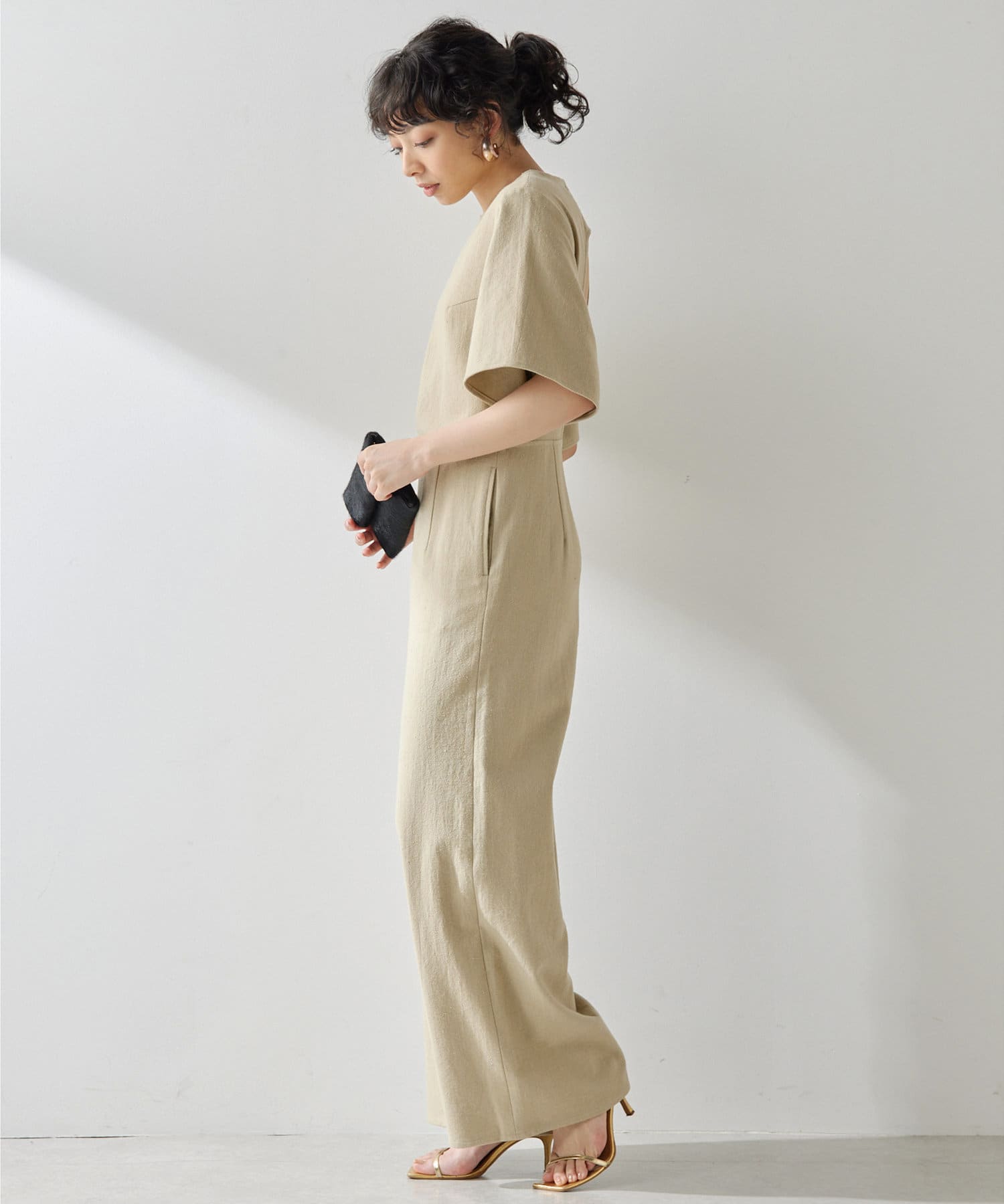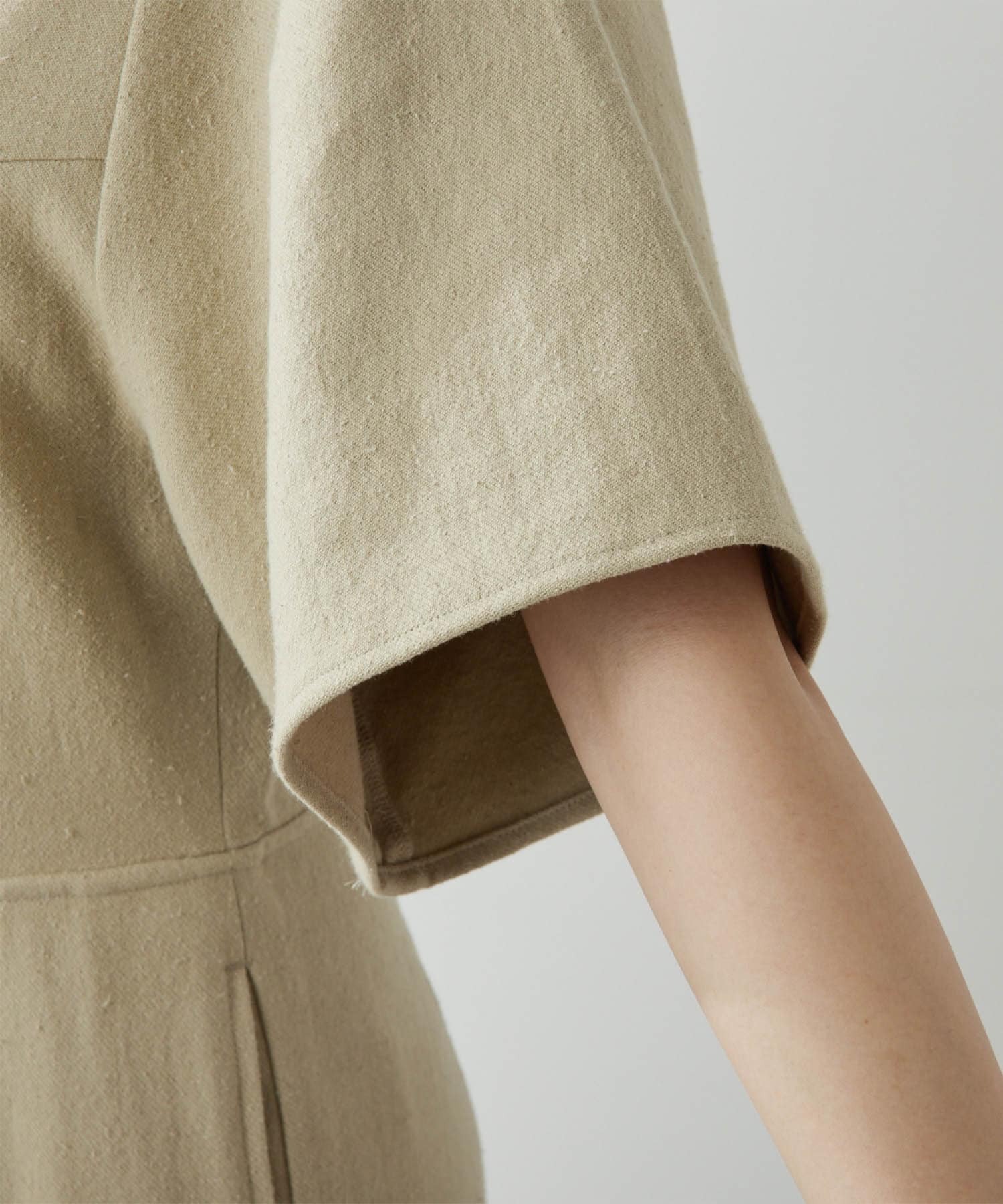 柔らかい風合いとぽこぽこっとした表面感のあるネップ生地。手洗い可能のジャンプスーツです。大胆に開いた背中は暑いこれからのシーズン、潔く見せたいデザイン。インナーには線の細い水着を合わせても良いかも。羽織はリネンストール合わせがおすすめです。