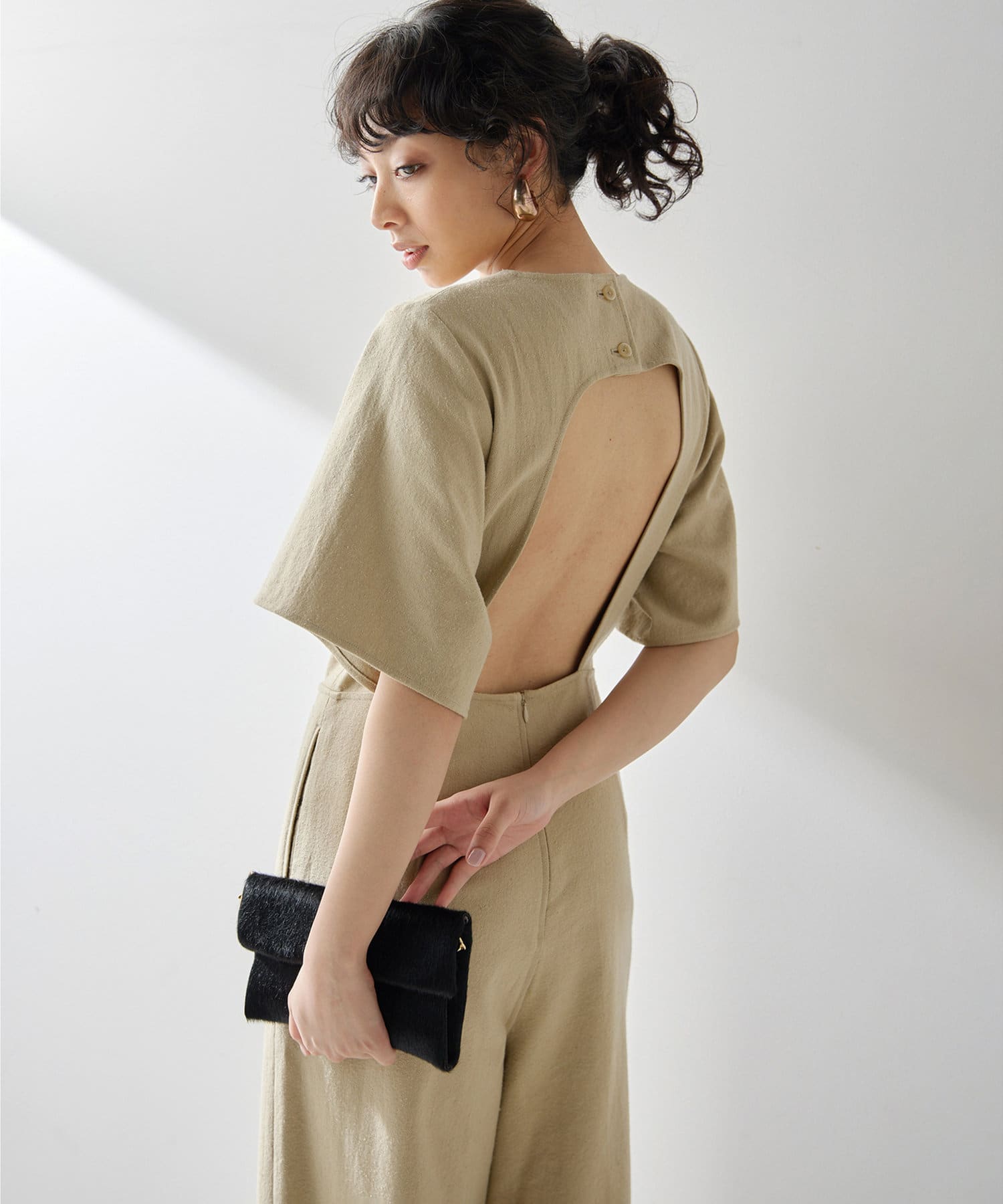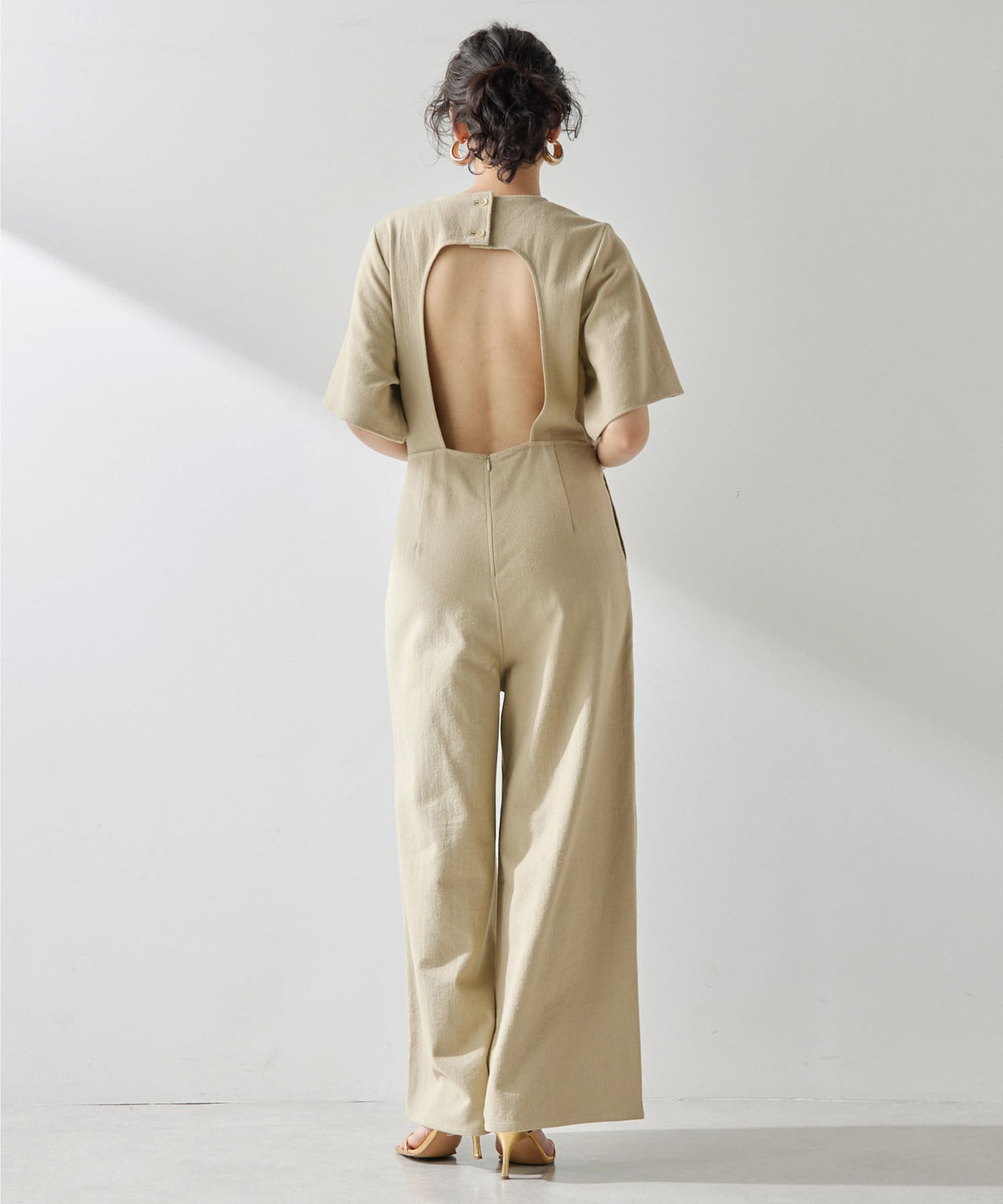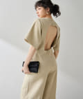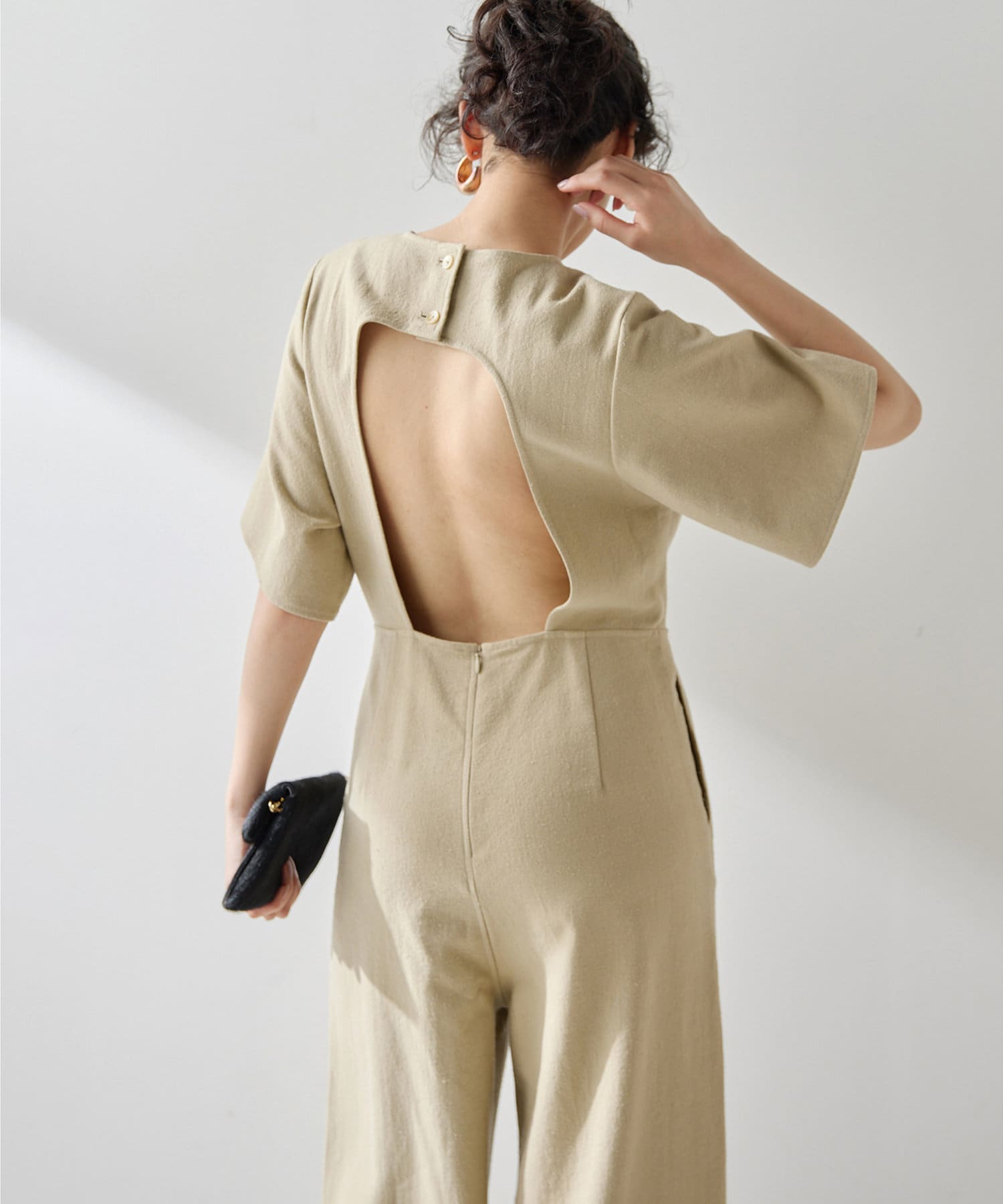 ■大胆に開いた背中のディテールが目を惹くジャンプスーツ。