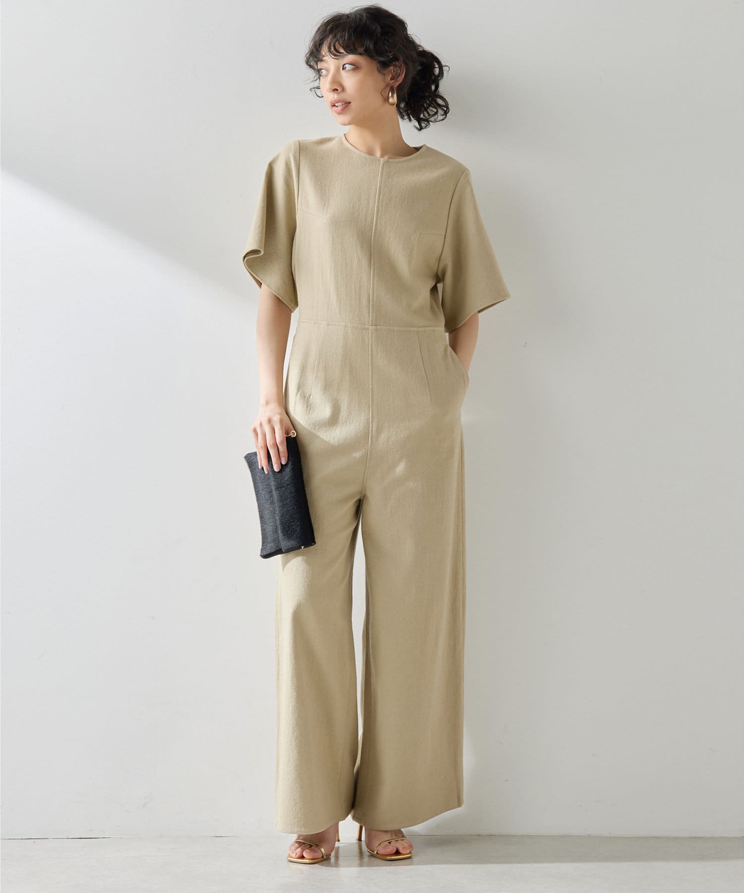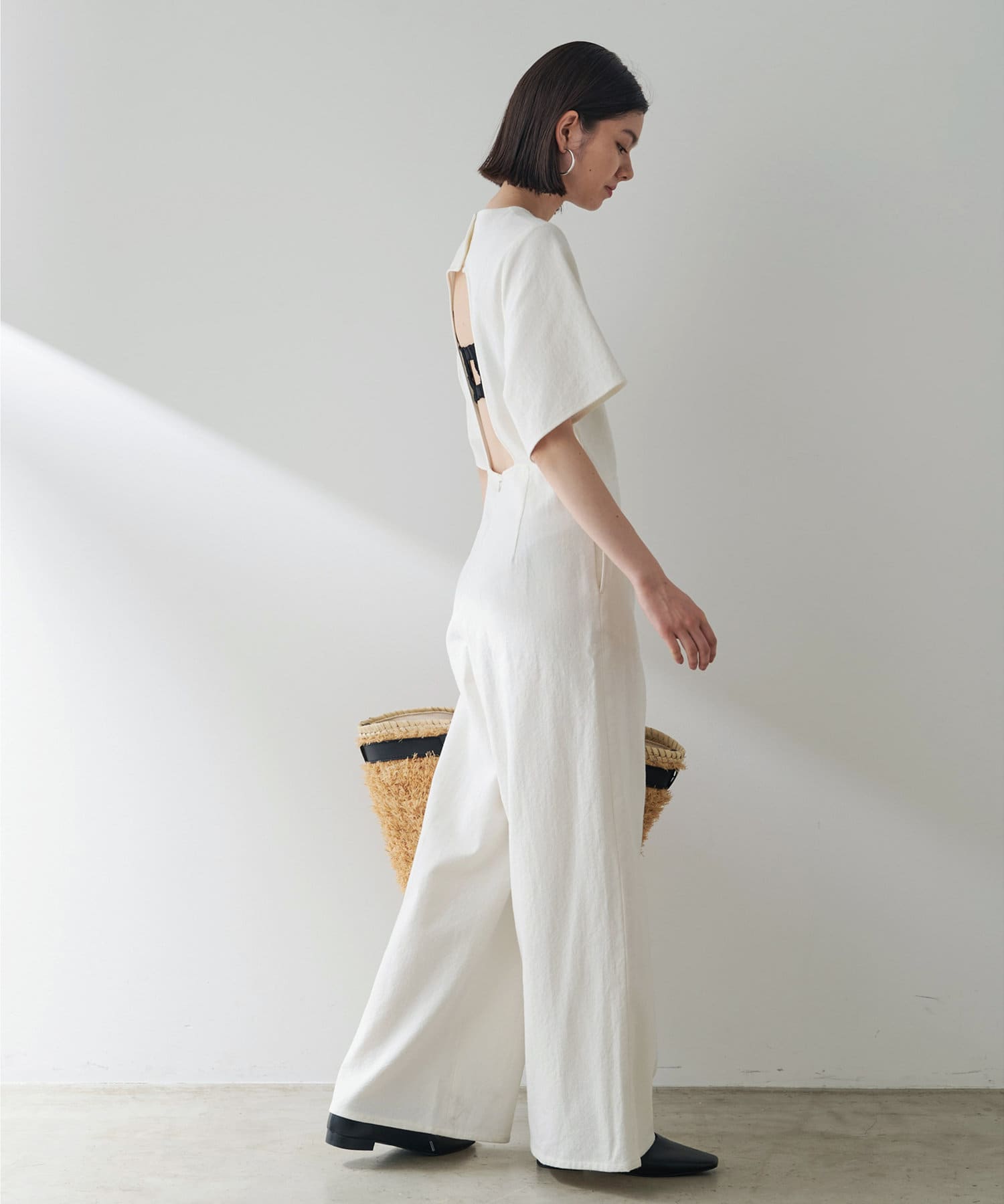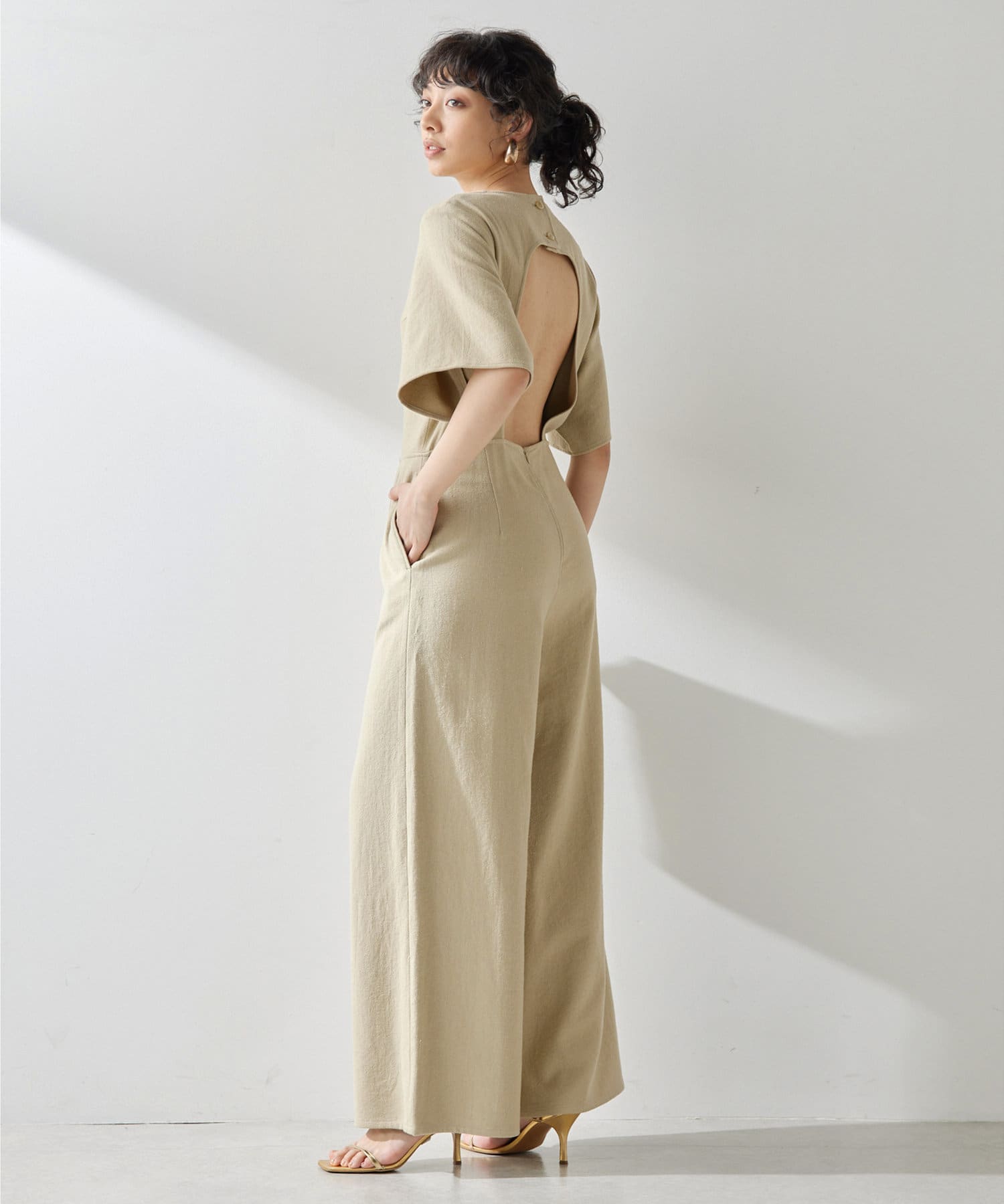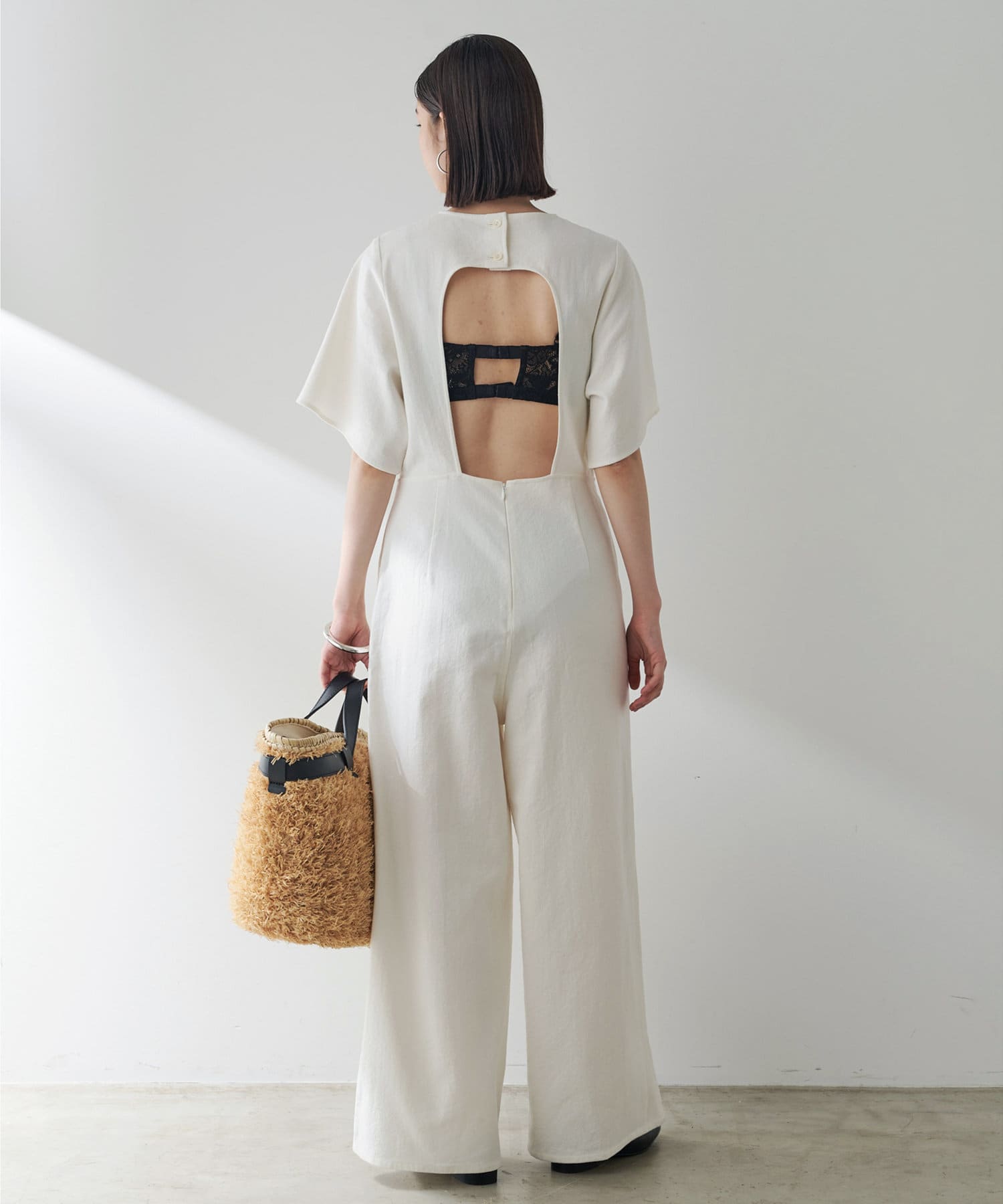 ■大胆に開いた背中のディテールが目を惹くジャンプスーツ。
