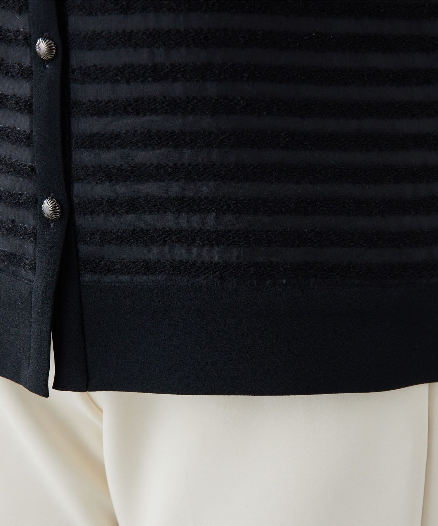経糸を極細シルクオーガンジー糸、緯糸に光沢のあるキュプラで織ったセミオーガンジーをベースに、軽やかでエアリーなモヘアナイロン糸をボーダー状に織り込んだ生地。