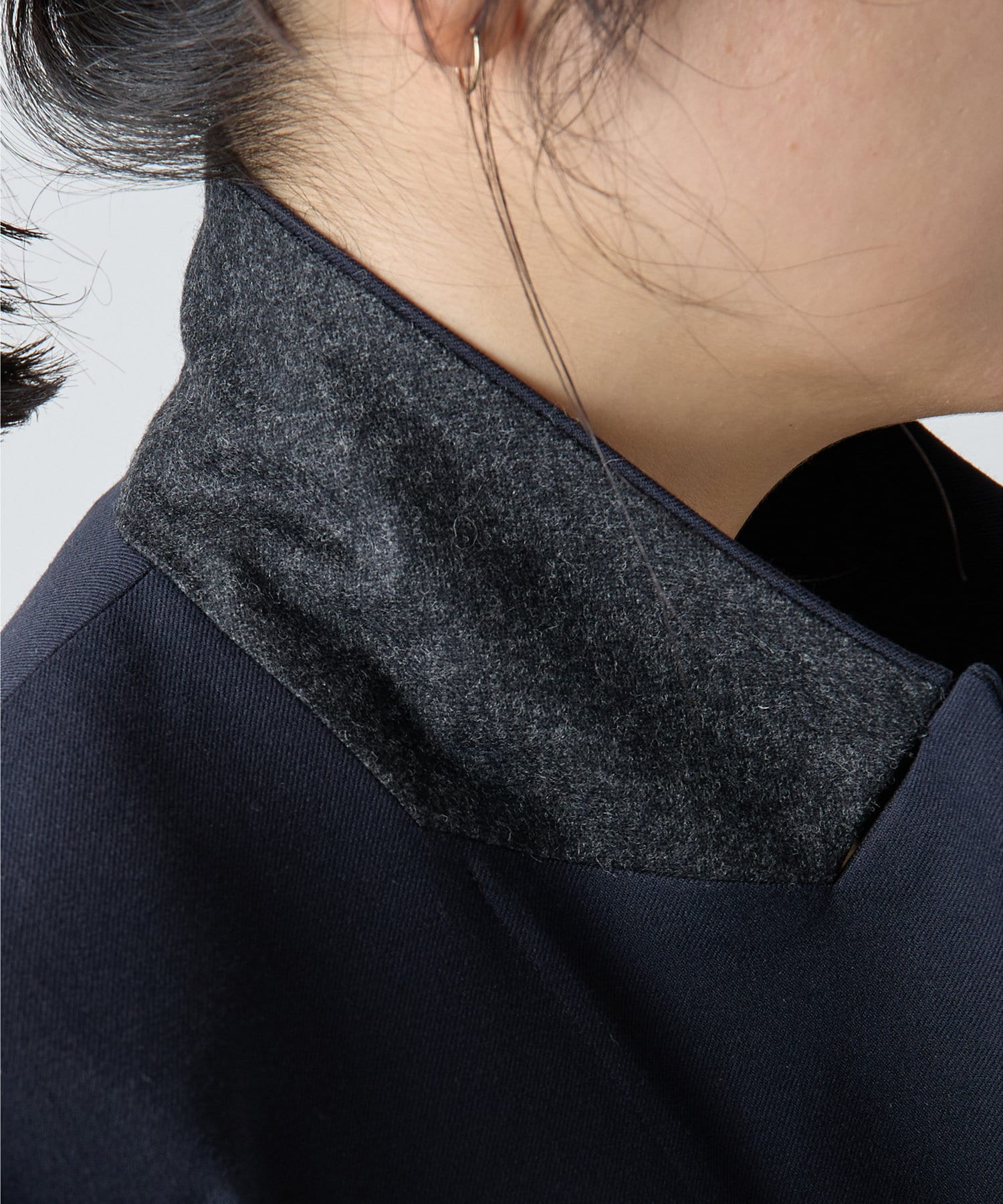 ■襟の裏側は別布を使用し、襟を立てた時にのぞく素材の違いがアクセントに