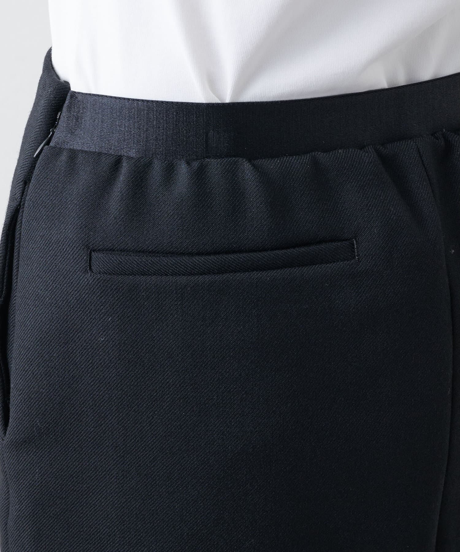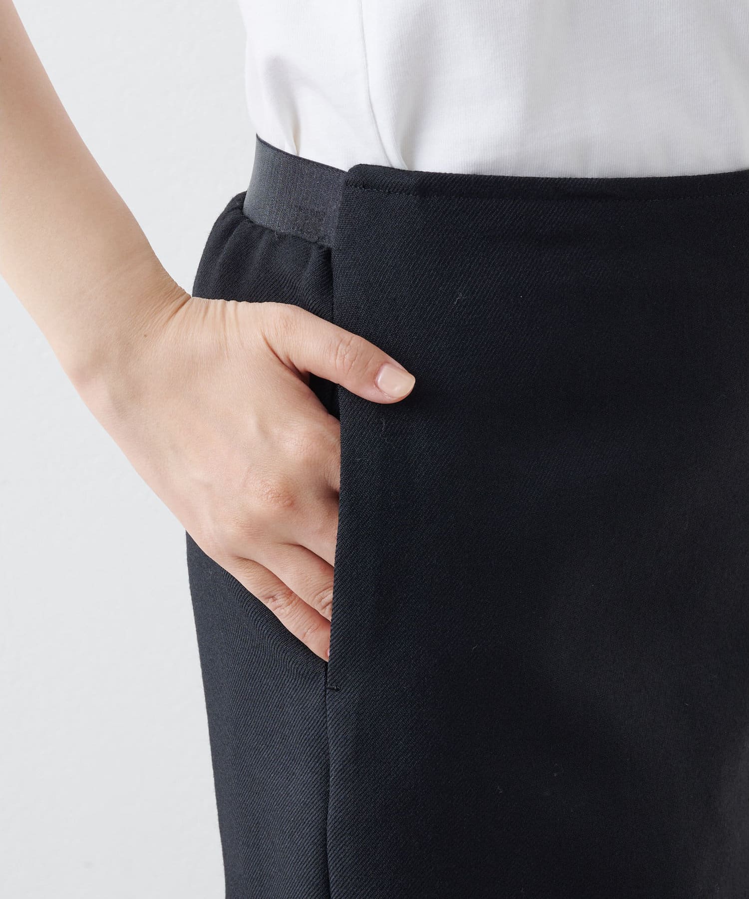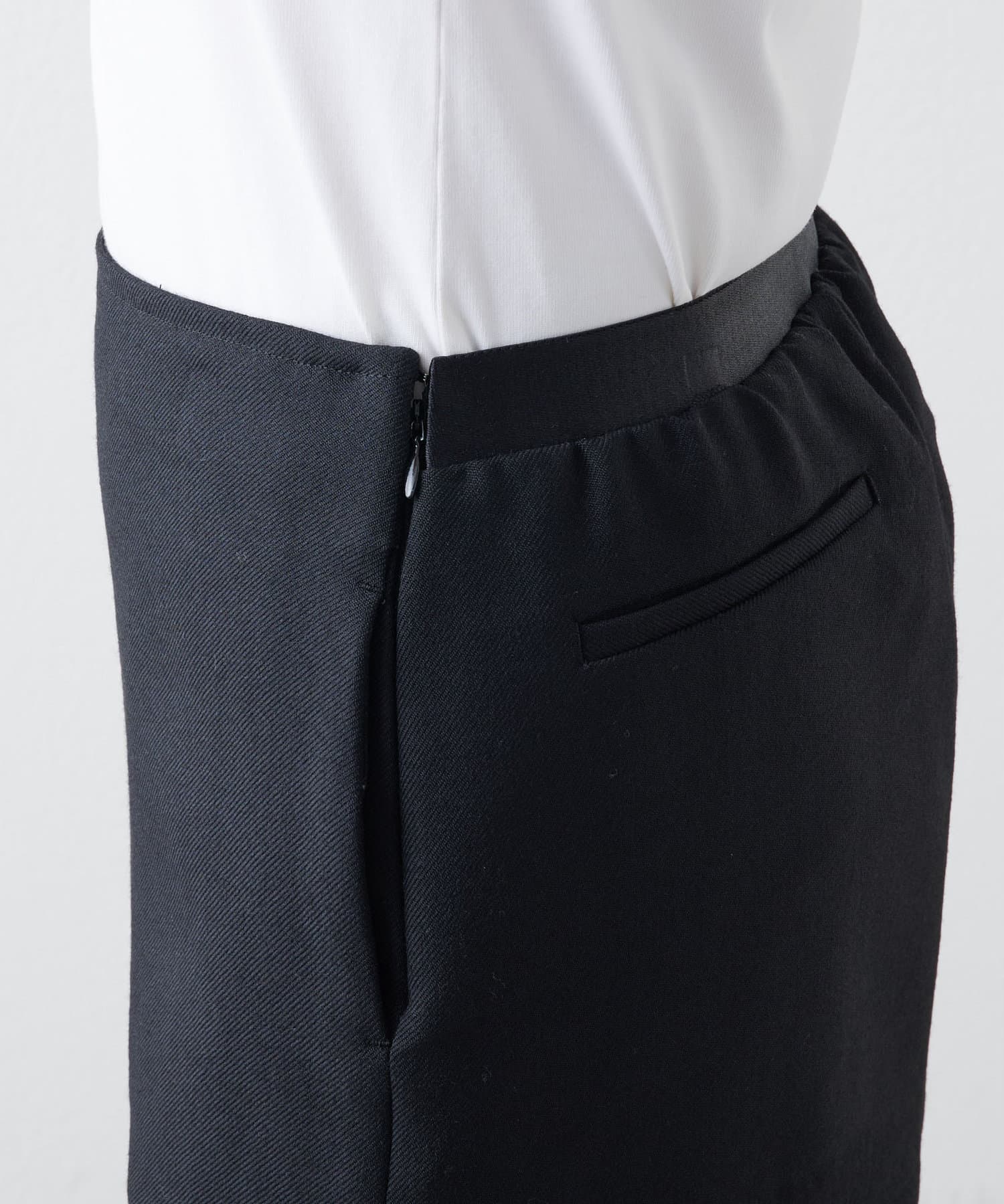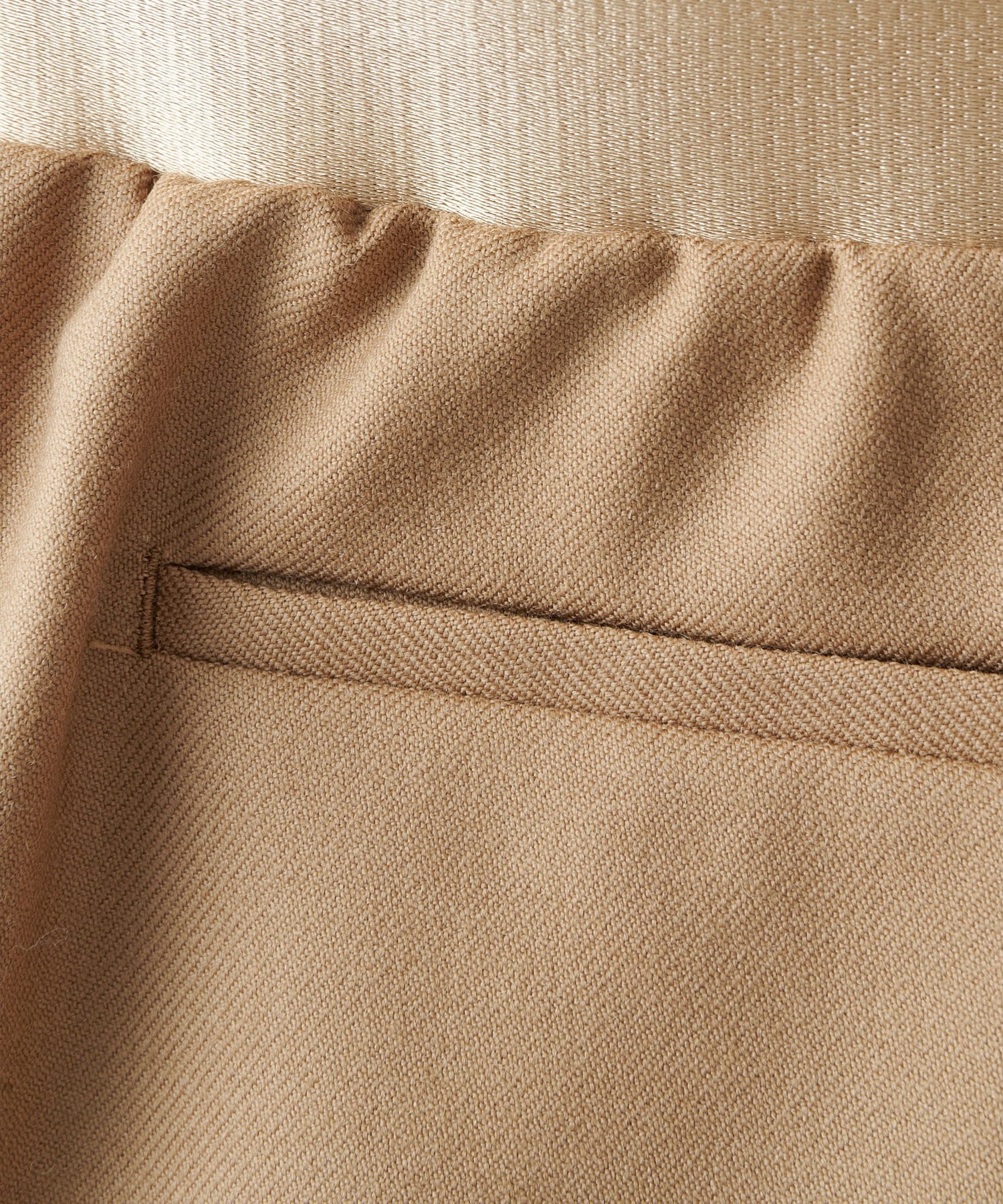 ■後ろのみゴム仕様のウエストデザインですっきりと着こなせ、レイヤードスタイルにも使いやすい一枚。