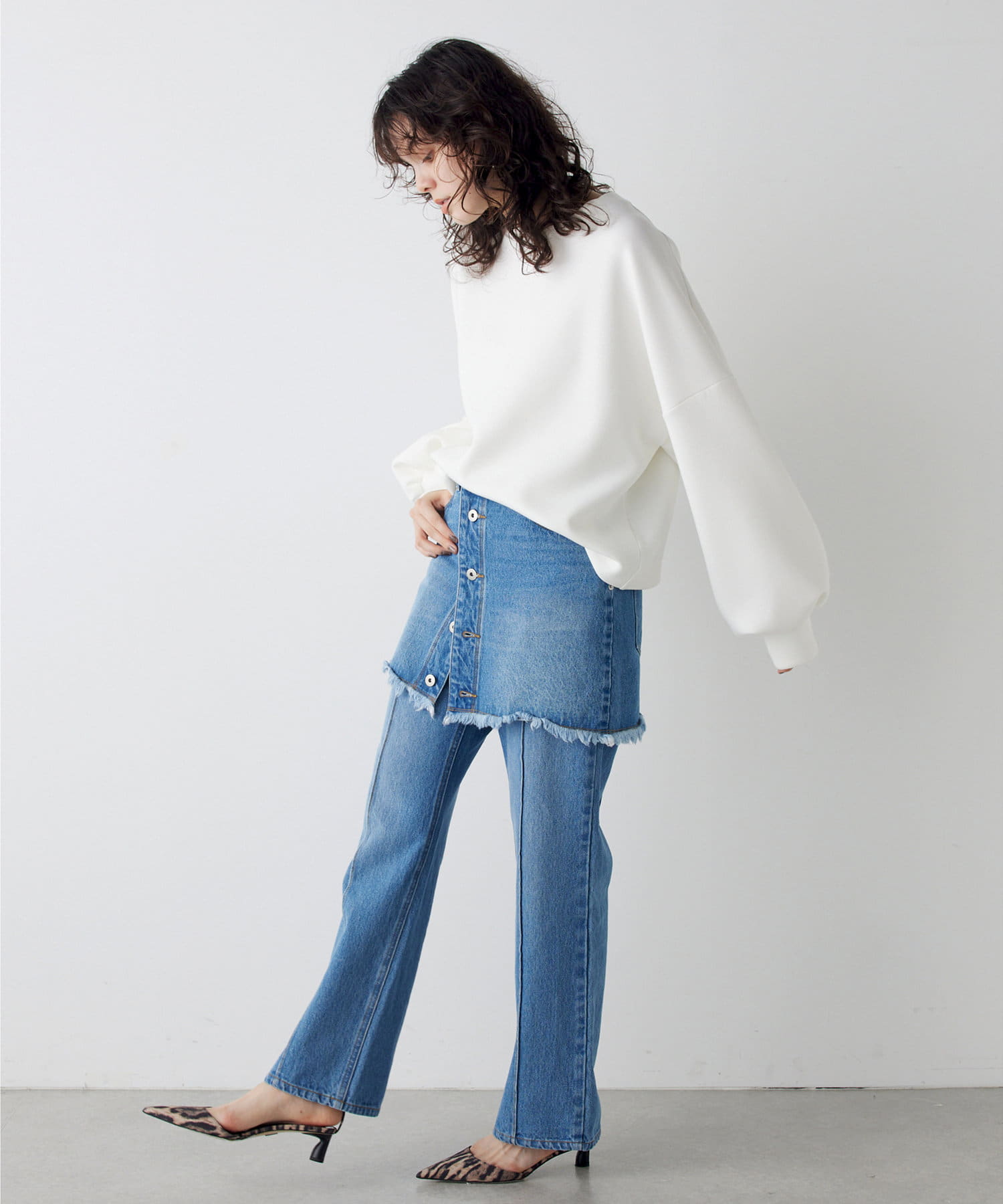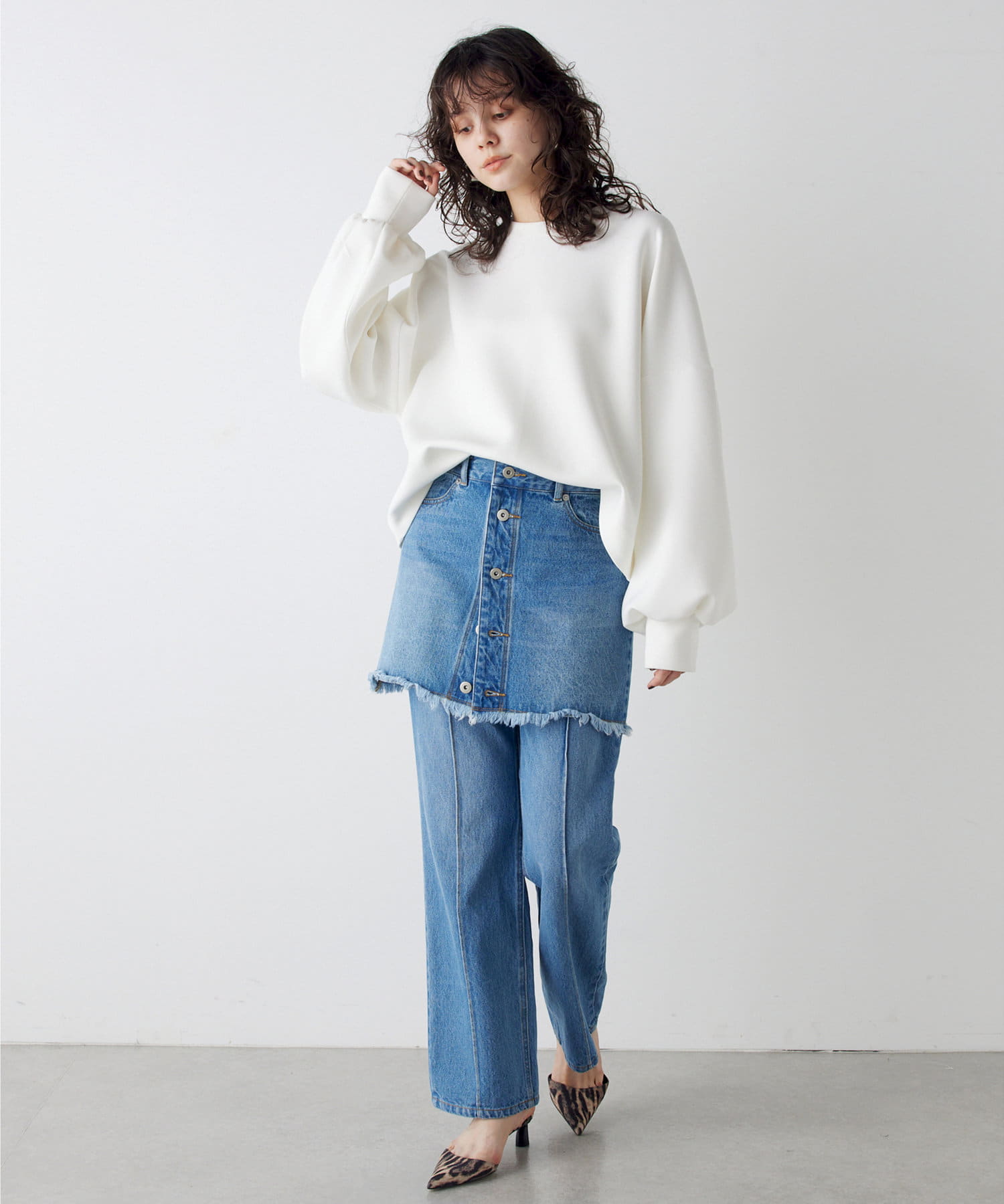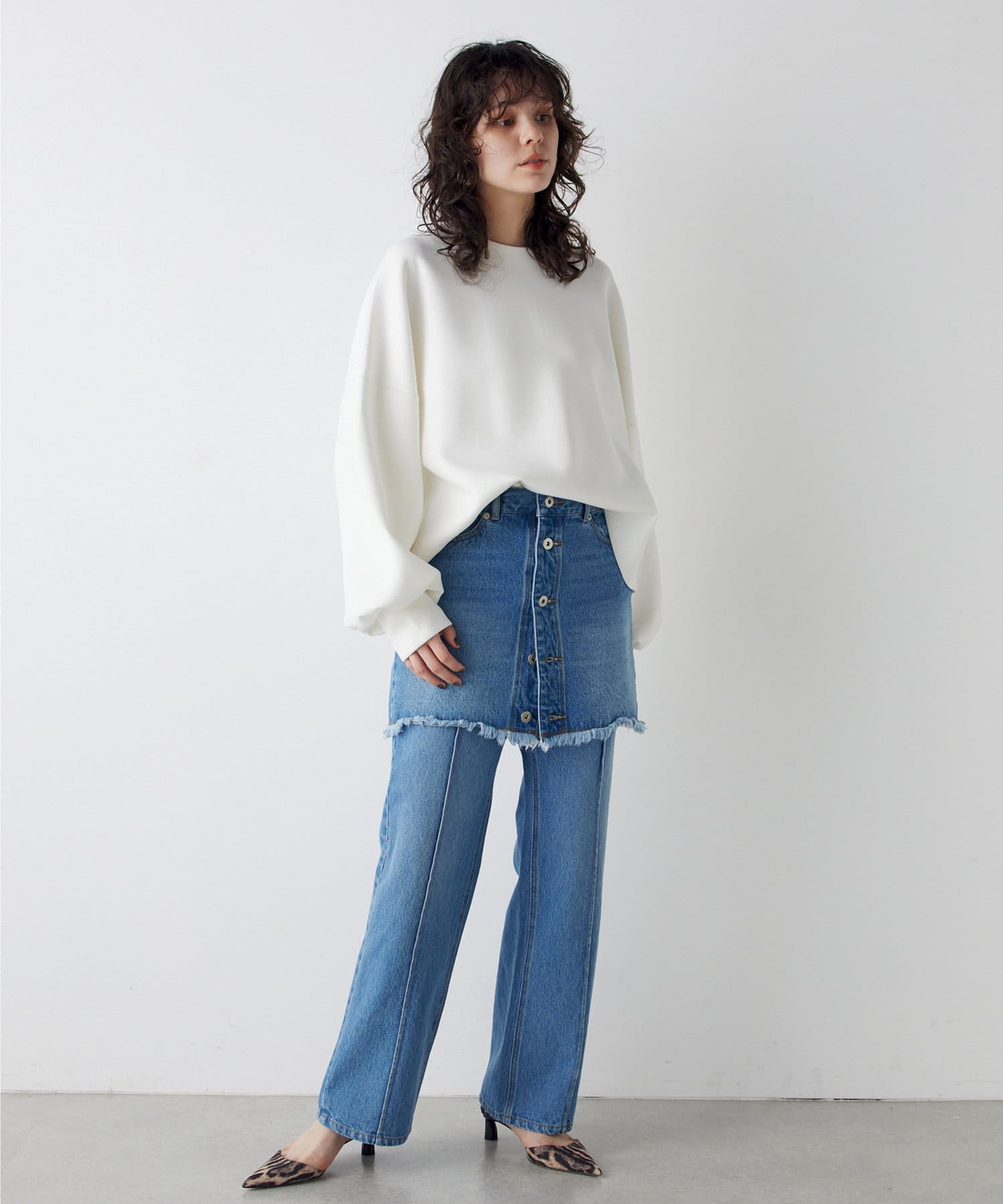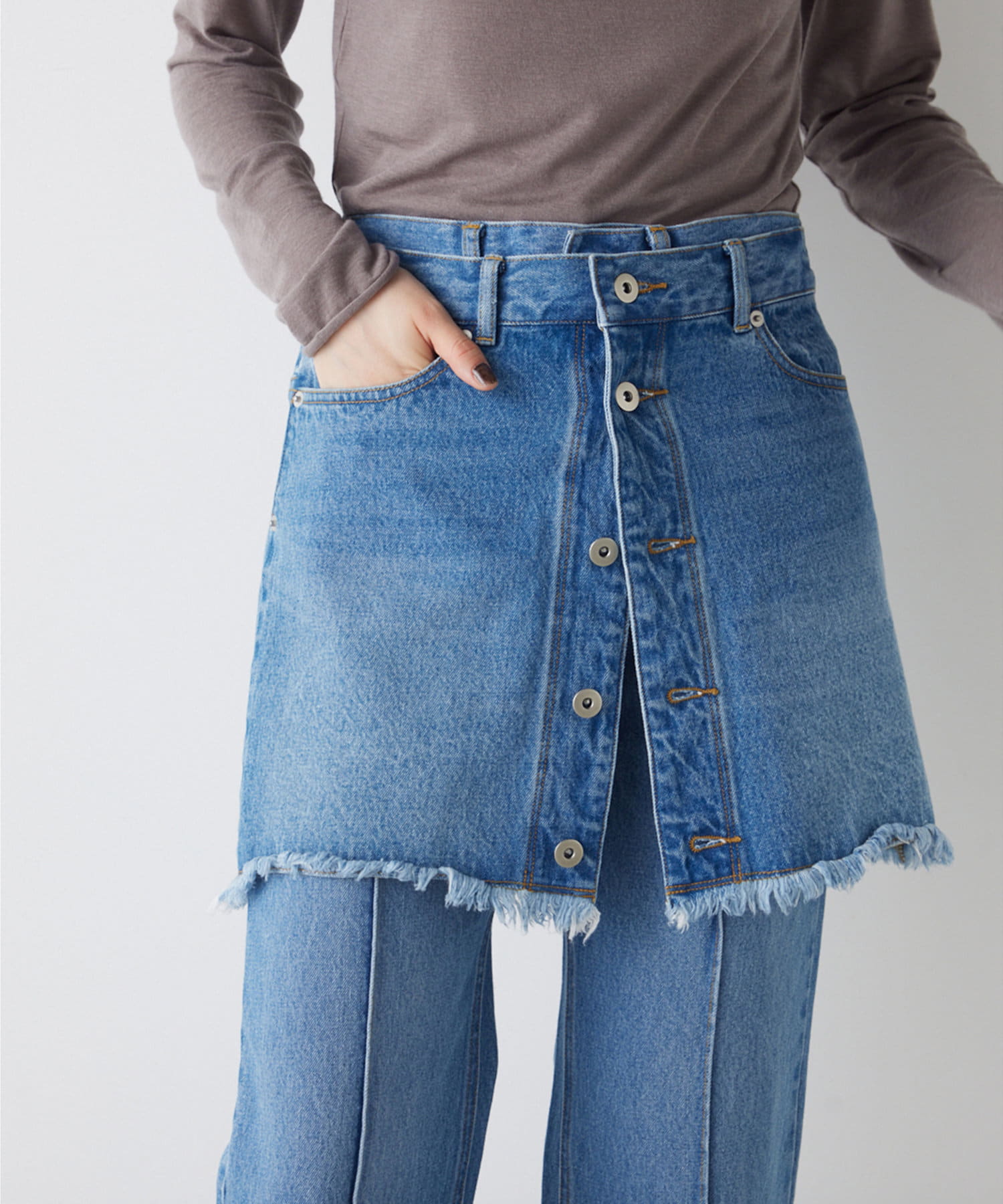 ■一枚ではもちろん、同素材のデニムや様々なボトムの上に重ね履きするスタイリングもおすすめ。
