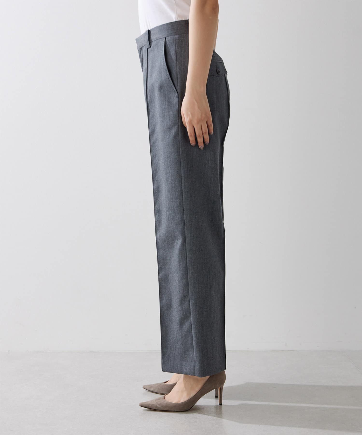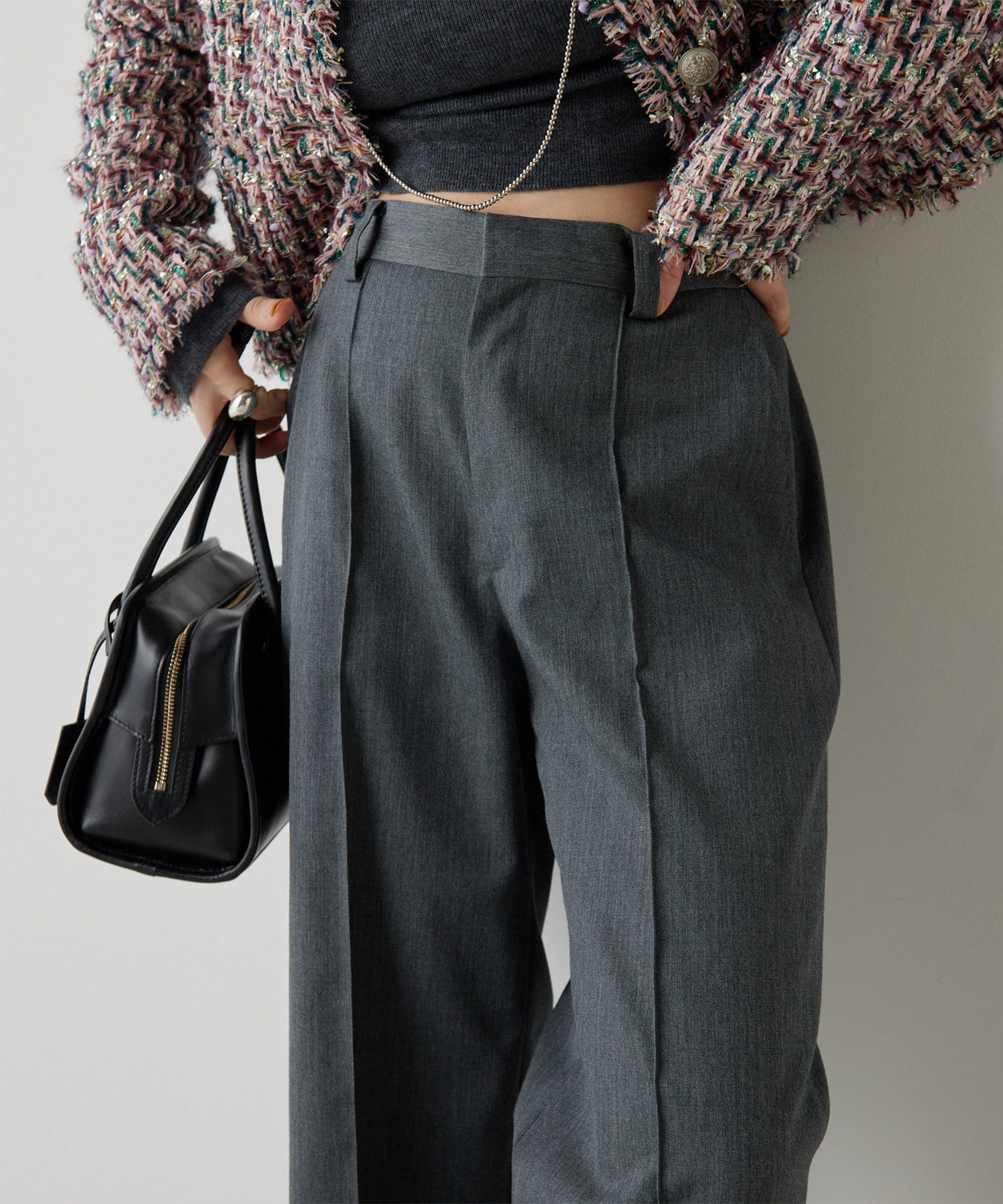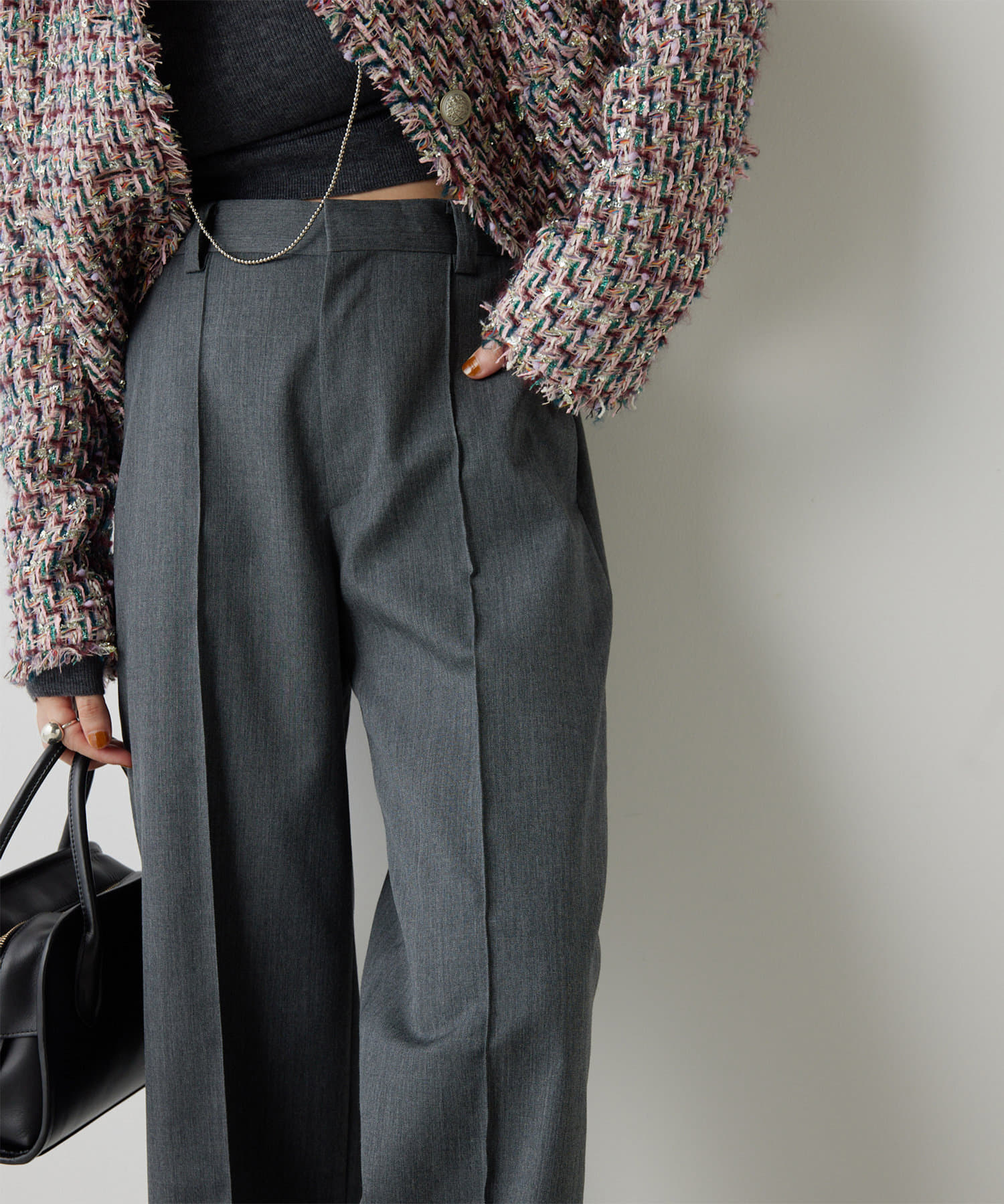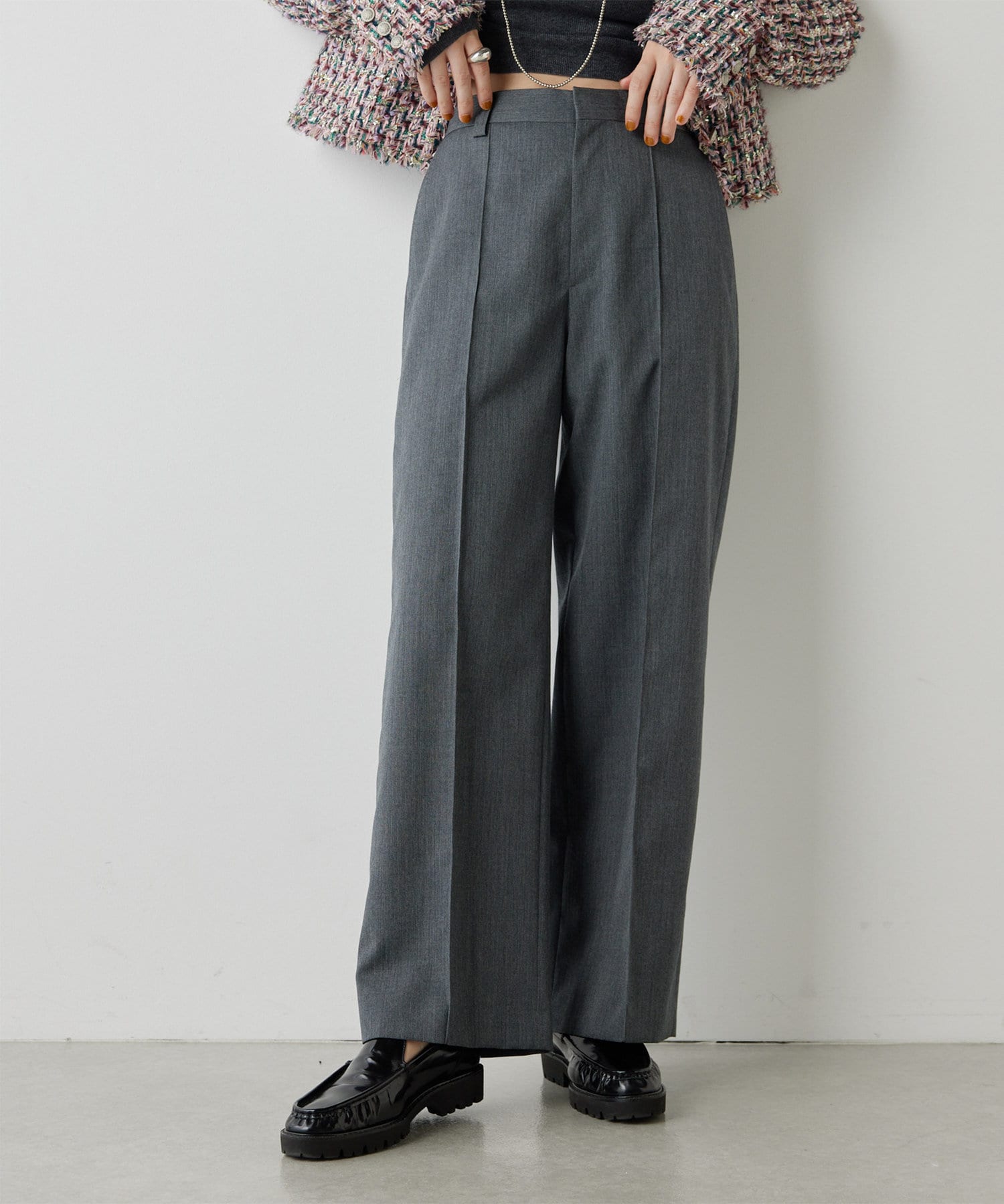 センタープレスがしっかりと入っていて、ラインがとても綺麗なワイドスラックス。丈も長過ぎないので、お直しせずに履ける方も多そうです。濃いめのグレーのカラーが秋らしく、コーデをグッと引き締めてくれます。