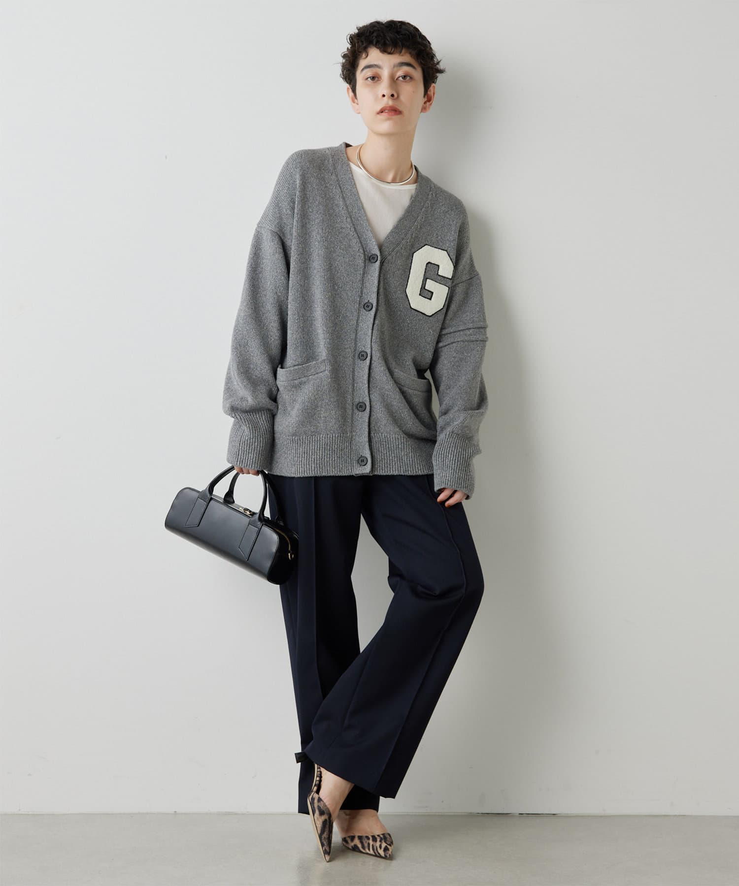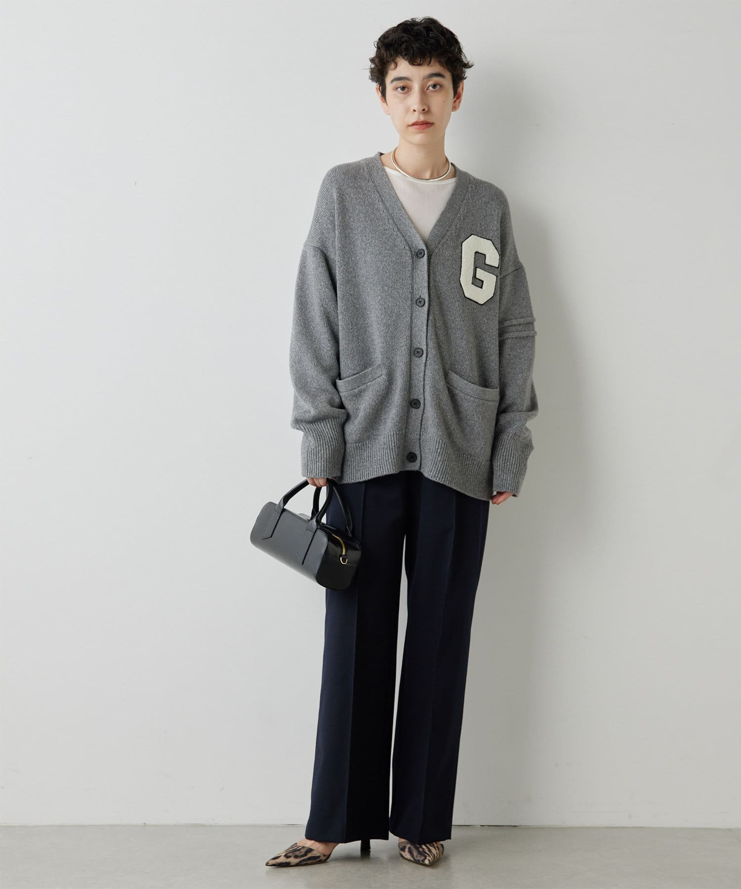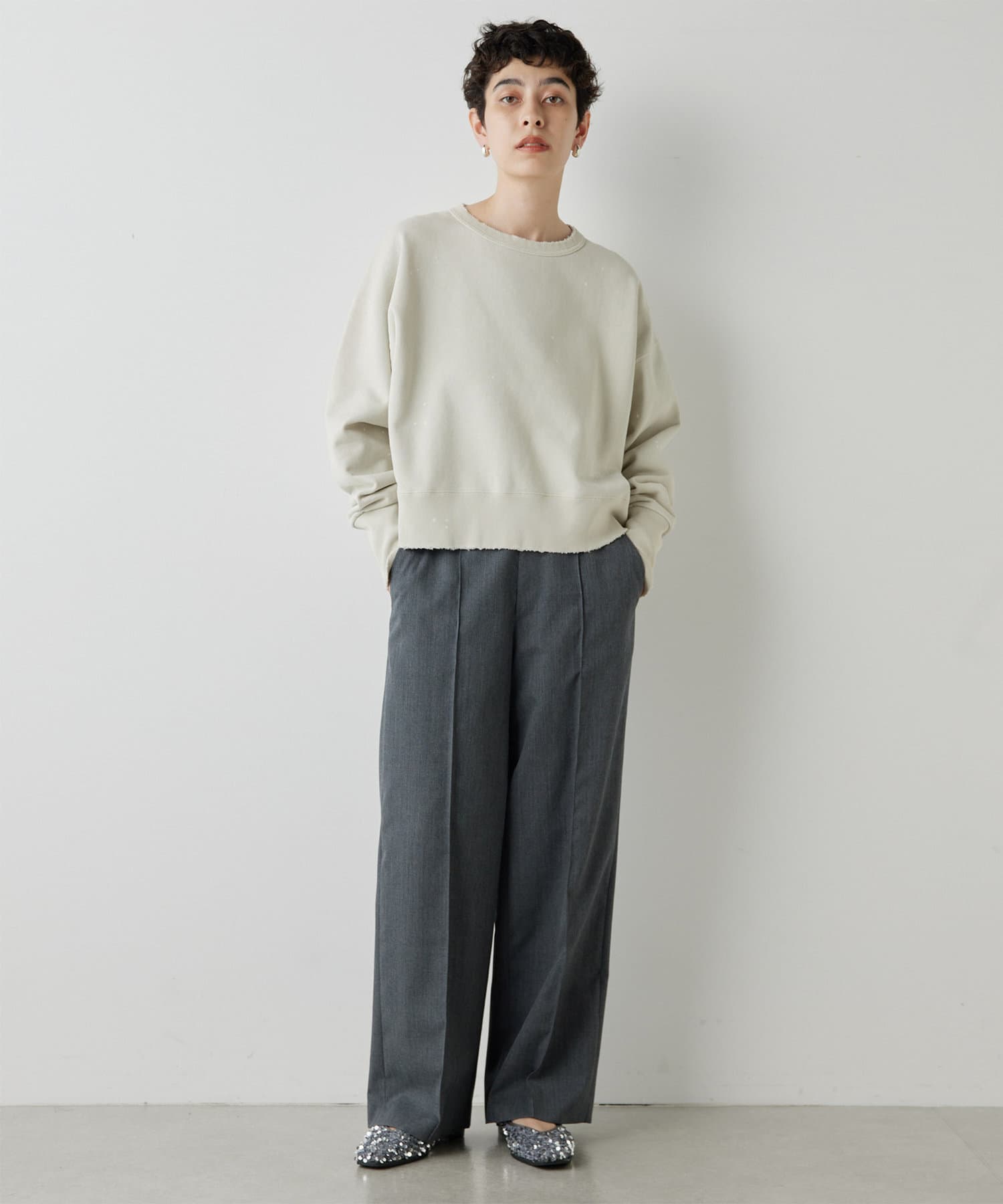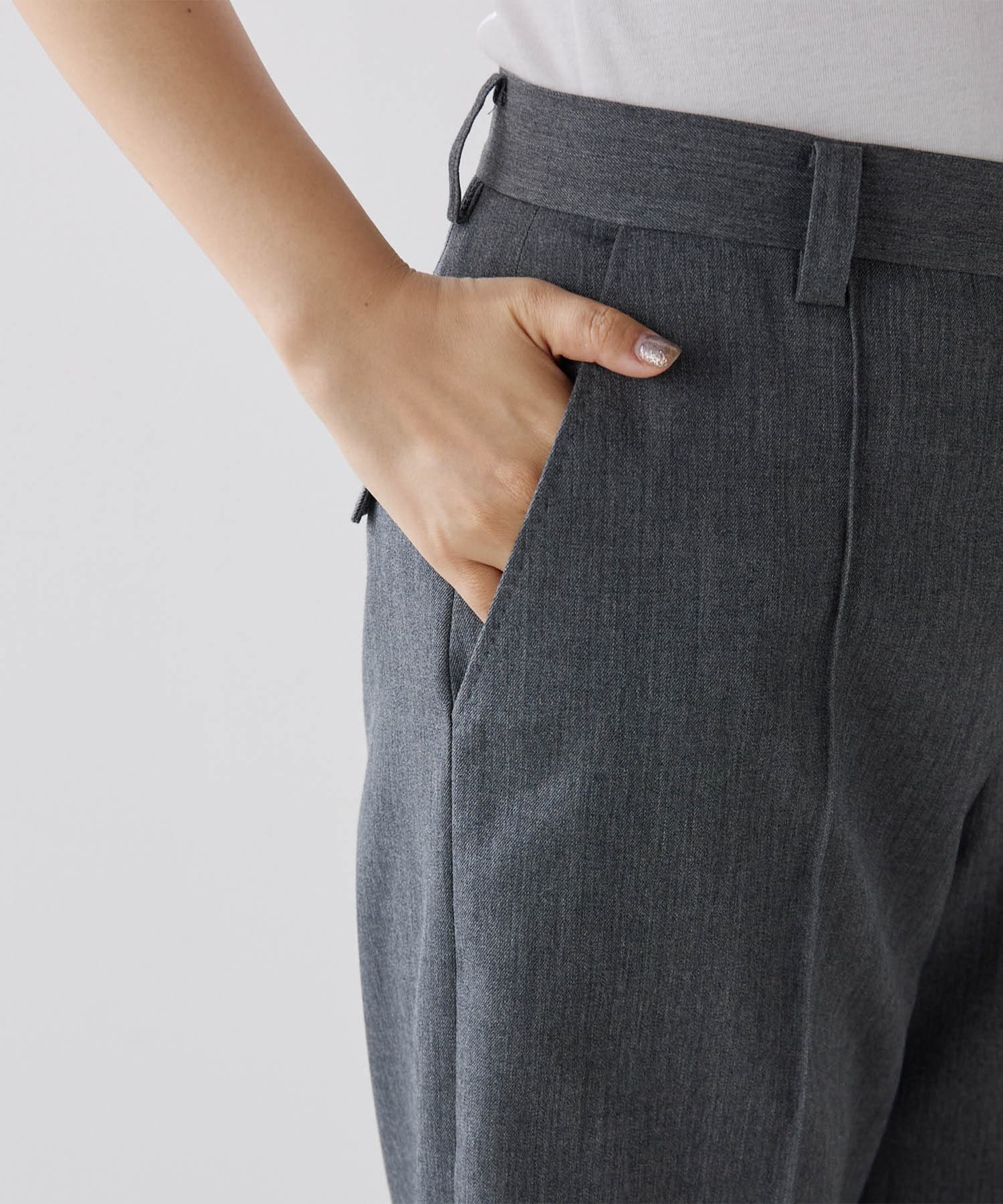 センタープレスがしっかりと入っていて、ラインがとても綺麗なワイドスラックス。丈も長過ぎないので、お直しせずに履ける方も多そうです。濃いめのグレーのカラーが秋らしく、コーデをグッと引き締めてくれます。
