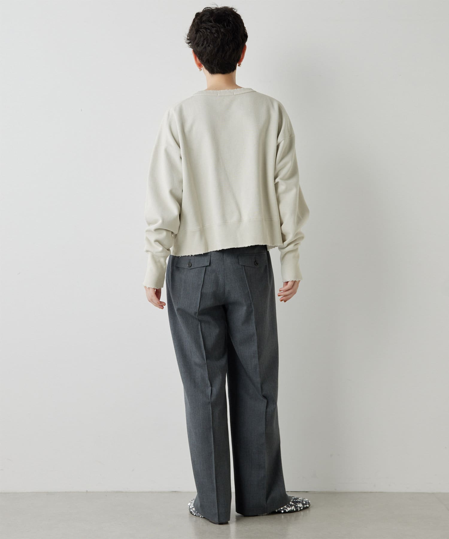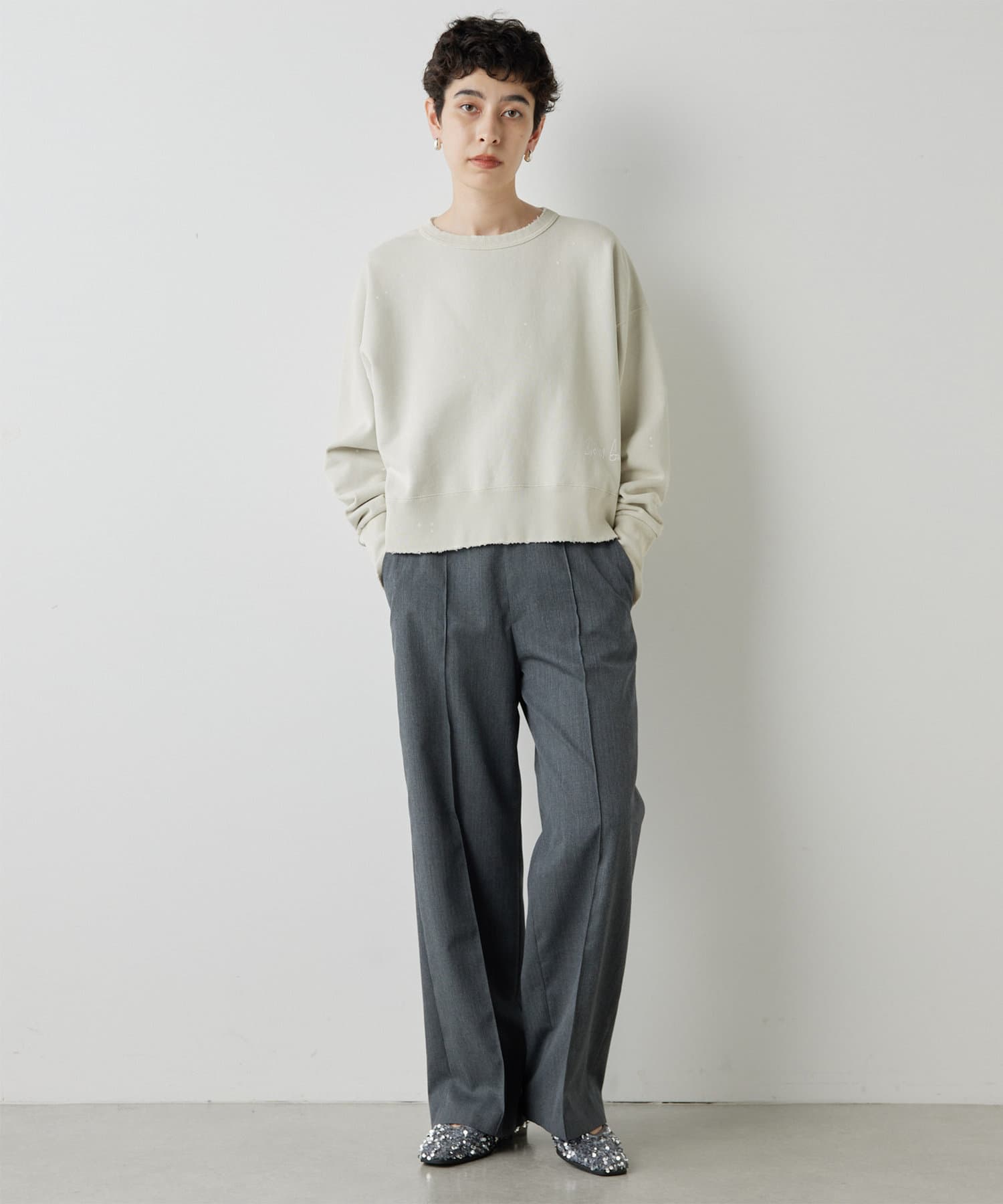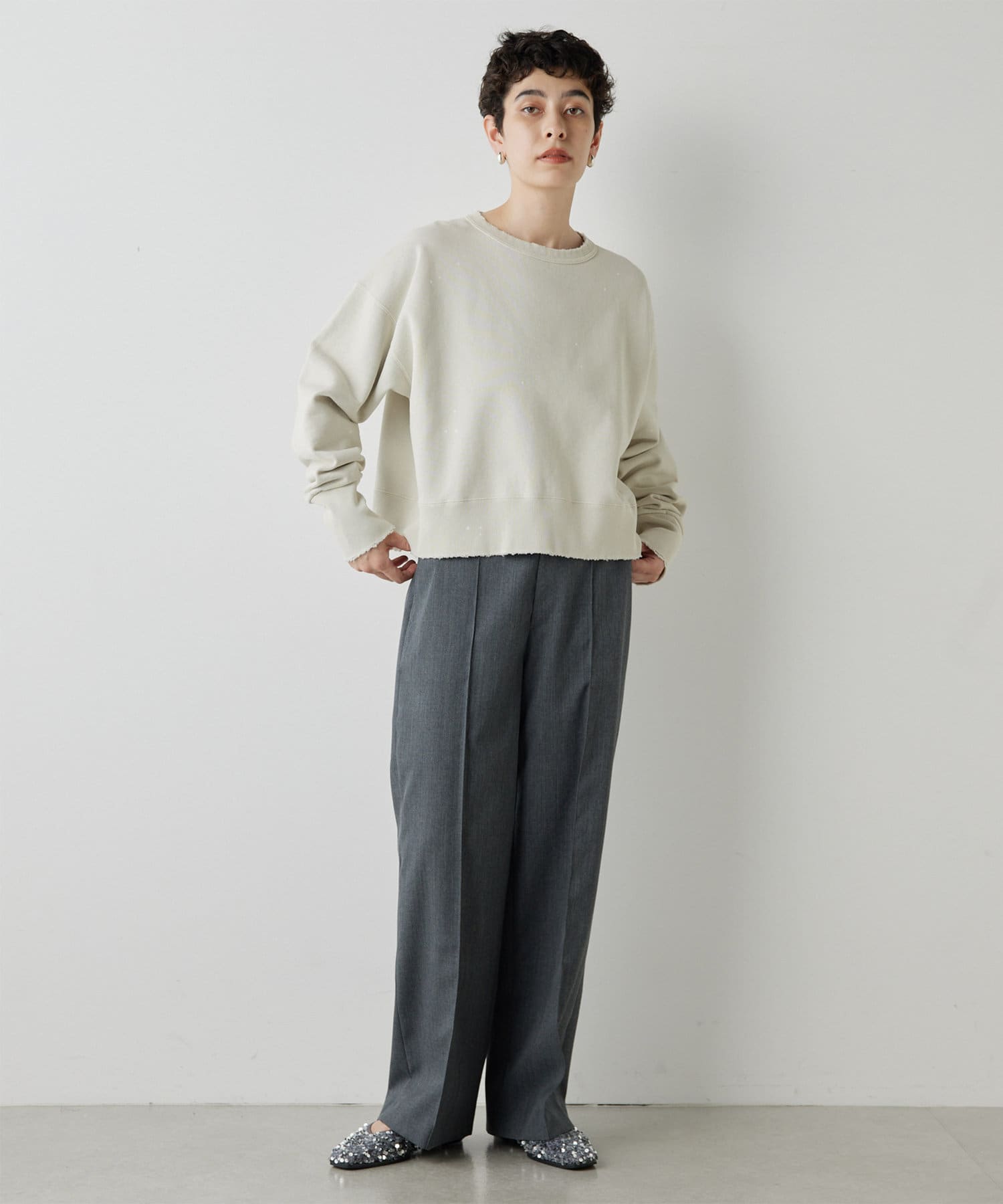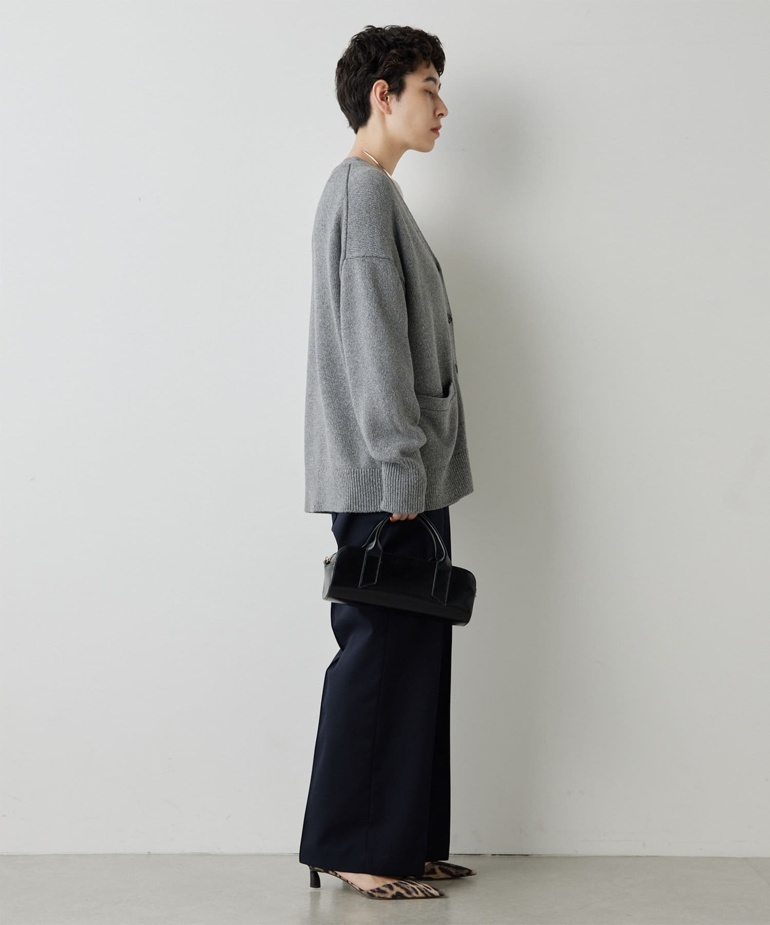 センタープレスがしっかりと入っていて、ラインがとても綺麗なワイドスラックス。丈も長過ぎないので、お直しせずに履ける方も多そうです。濃いめのグレーのカラーが秋らしく、コーデをグッと引き締めてくれます。