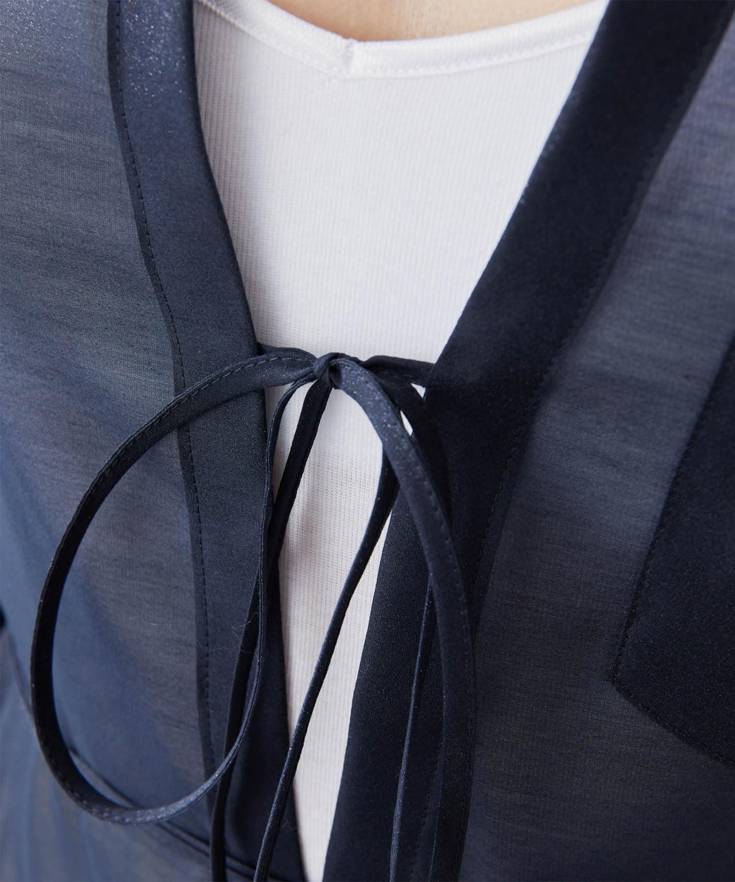 ■ボタンはあえて付けず、上のリボンと下の長めのリボンをぐるりとウエストに巻いて着用するデザイン。