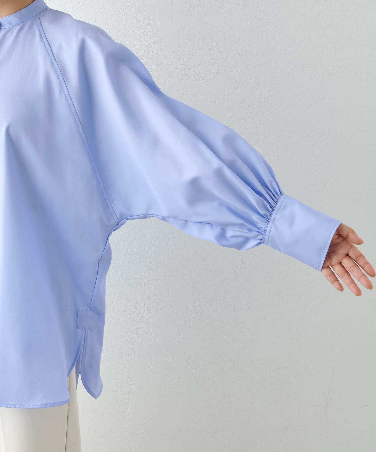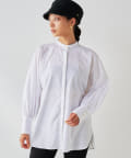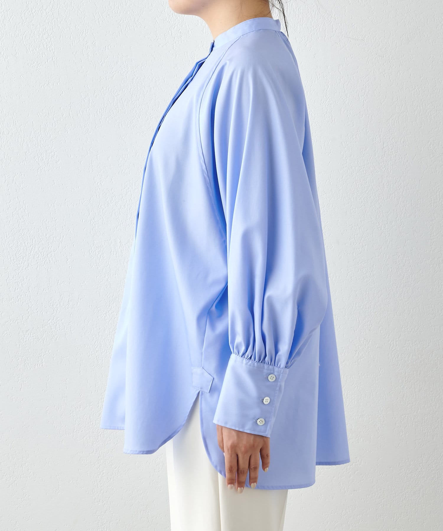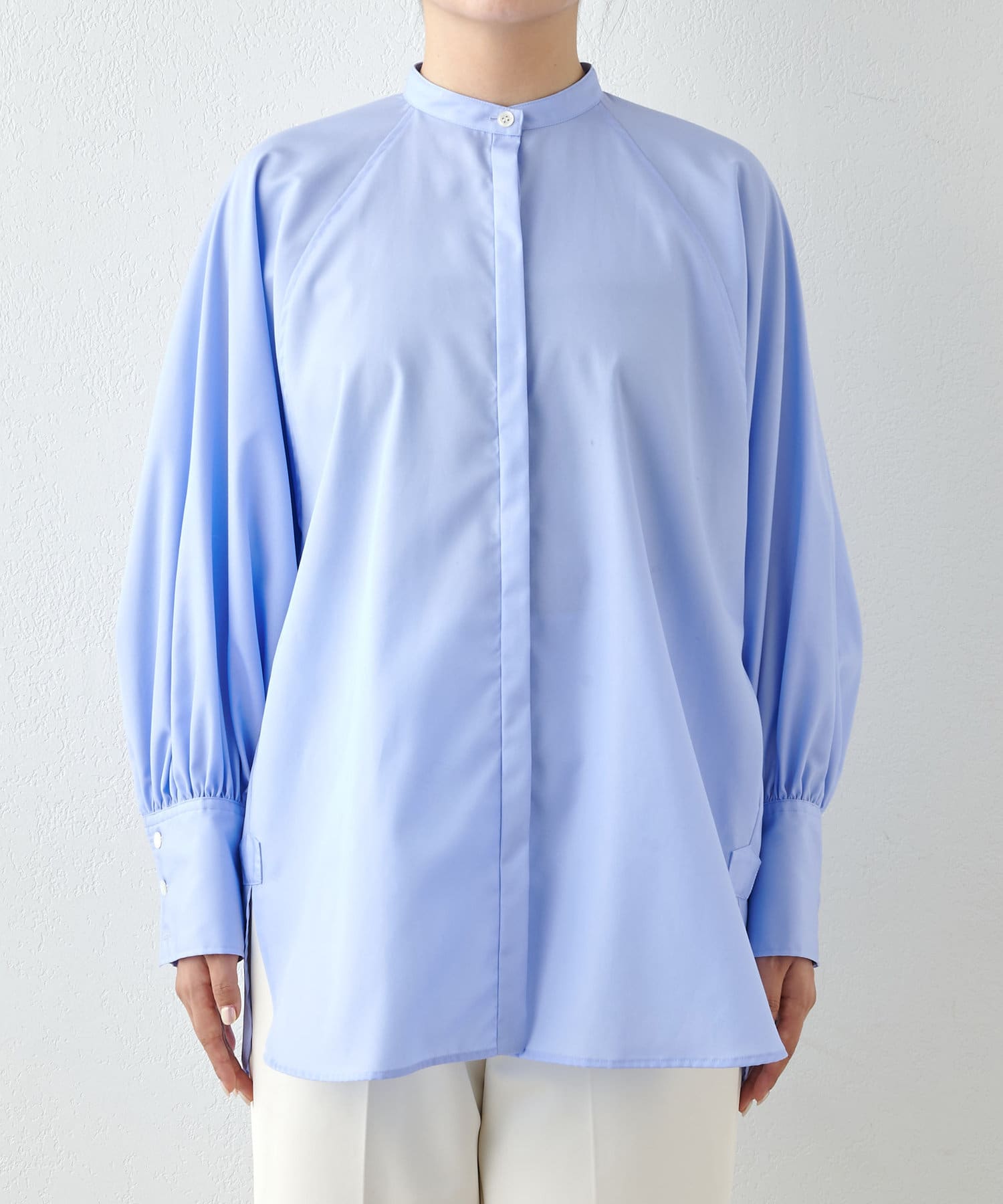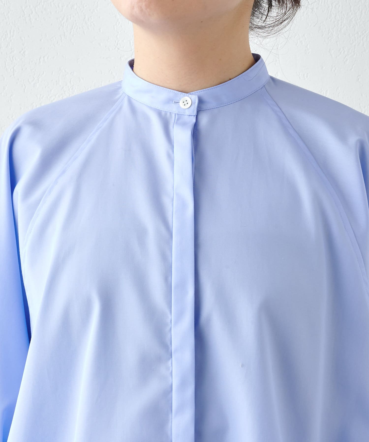 ■程よいハリ感のあるブロード生地で仕立てたスタンドカラーシャツ。
