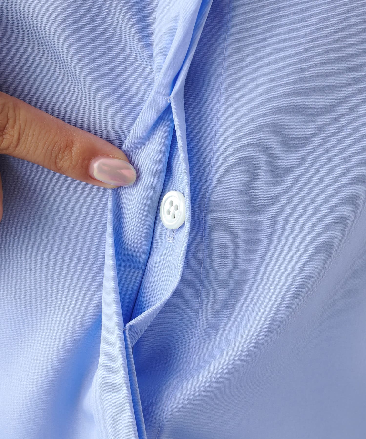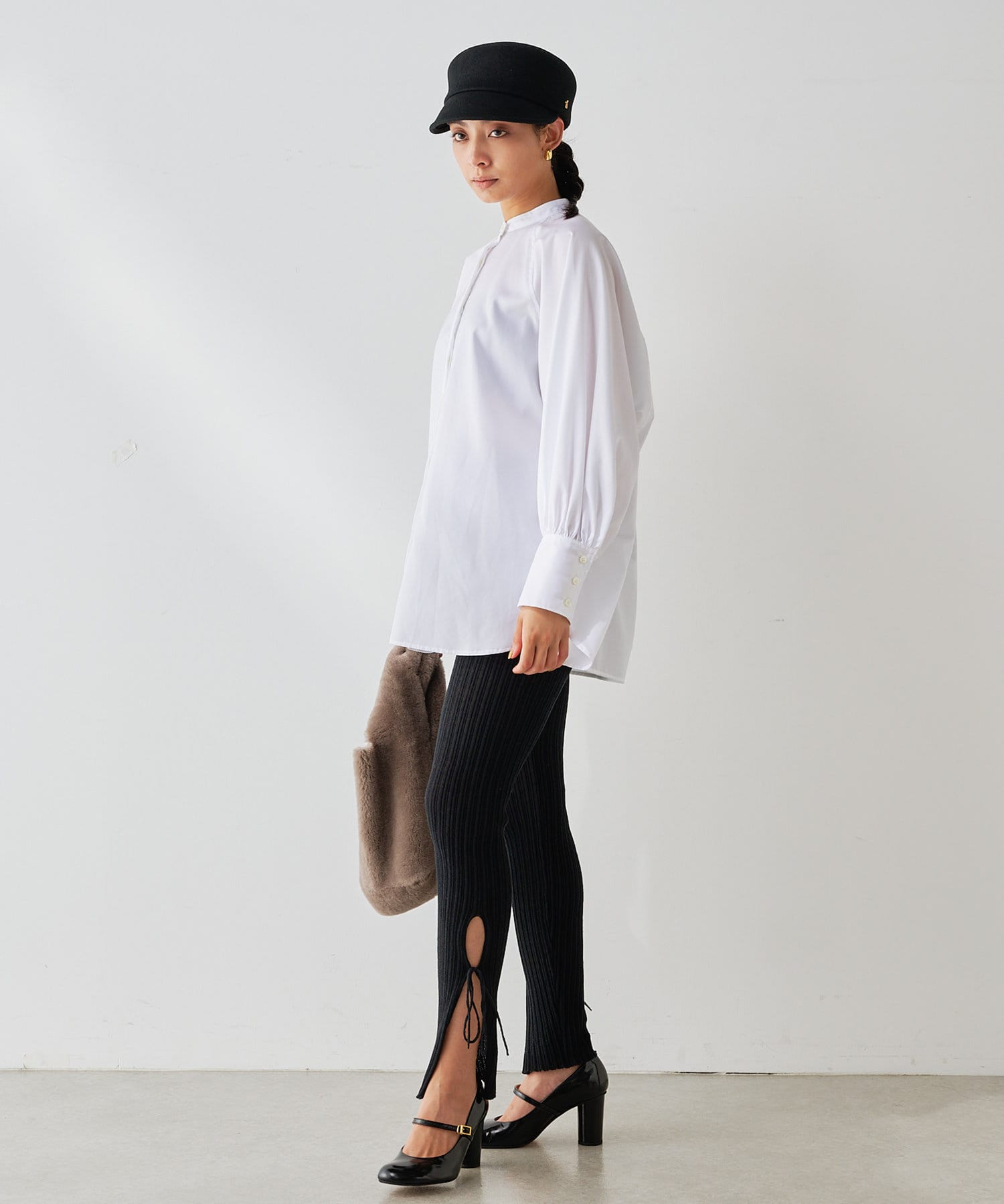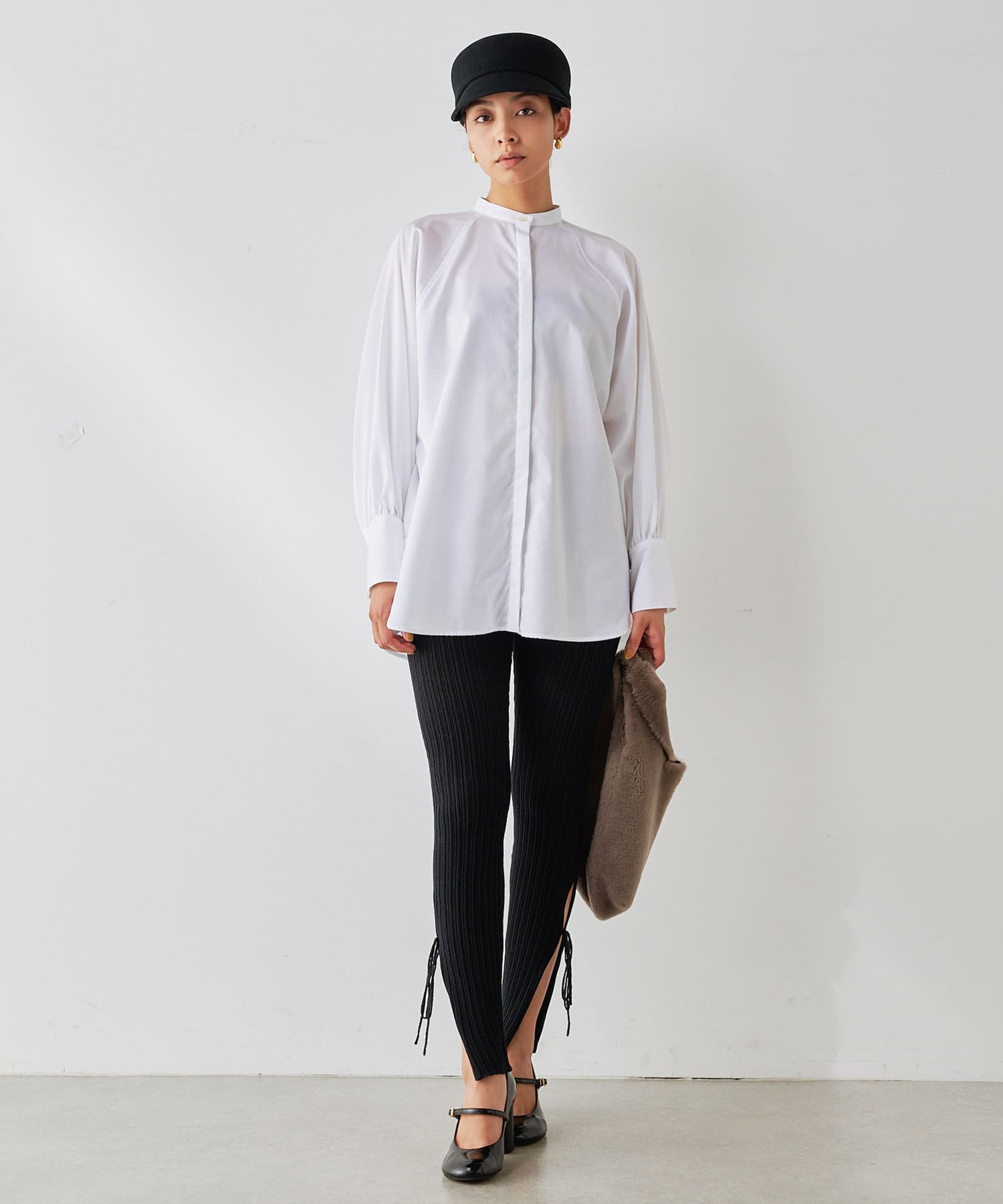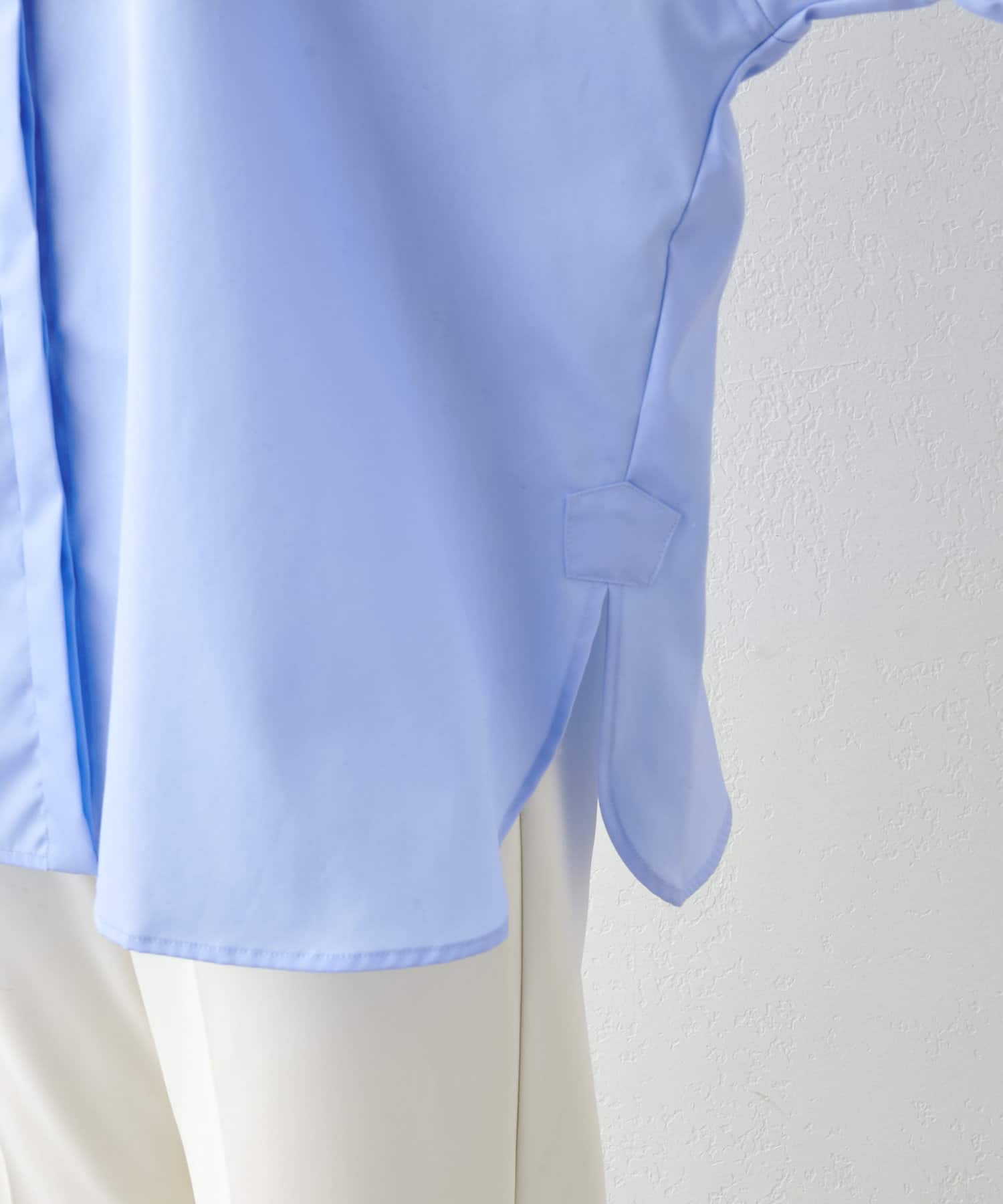■程よいハリ感のあるブロード生地で仕立てたスタンドカラーシャツ。