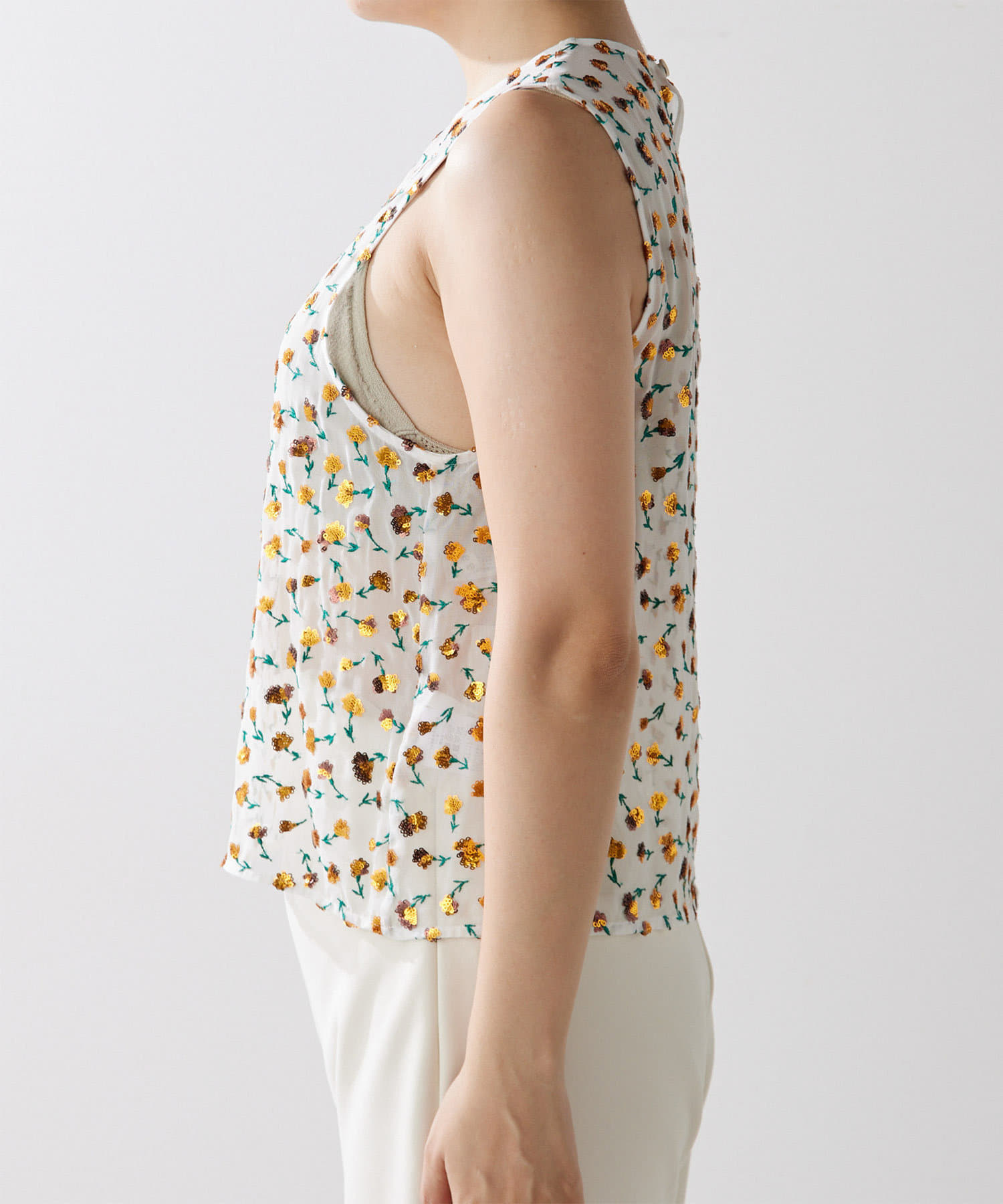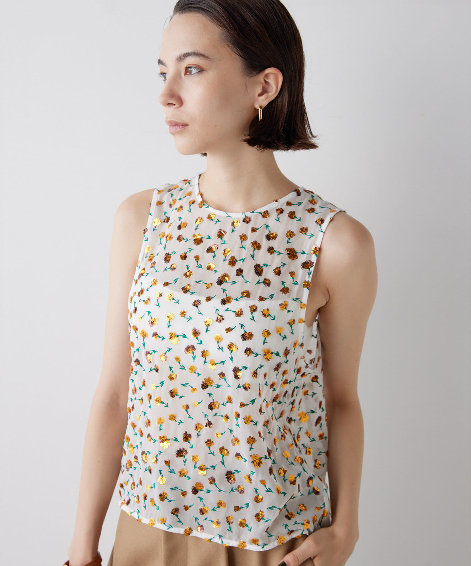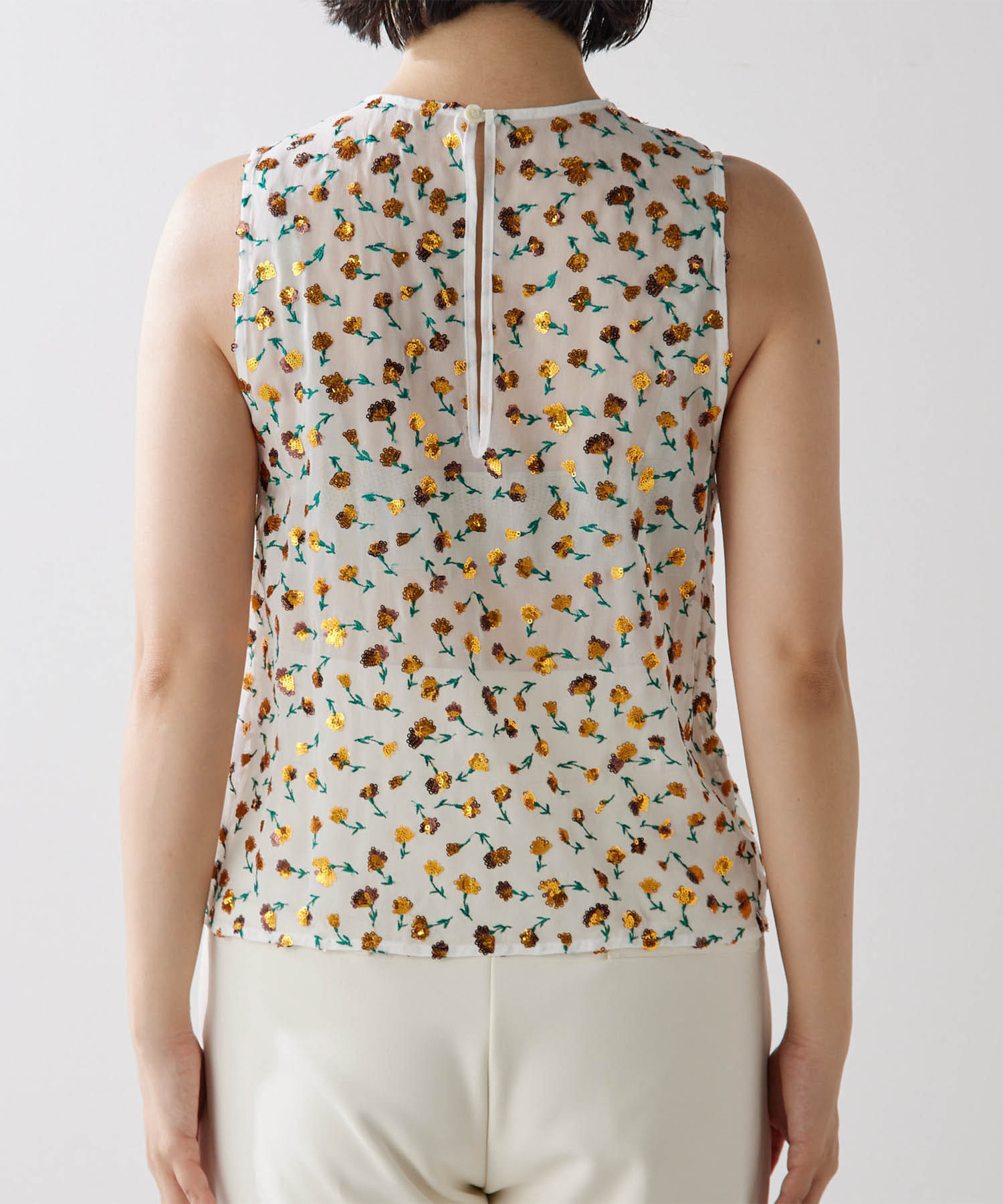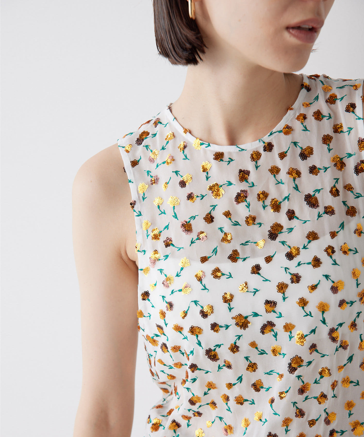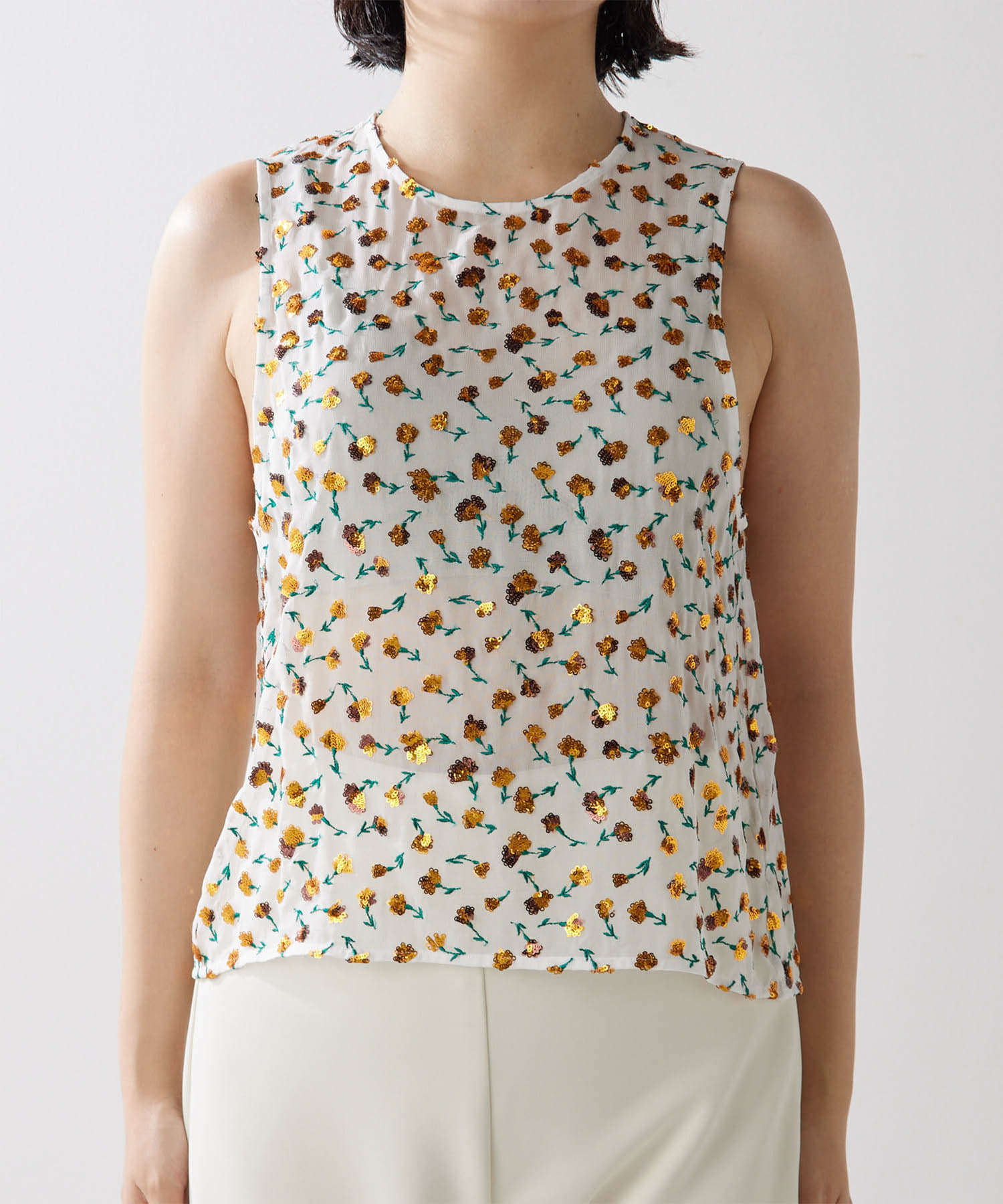 ■繊細なオーガンジーに細かなスパンコール刺繍を施したノースリーブトップス。