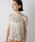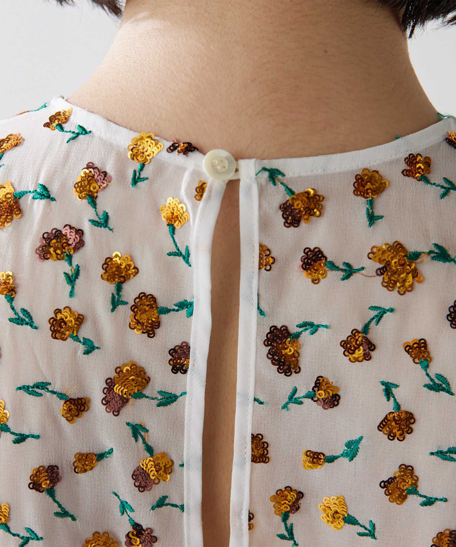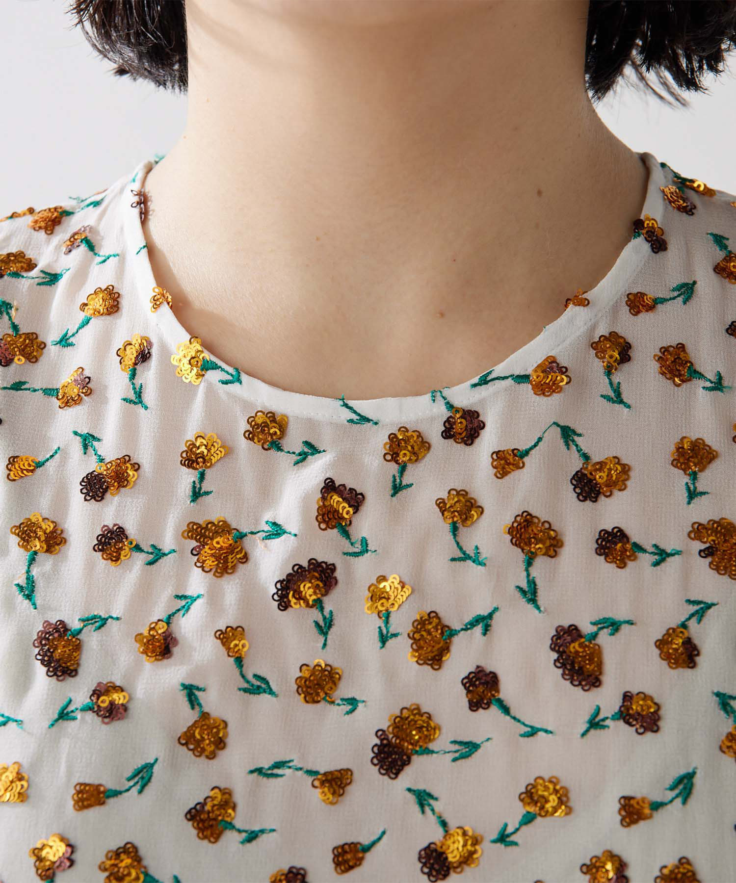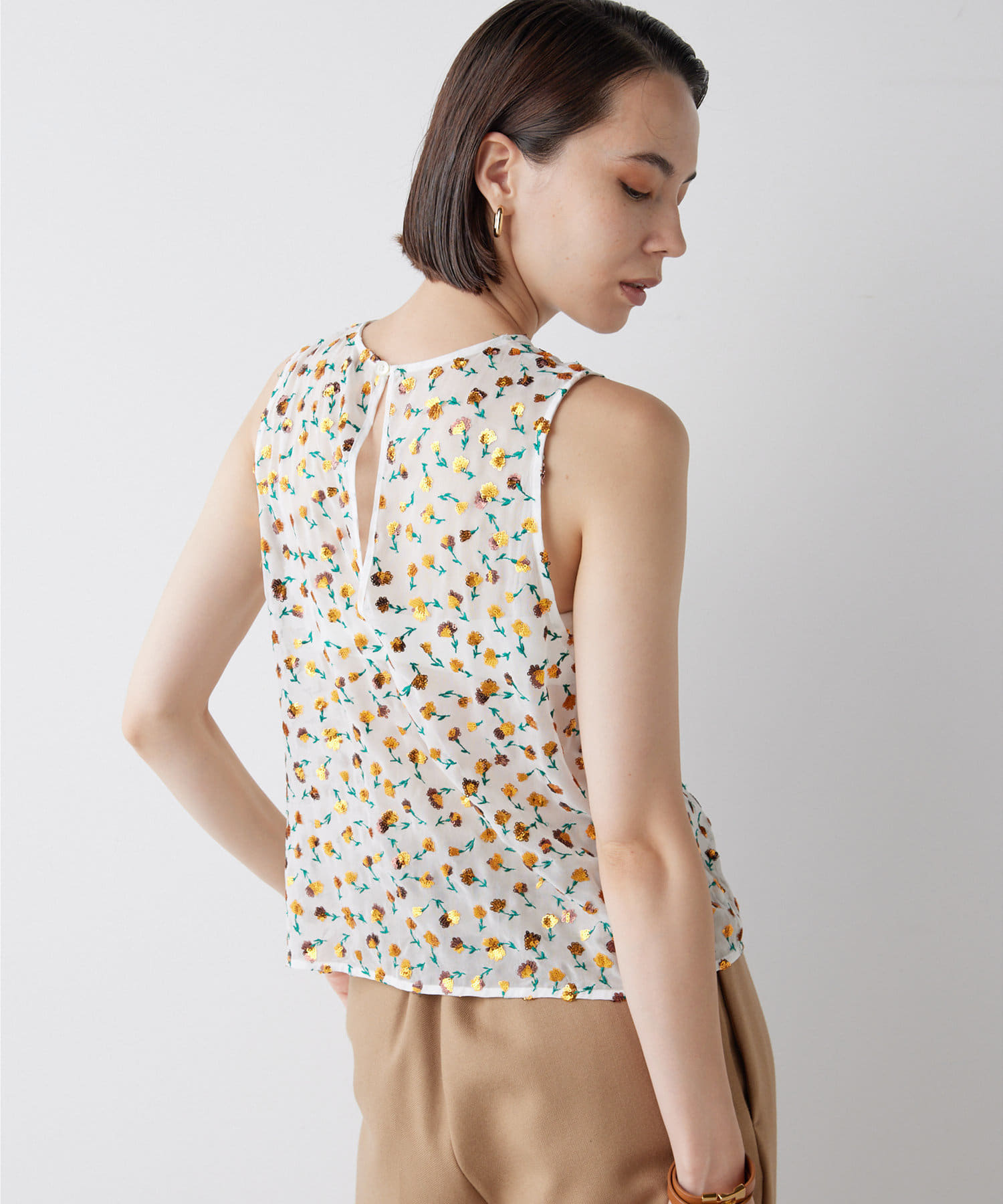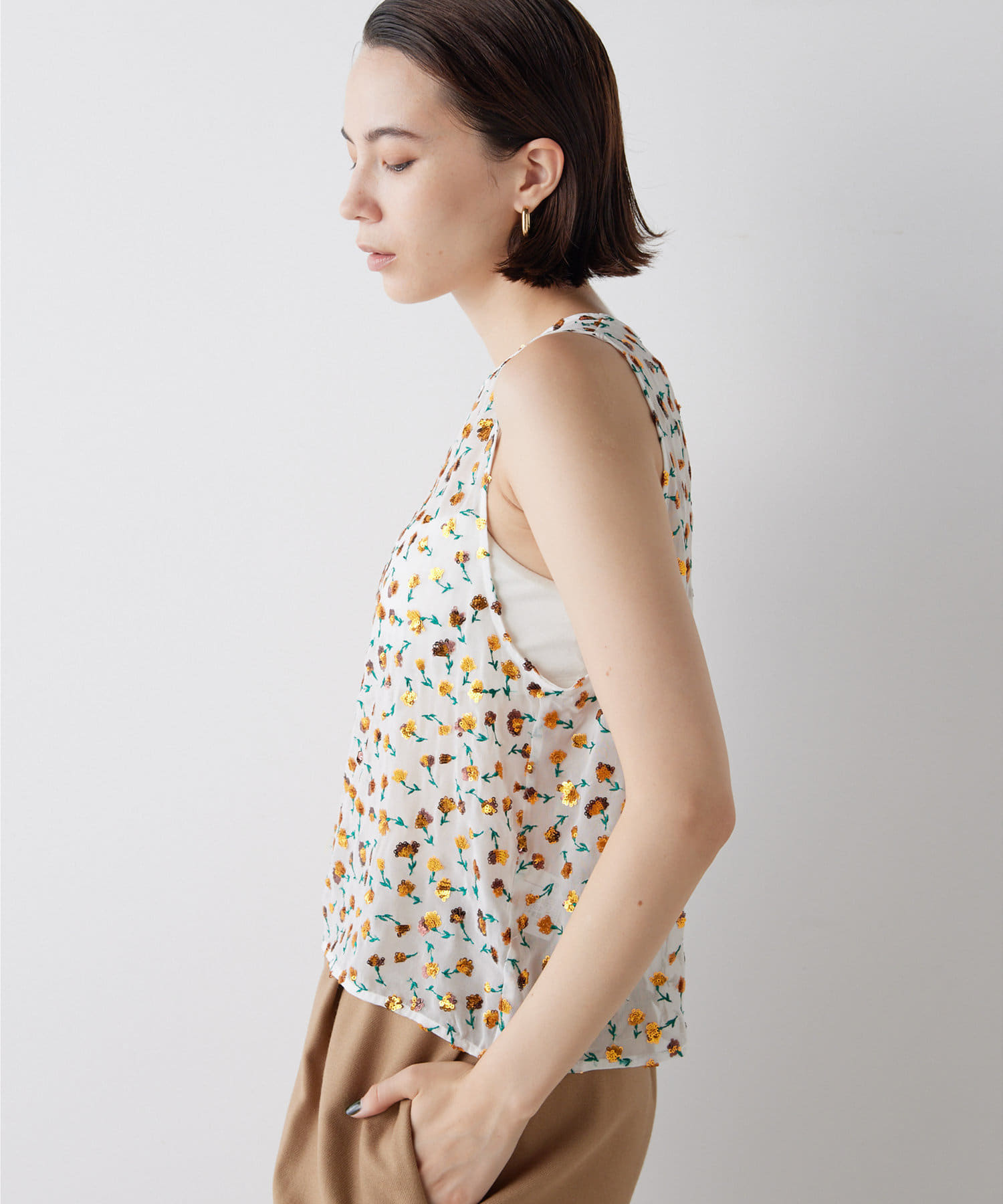 ■繊細なオーガンジーに細かなスパンコール刺繍を施したノースリーブトップス。