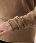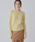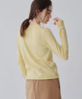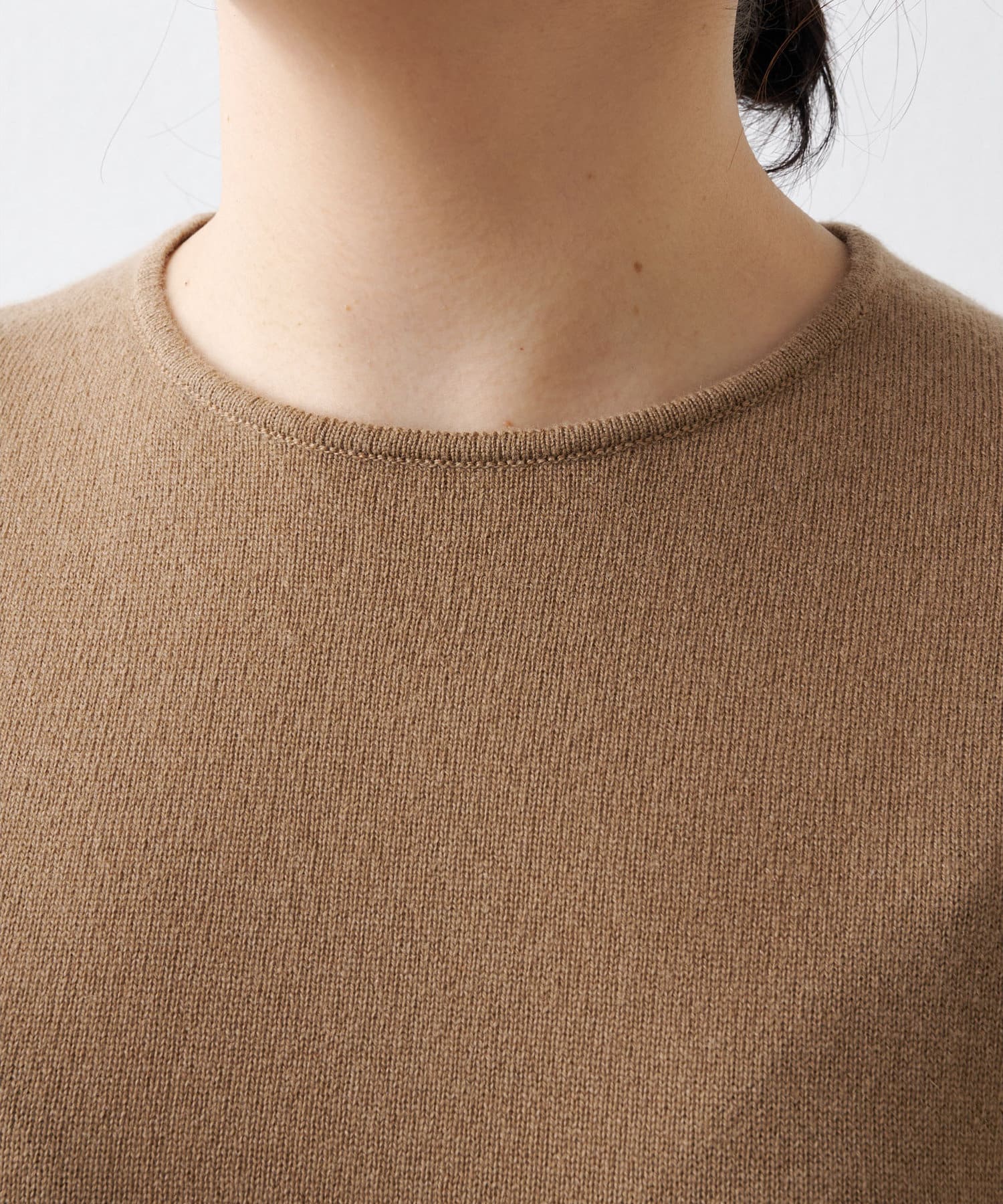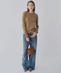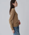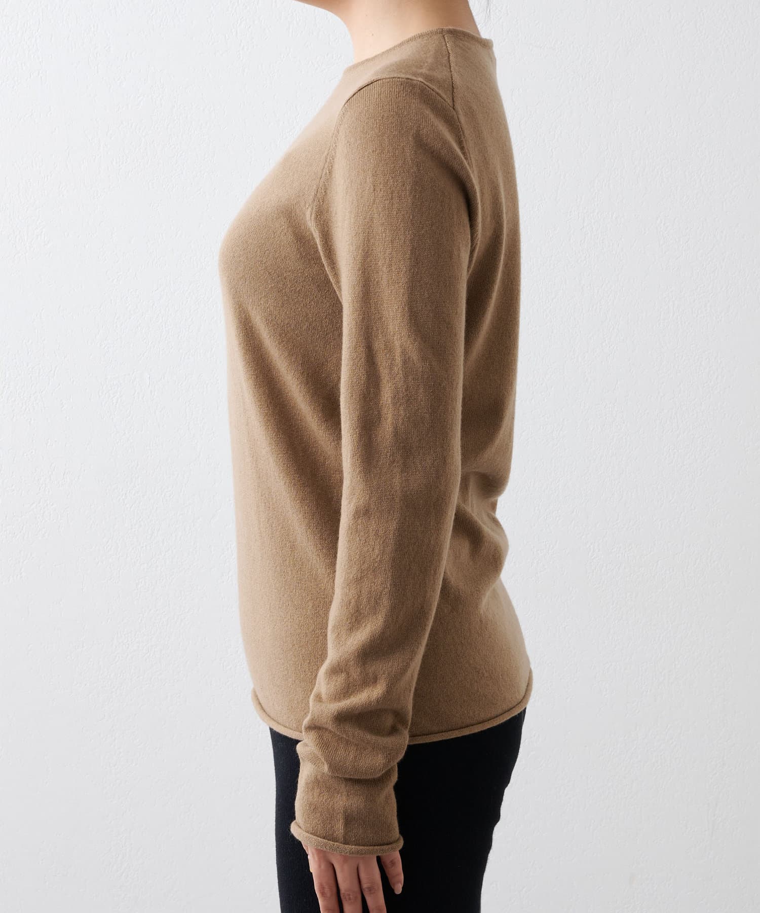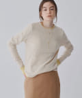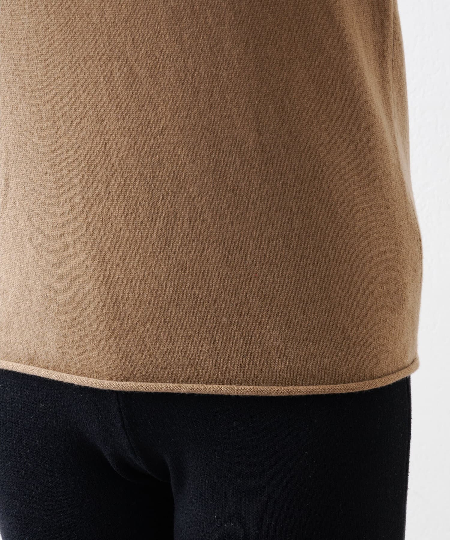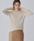 ■ハイゲージで編立てネック周りをすっきりと仕上げつつ、袖口や裾のロールディテールがポイントに。