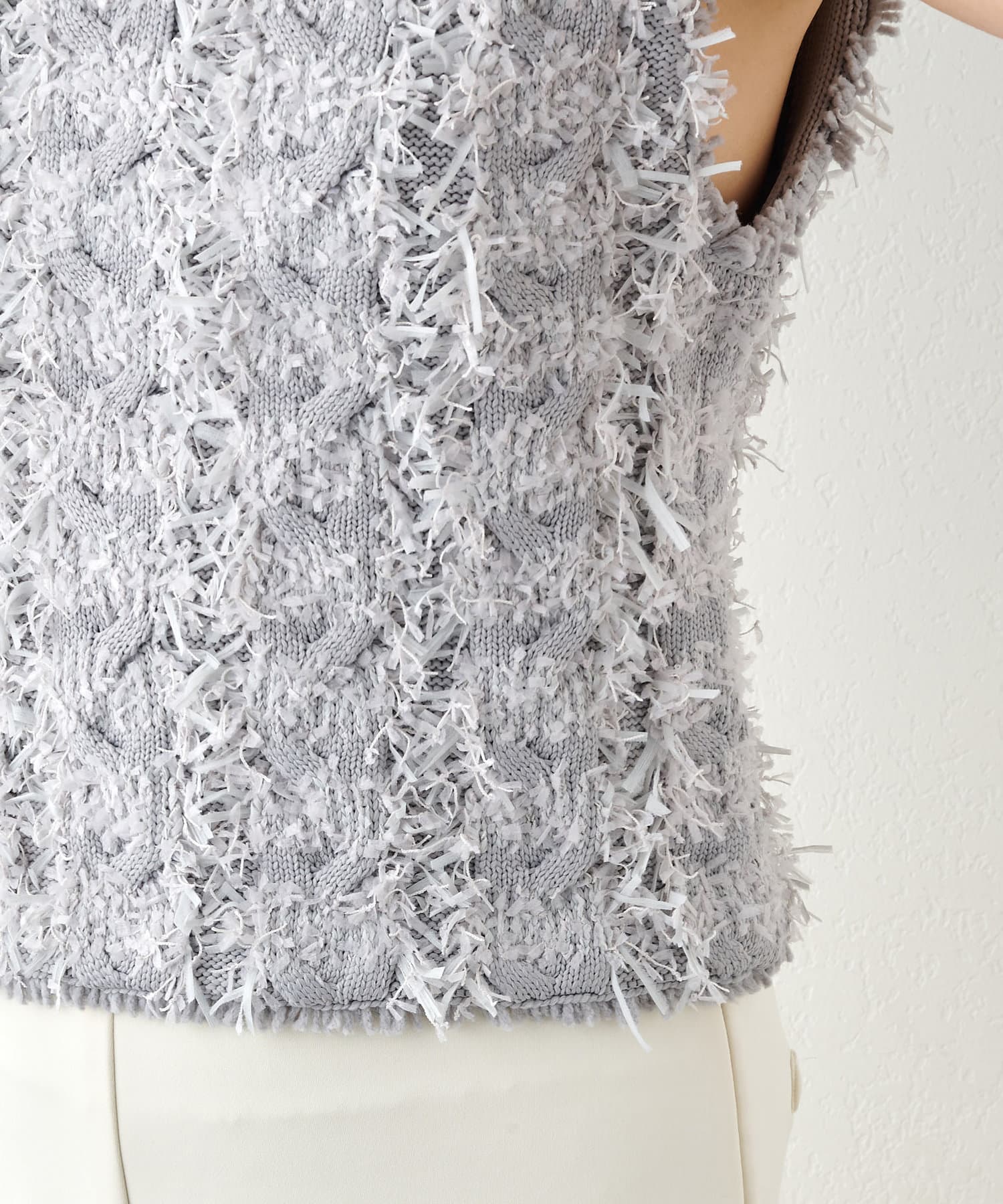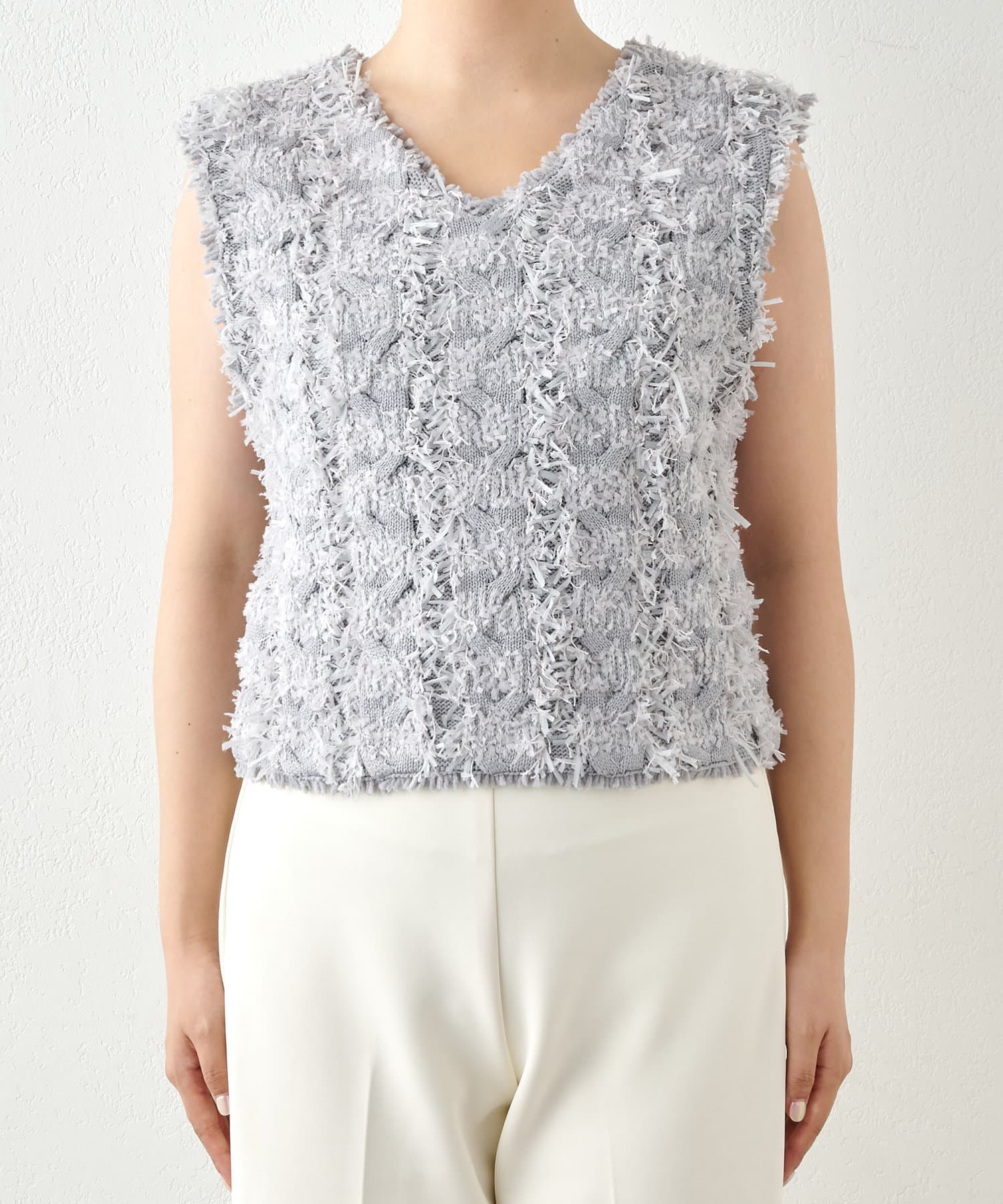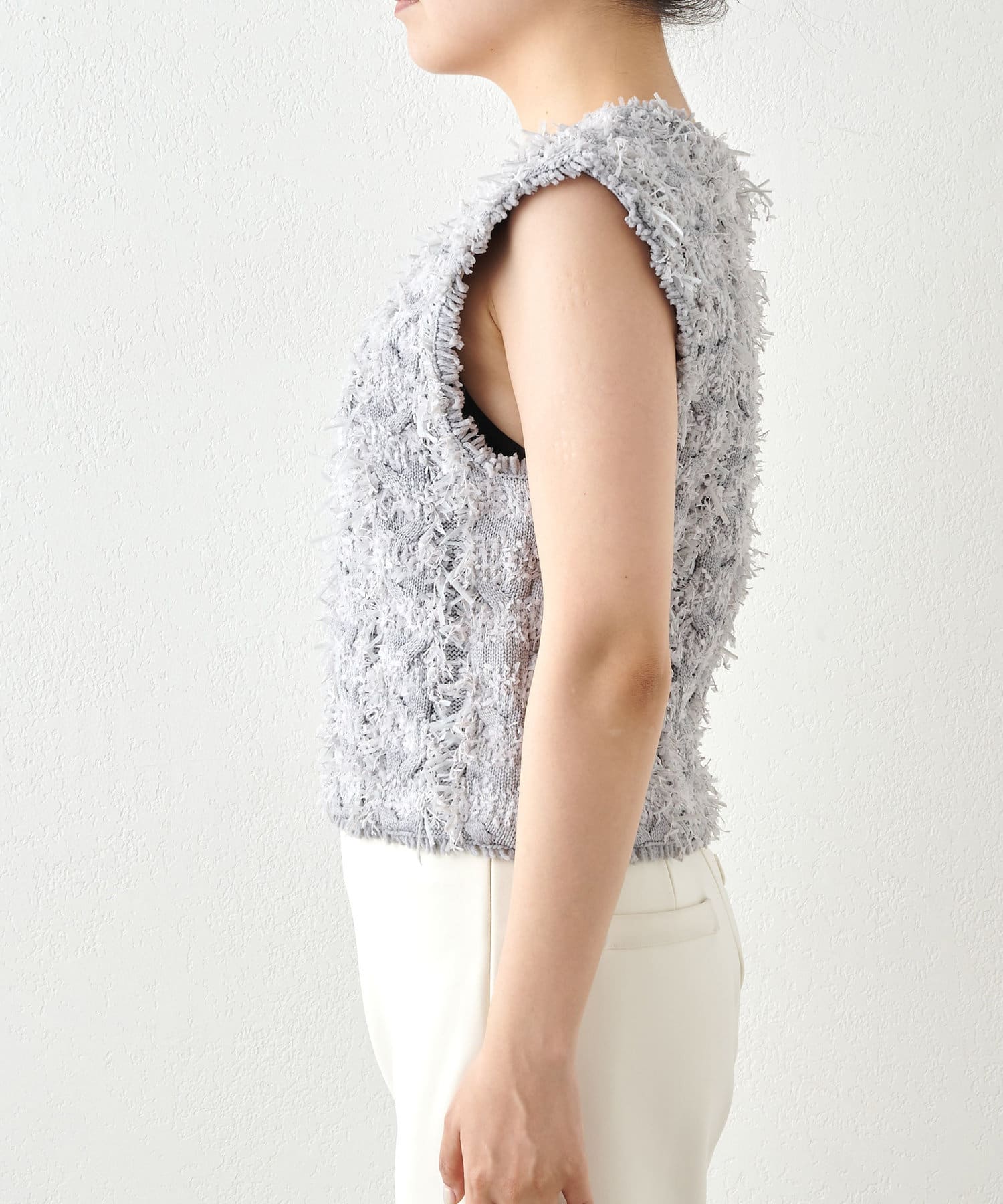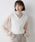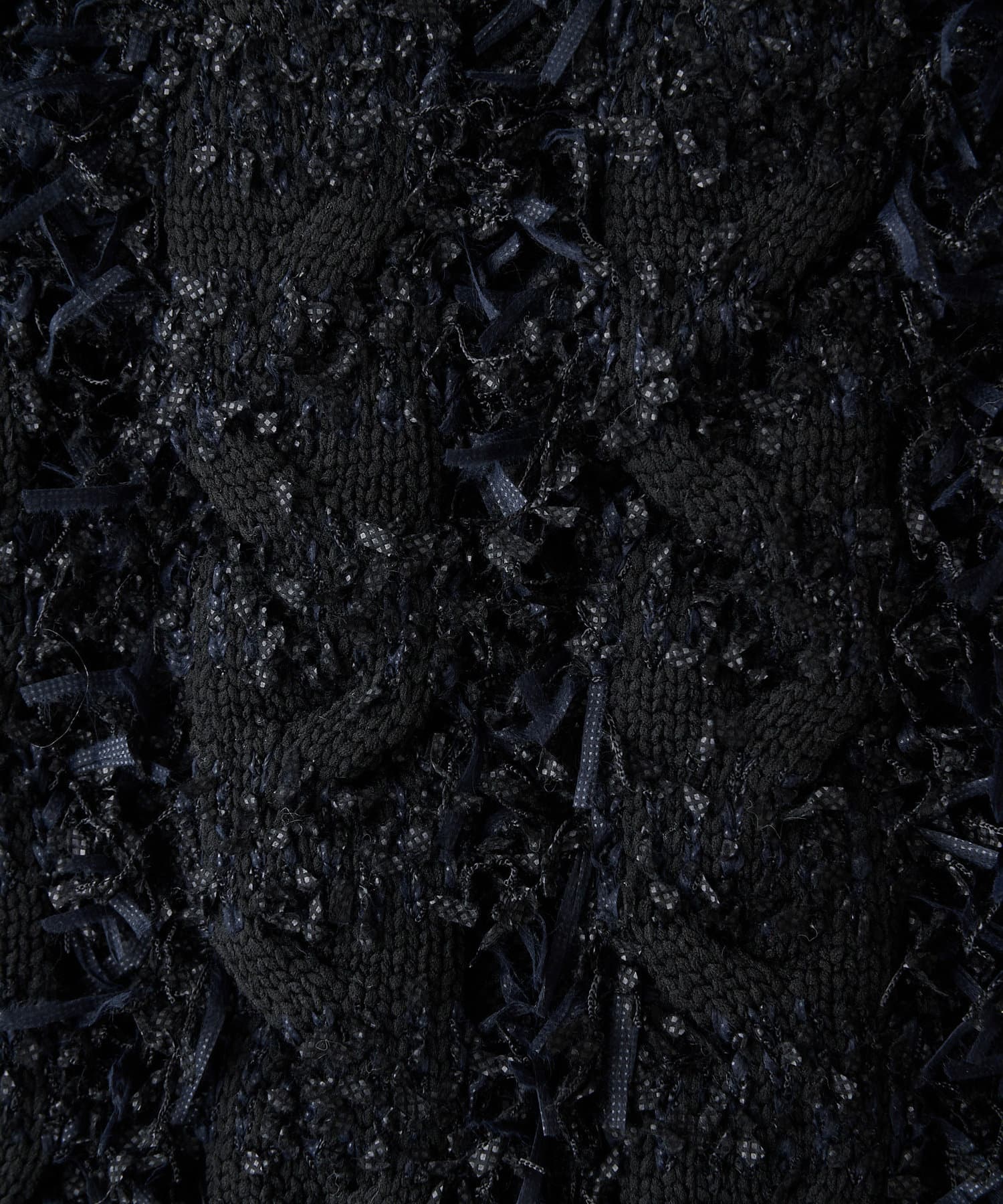 ■数種の素材を組み合わせたツイード風の編み地が印象的な一枚。