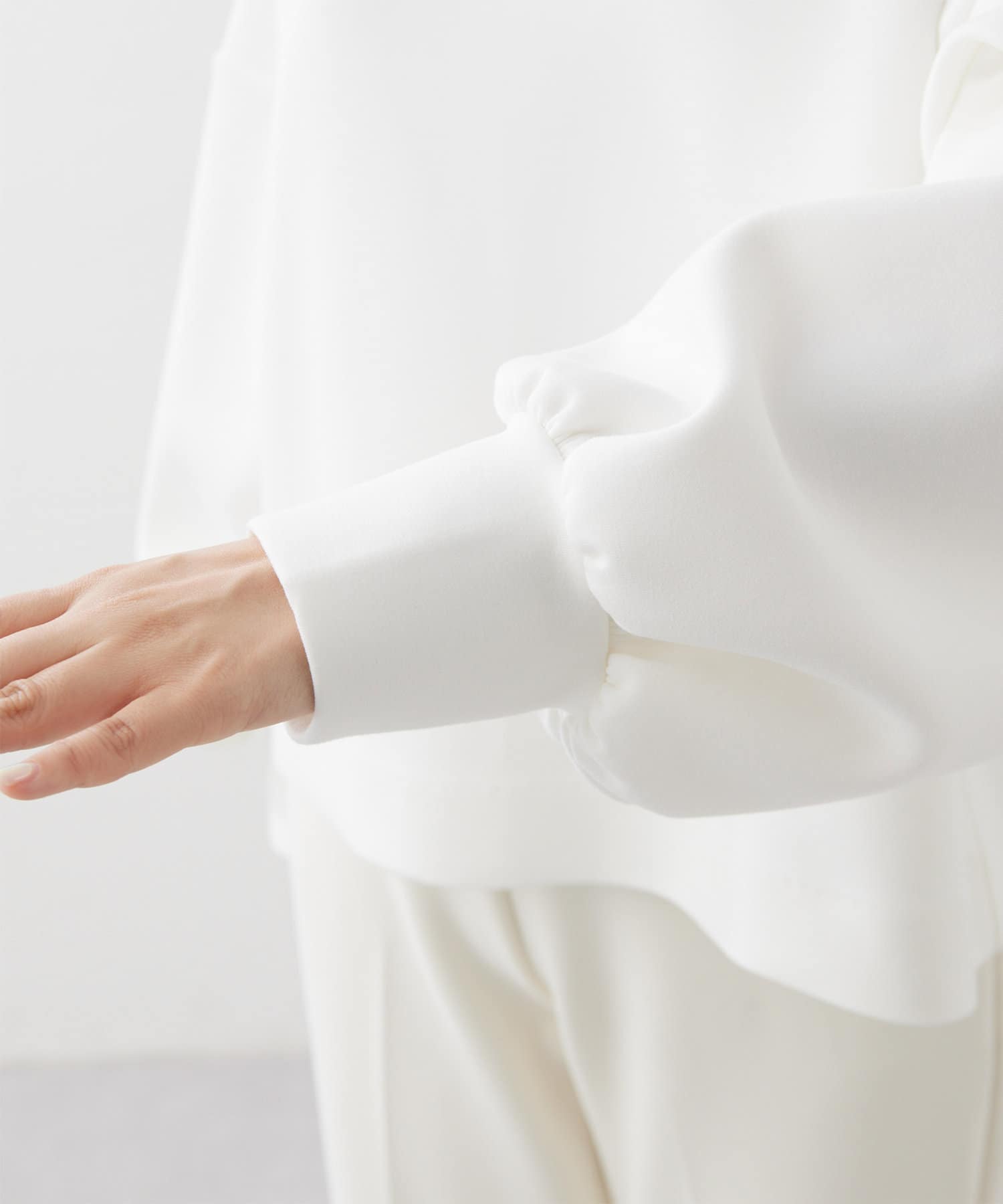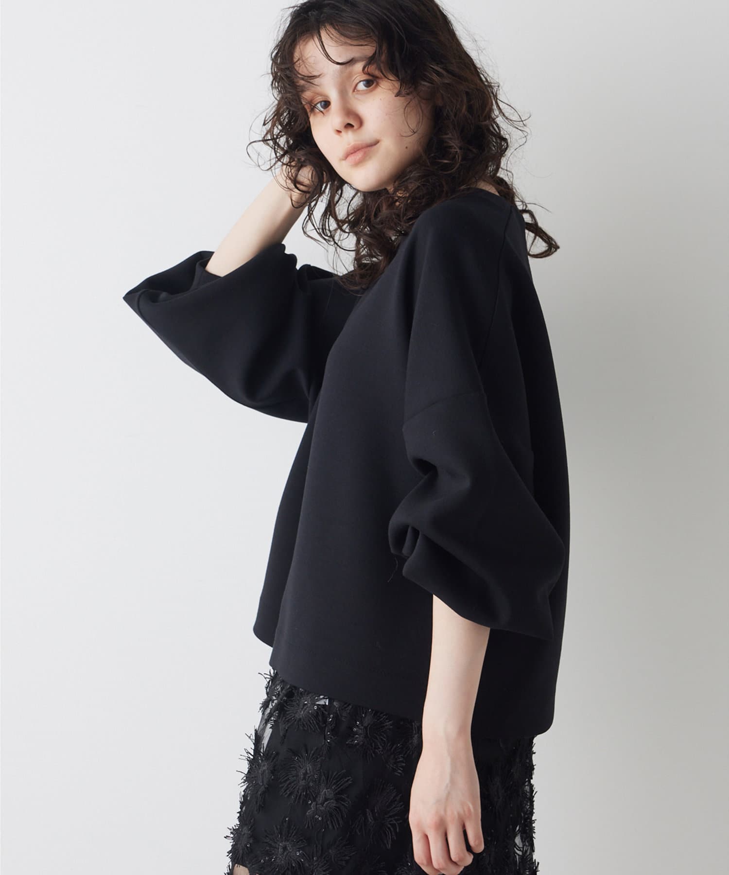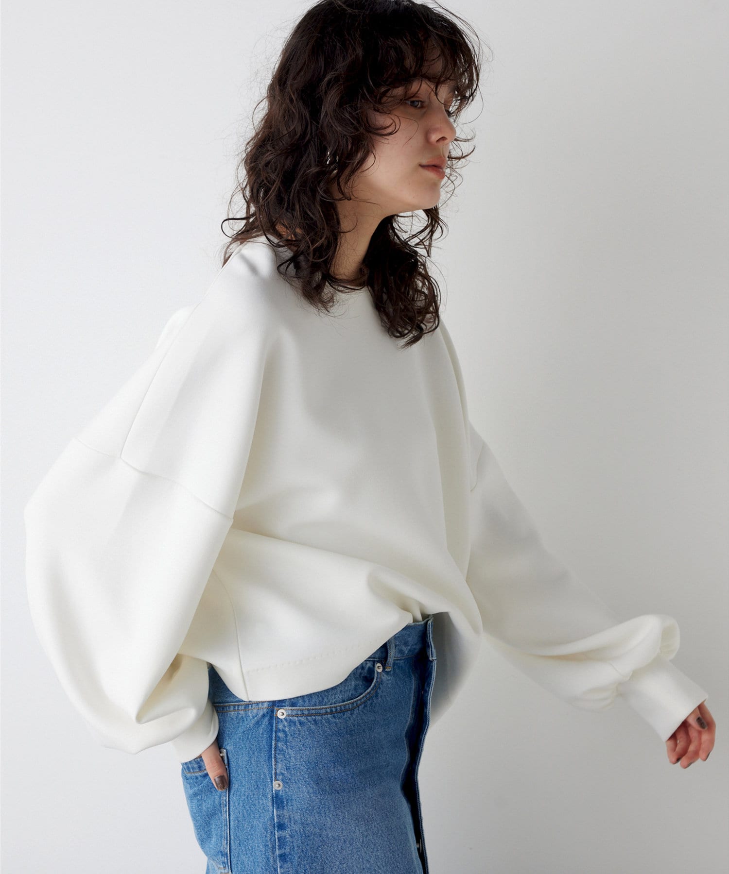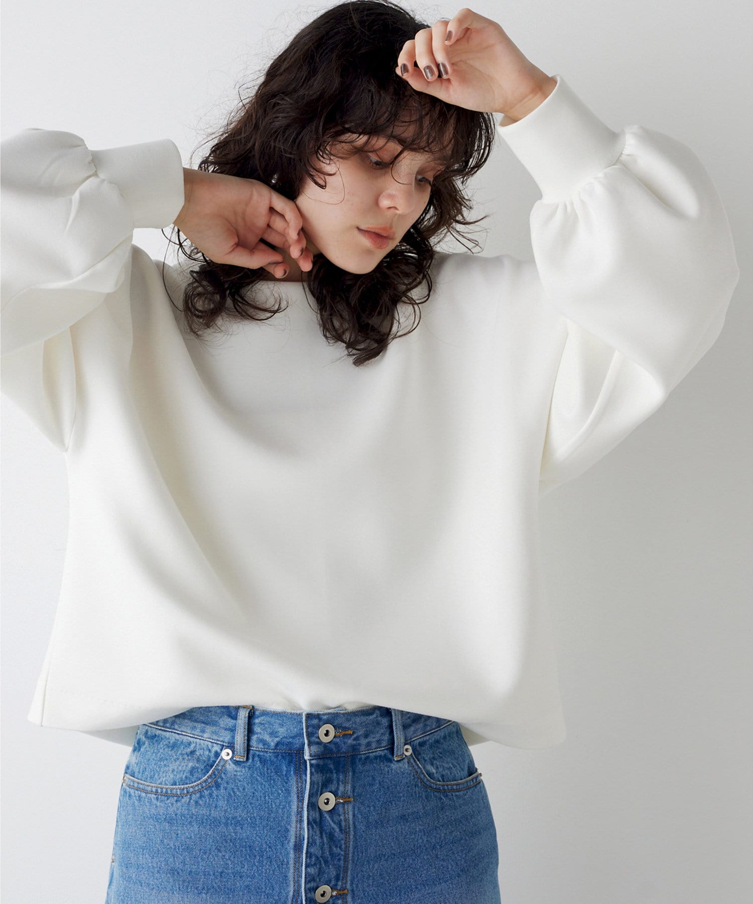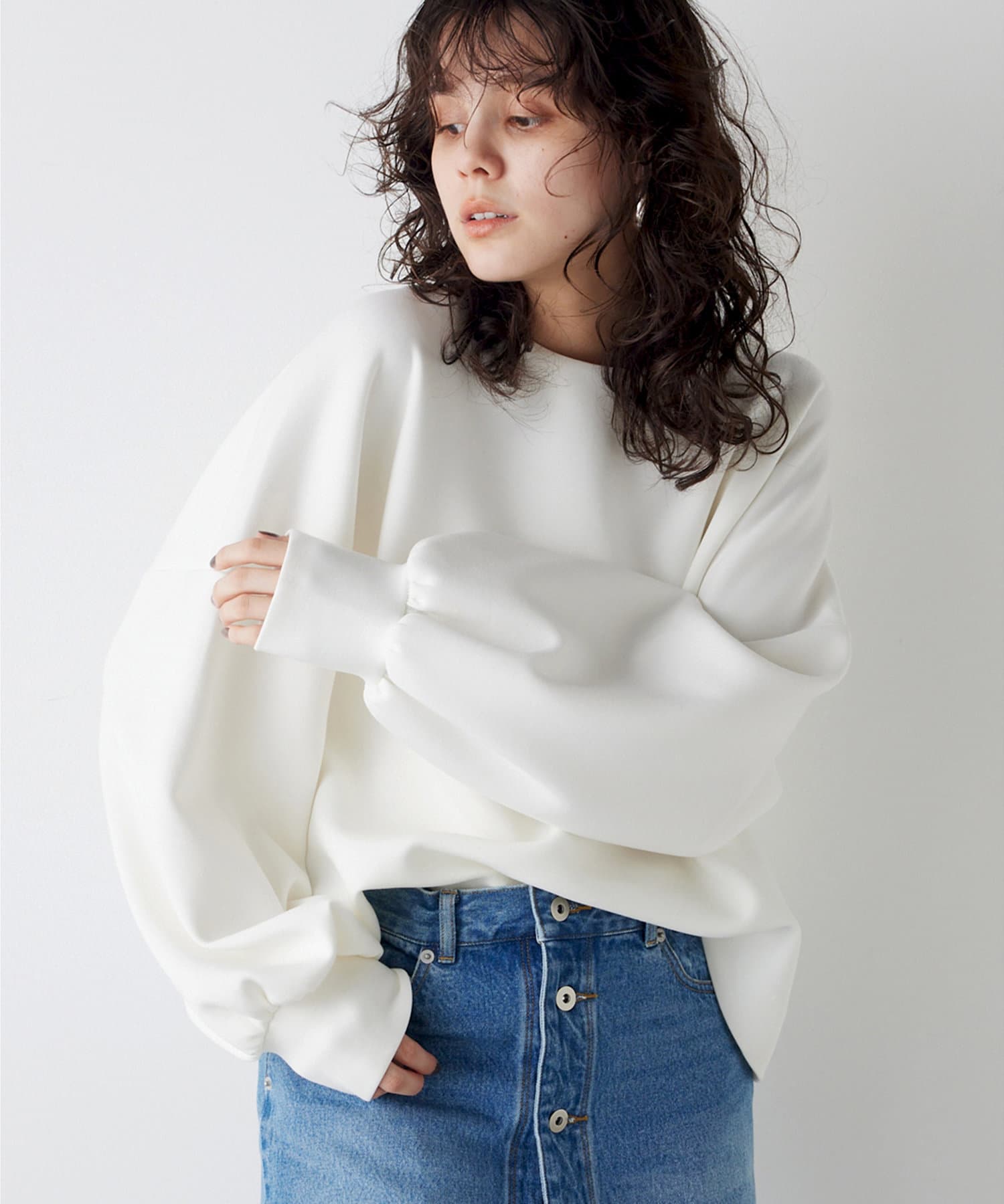 ■オーバーシルエットでリラックス感を出しつつ、ふんわりとしたスリーブで女性らしさをプラス。