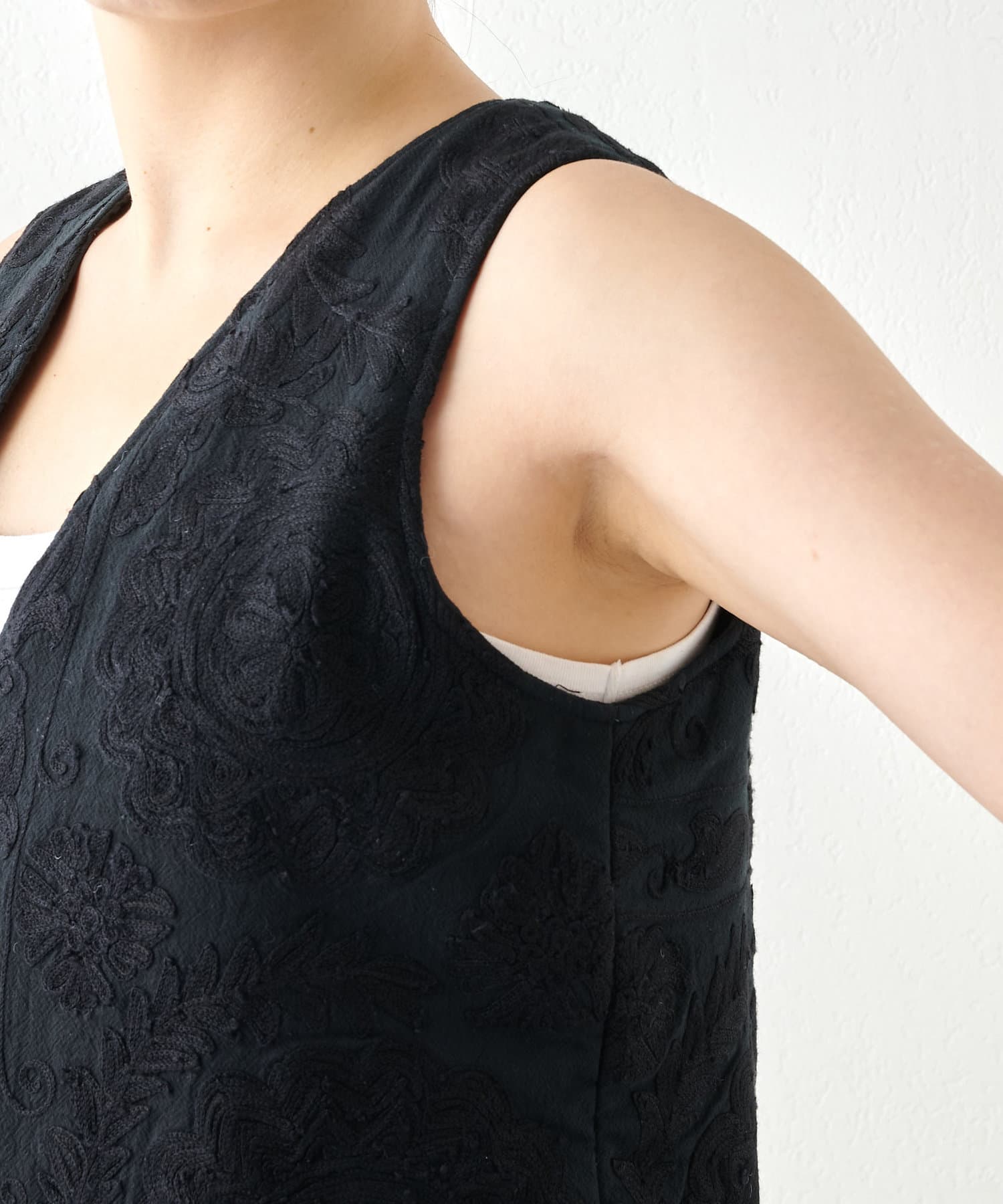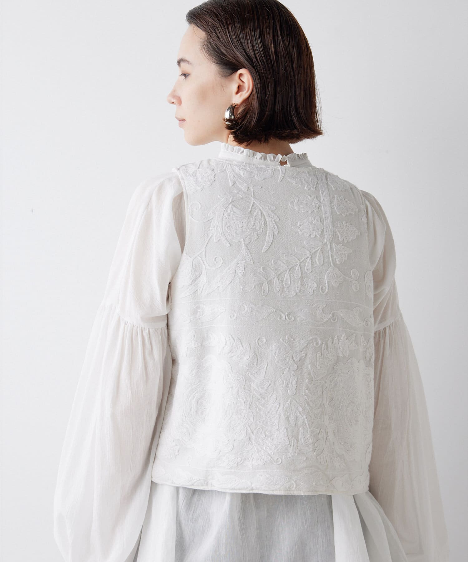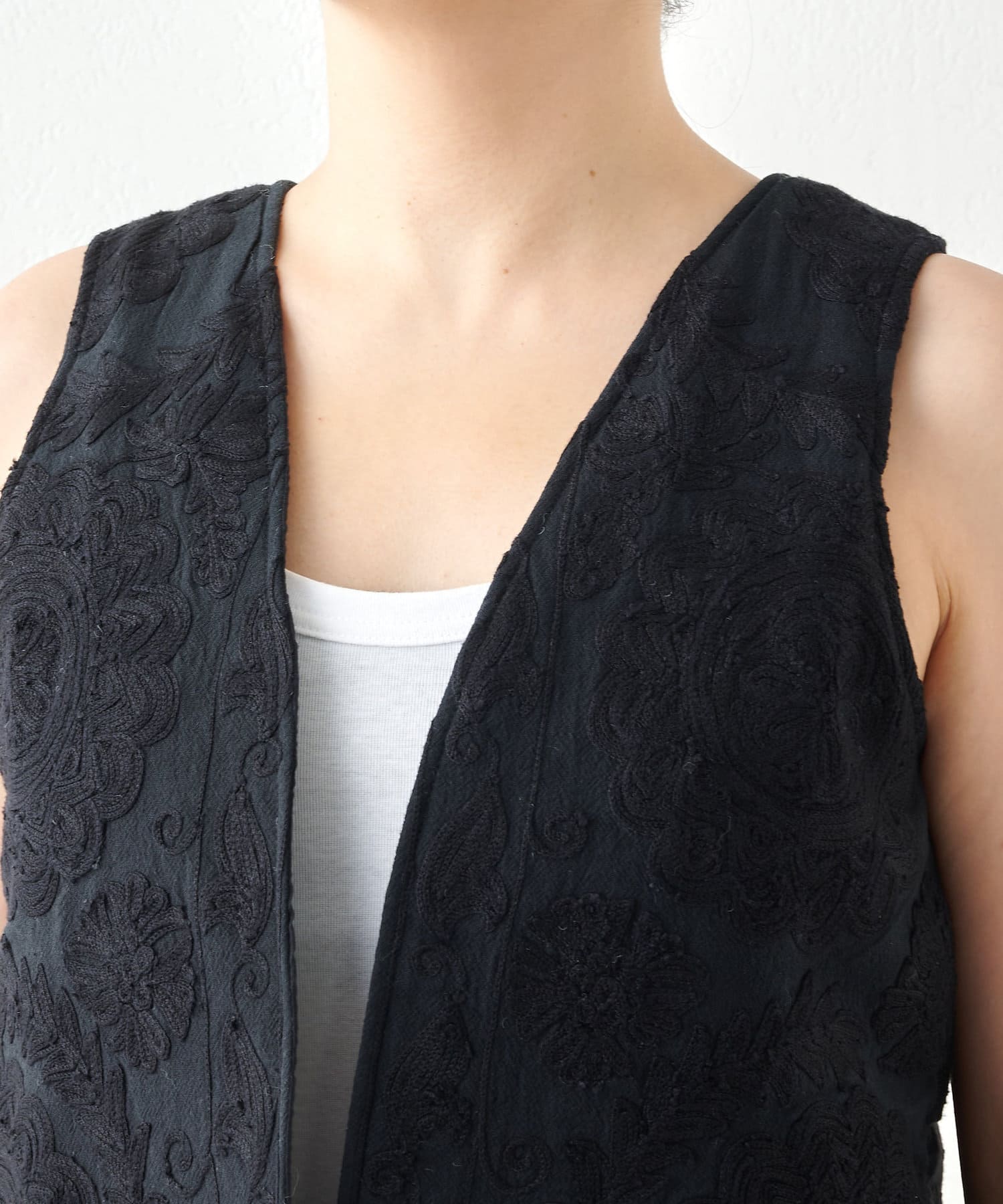 ハンド刺繍が目を惹く、クラフト感が魅力のコンパクトジレ
