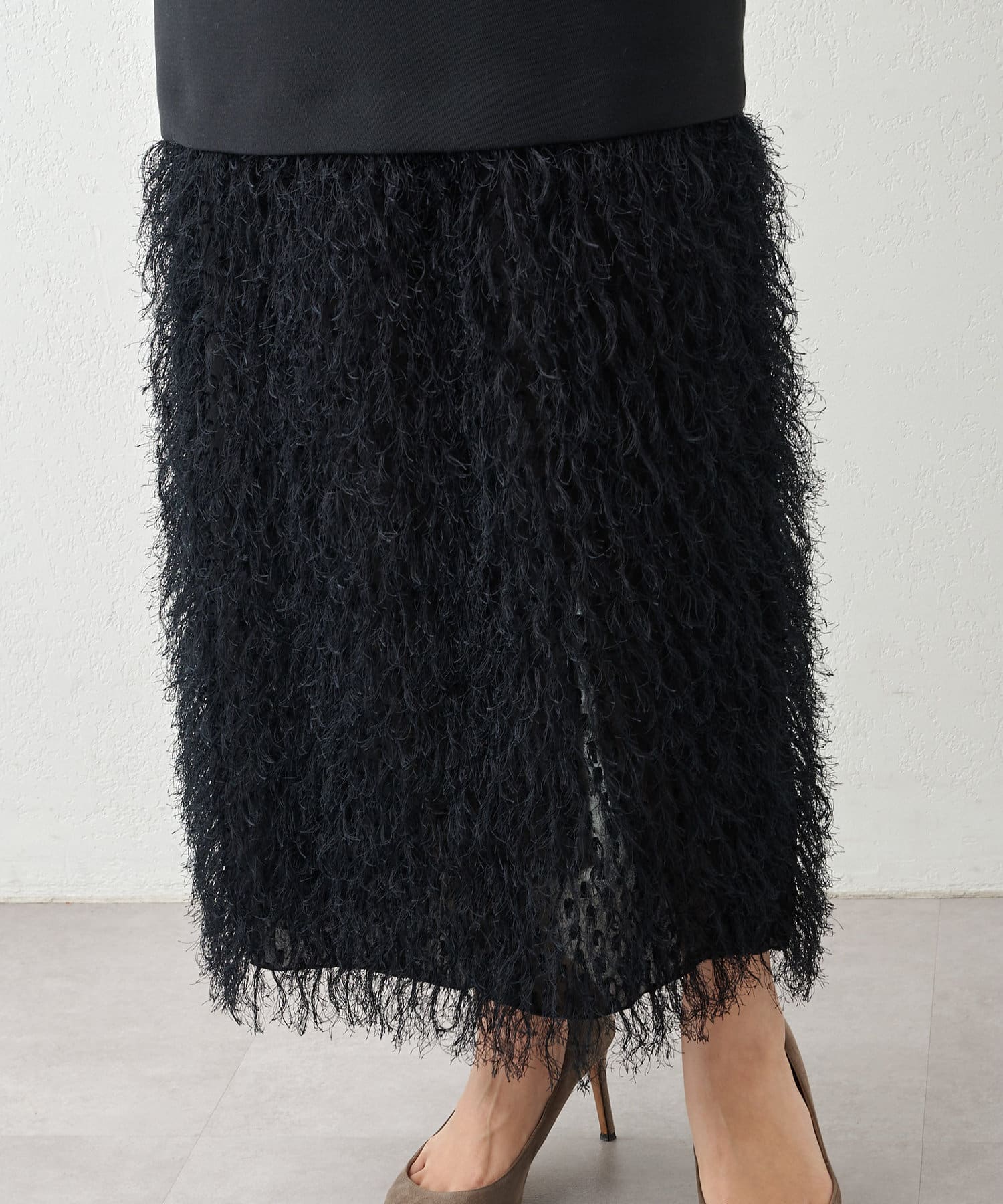 裾部分:経糸にキュプラの強撚糸を使用し、さらっとした風合いに仕上げ、緯糸で上品なロングカットを表現した素材。