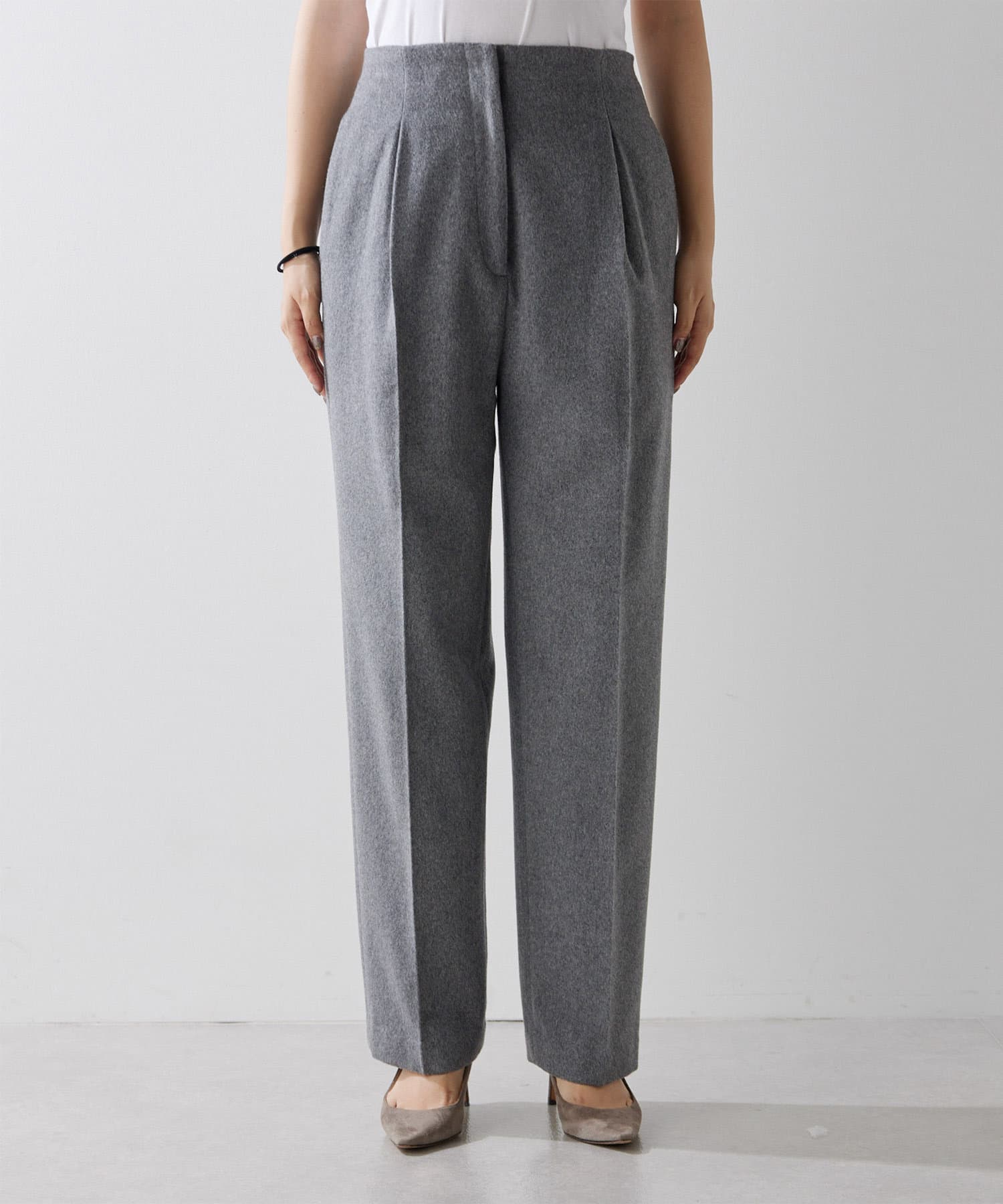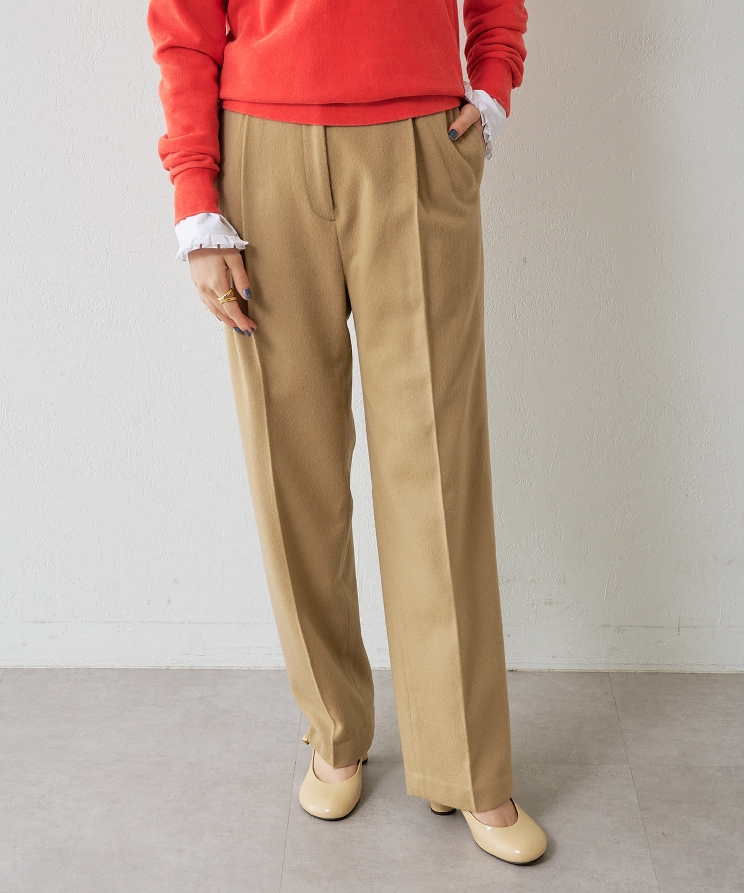 上質なウールカシミアのタックパンツ。スッキリとしたデザインなので美脚効果があります。裾あたりのとろみがこなれ感を出してくれ、美シルエット。オンオフ活躍間違いなしです。