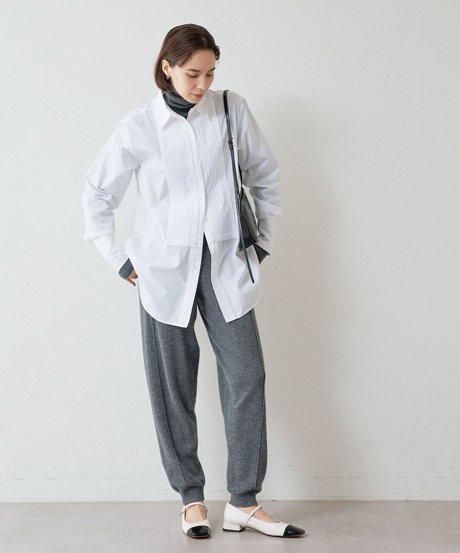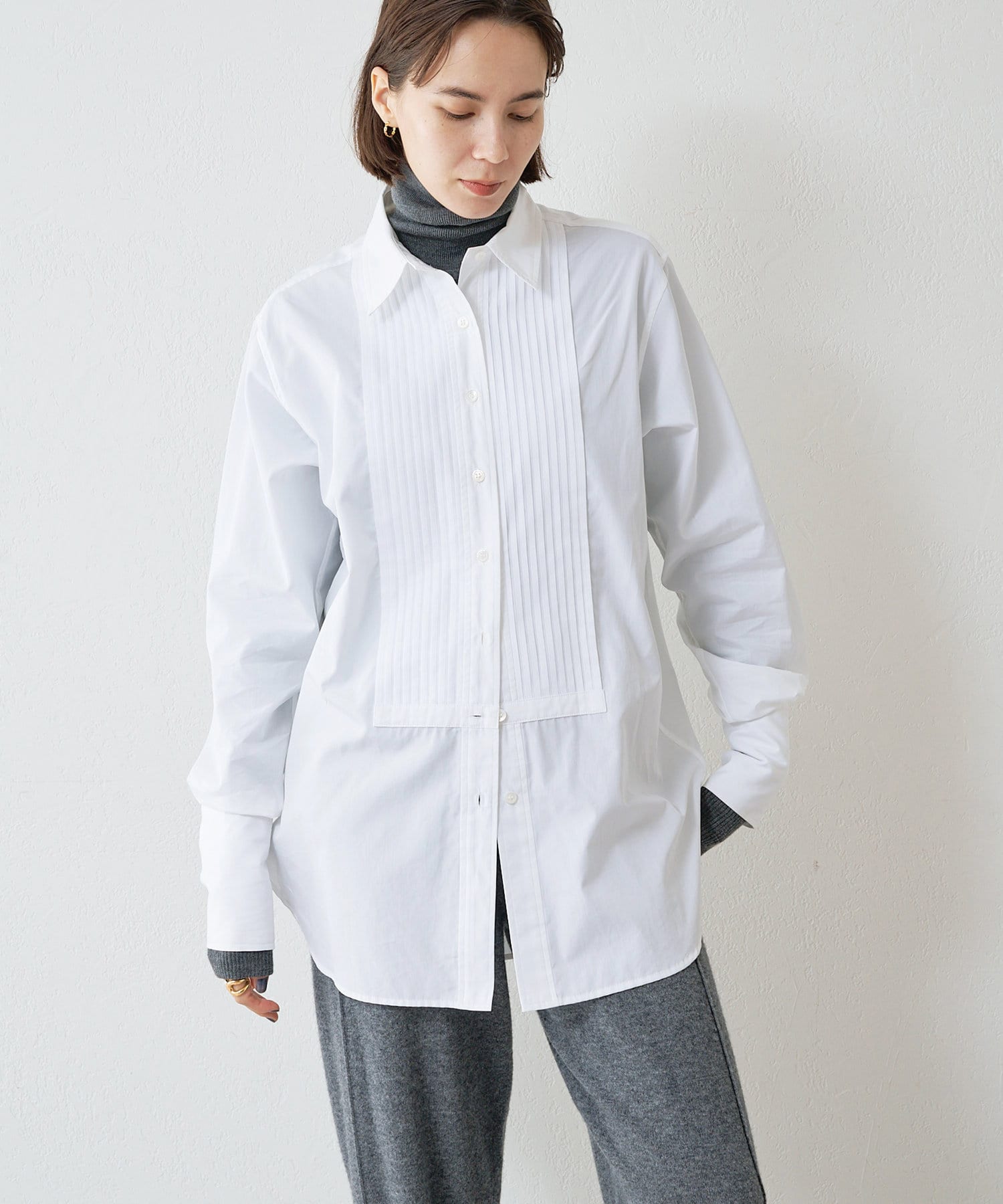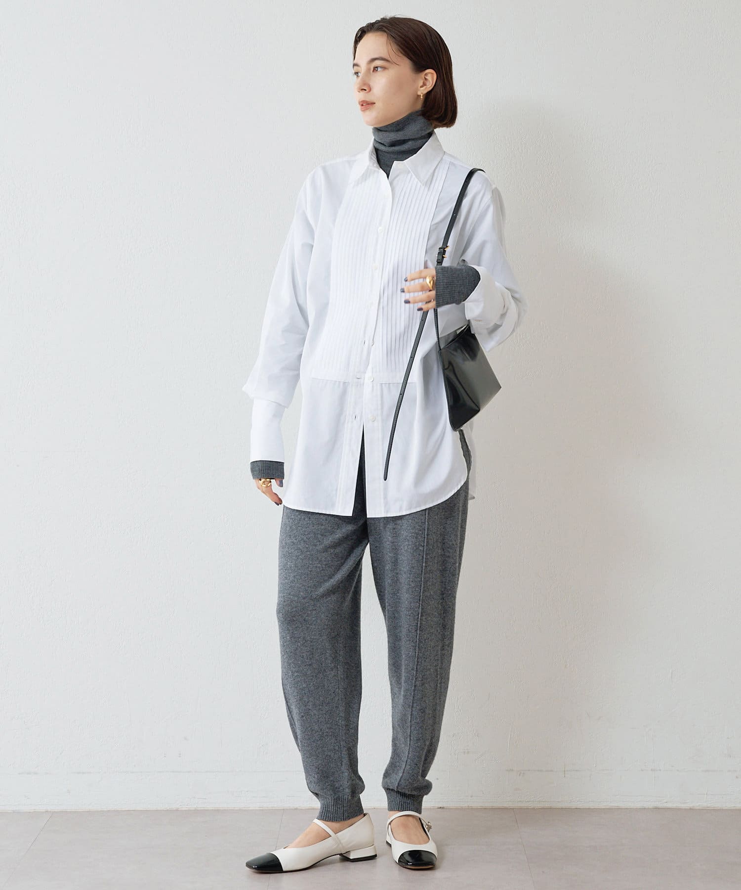 シンプルなシルエットですが、繊細なピンタックデザインがスタイリングのアクセントになりますよ。長さがあるのでニットやスウェットとのレイヤードも素敵ですよ。