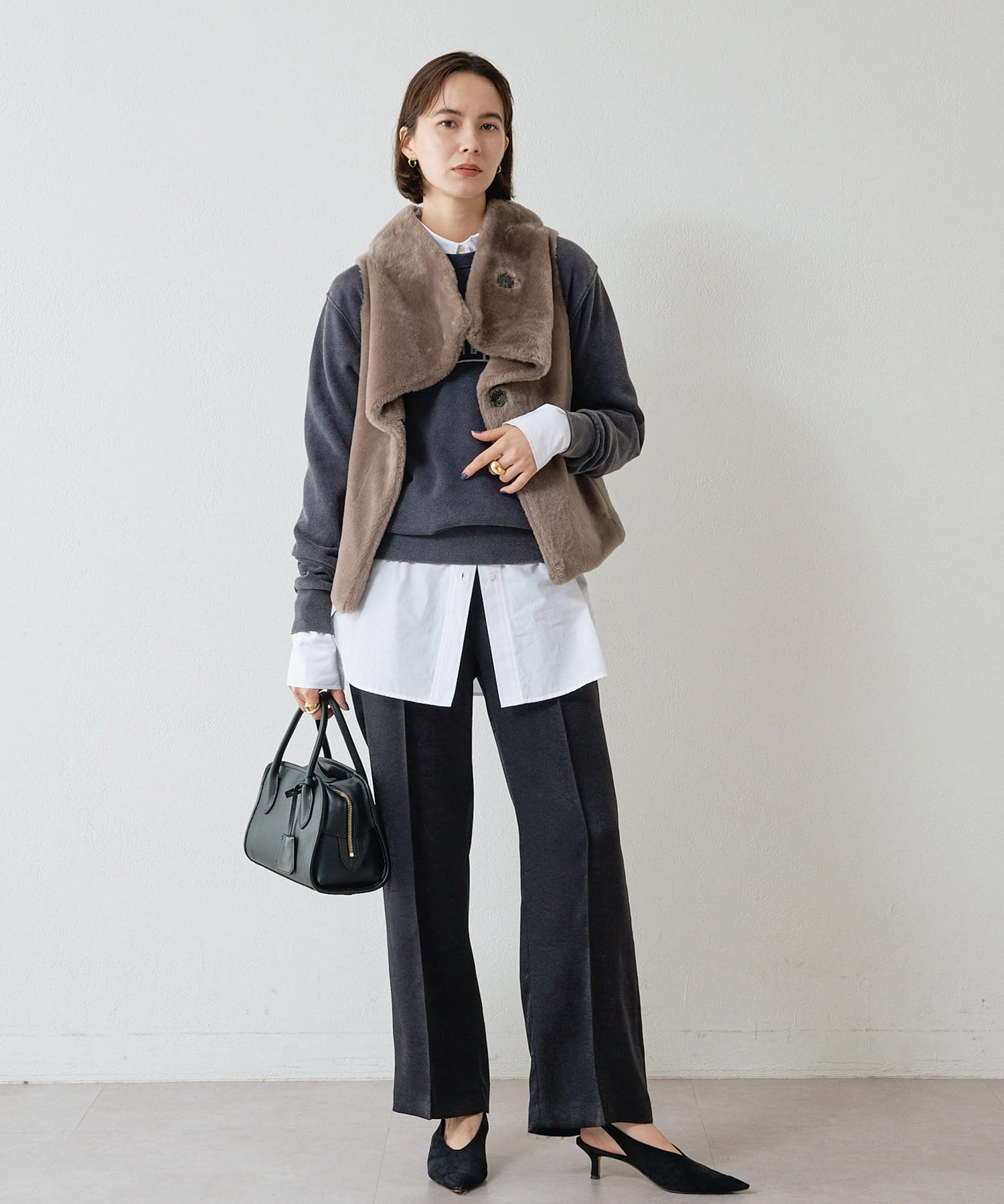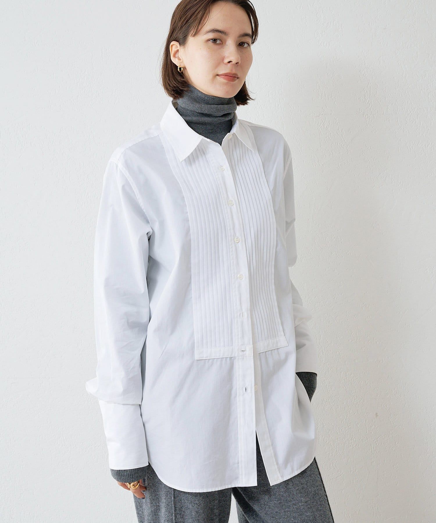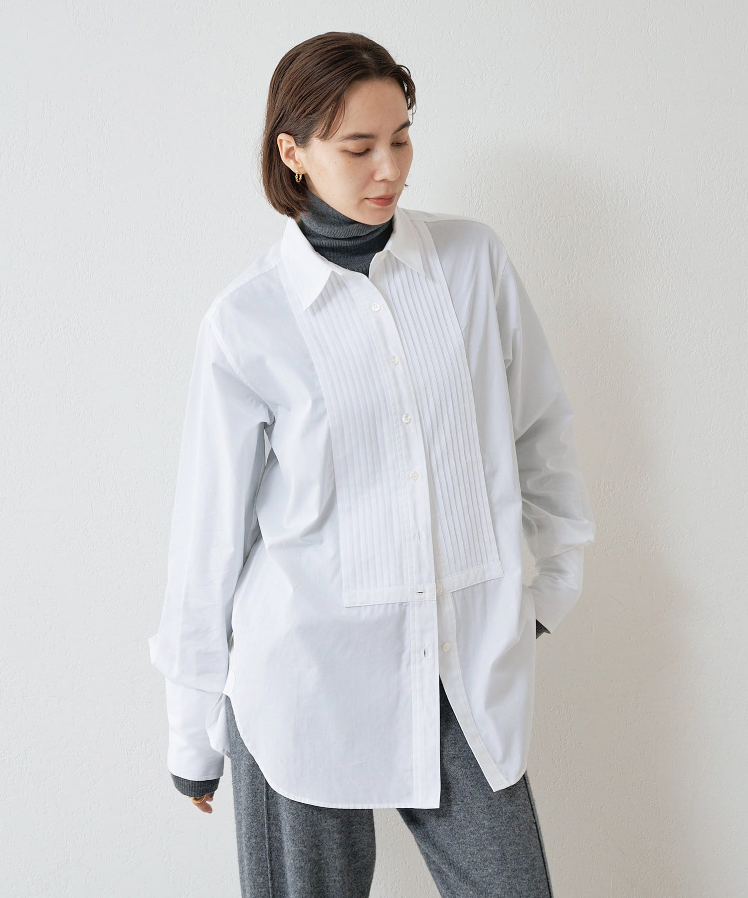 シンプルなシルエットですが、繊細なピンタックデザインがスタイリングのアクセントになりますよ。長さがあるのでニットやスウェットとのレイヤードも素敵ですよ。