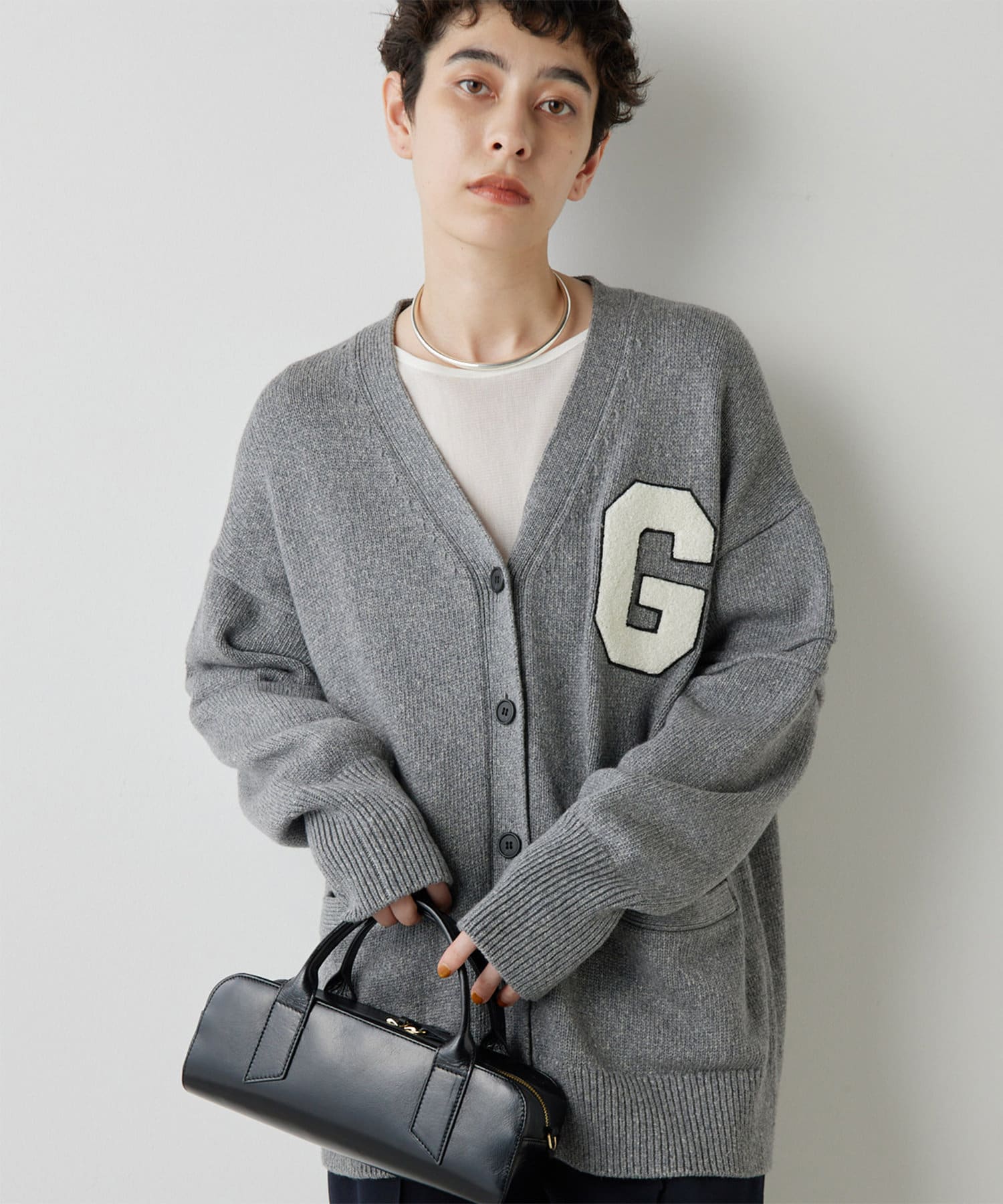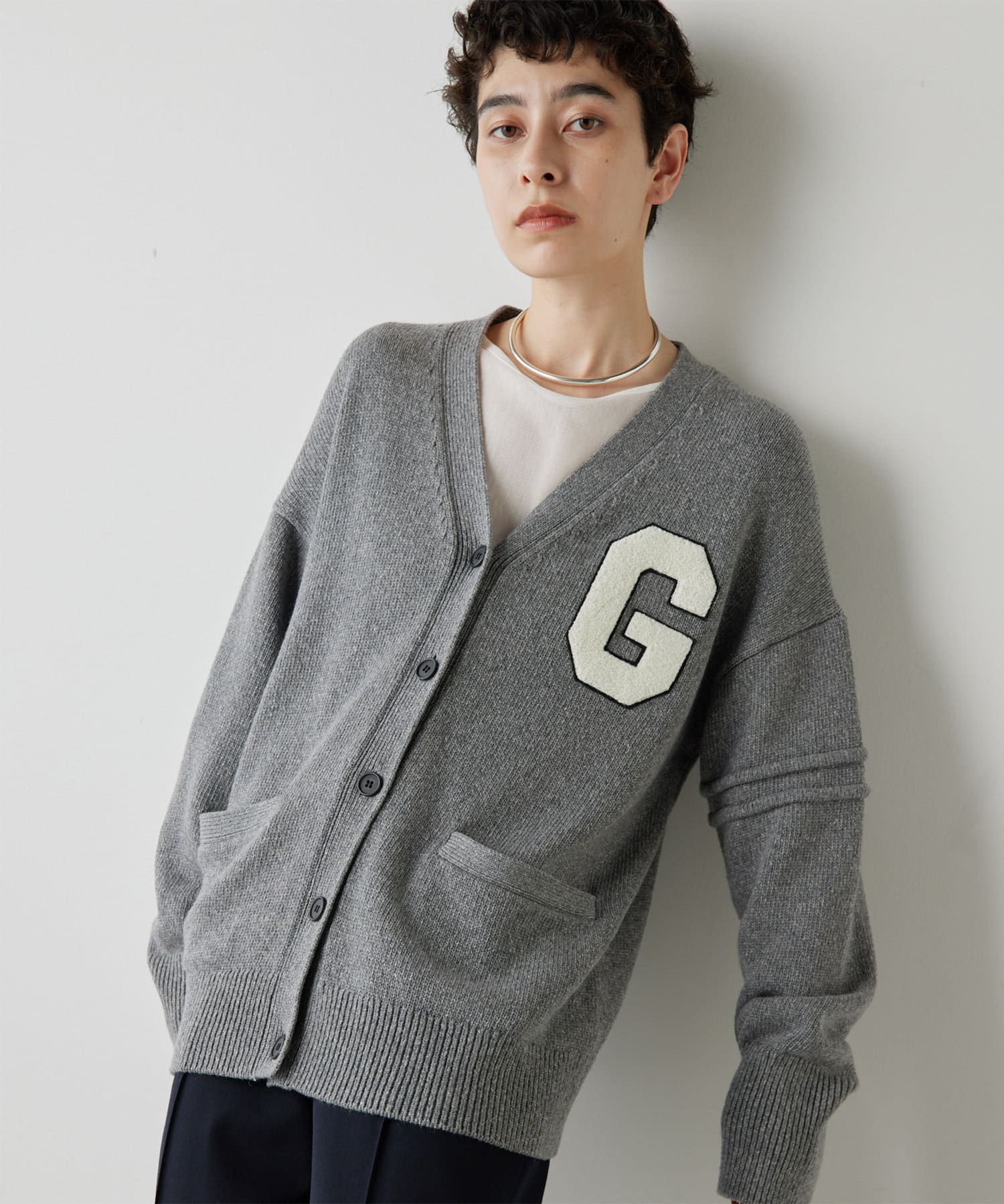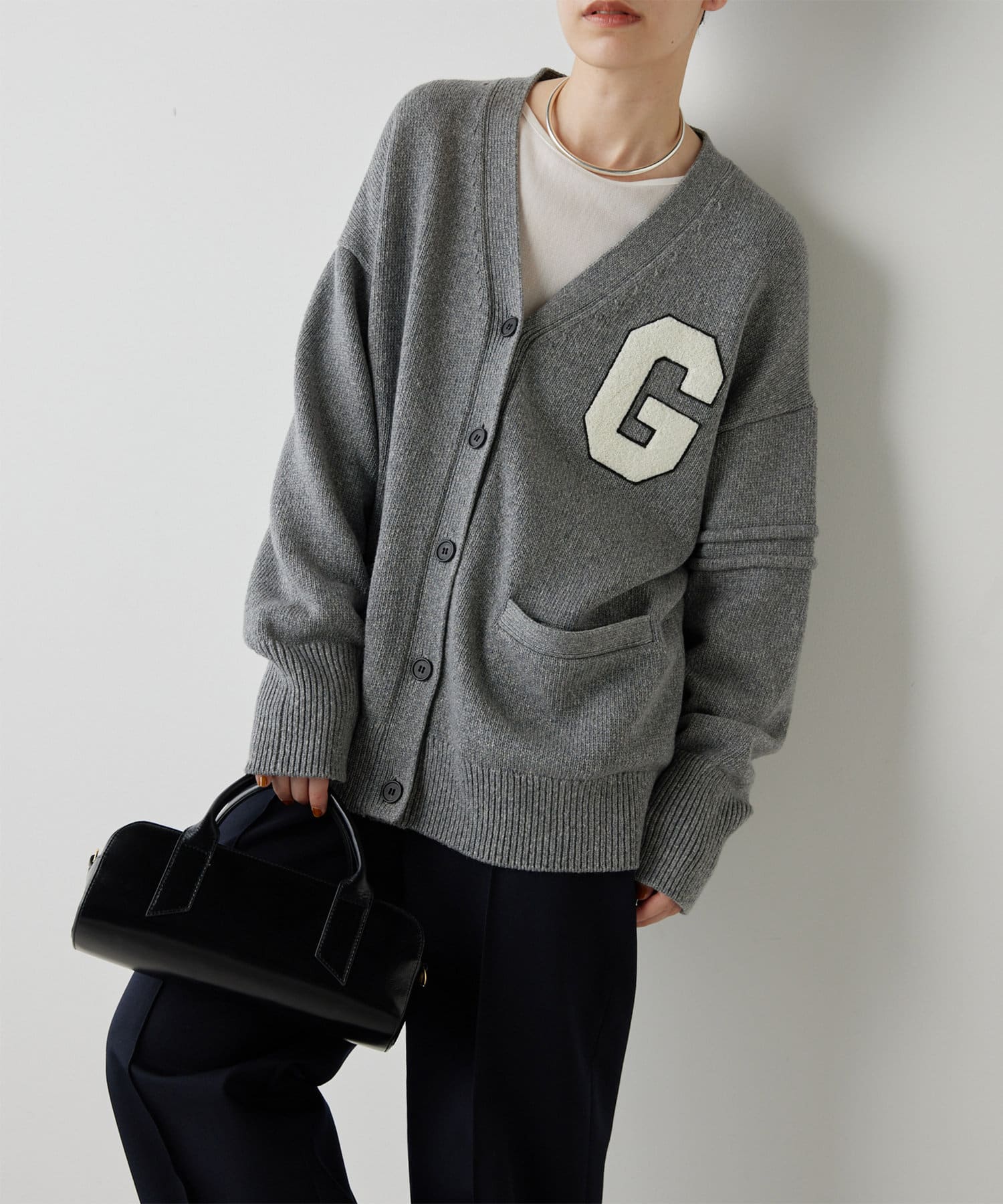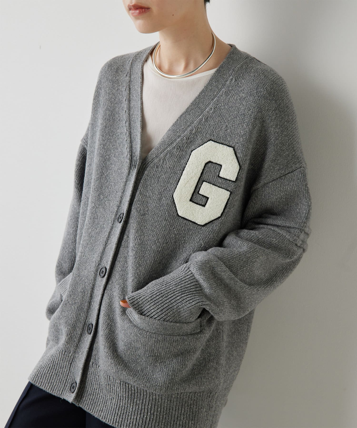 『G』のキャッチーなカーディガン。胸元のロゴがスタイリングのアクセントに。サイズ感も大きめでスウェットやデニムシャツも着込める大きさ。腰周り、ヒップも隠れるのでボトムスのバランスを選ばないです○。